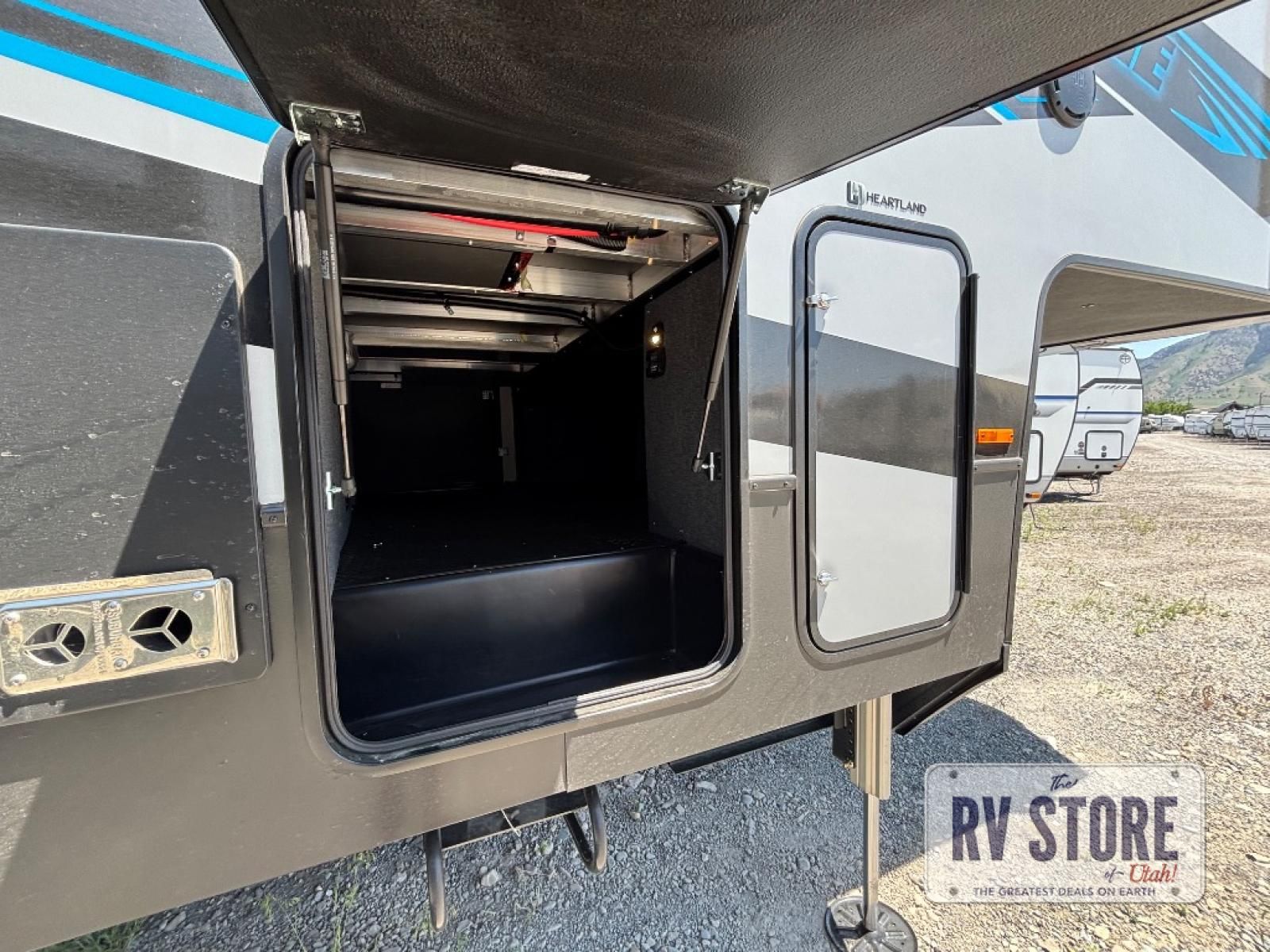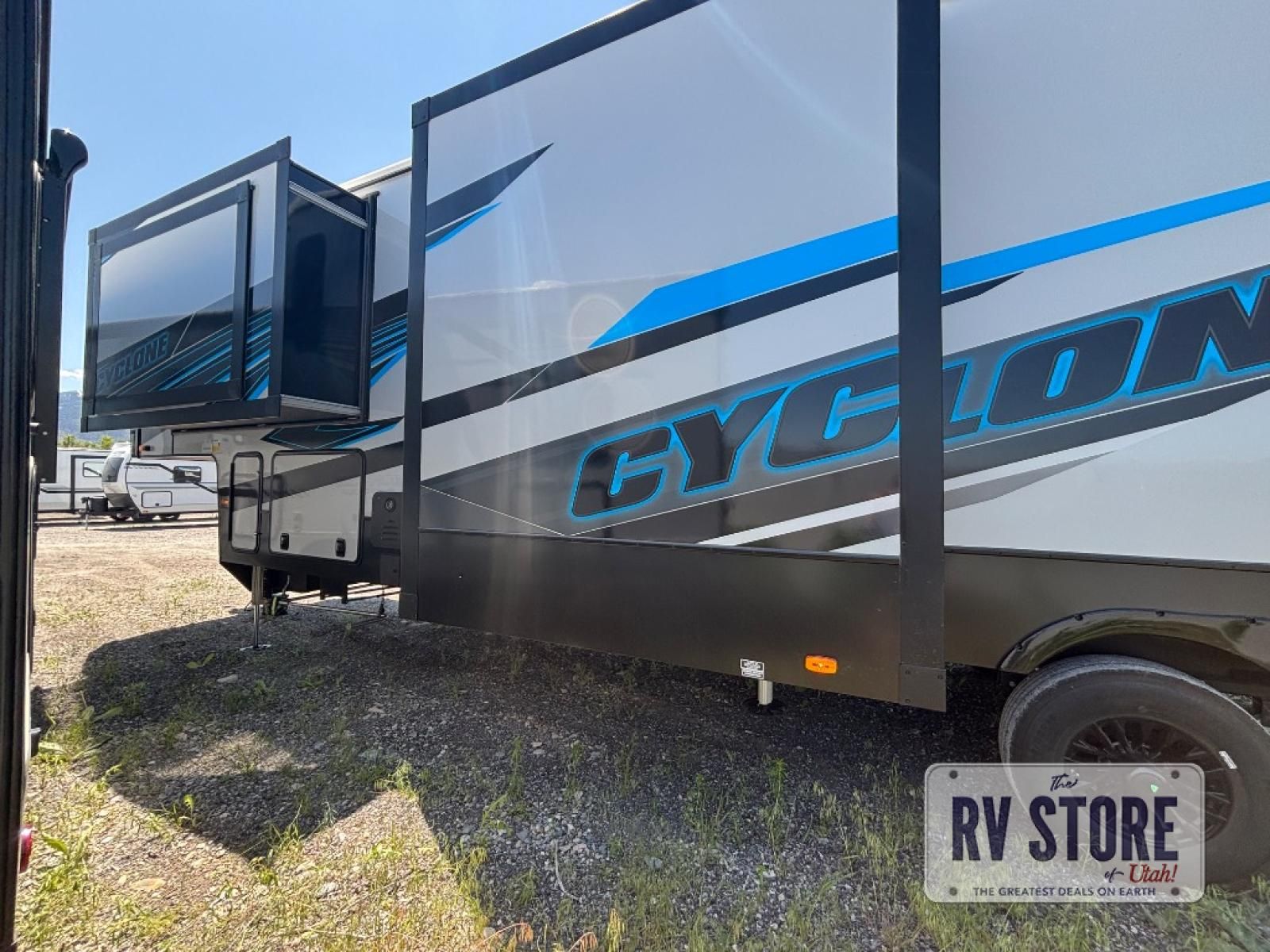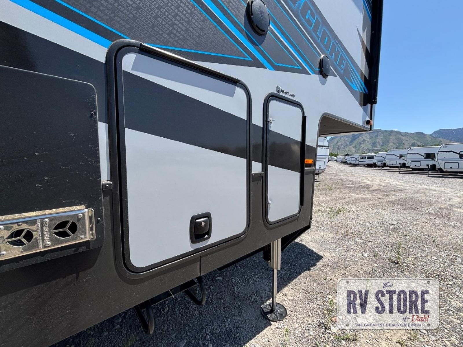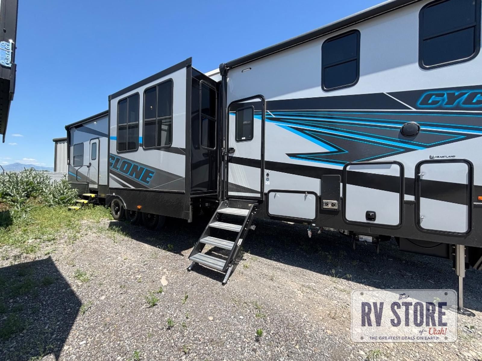 Satisfy your wanderlust with a Heartland Cyclone fifth wheel toy hauler! You won't have to sacrifice any luxury either with indulgent features like the king bedroom suite with an exclusive East to West bed tilt system with 30% more floor space, Stor-Mor three-sided access to the basement with 30% more storage capacity, and Step Caddy folding patio step for better stability as you enter or exit the patio. The industry first Grill and Go 25" residential pull out 3 burner griddle combo comes on models with an exterior kitchen for an easier cooking experience. Full height shaker cabinetry provides 25% more storage space so you can bring more camping necessities with you. If you like to dry camp longer then you will appreciate the industry's largest 150 gallons fresh water tanks. Come find the perfect model for you today!
