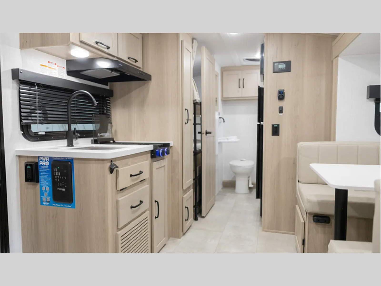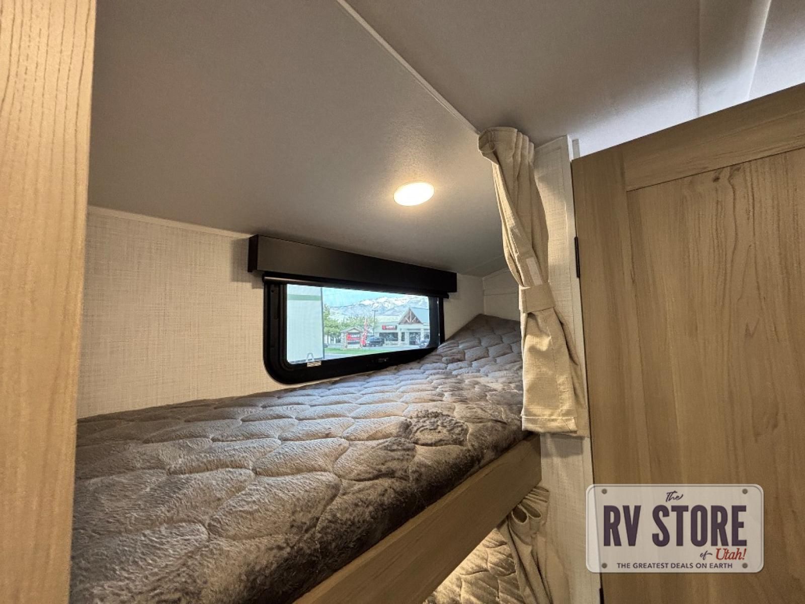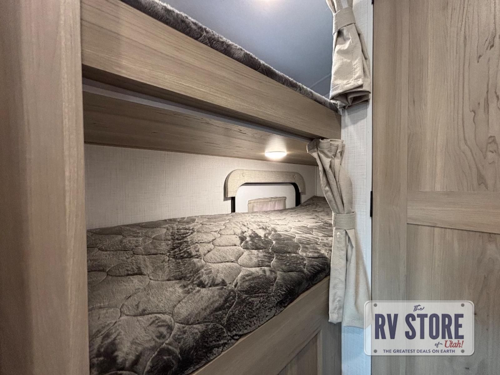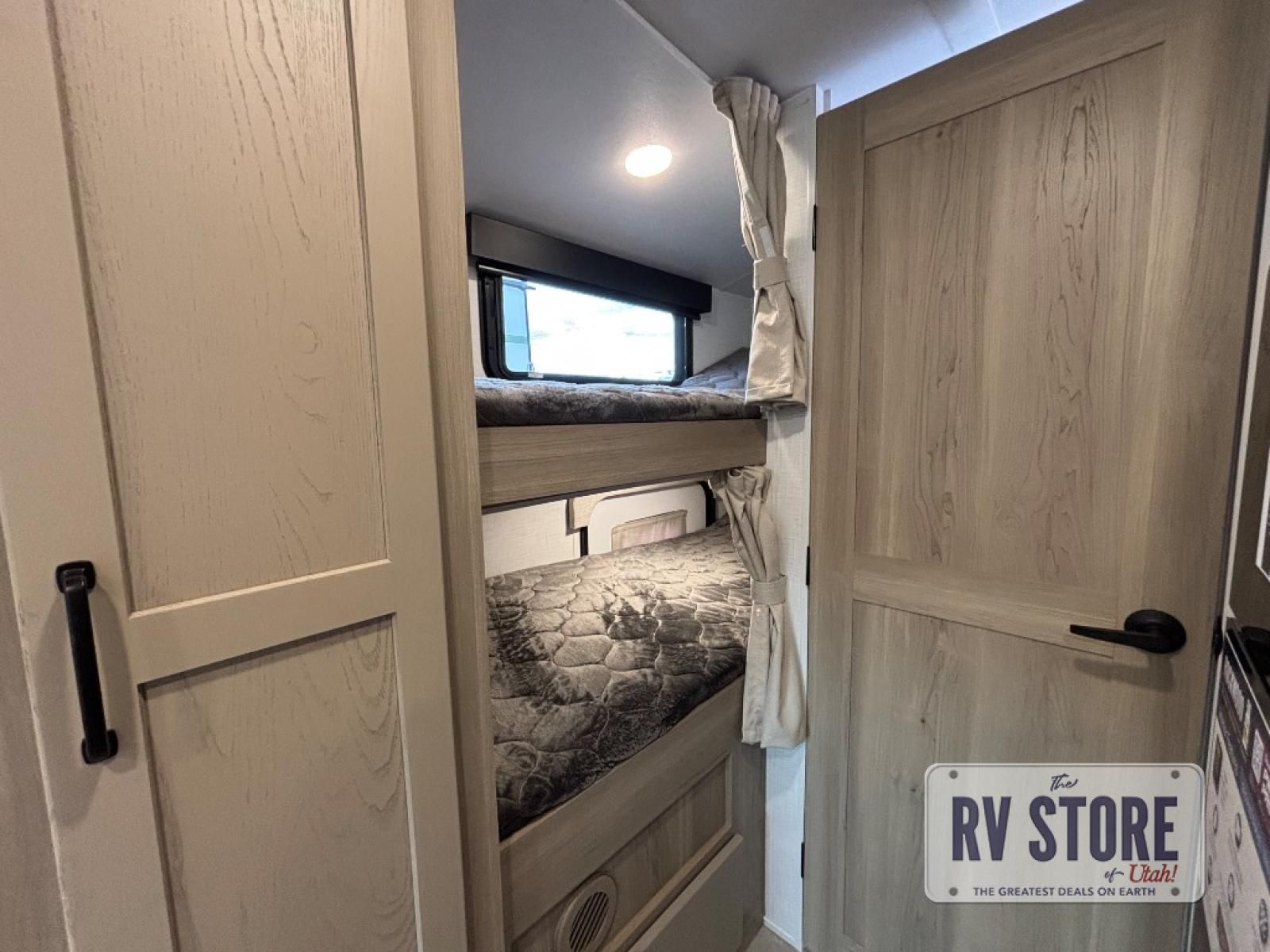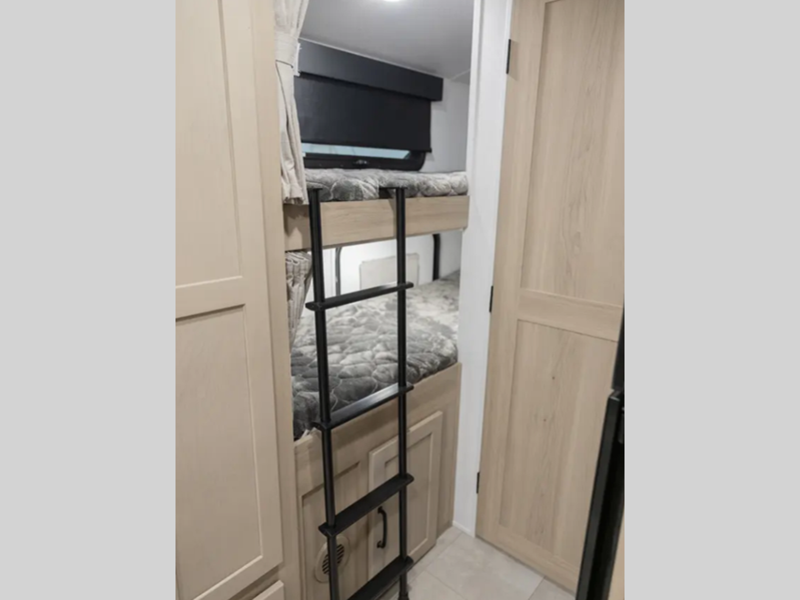You're going to love camping with your family or friends in this spacious bunk model! The bunk beds will be perfect for little ones, while you take the front full-size bed. There is also a 44" booth dinette within the slide out for additional sleeping and seating space. The kitchen includes everything the chef will need to prepare meals each day, including a recessed cooktop, microwave oven, and a 12V refrigerator for perishables. If the weather is nice, you may just find the chef outdoors cooking on the outside griddle under the 14' power awning. And check out the exterior bike door that will be perfect for bikes, luggage, or extra camp gear. The optional Power Package available on this model includes three 200W solar panels, a 460 Ah Mastervolt MLI lithium-ion battery, two smart remotes, and more off-grid features!