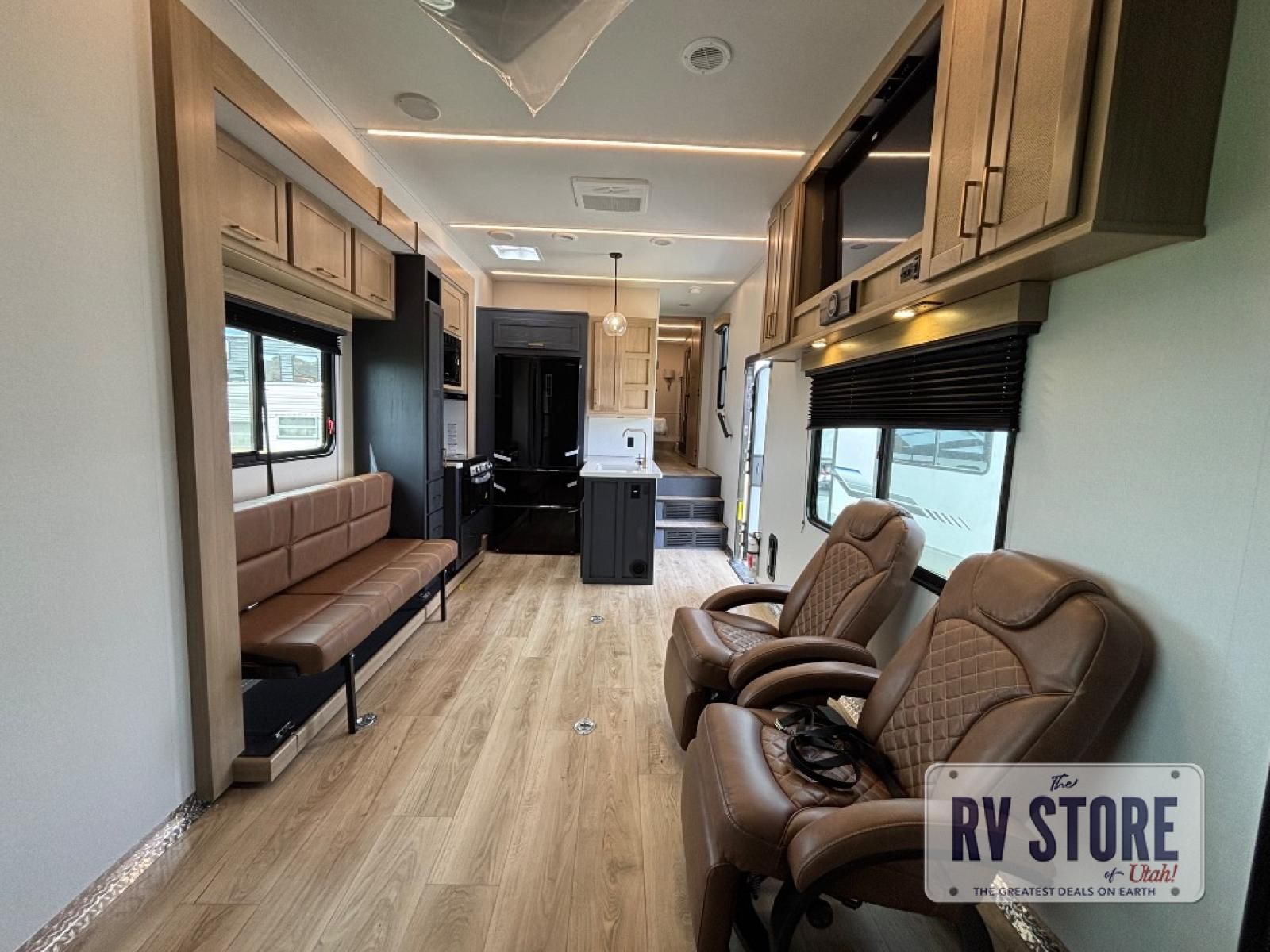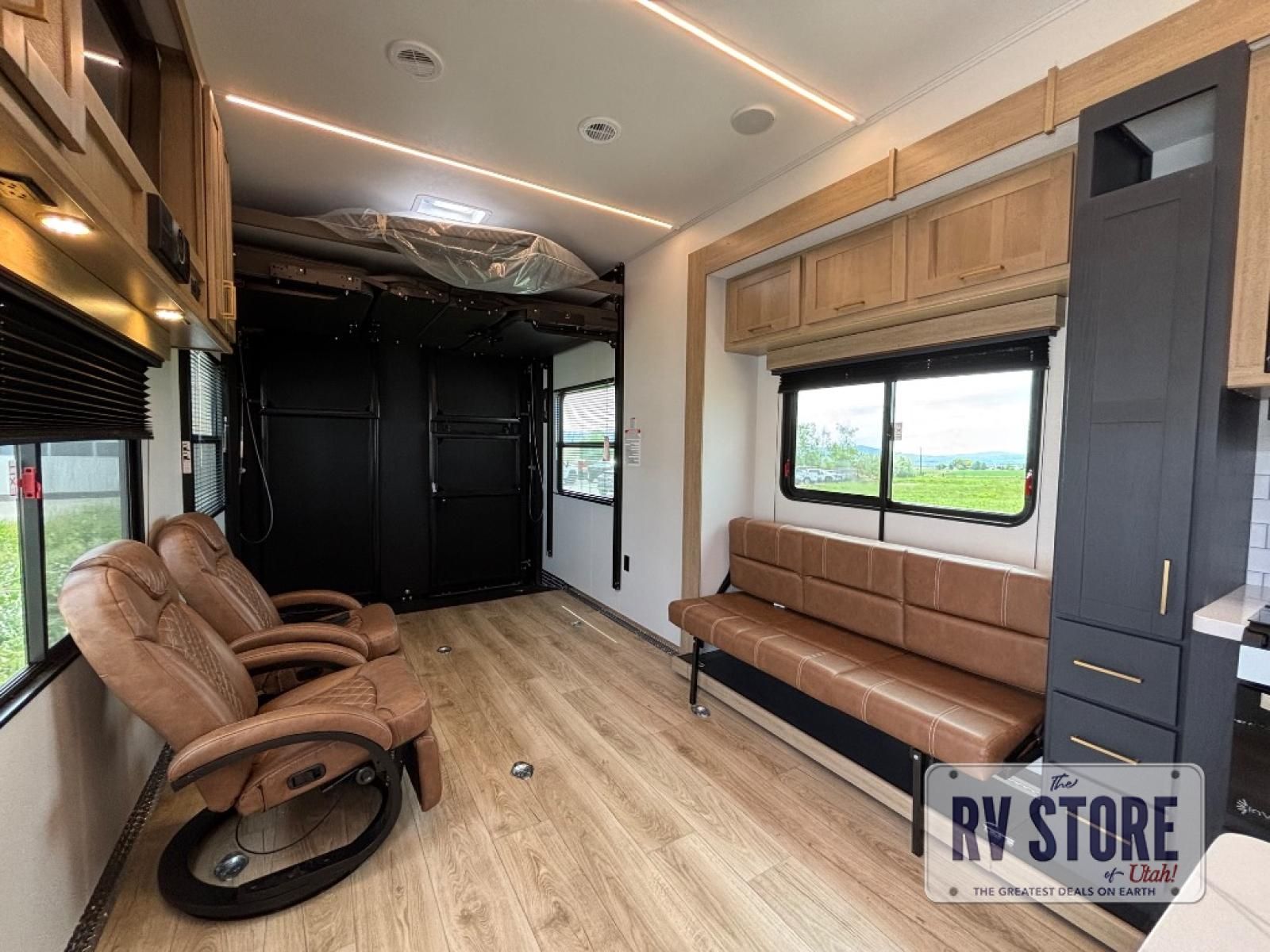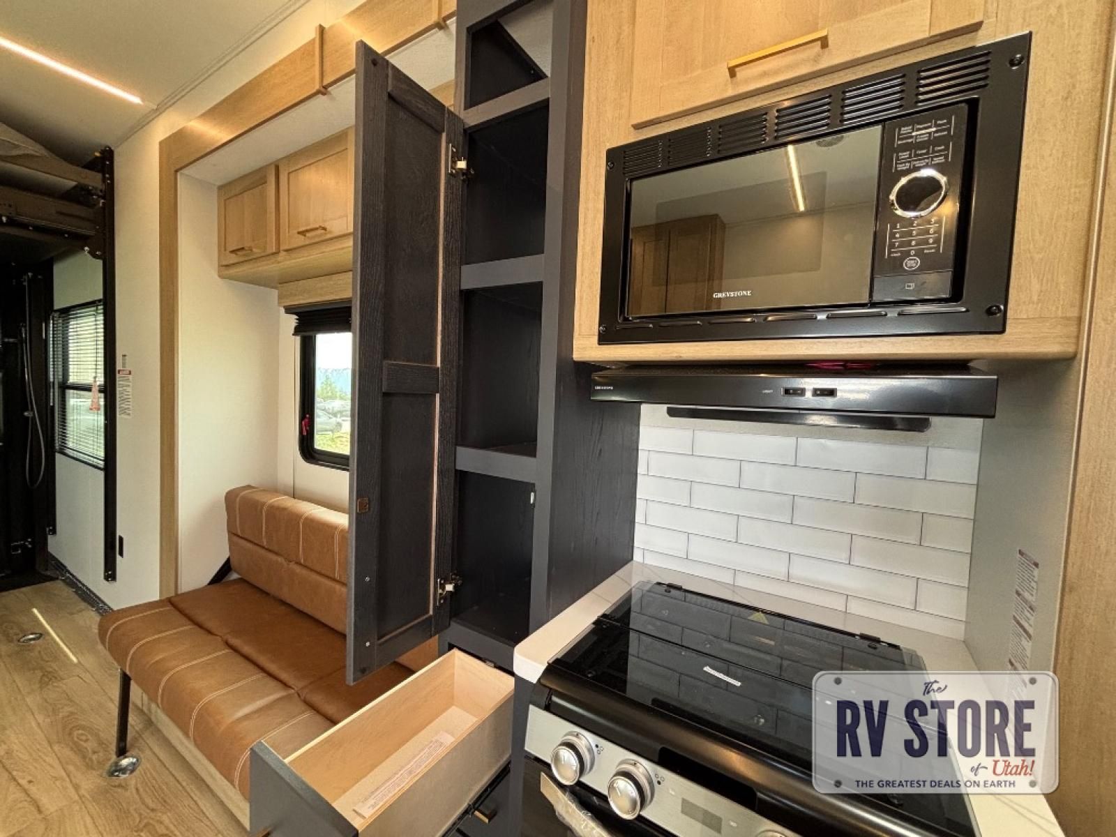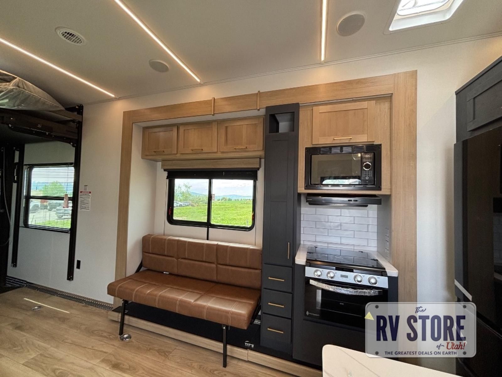 In the central living area, you’ll find theater seating, a large entertainment center, and modern finishes. The kitchen includes solid-surface countertops, a large refrigerator, three-burner cooktop, oven, microwave, and pantry — providing everything needed for meals on the road.