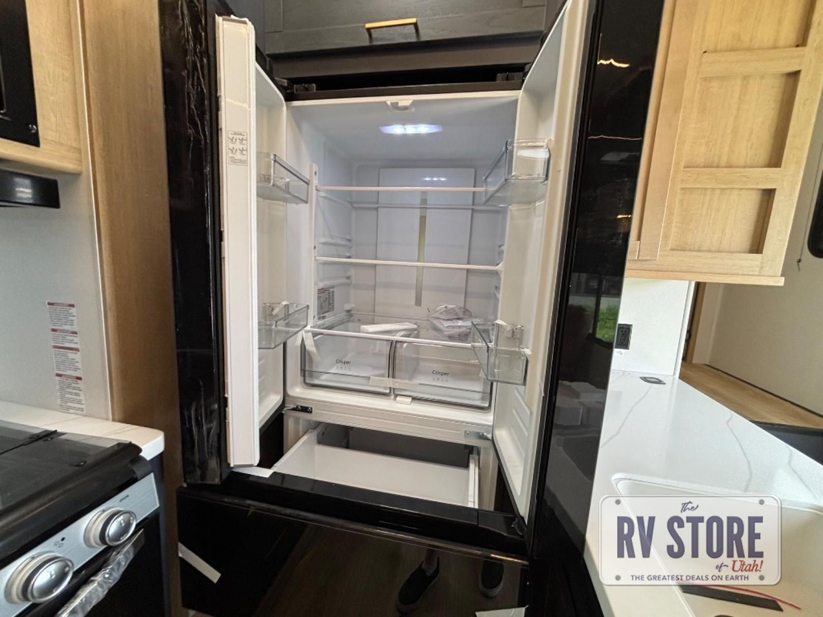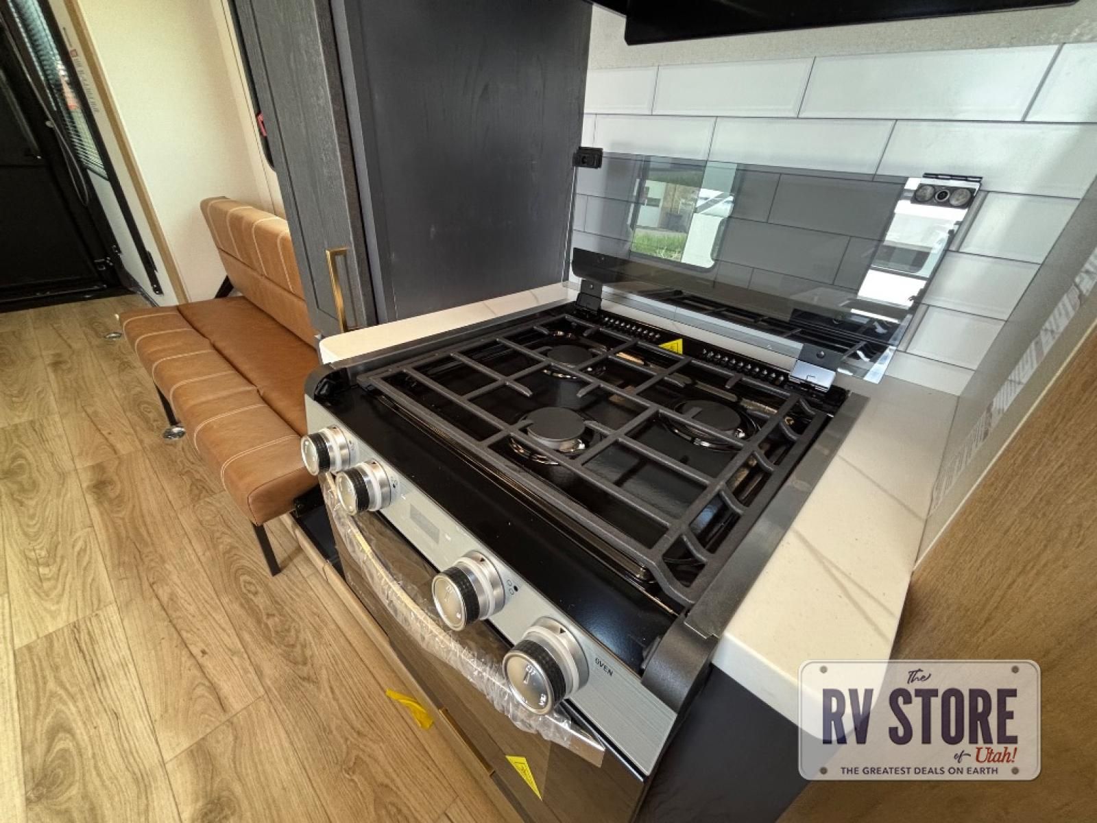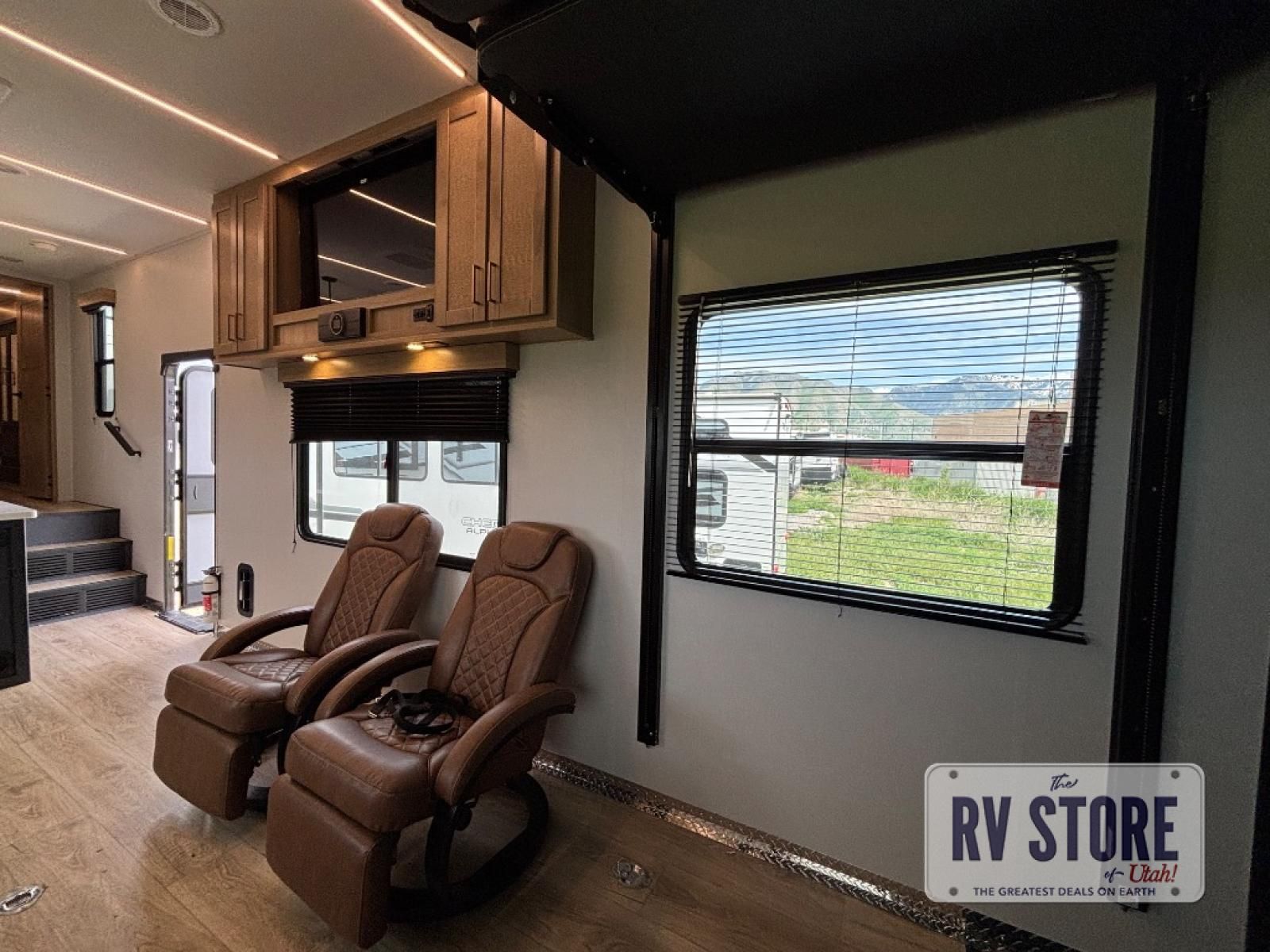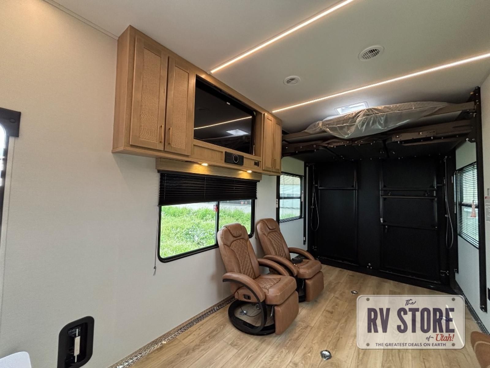 In the central living area, you’ll find theater seating, a large entertainment center, and modern finishes. The kitchen includes solid-surface countertops, a large refrigerator, three-burner cooktop, oven, microwave, and pantry — providing everything needed for meals on the road.