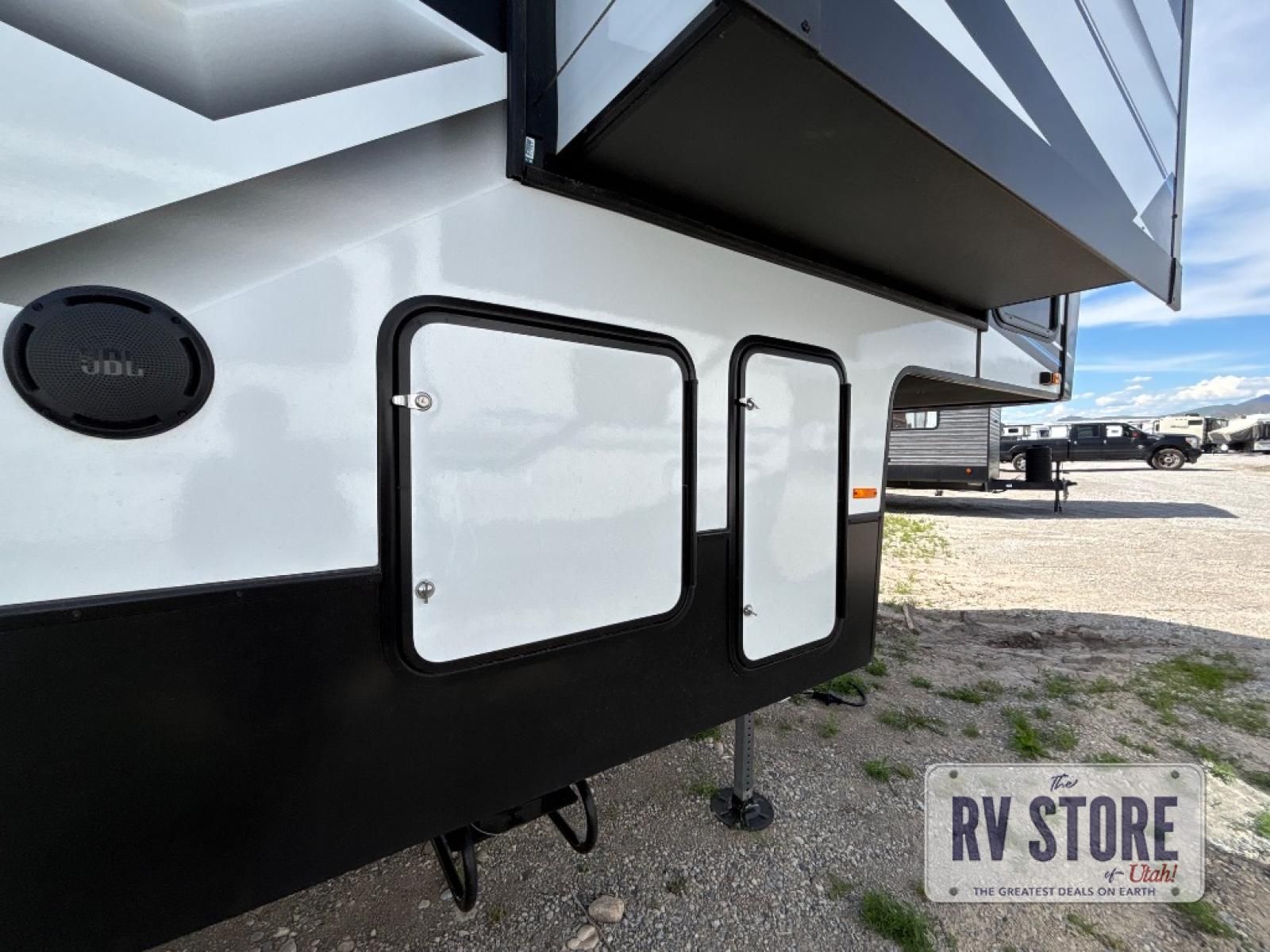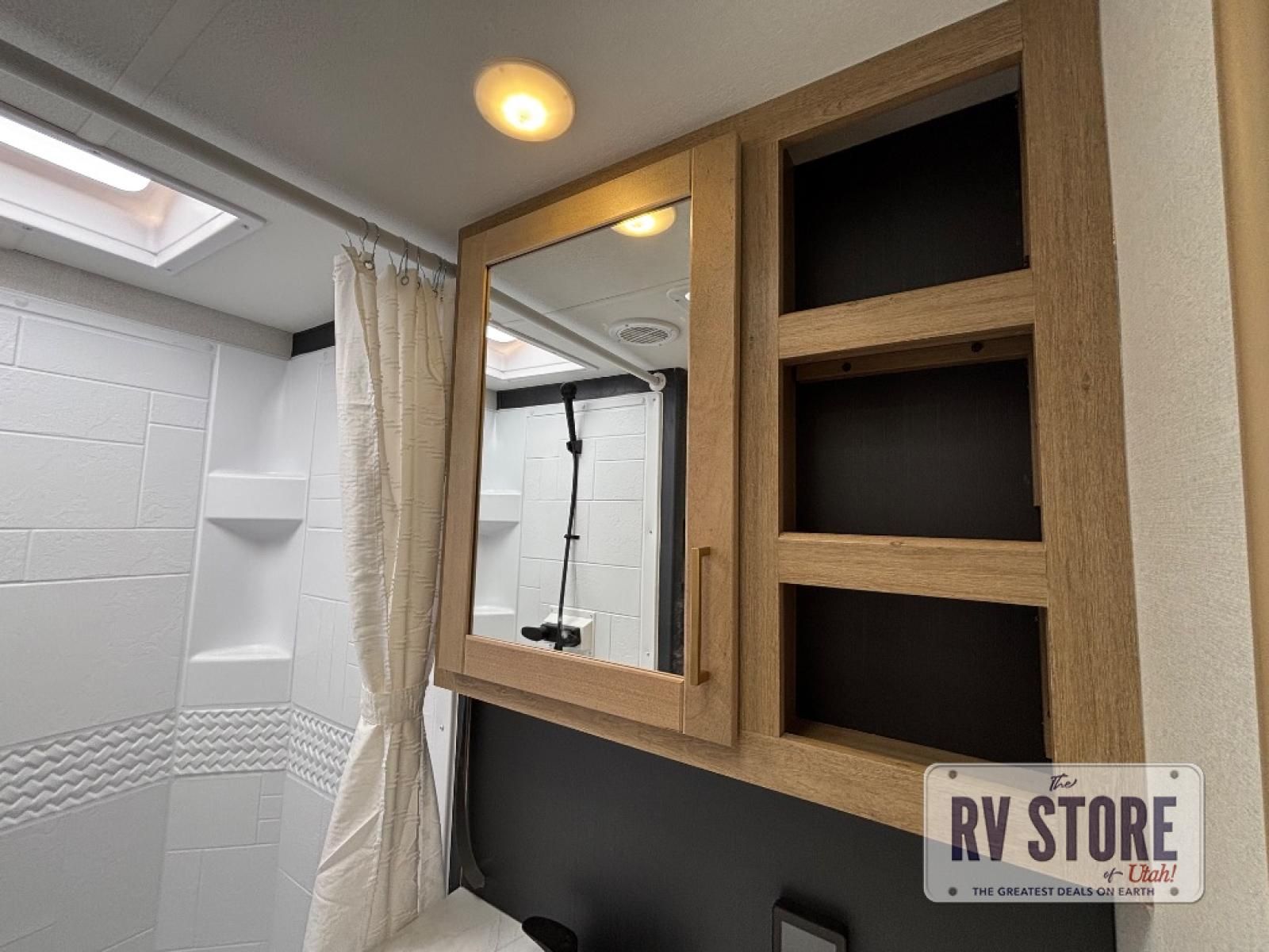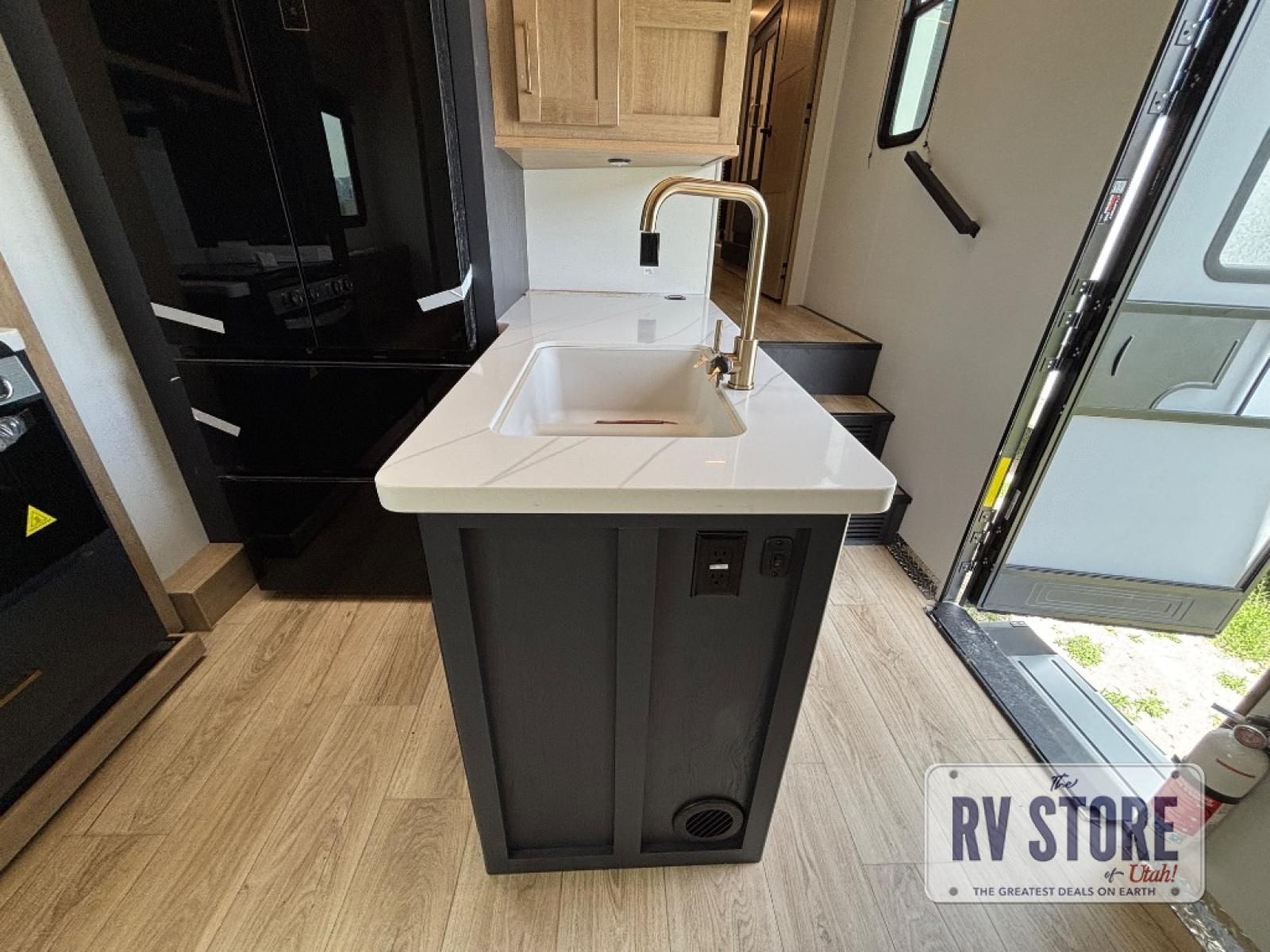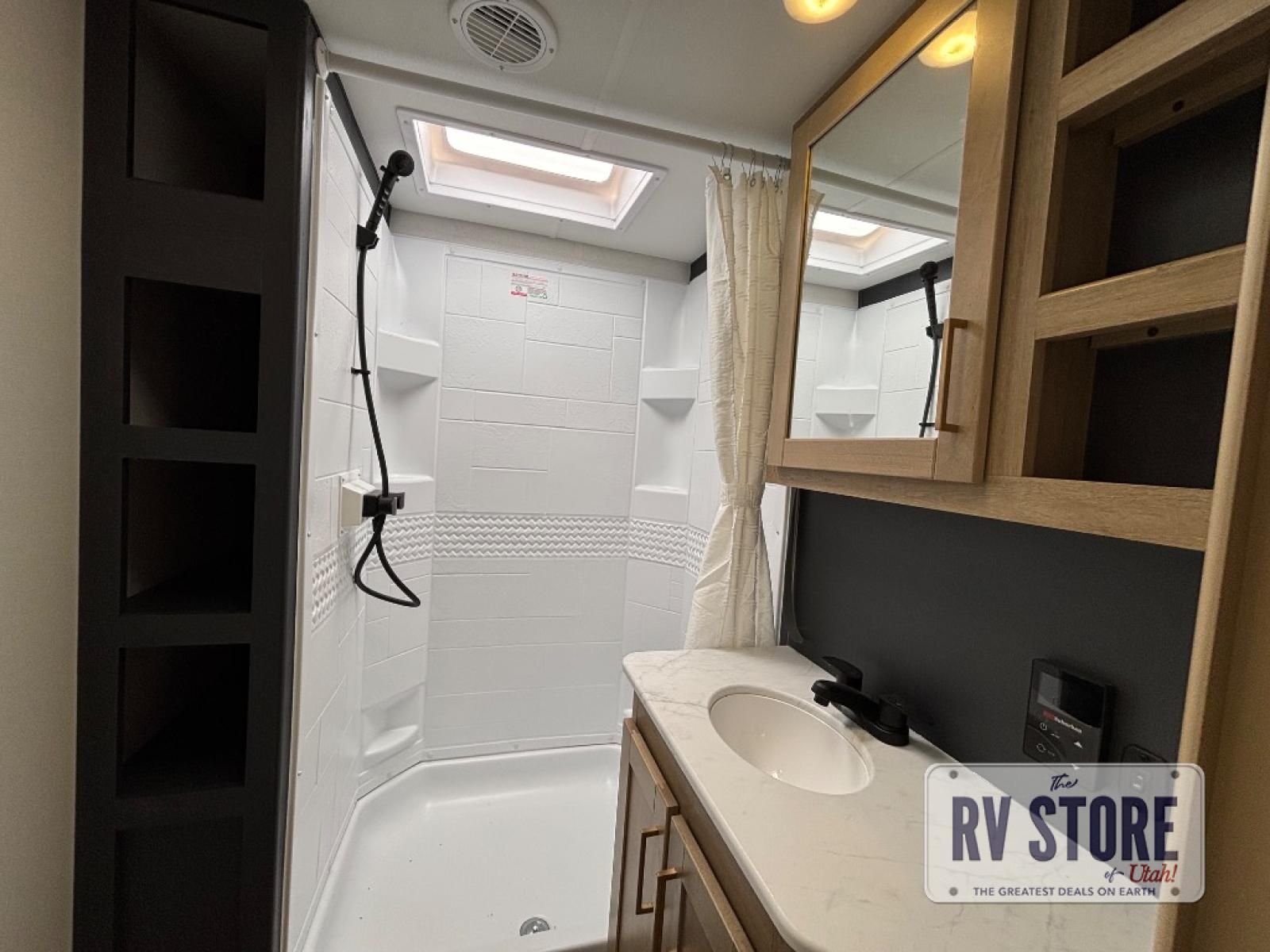In the central living area, you’ll find theater seating, a large entertainment center, and modern finishes. The kitchen includes solid-surface countertops, a large refrigerator, three-burner cooktop, oven, microwave, and pantry — providing everything needed for meals on the road.