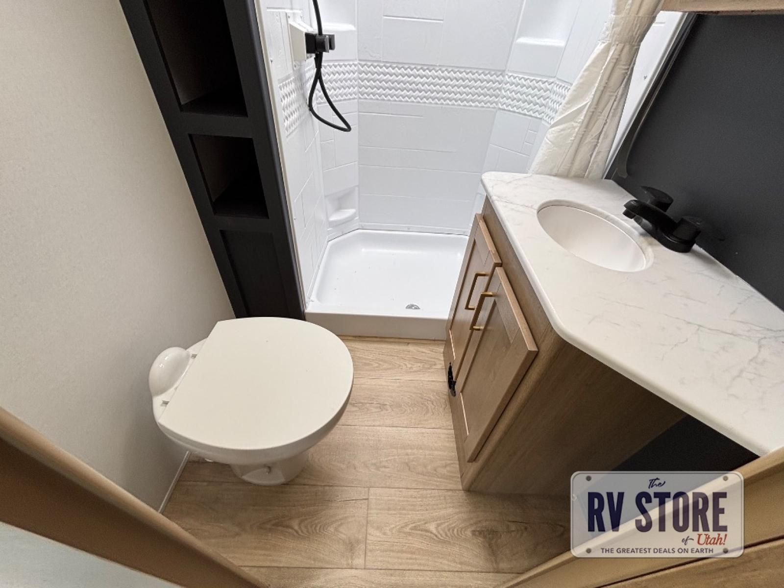 The front king master suite gives you a spacious retreat with wardrobe storage, while the loft offers additional sleeping space. The bathroom features a residential-style shower, toilet, vanity, and storage, giving you full convenience wherever your adventures take you.