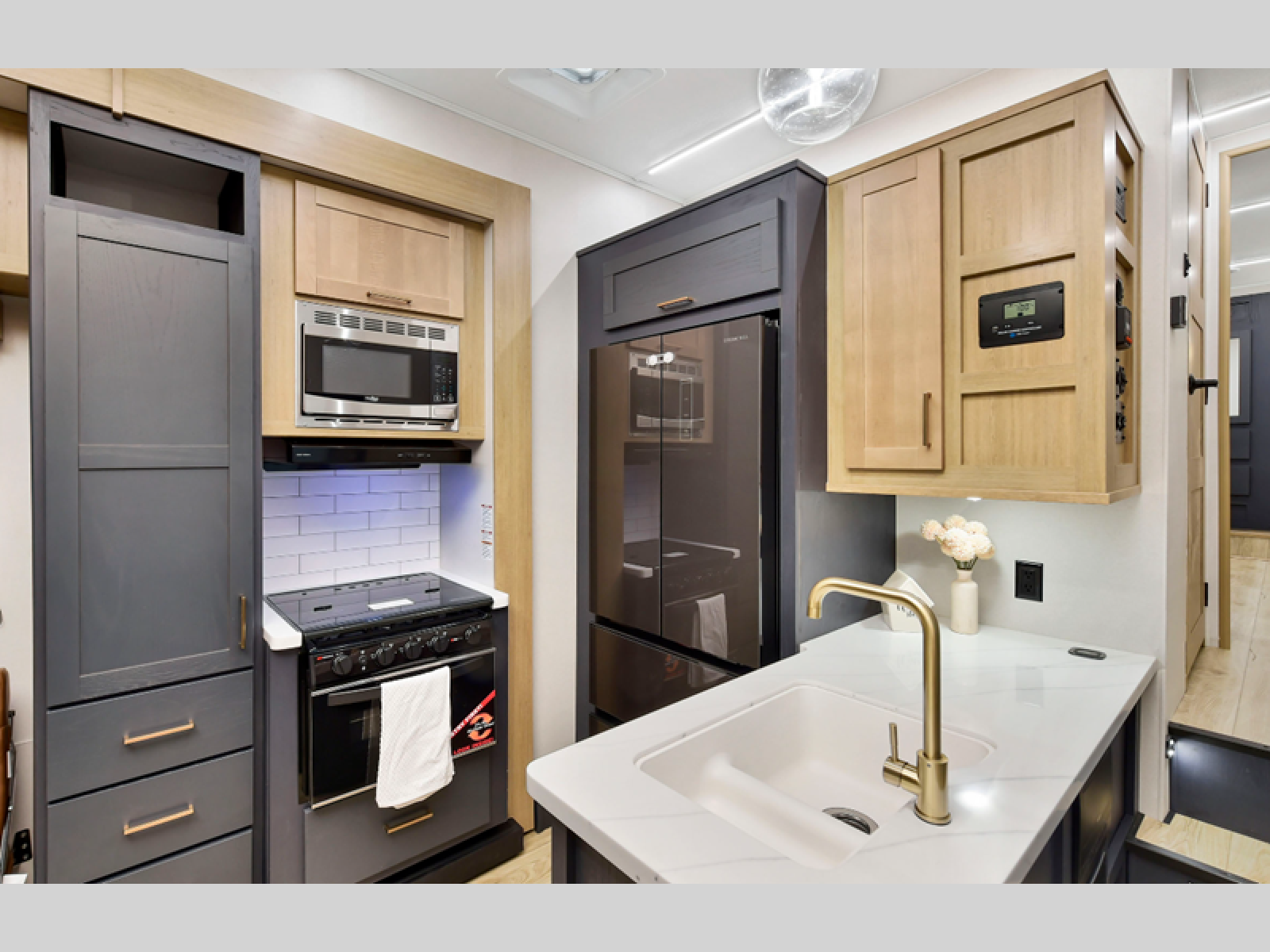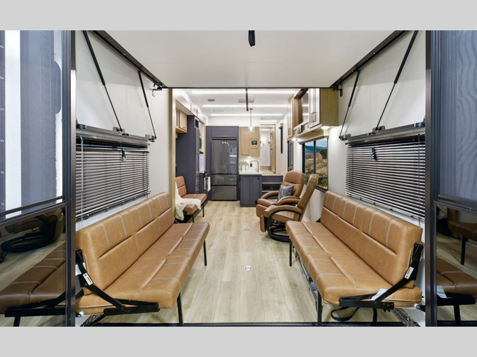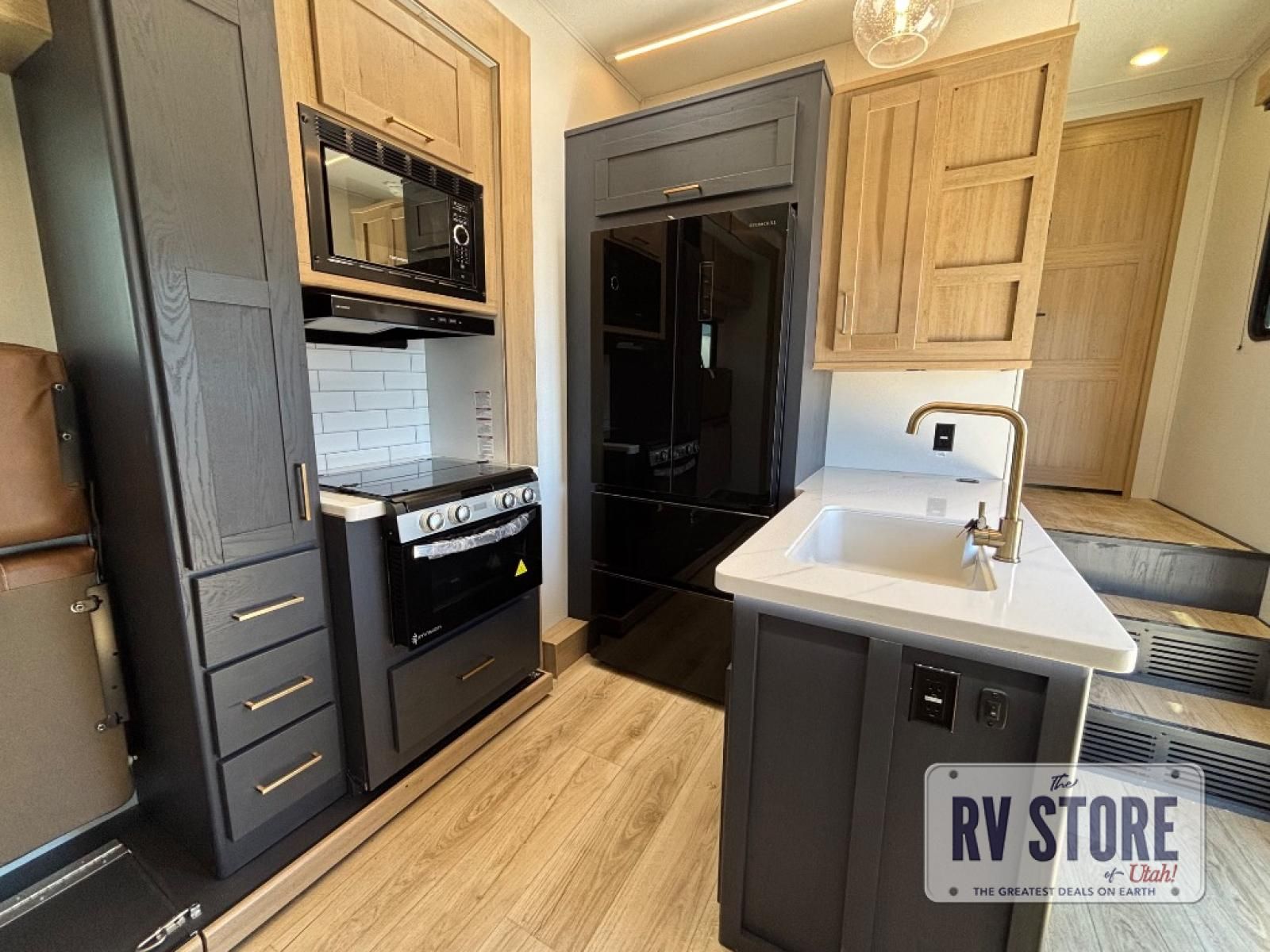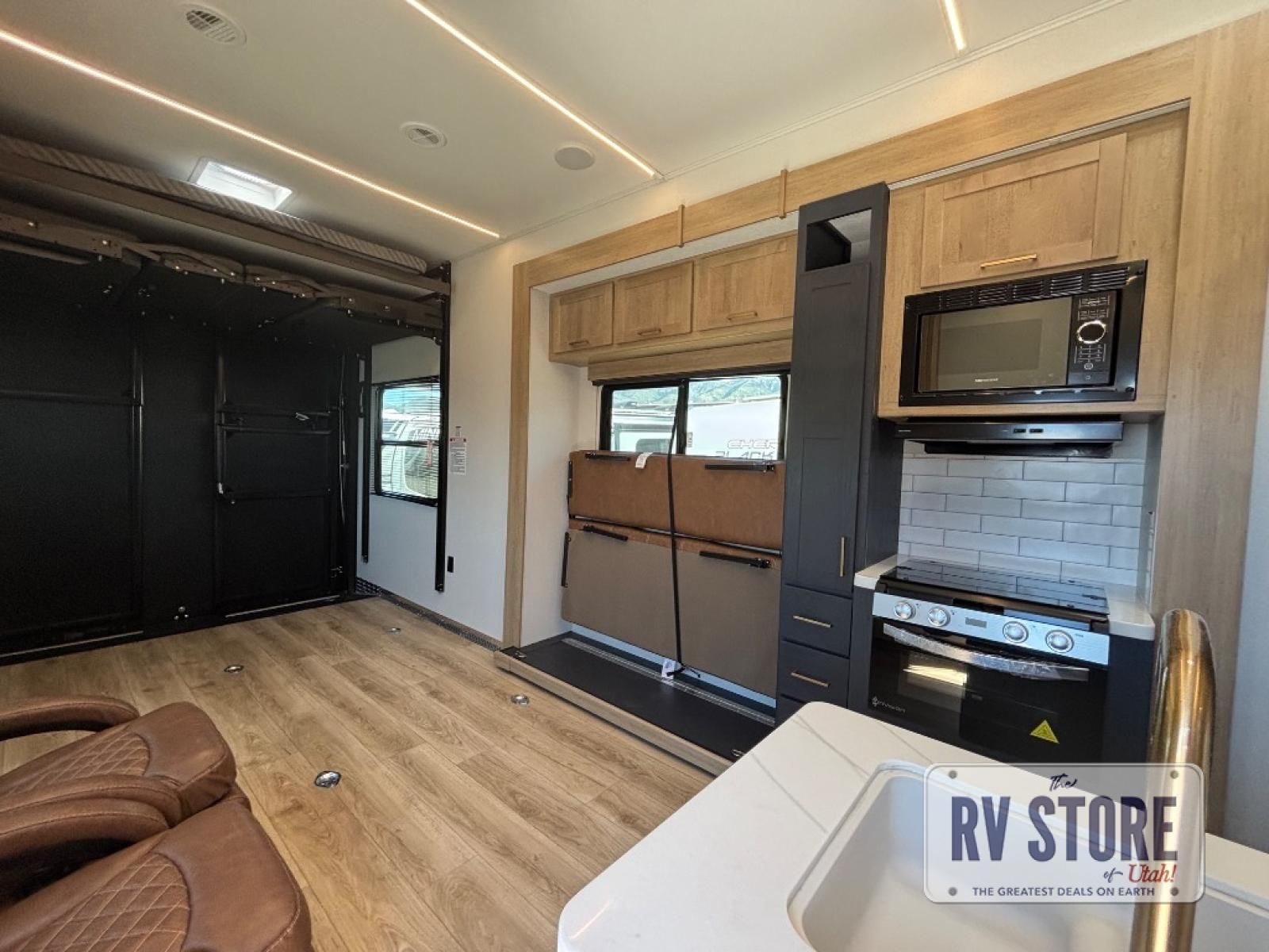 In the central living area, you’ll find theater seating, a large entertainment center, and modern finishes. The kitchen includes solid-surface countertops, a large refrigerator, three-burner cooktop, oven, microwave, and pantry — providing everything needed for meals on the road.