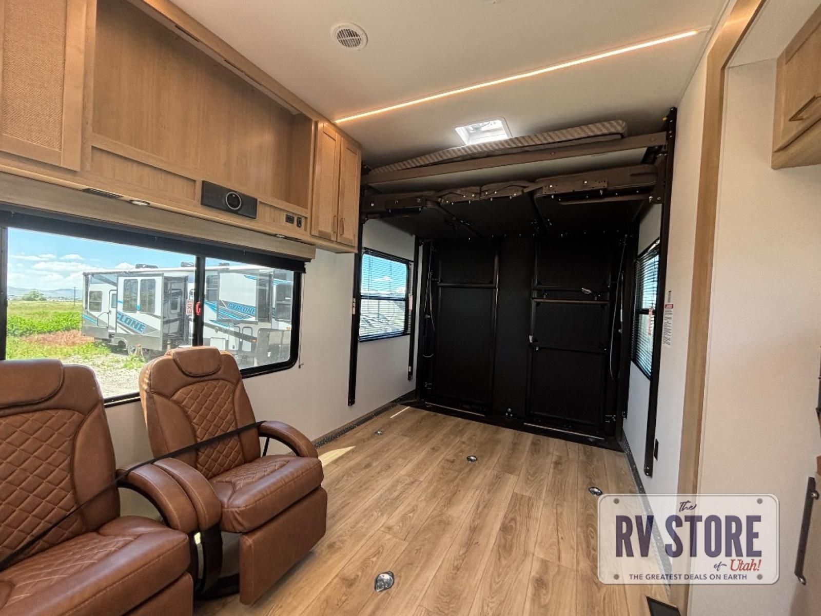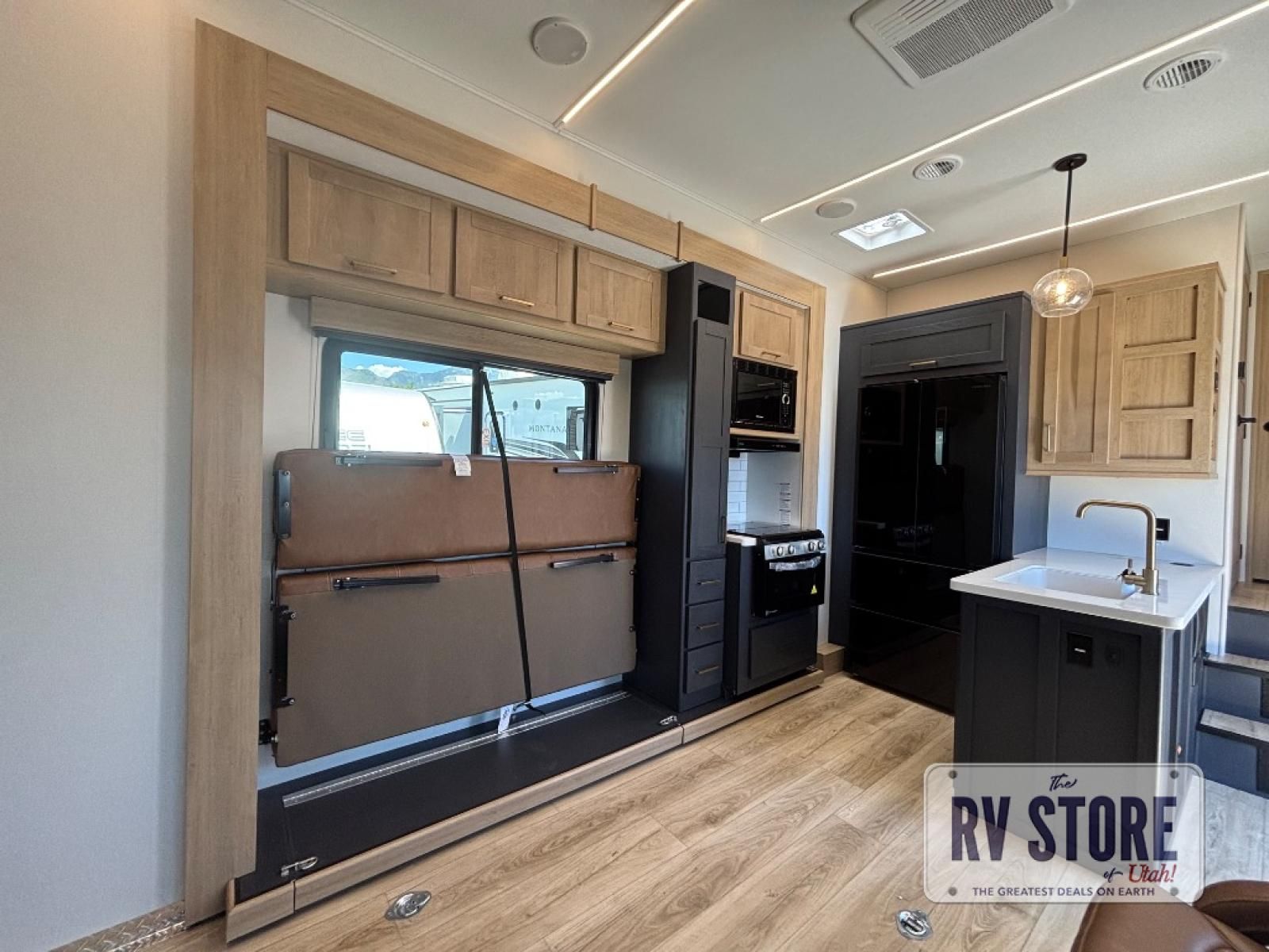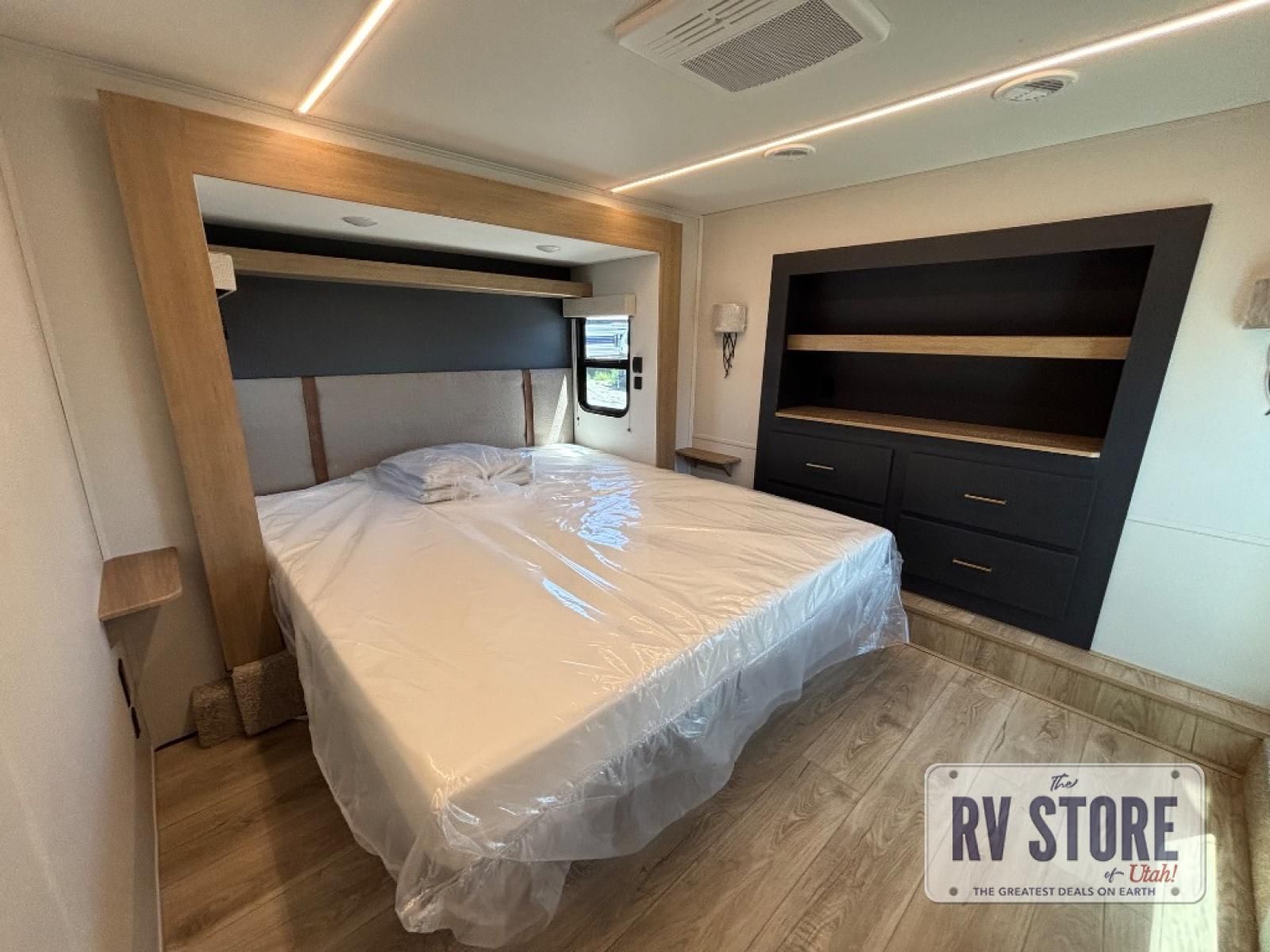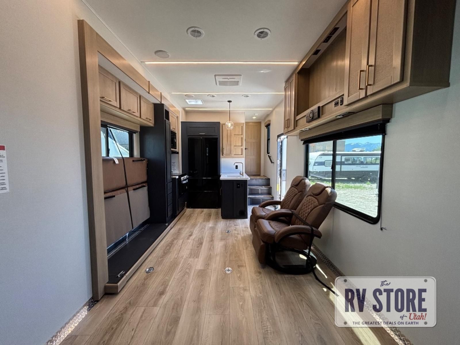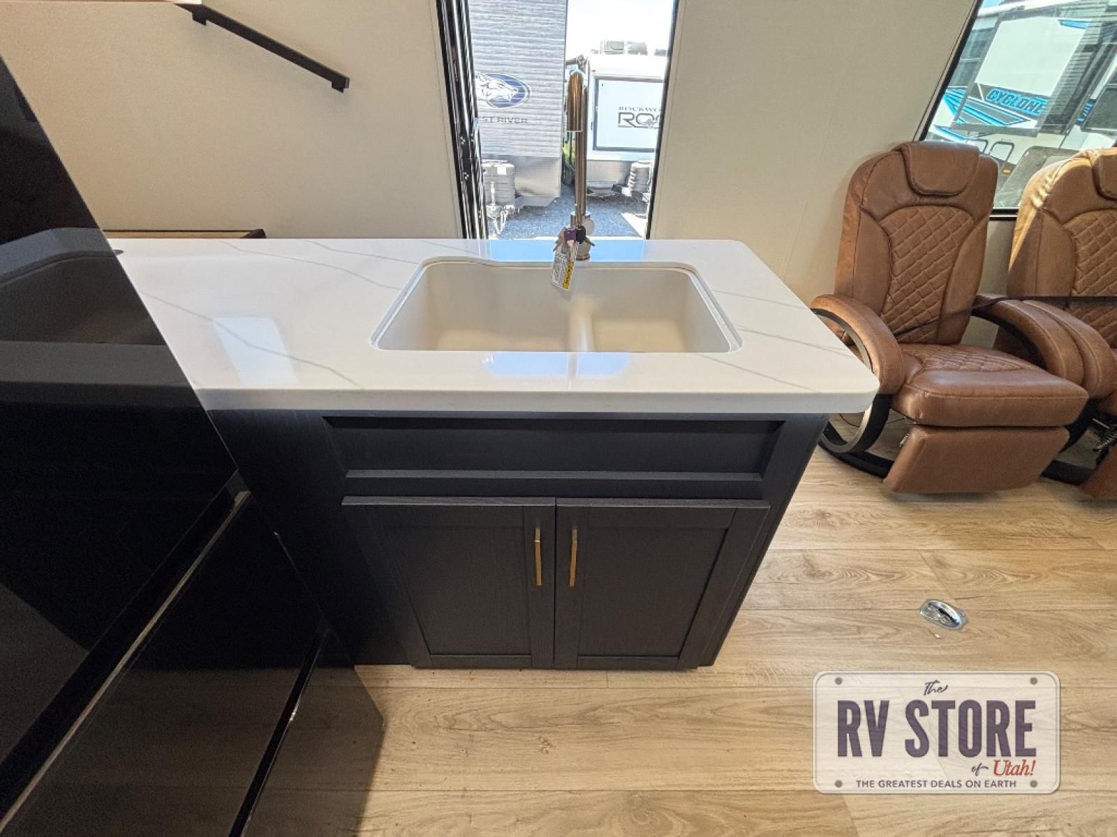 In the central living area, you’ll find theater seating, a large entertainment center, and modern finishes. The kitchen includes solid-surface countertops, a large refrigerator, three-burner cooktop, oven, microwave, and pantry — providing everything needed for meals on the road.