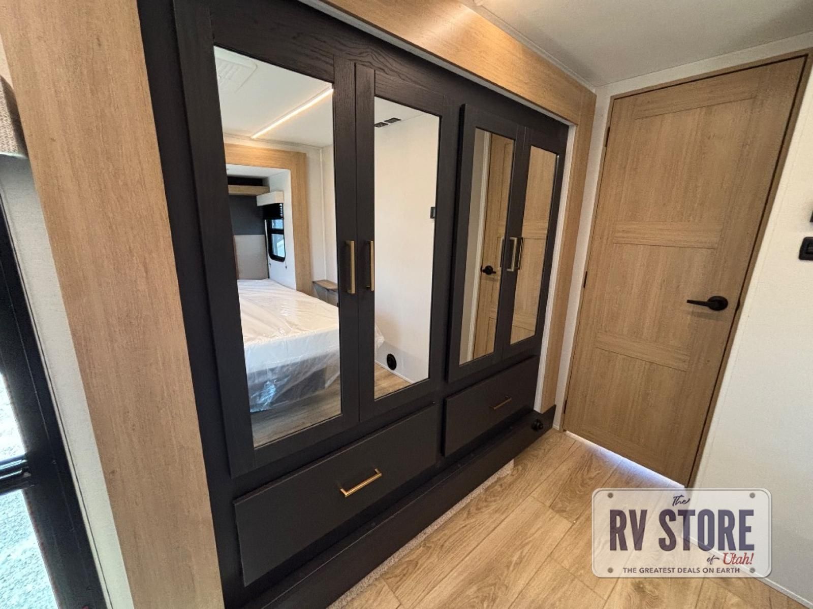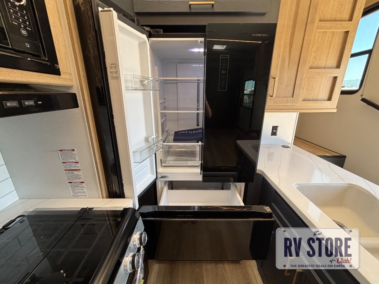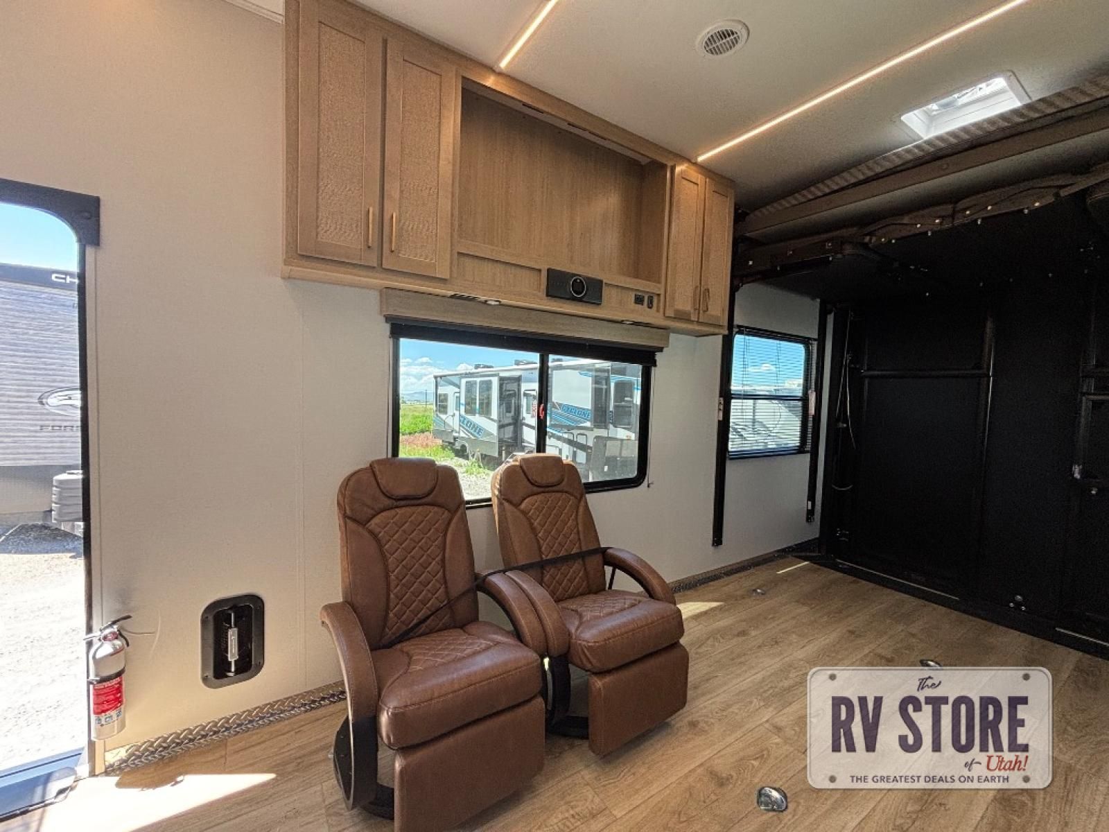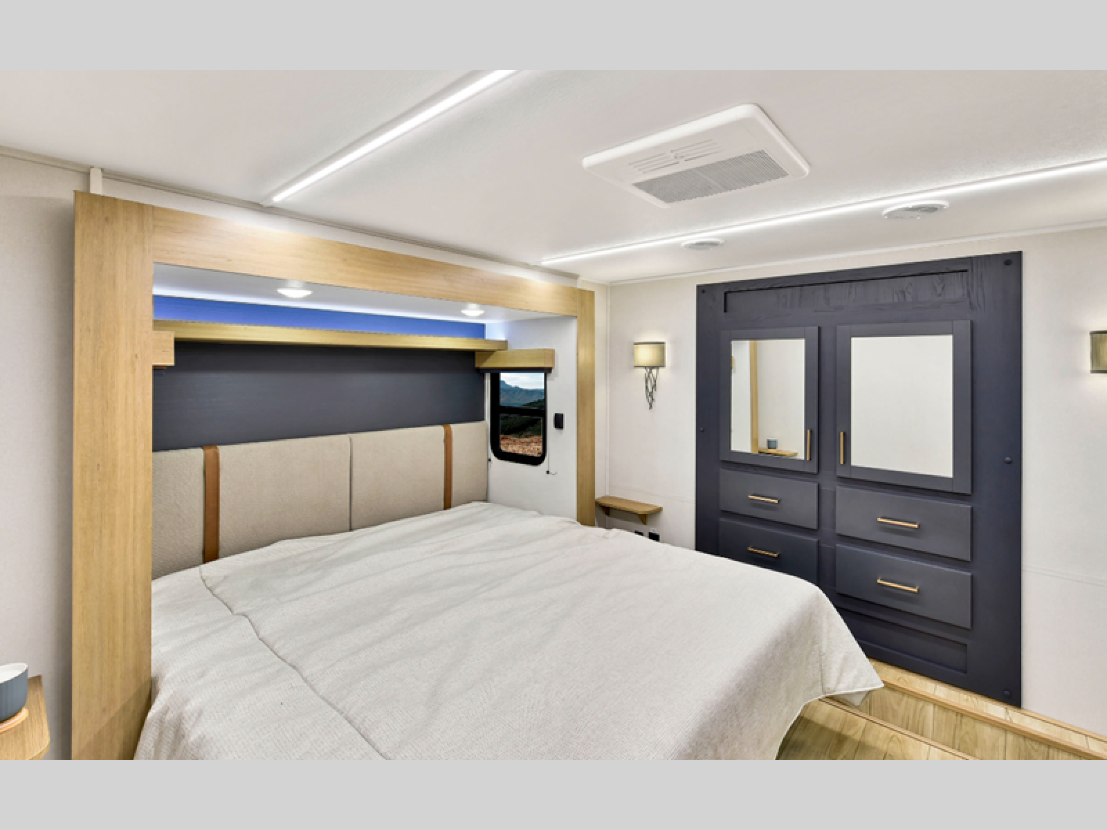 In the central living area, you’ll find theater seating, a large entertainment center, and modern finishes. The kitchen includes solid-surface countertops, a large refrigerator, three-burner cooktop, oven, microwave, and pantry — providing everything needed for meals on the road.