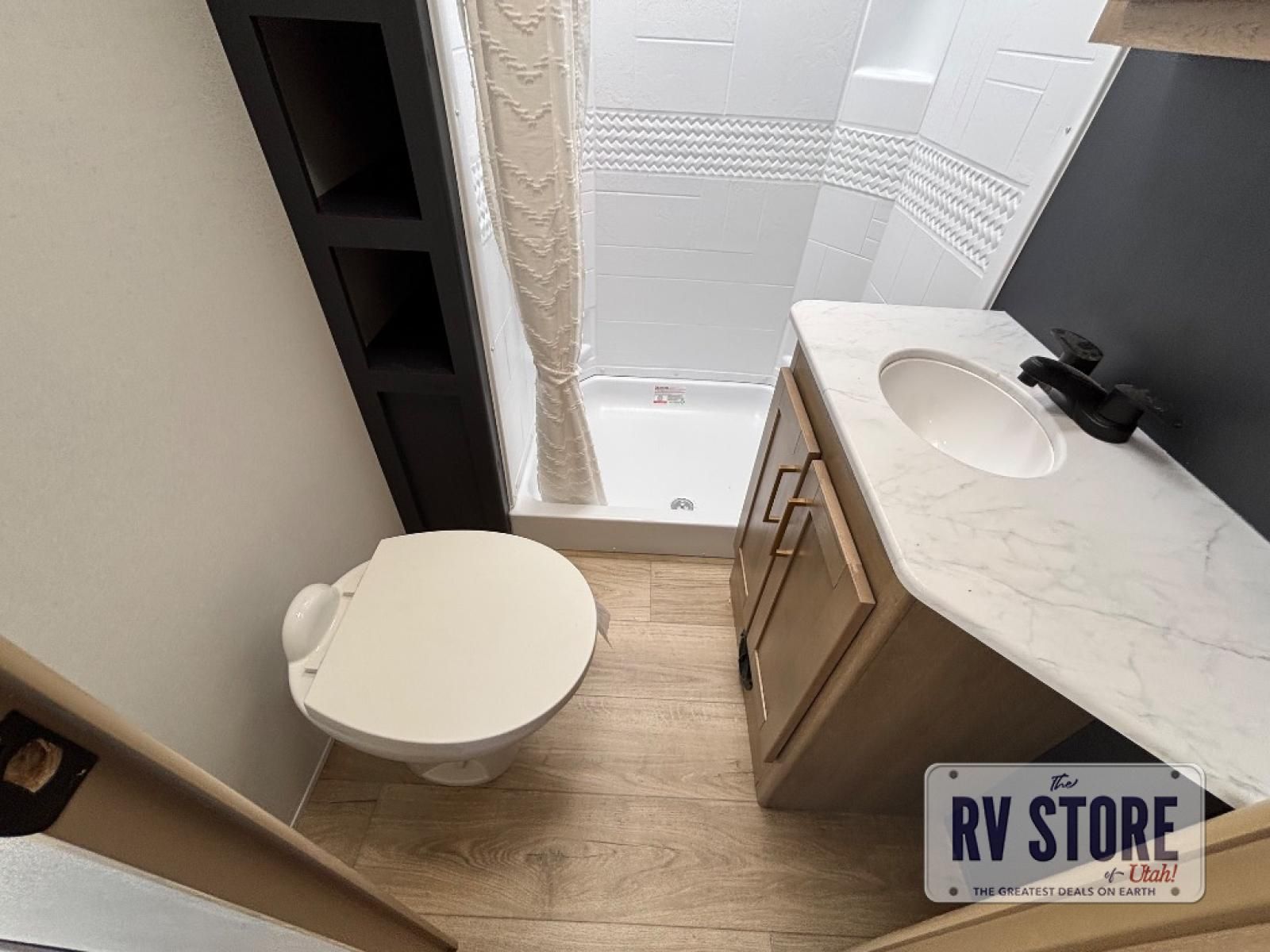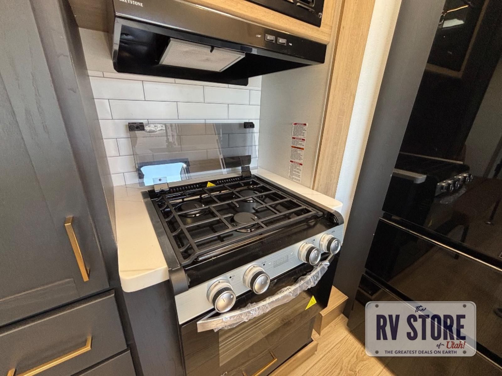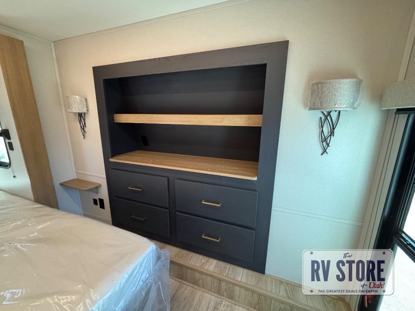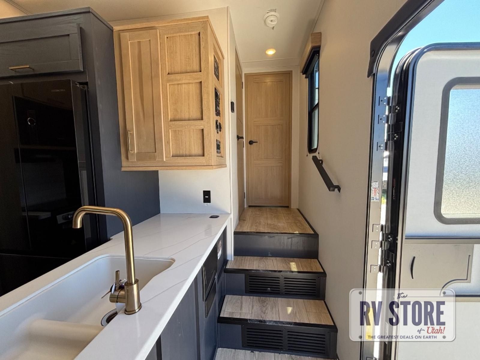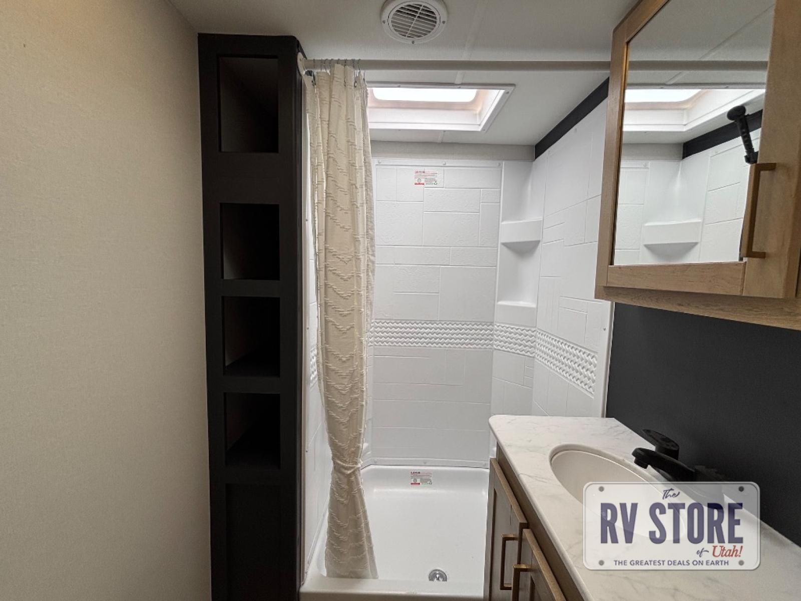In the central living area, you’ll find theater seating, a large entertainment center, and modern finishes. The kitchen includes solid-surface countertops, a large refrigerator, three-burner cooktop, oven, microwave, and pantry — providing everything needed for meals on the road.