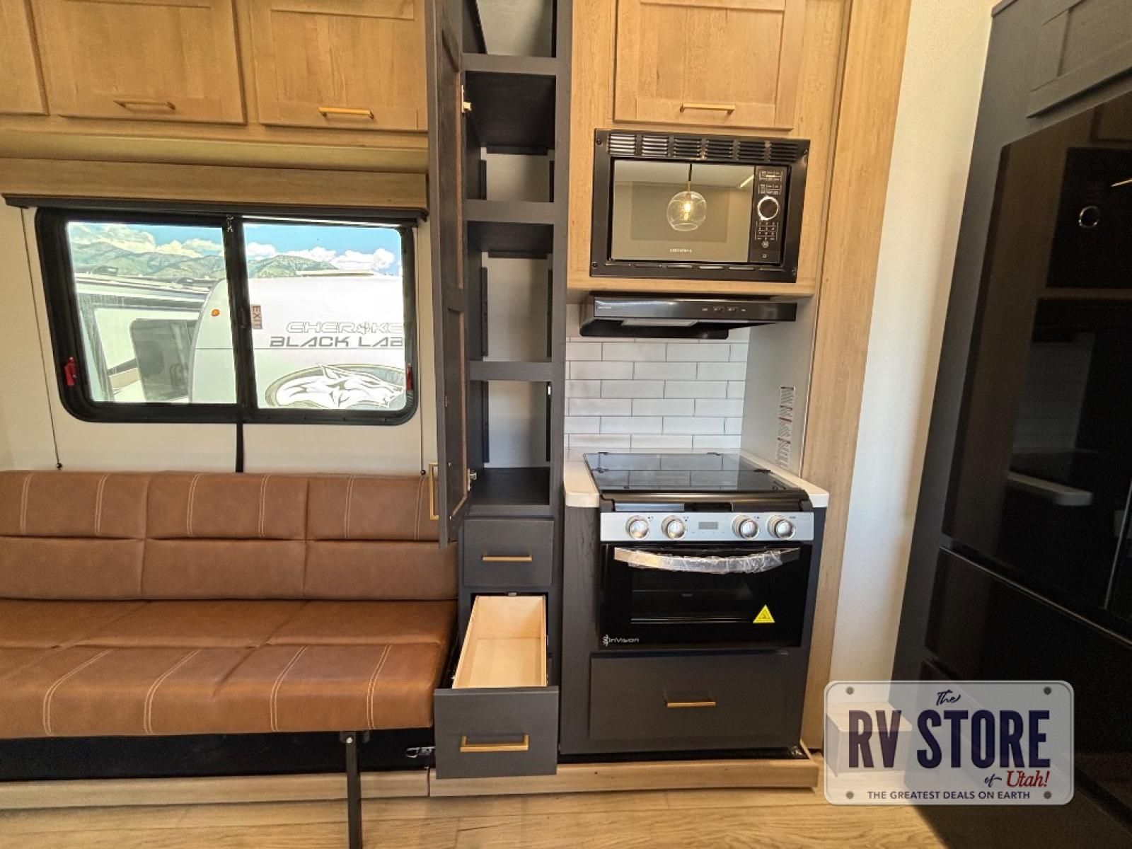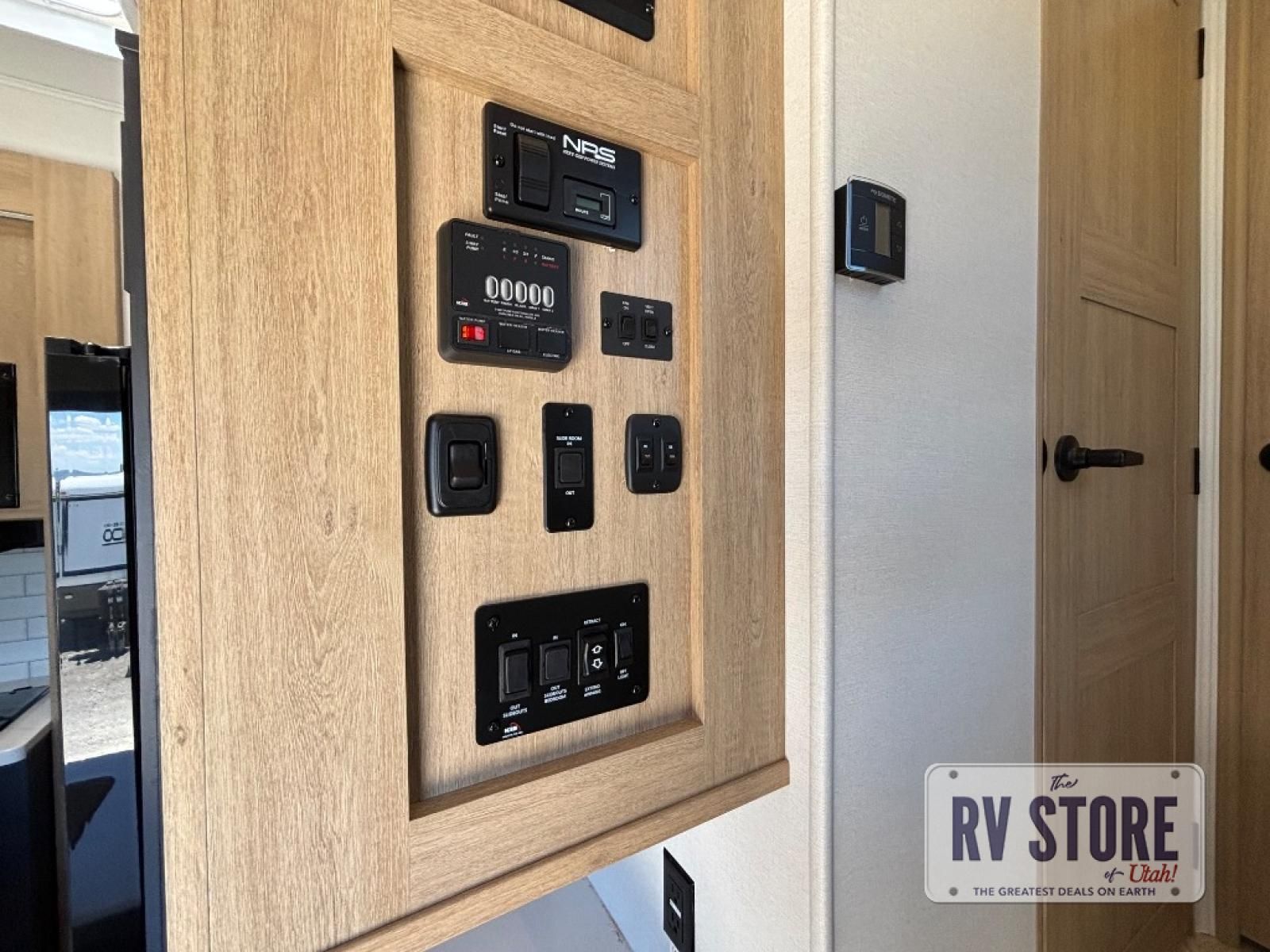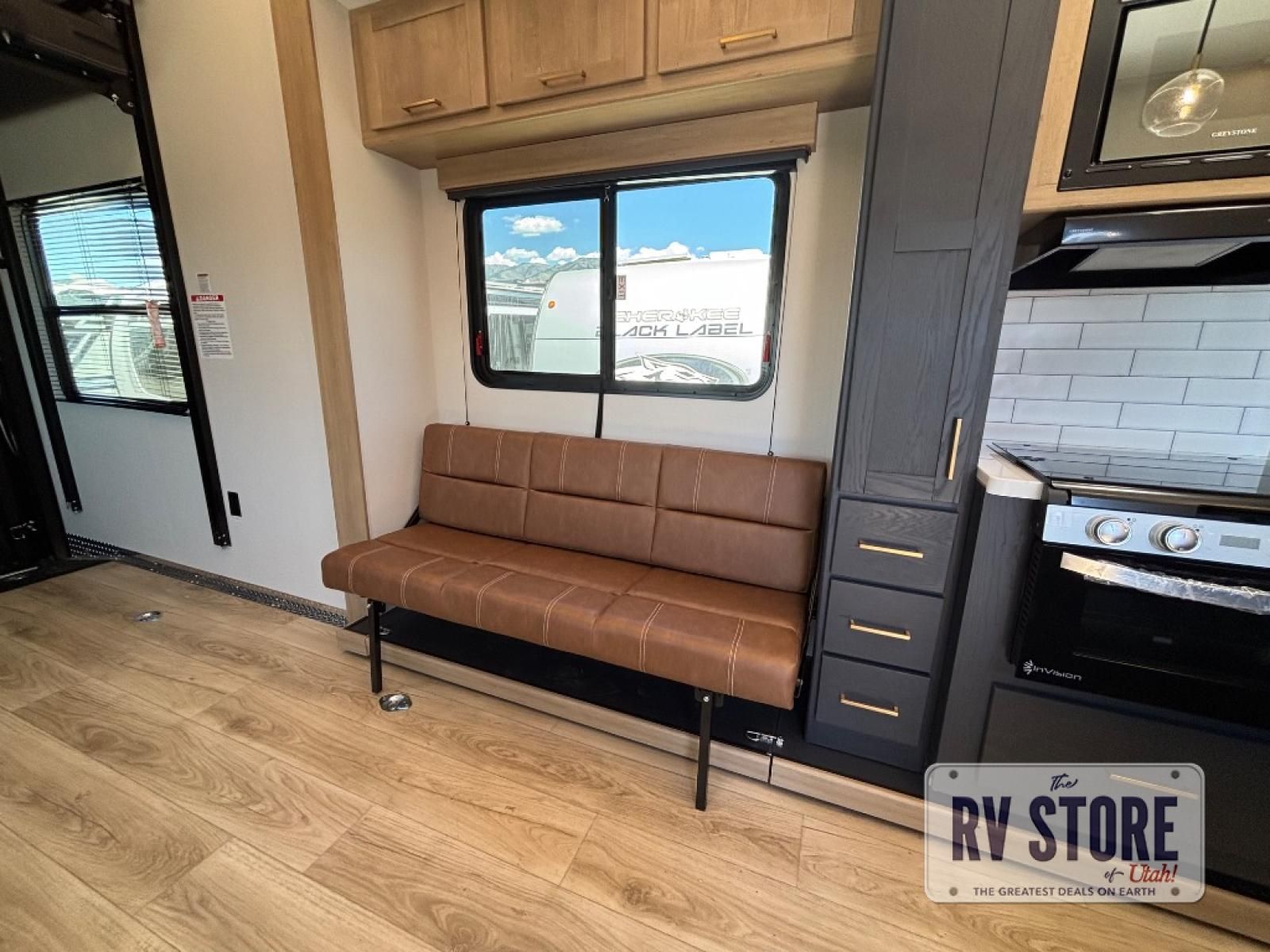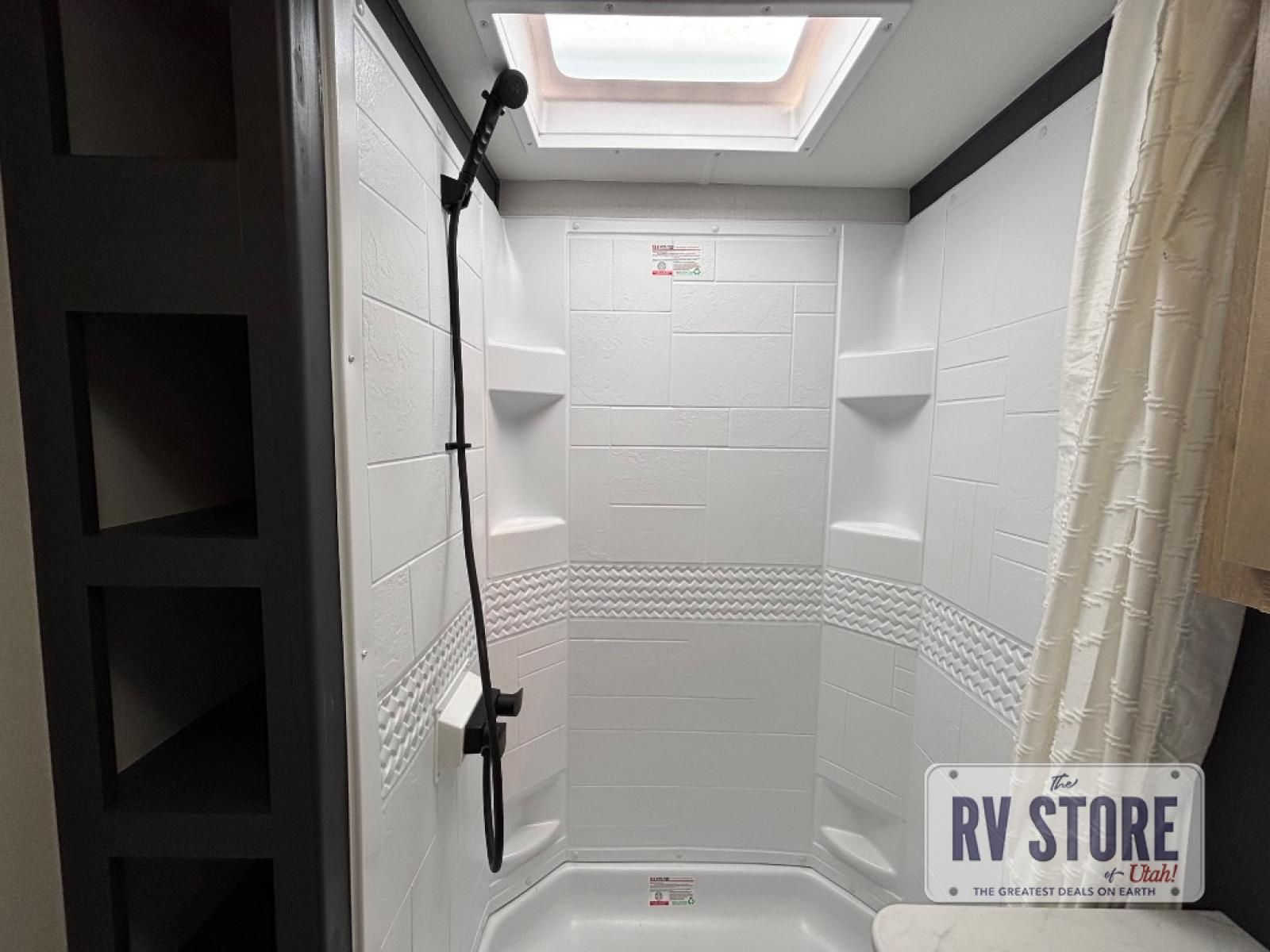 In the central living area, you’ll find theater seating, a large entertainment center, and modern finishes. The kitchen includes solid-surface countertops, a large refrigerator, three-burner cooktop, oven, microwave, and pantry — providing everything needed for meals on the road.