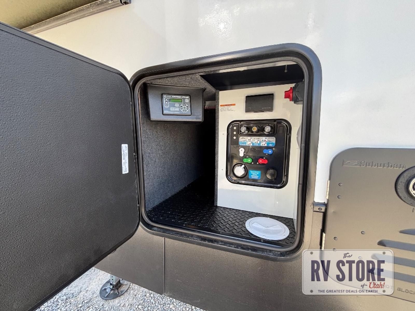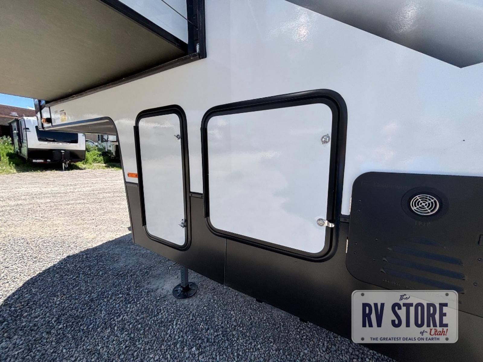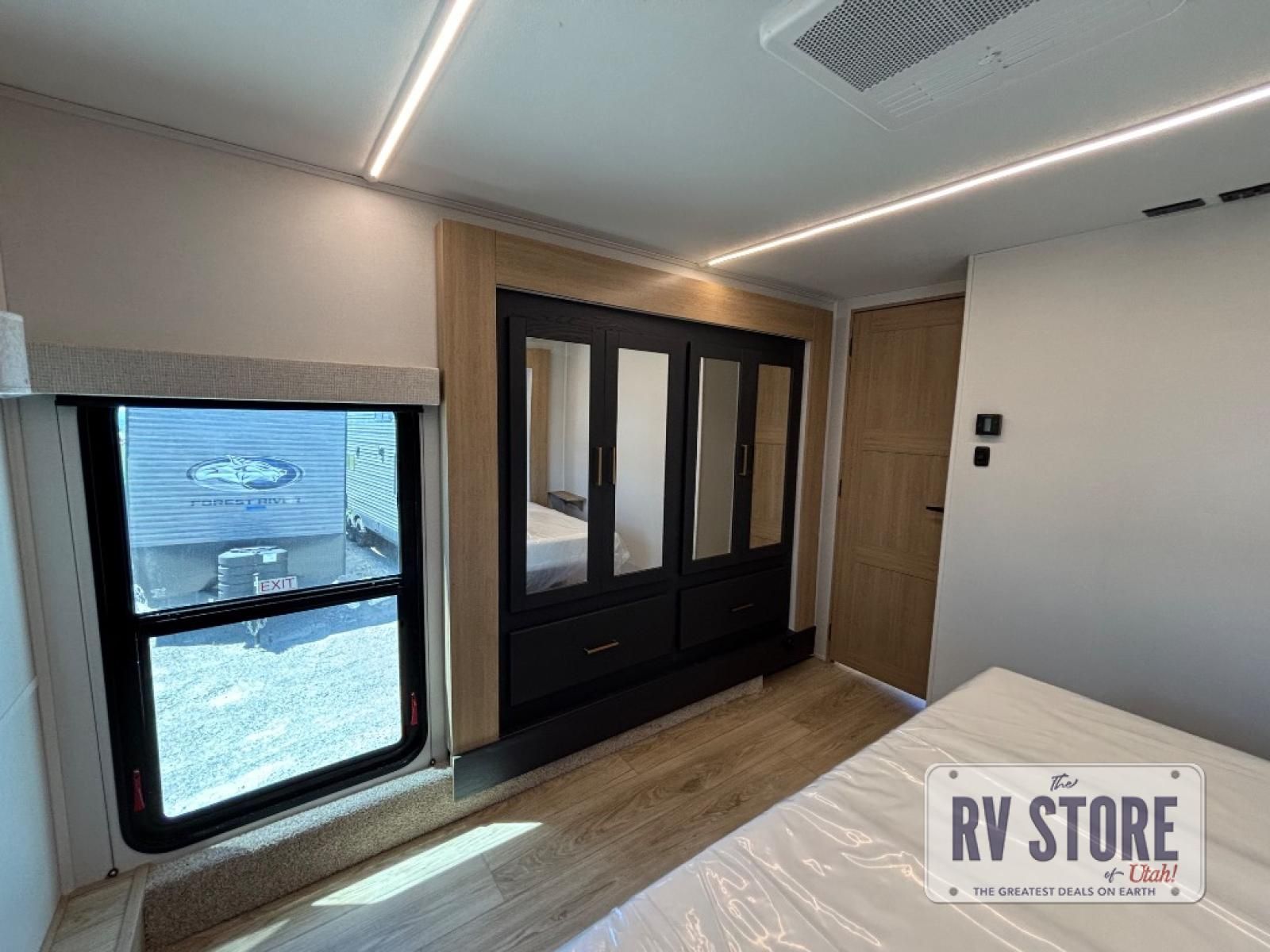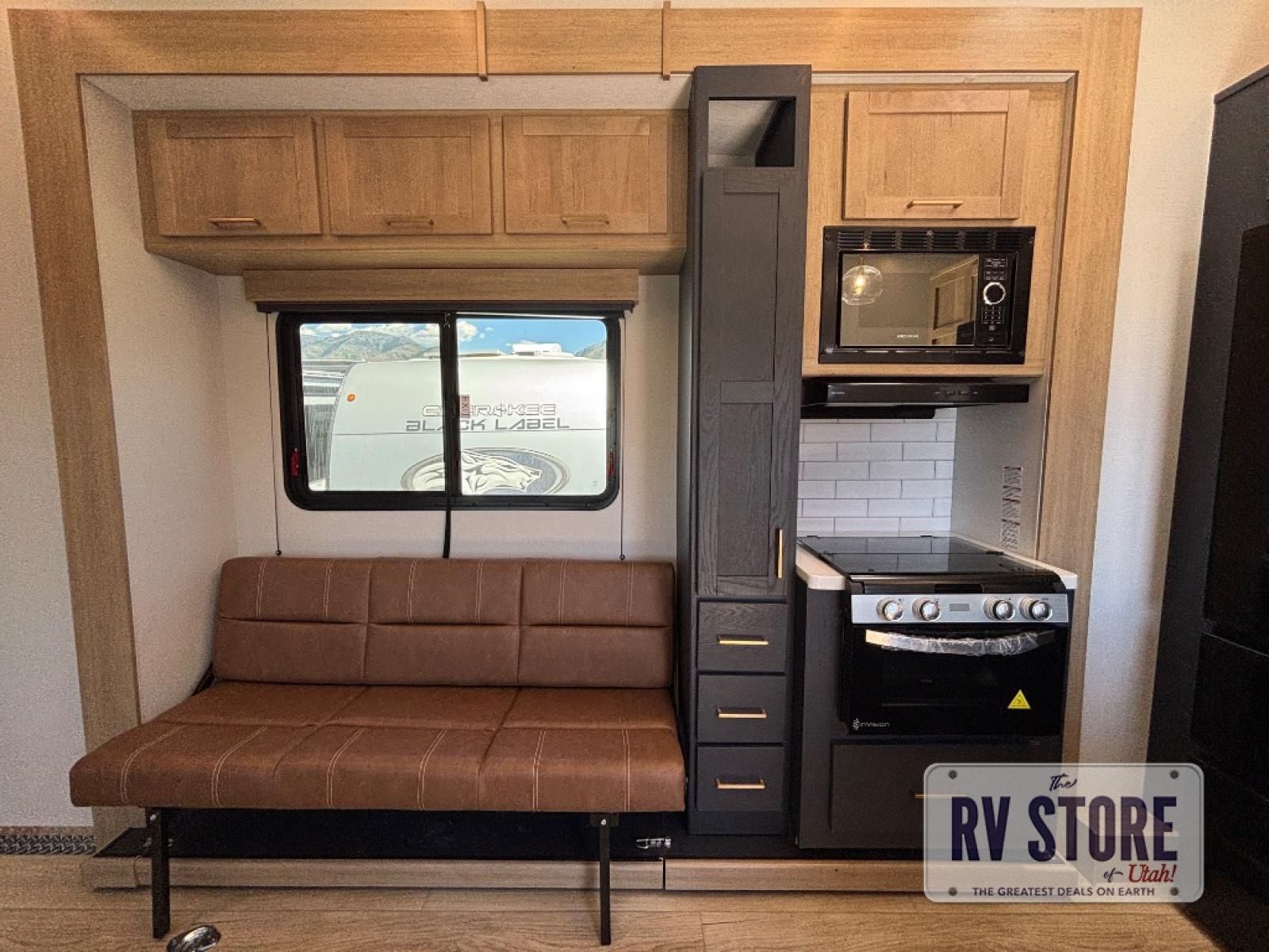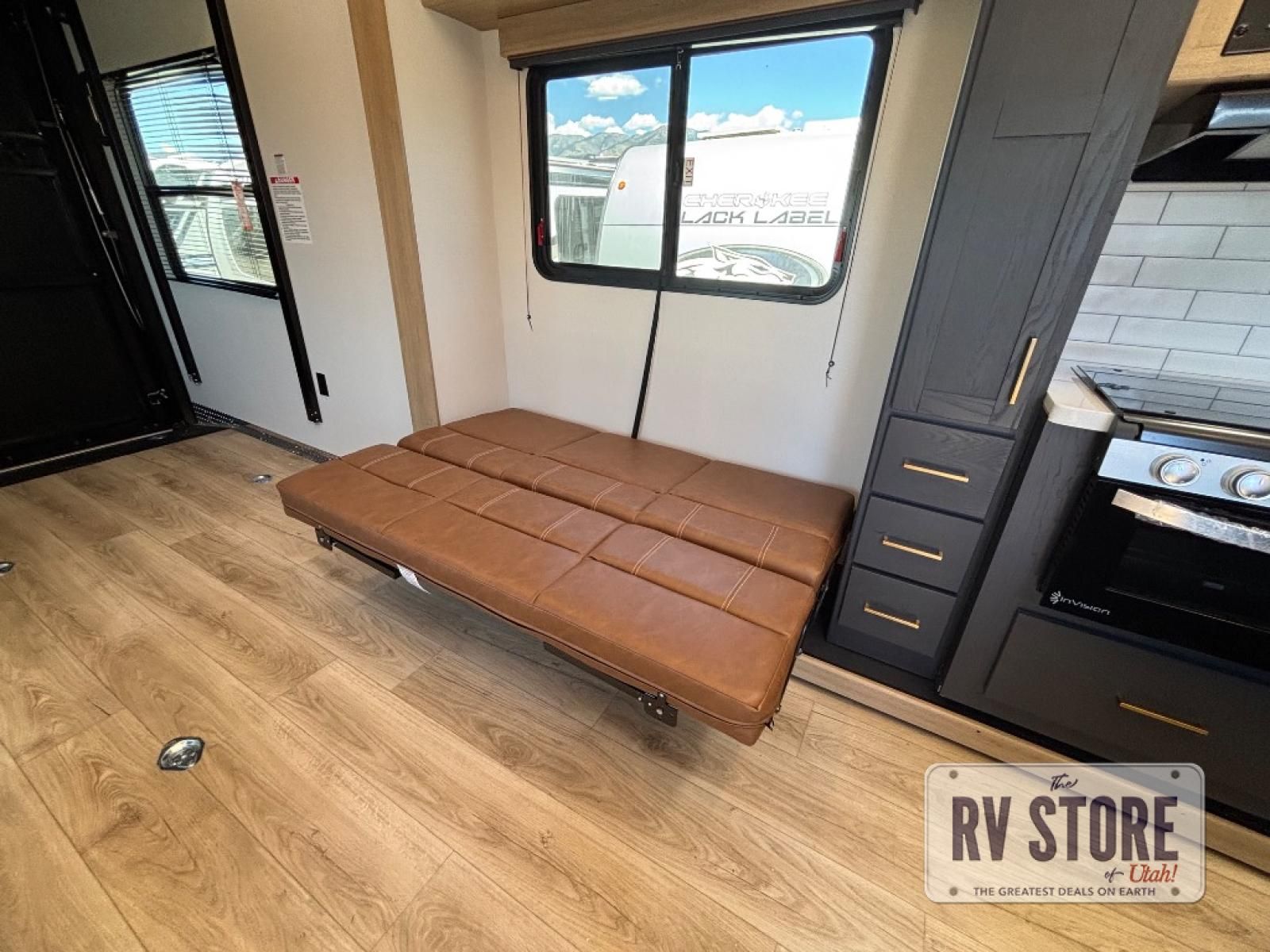 In the central living area, you’ll find theater seating, a large entertainment center, and modern finishes. The kitchen includes solid-surface countertops, a large refrigerator, three-burner cooktop, oven, microwave, and pantry — providing everything needed for meals on the road.