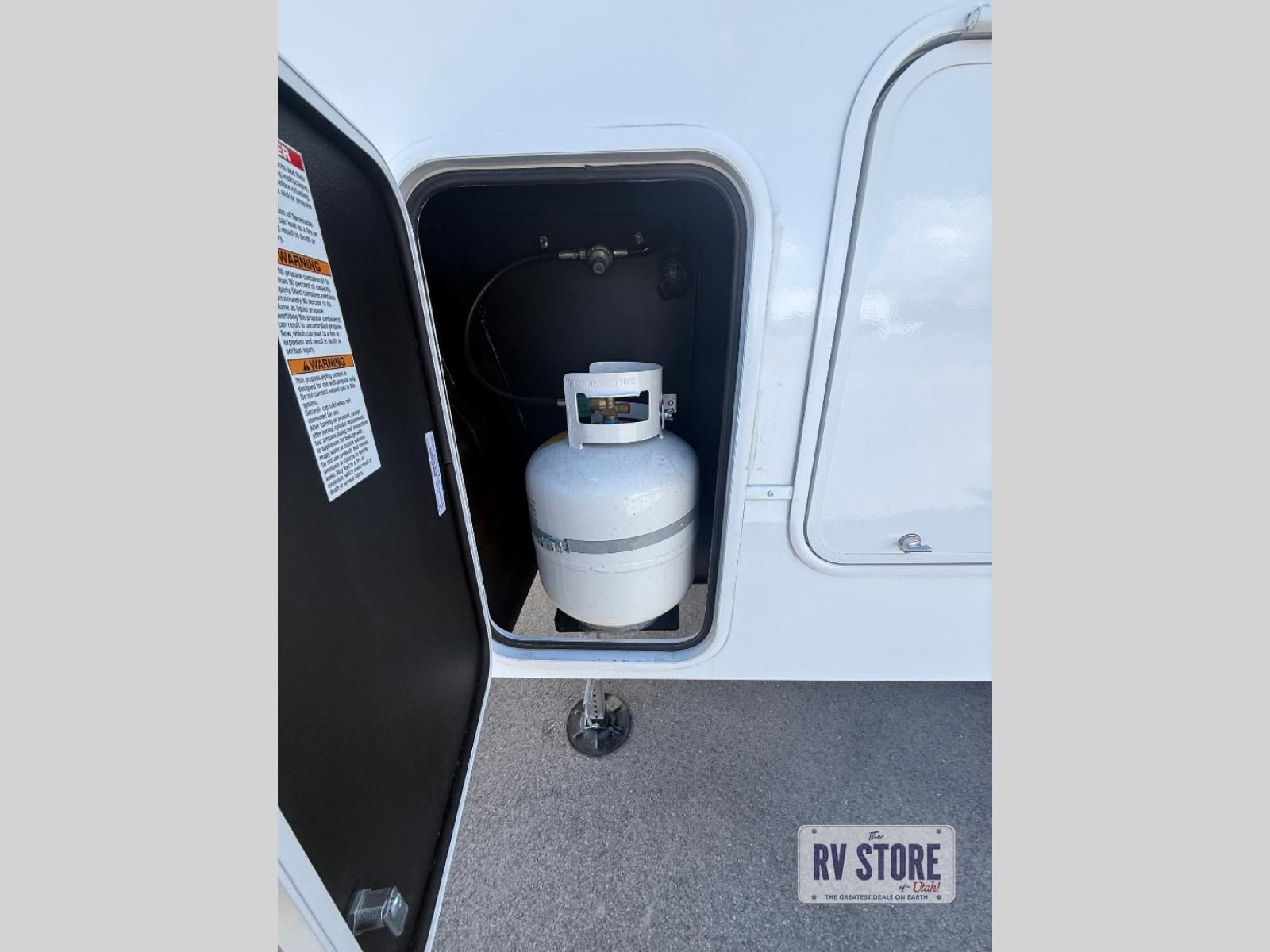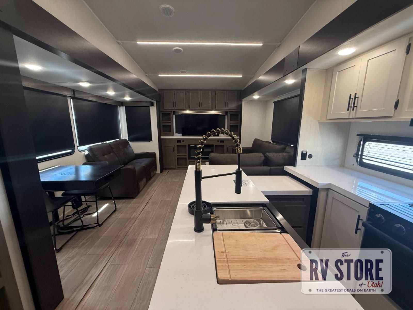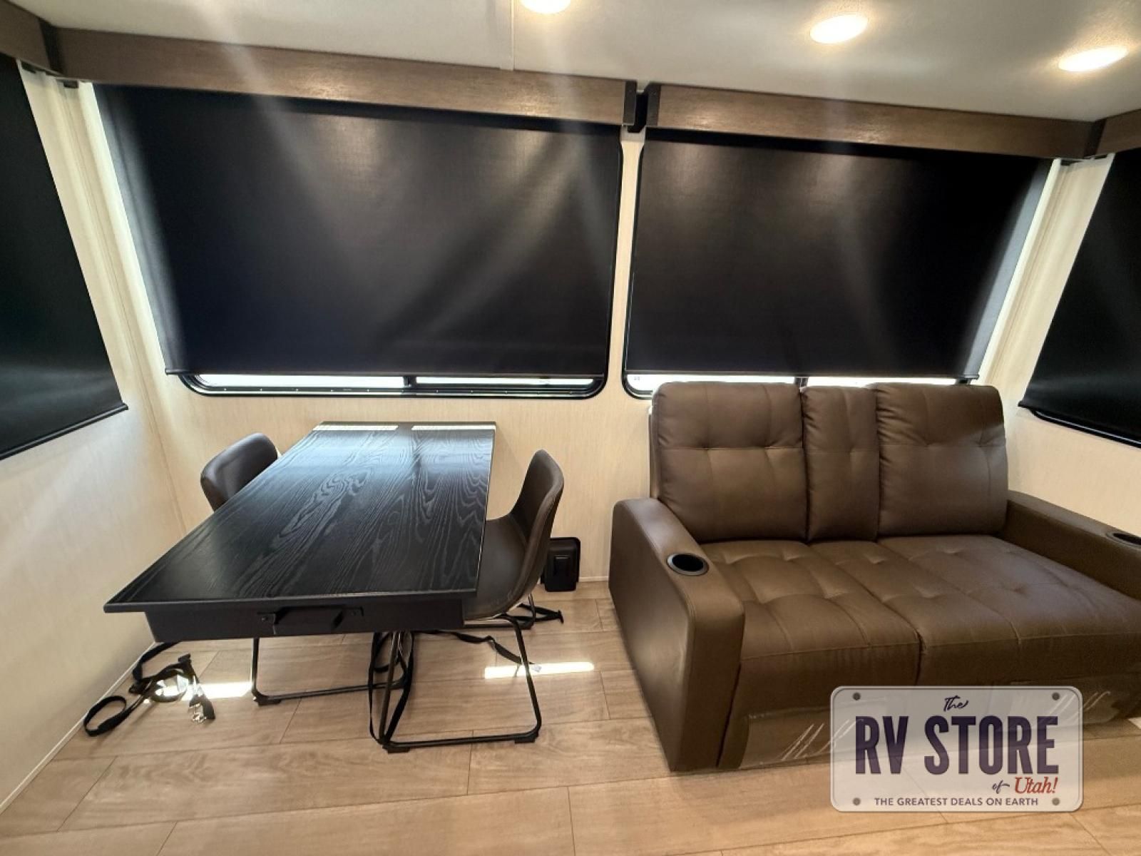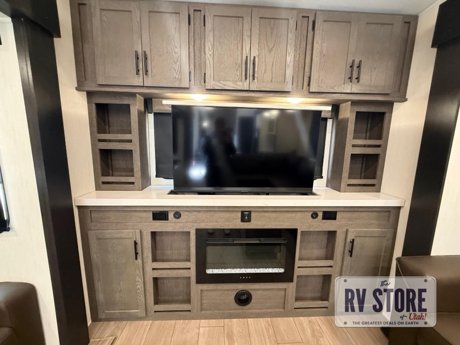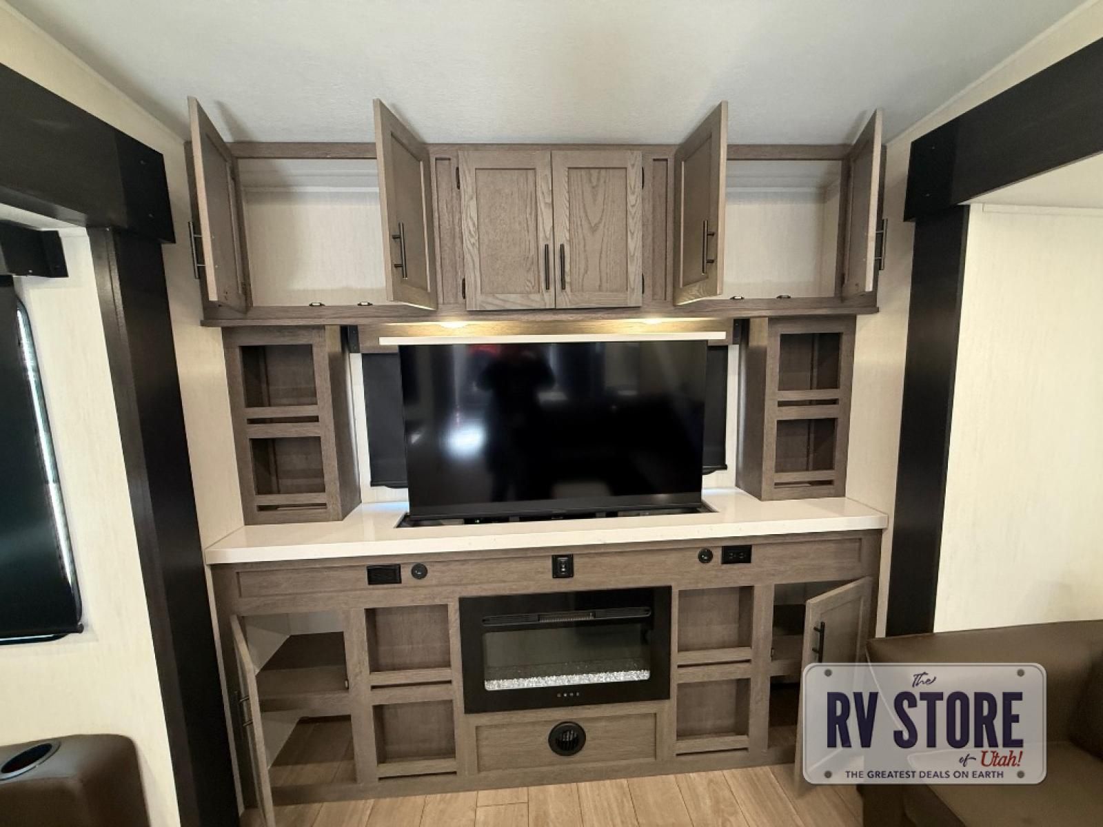 Enjoy time at the campground in this spacious fifth wheel! Once you arrive at the campground, you can unload the outside storage, put out the 15' awning, then head inside to make lunch on the three burner cooktop. Your crew can dine at the free-standing table and chairs, then relax on the dual tri-fold sofas. There is also theater seating, all in great view of the rear televator TV and fireplace. A full bath with a spacious shower will let you freshen up before bed, and the queen bed in the front bedroom is sure to bring a great night's rest!