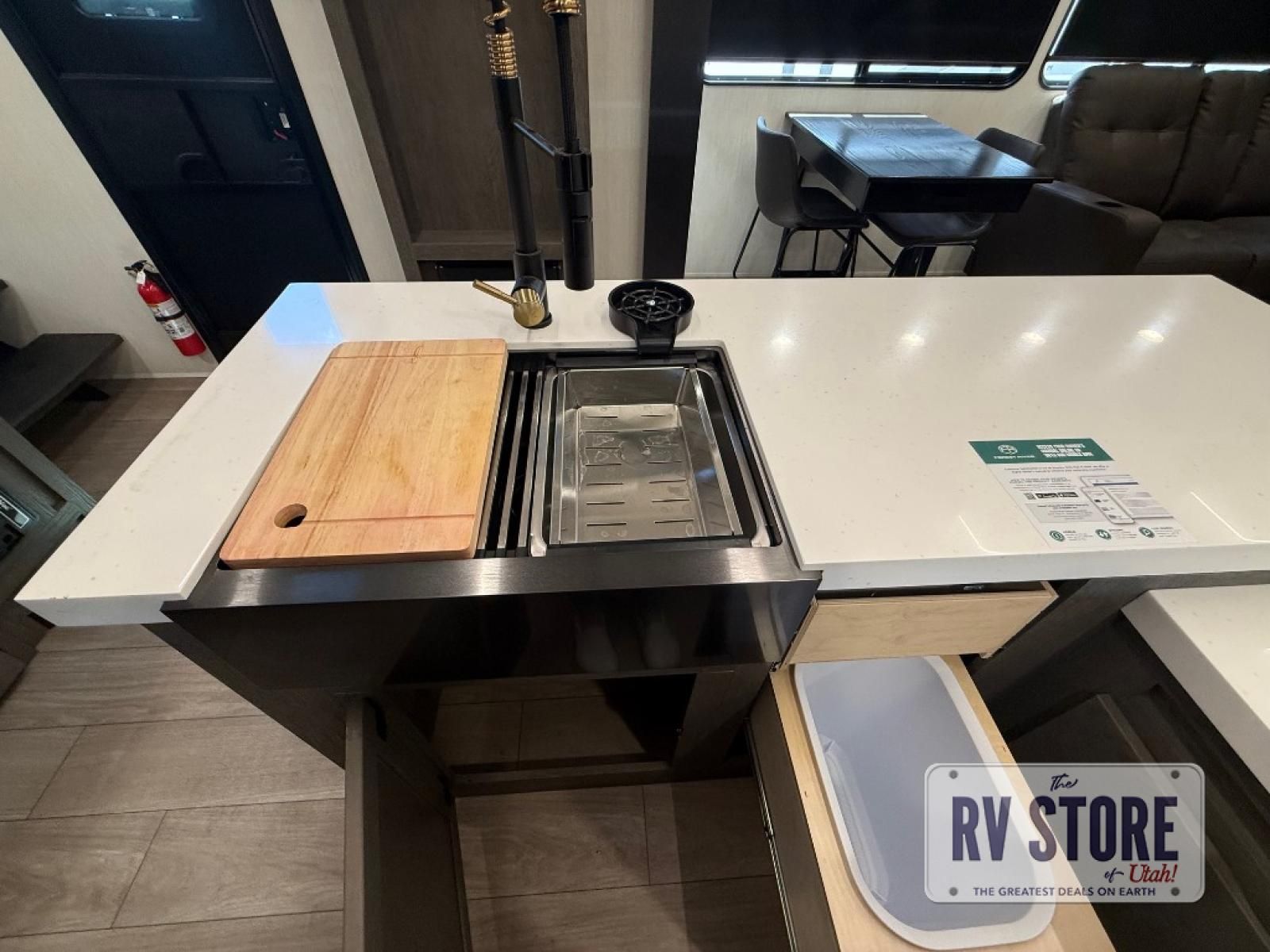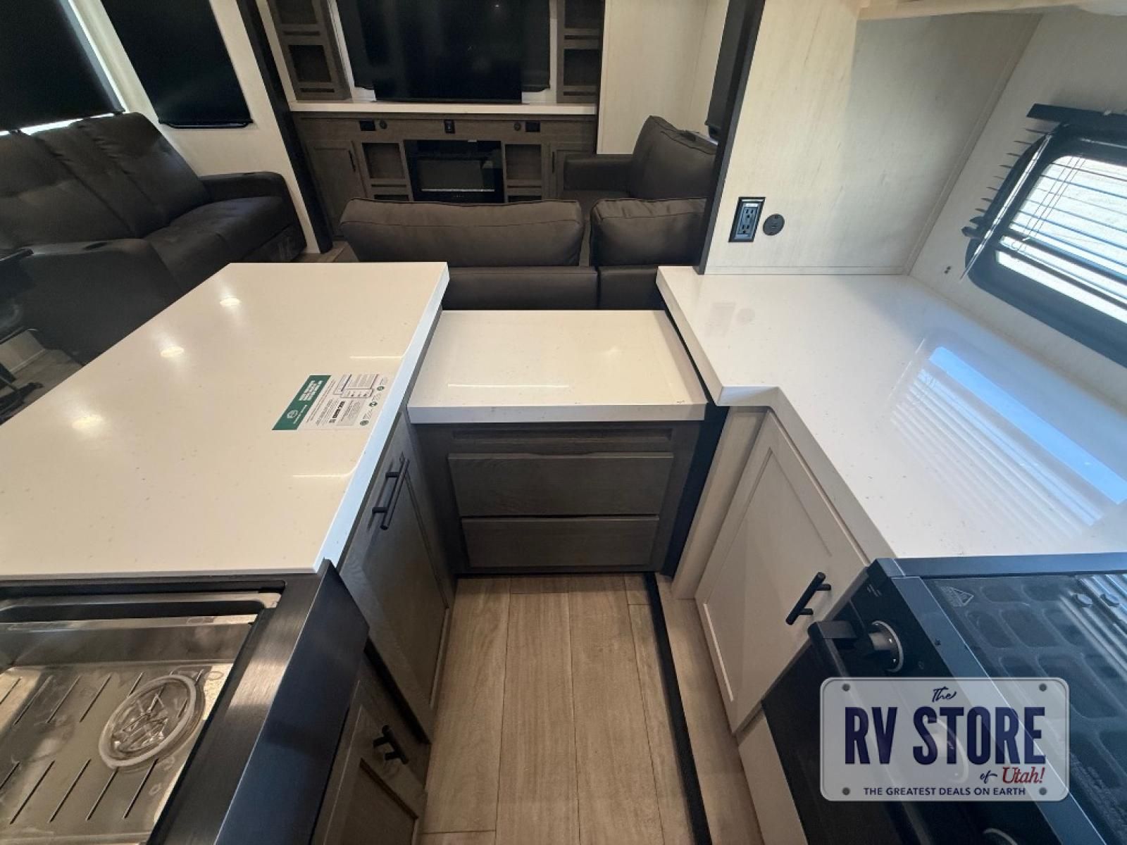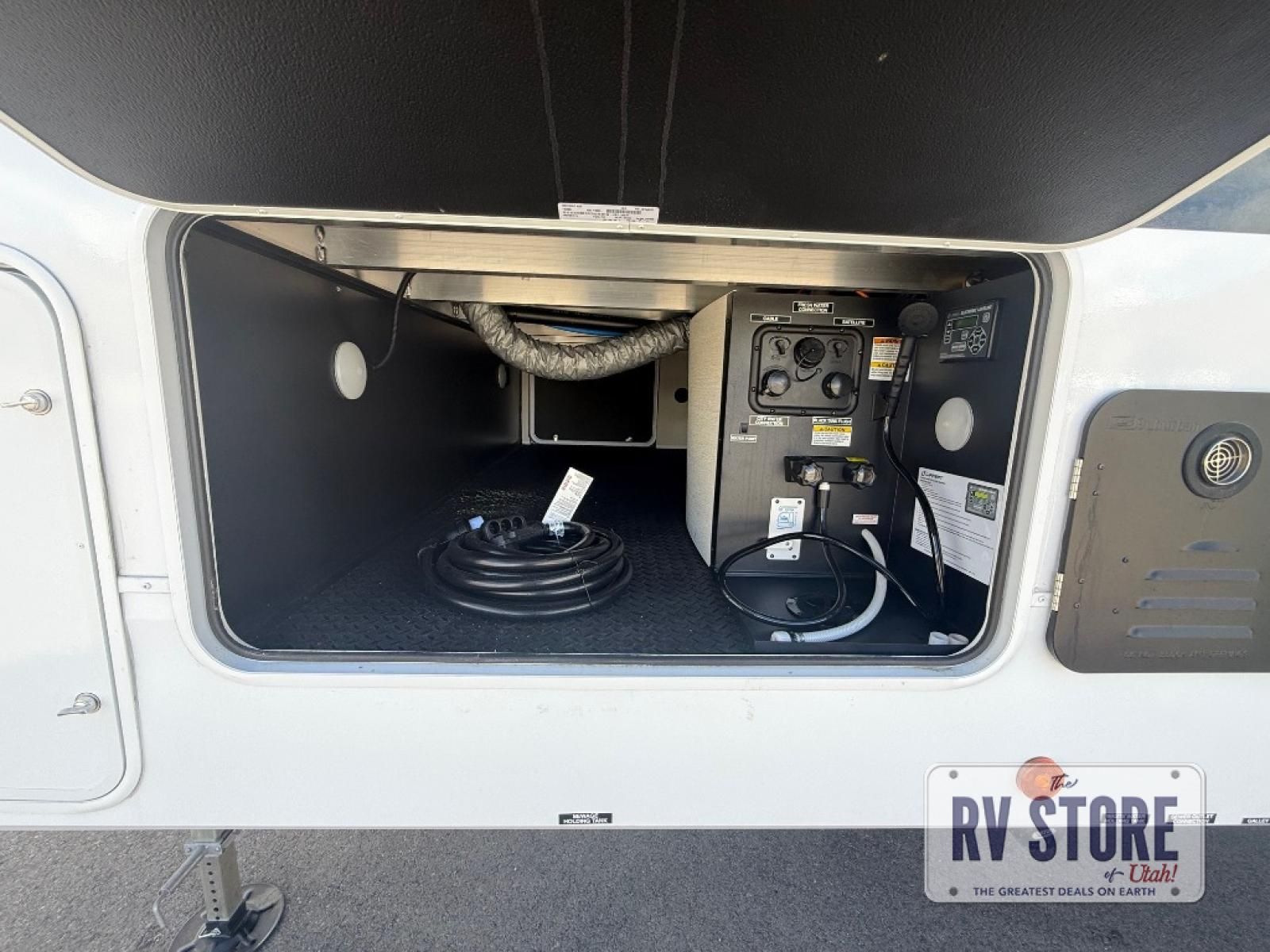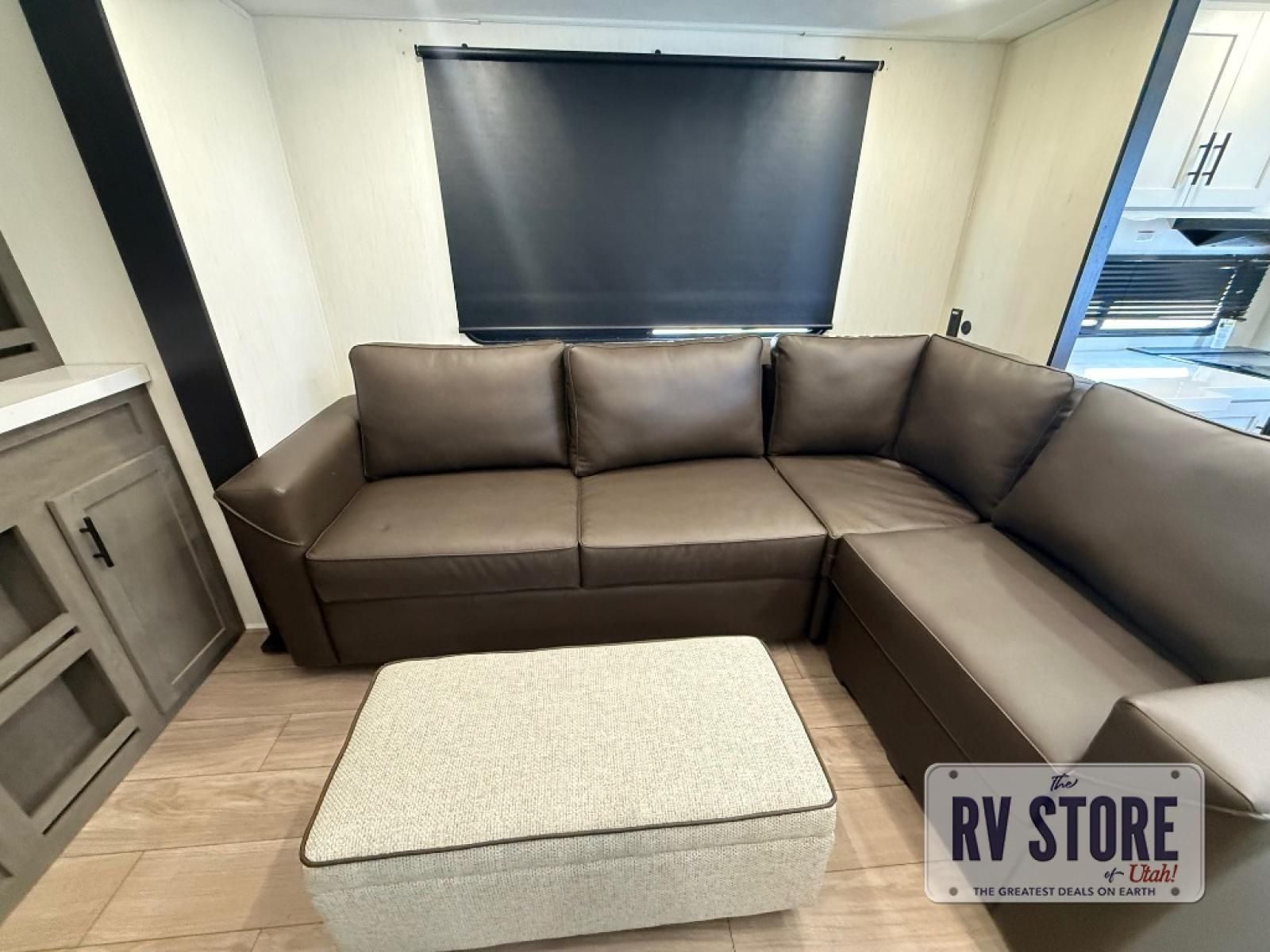 Enjoy time at the campground in this spacious fifth wheel! Once you arrive at the campground, you can unload the outside storage, put out the 15' awning, then head inside to make lunch on the three burner cooktop. Your crew can dine at the free-standing table and chairs, then relax on the dual tri-fold sofas. There is also theater seating, all in great view of the rear televator TV and fireplace. A full bath with a spacious shower will let you freshen up before bed, and the queen bed in the front bedroom is sure to bring a great night's rest!