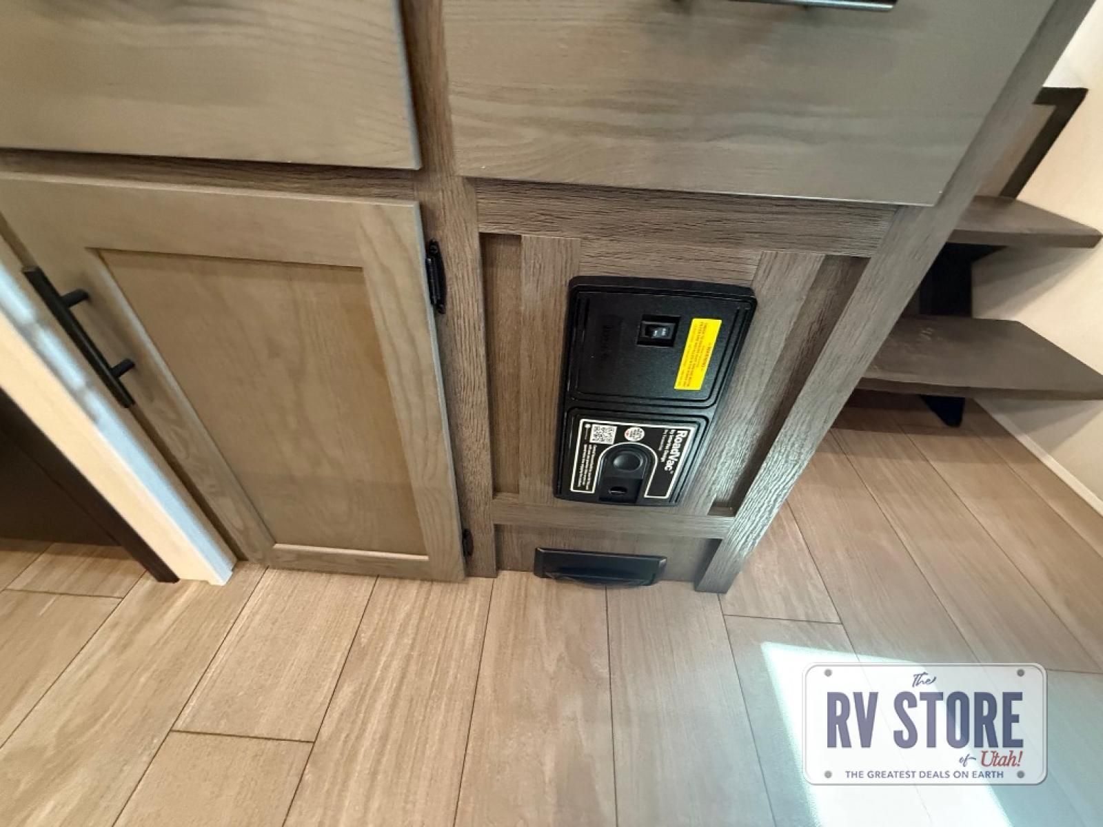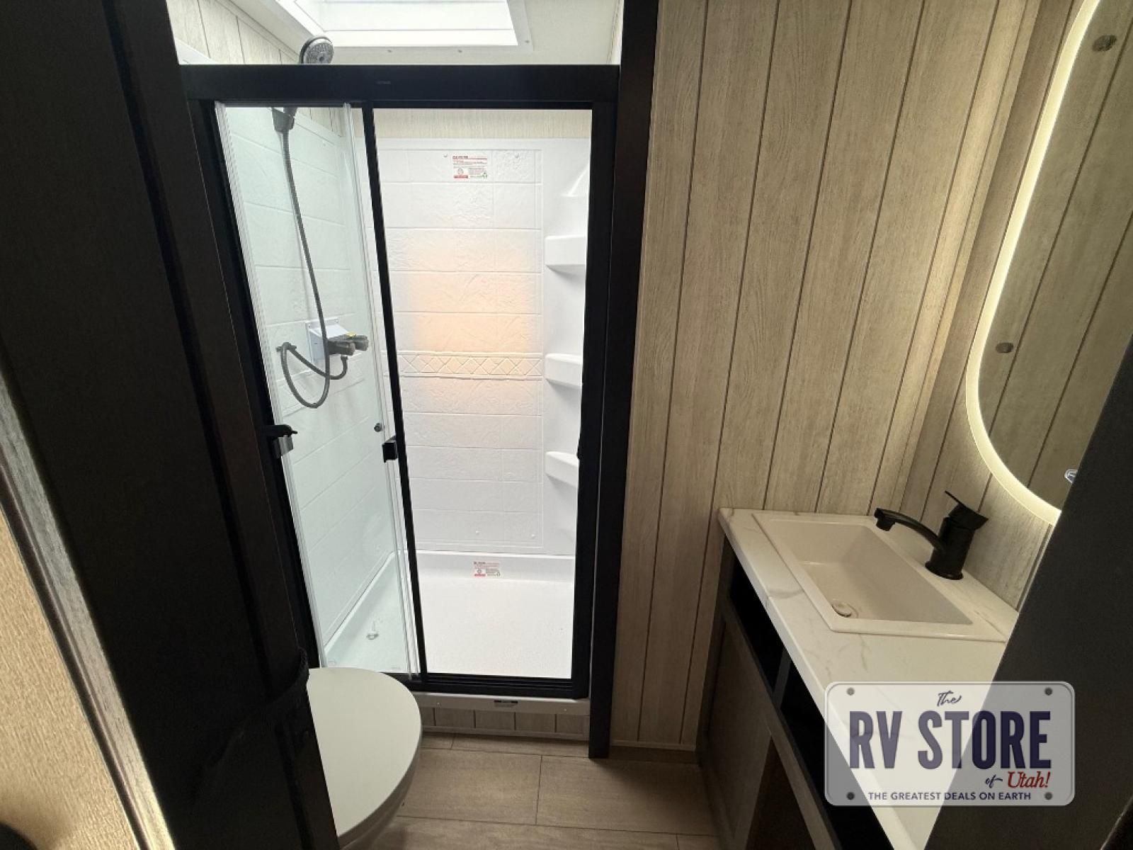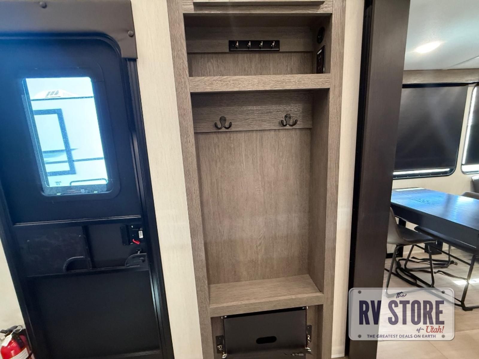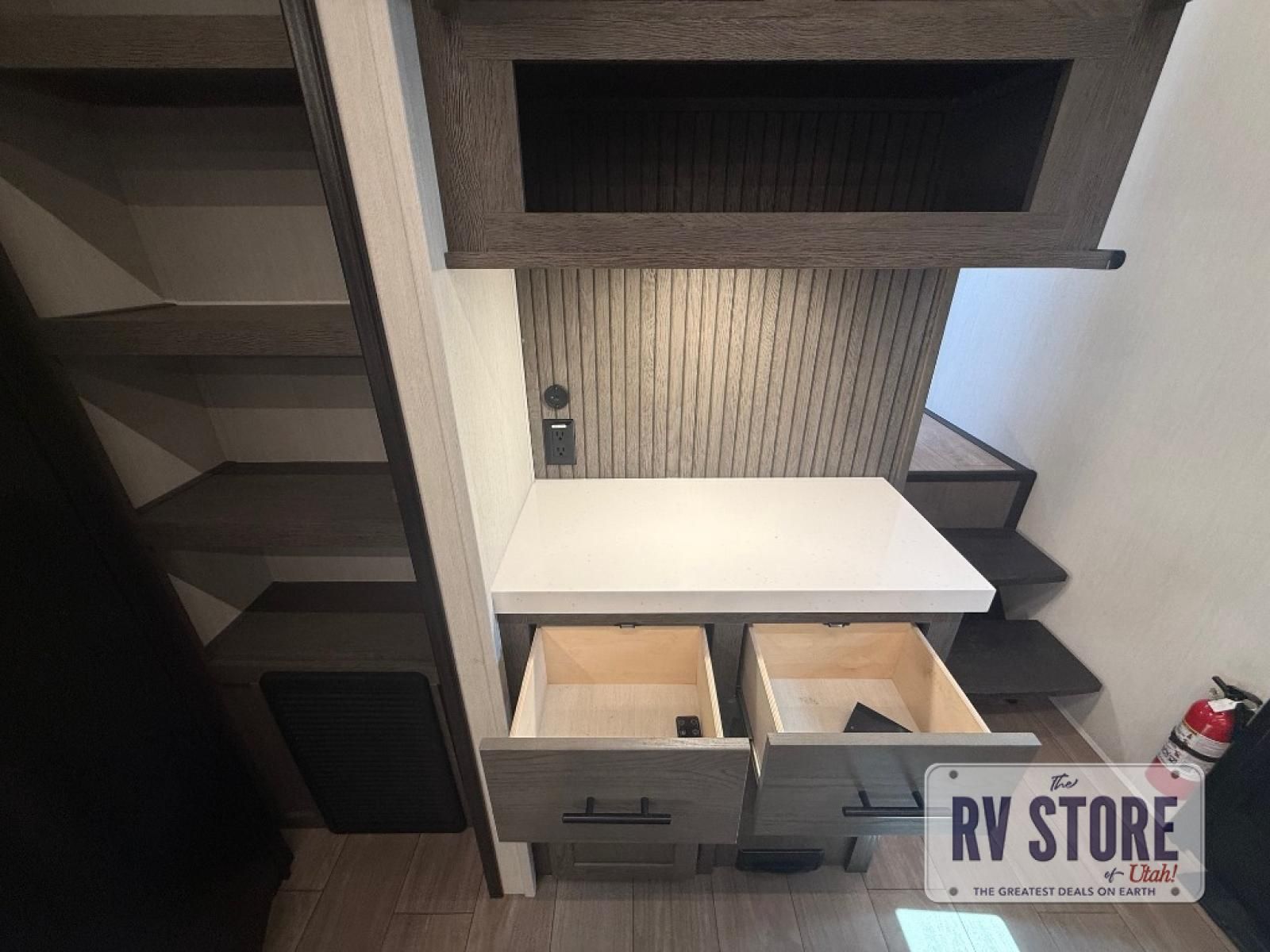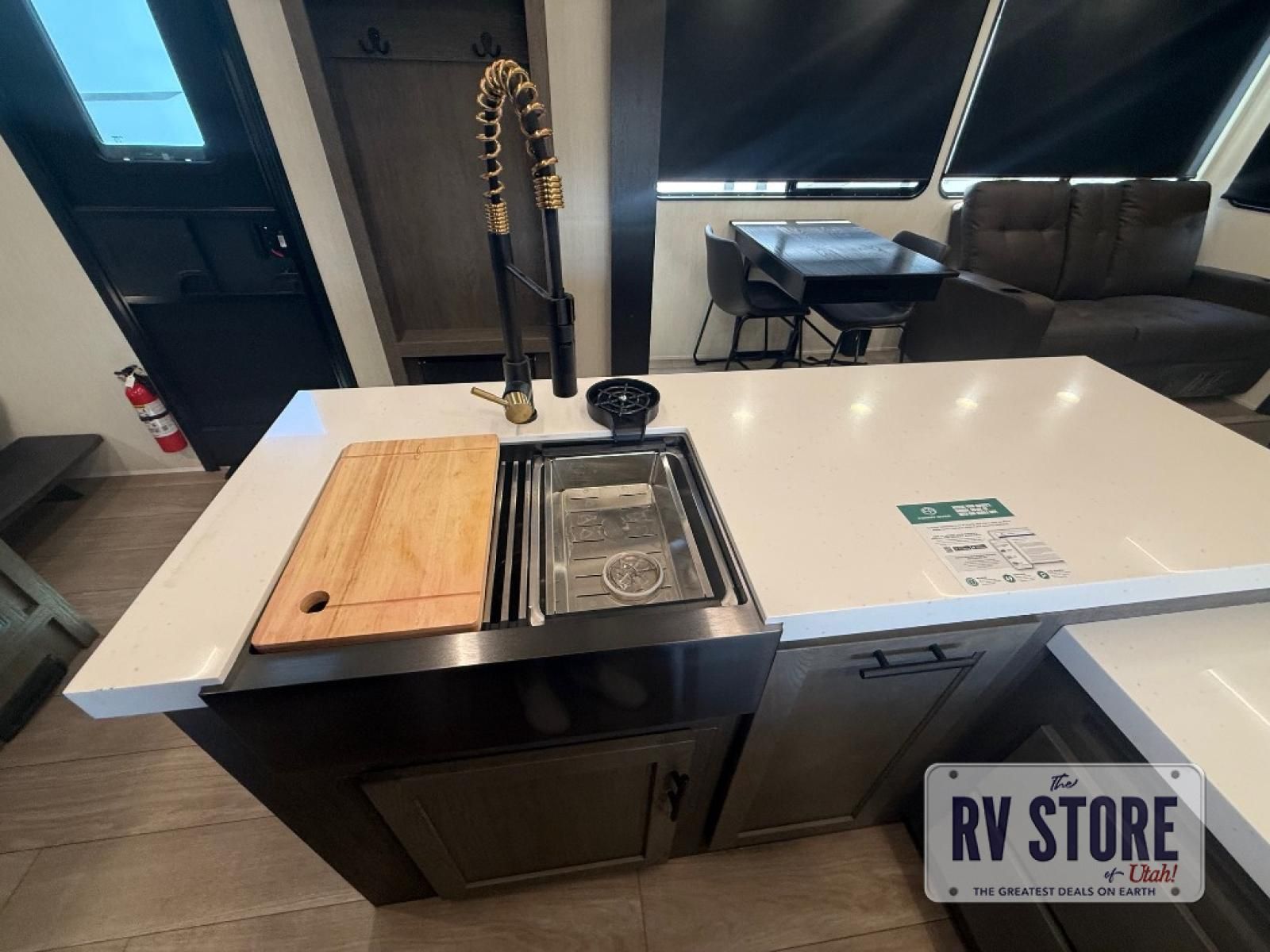 Enjoy time at the campground in this spacious fifth wheel! Once you arrive at the campground, you can unload the outside storage, put out the 15' awning, then head inside to make lunch on the three burner cooktop. Your crew can dine at the free-standing table and chairs, then relax on the dual tri-fold sofas. There is also theater seating, all in great view of the rear televator TV and fireplace. A full bath with a spacious shower will let you freshen up before bed, and the queen bed in the front bedroom is sure to bring a great night's rest!