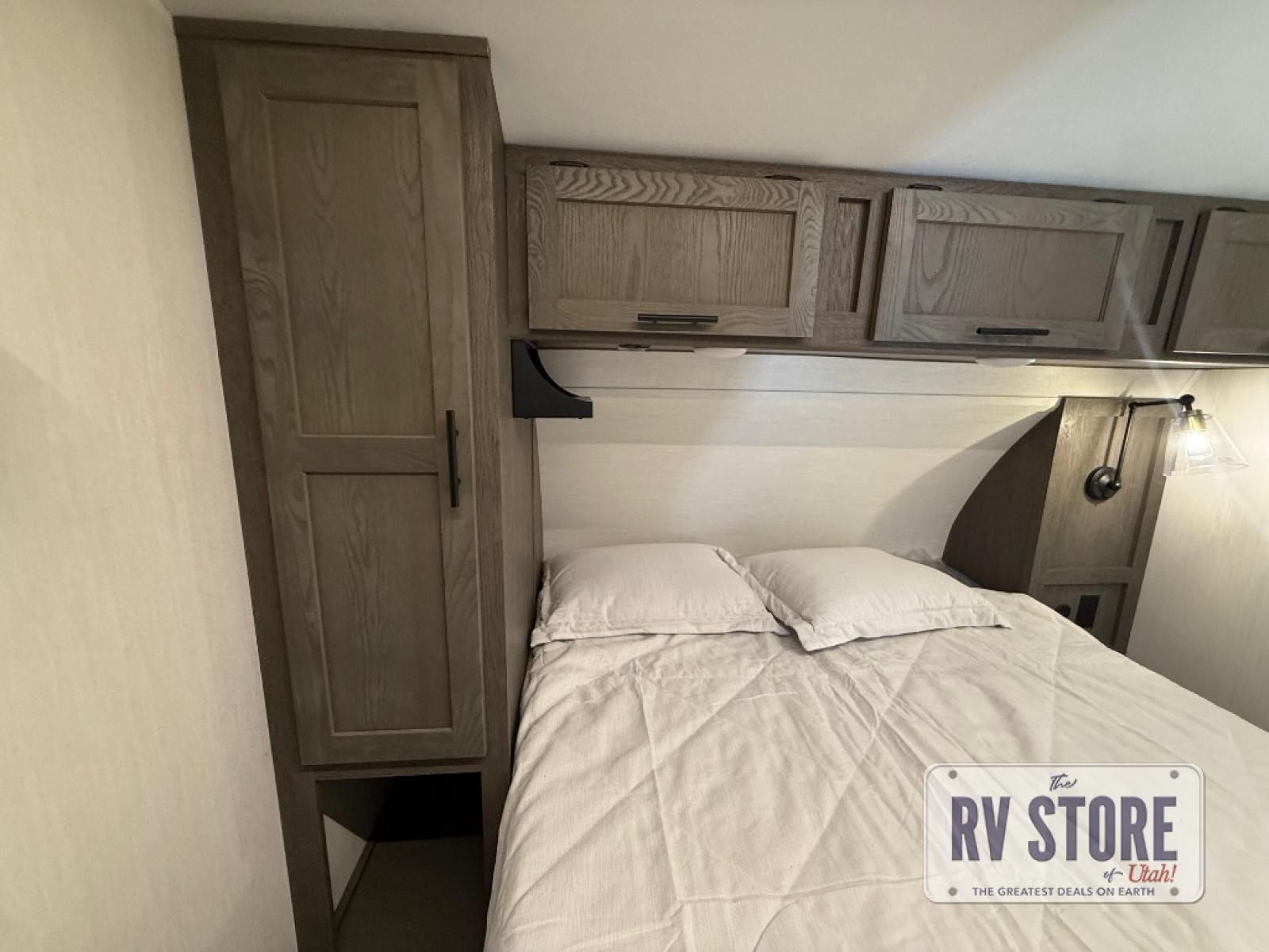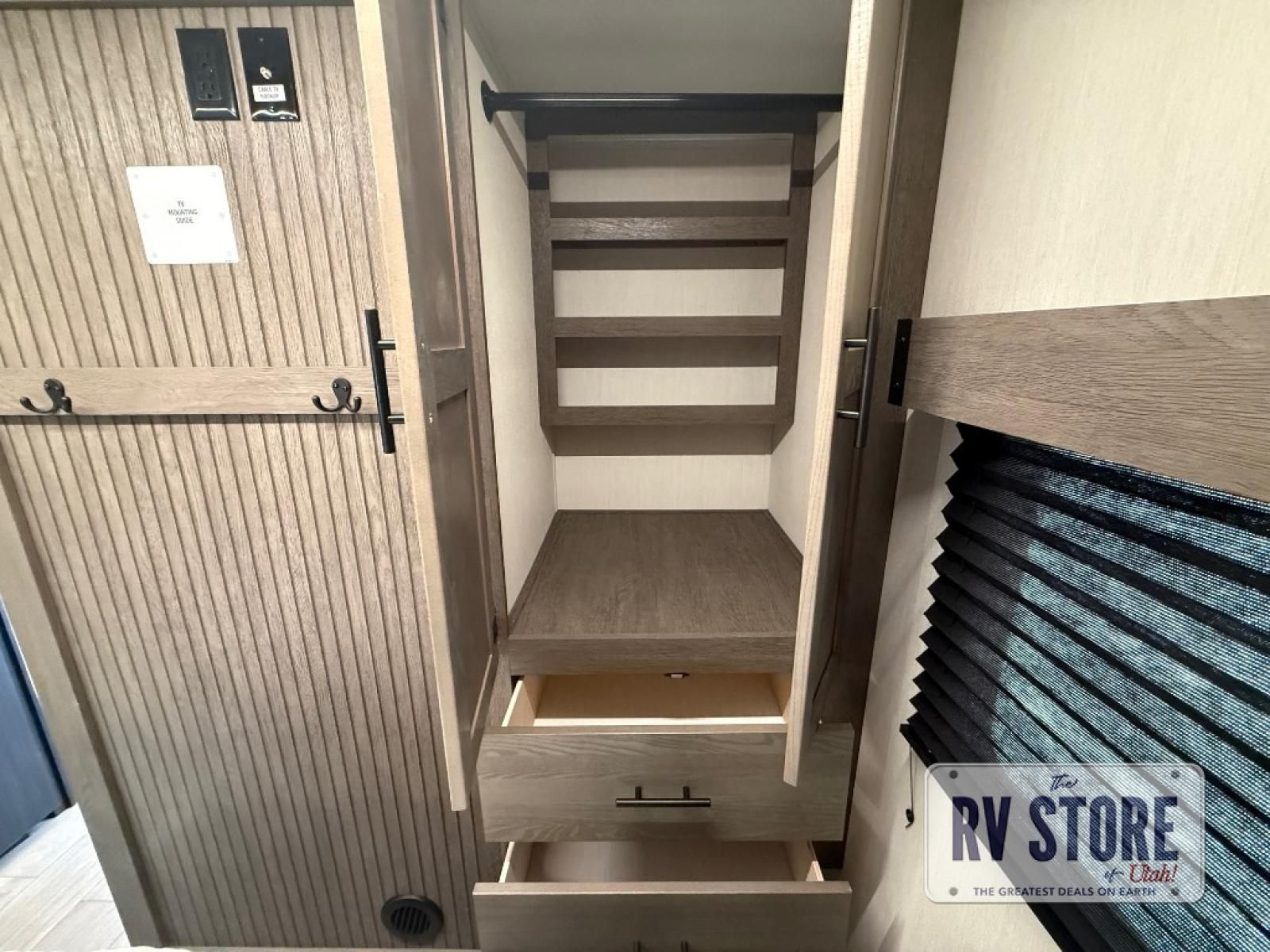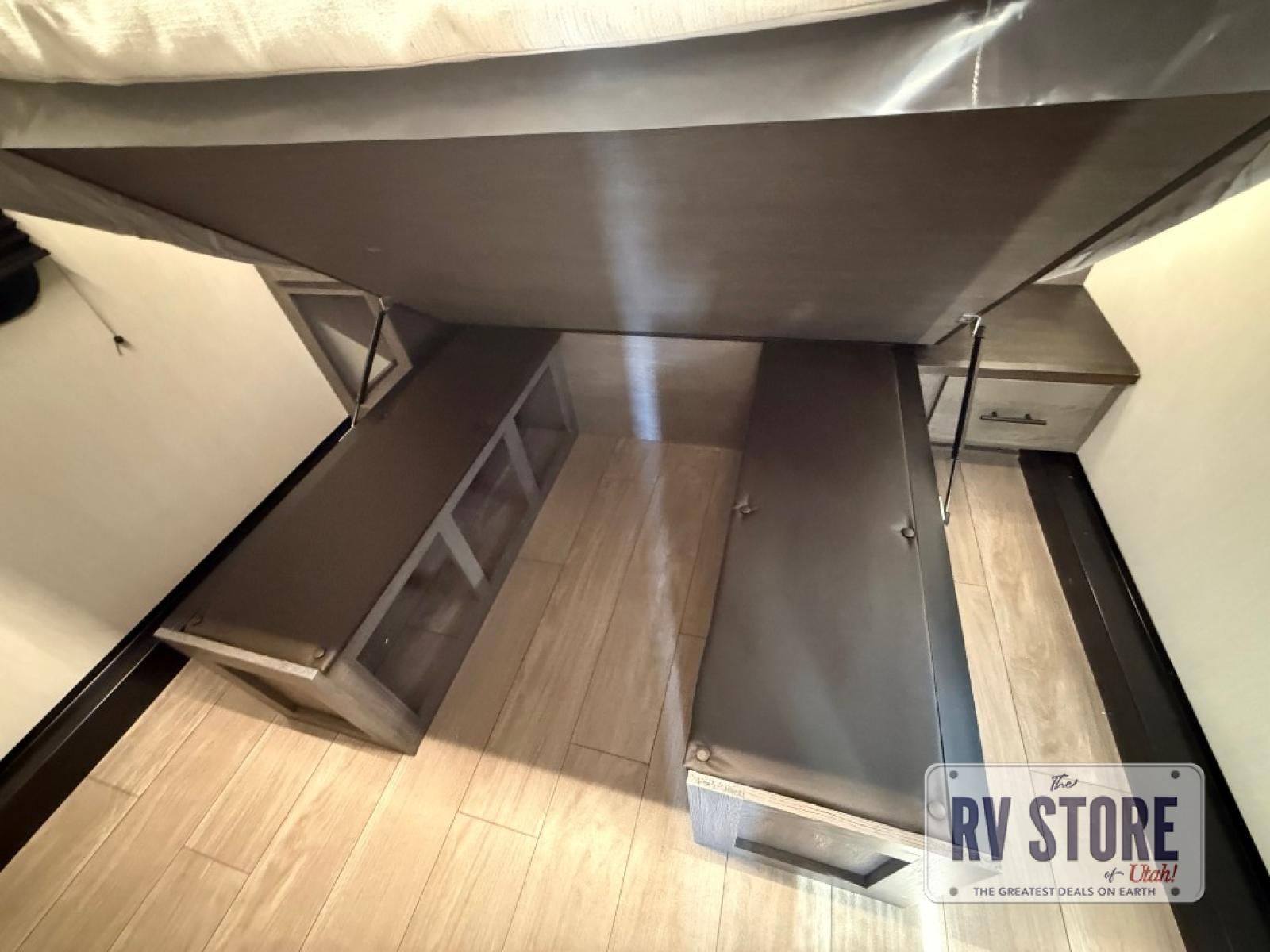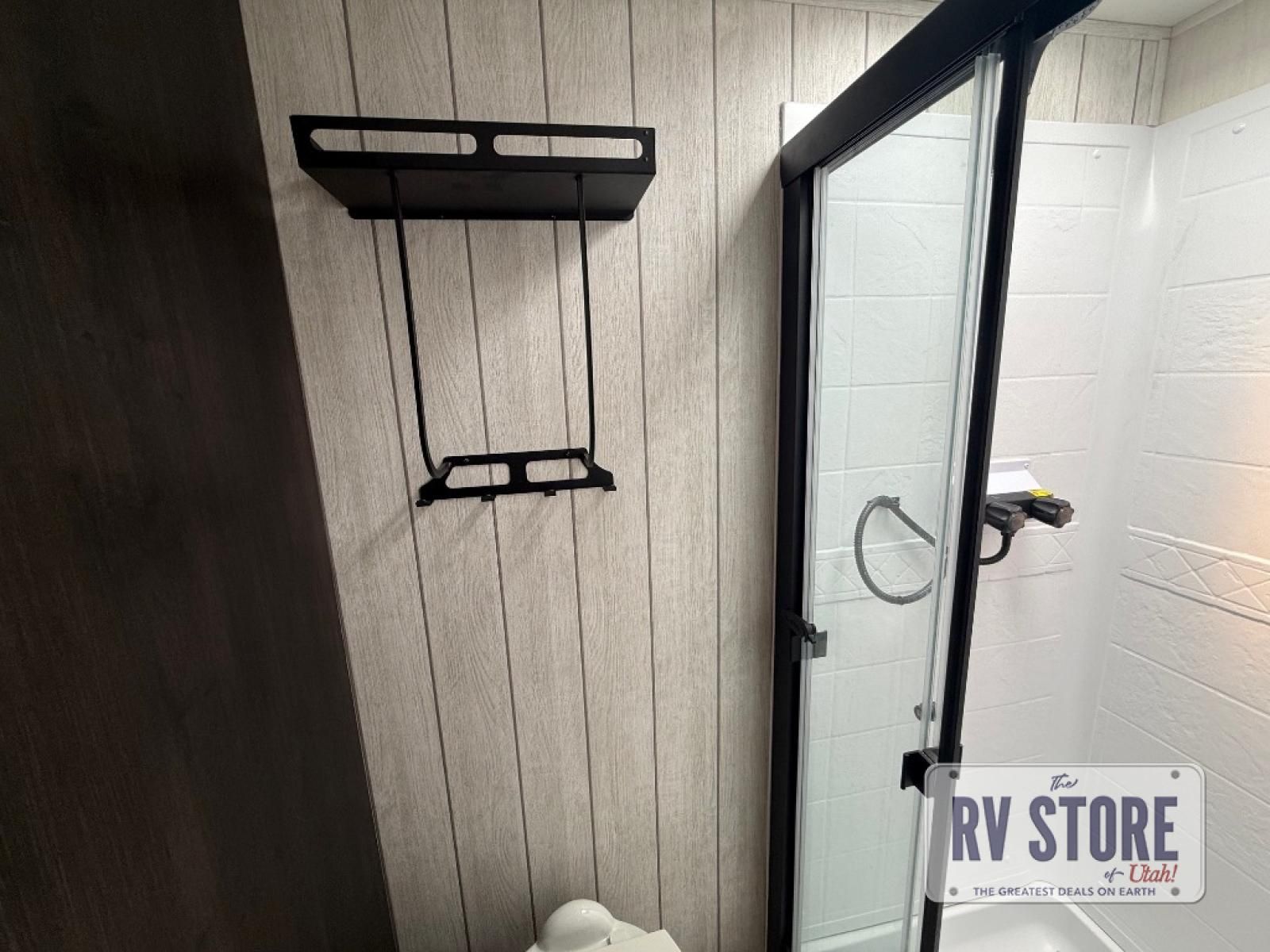 Enjoy time at the campground in this spacious fifth wheel! Once you arrive at the campground, you can unload the outside storage, put out the 15' awning, then head inside to make lunch on the three burner cooktop. Your crew can dine at the free-standing table and chairs, then relax on the dual tri-fold sofas. There is also theater seating, all in great view of the rear televator TV and fireplace. A full bath with a spacious shower will let you freshen up before bed, and the queen bed in the front bedroom is sure to bring a great night's rest!