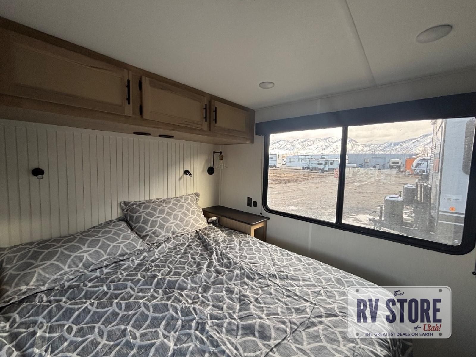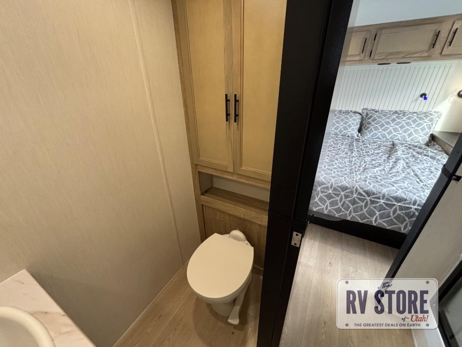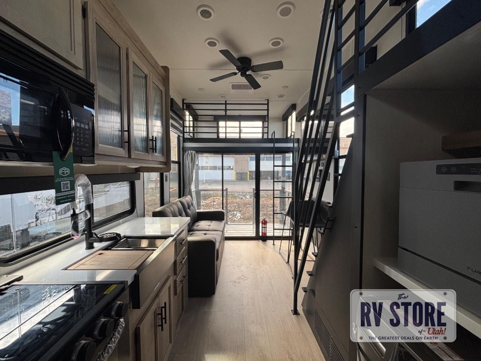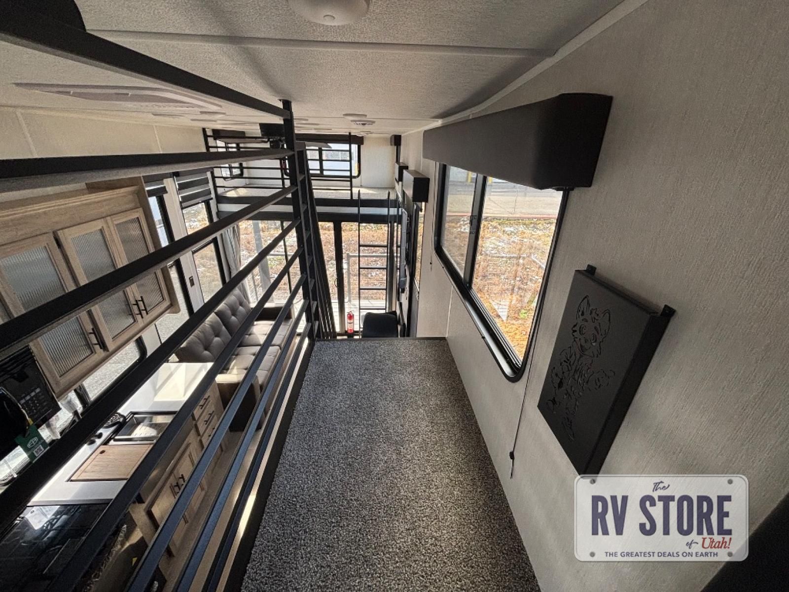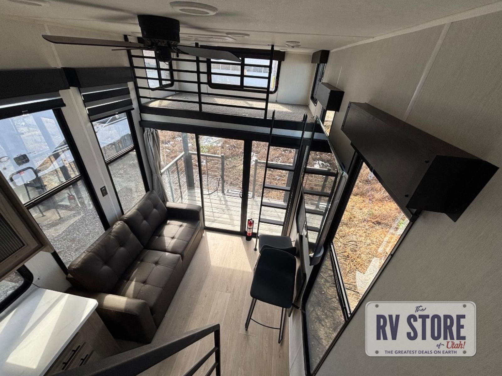 This model is similar to 16ML but larger! A bigger bathroom, RVÂ king bed in the lower master, and a queen bed plus a twin bunk mat in the front loft. And the second loft can be utilized as extra sleeping space or storage space! There is an 18 cu. ft. refrigerator so you can stock up for a week long vacation, a hide-a-bed sofa that can transform into added sleeping for guests, and a high top table with two stools to dine at. The bathroom below is split with a shower on one side, and a private toilet area and sink opposite. And the view is amazing from just about anywhere inside.