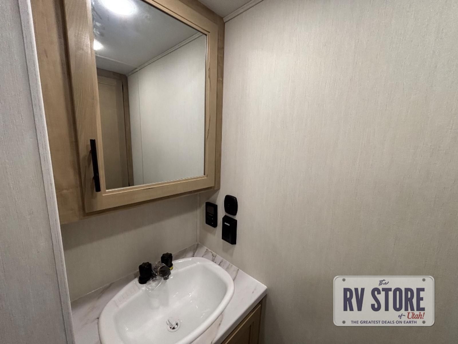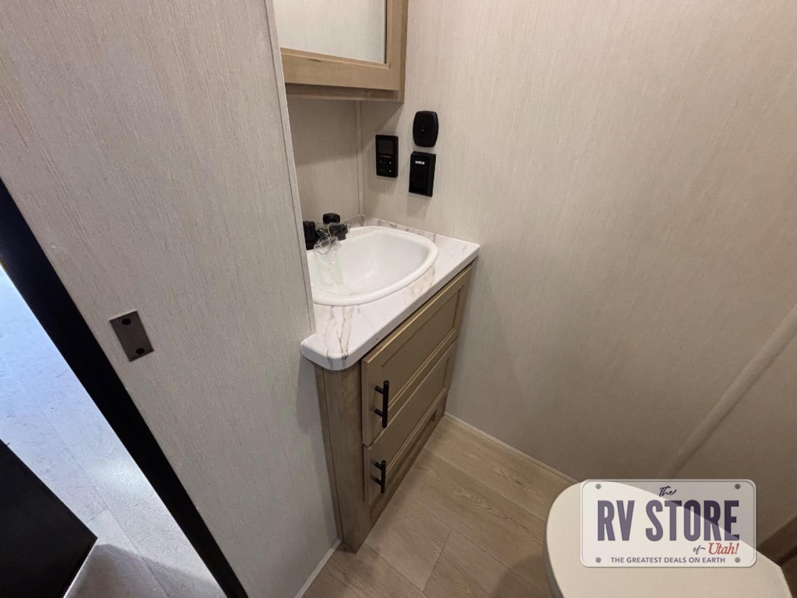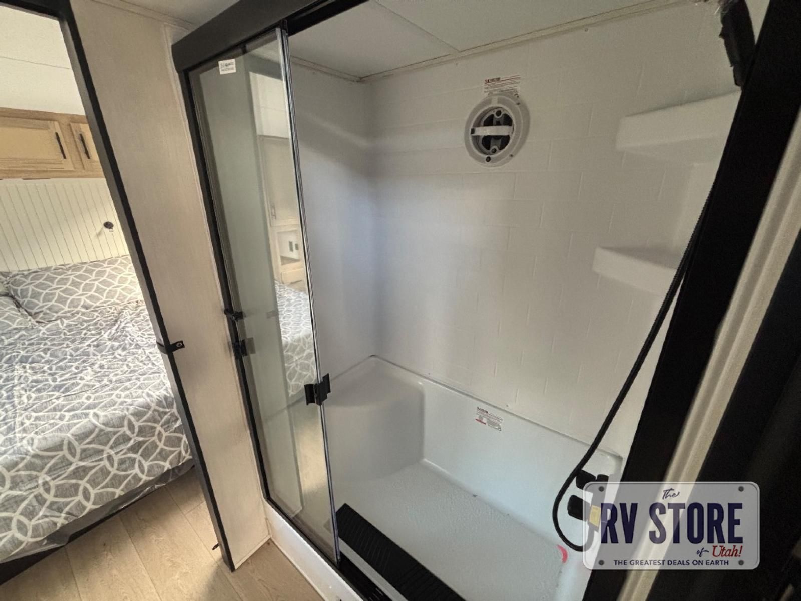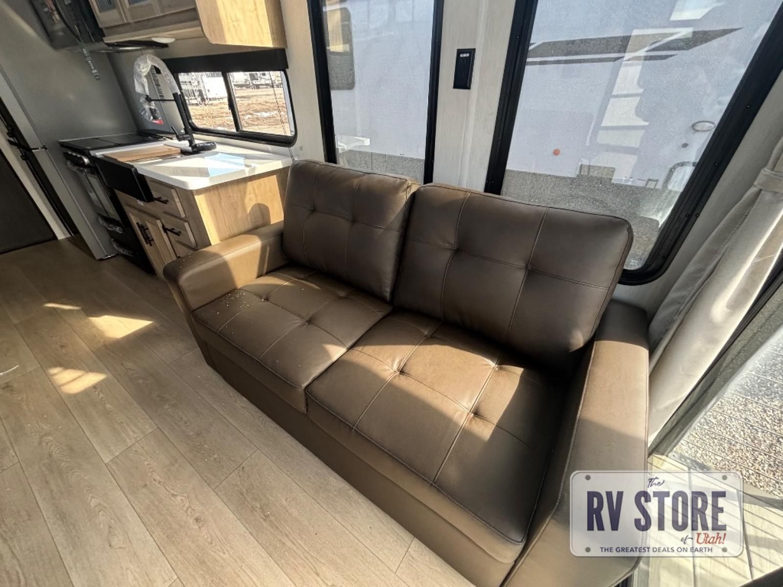 This model is similar to 16ML but larger! A bigger bathroom, RVÂ king bed in the lower master, and a queen bed plus a twin bunk mat in the front loft. And the second loft can be utilized as extra sleeping space or storage space! There is an 18 cu. ft. refrigerator so you can stock up for a week long vacation, a hide-a-bed sofa that can transform into added sleeping for guests, and a high top table with two stools to dine at. The bathroom below is split with a shower on one side, and a private toilet area and sink opposite. And the view is amazing from just about anywhere inside.