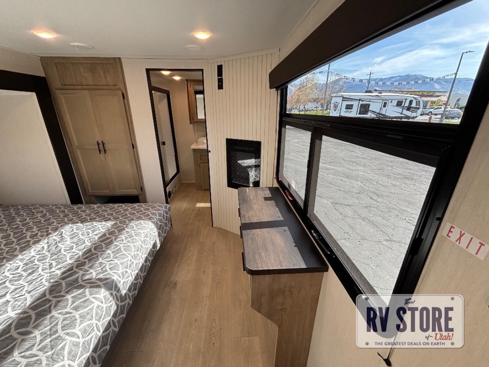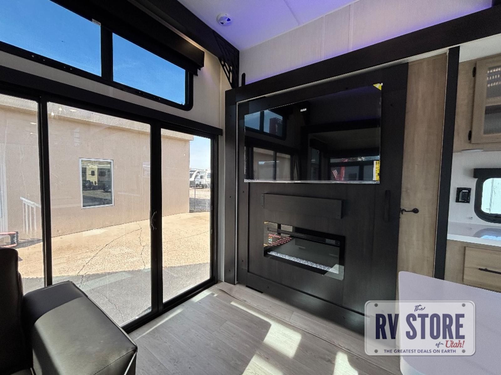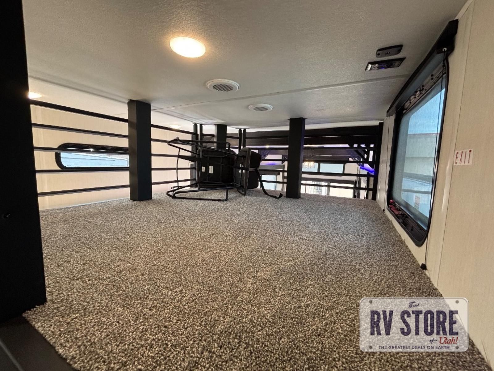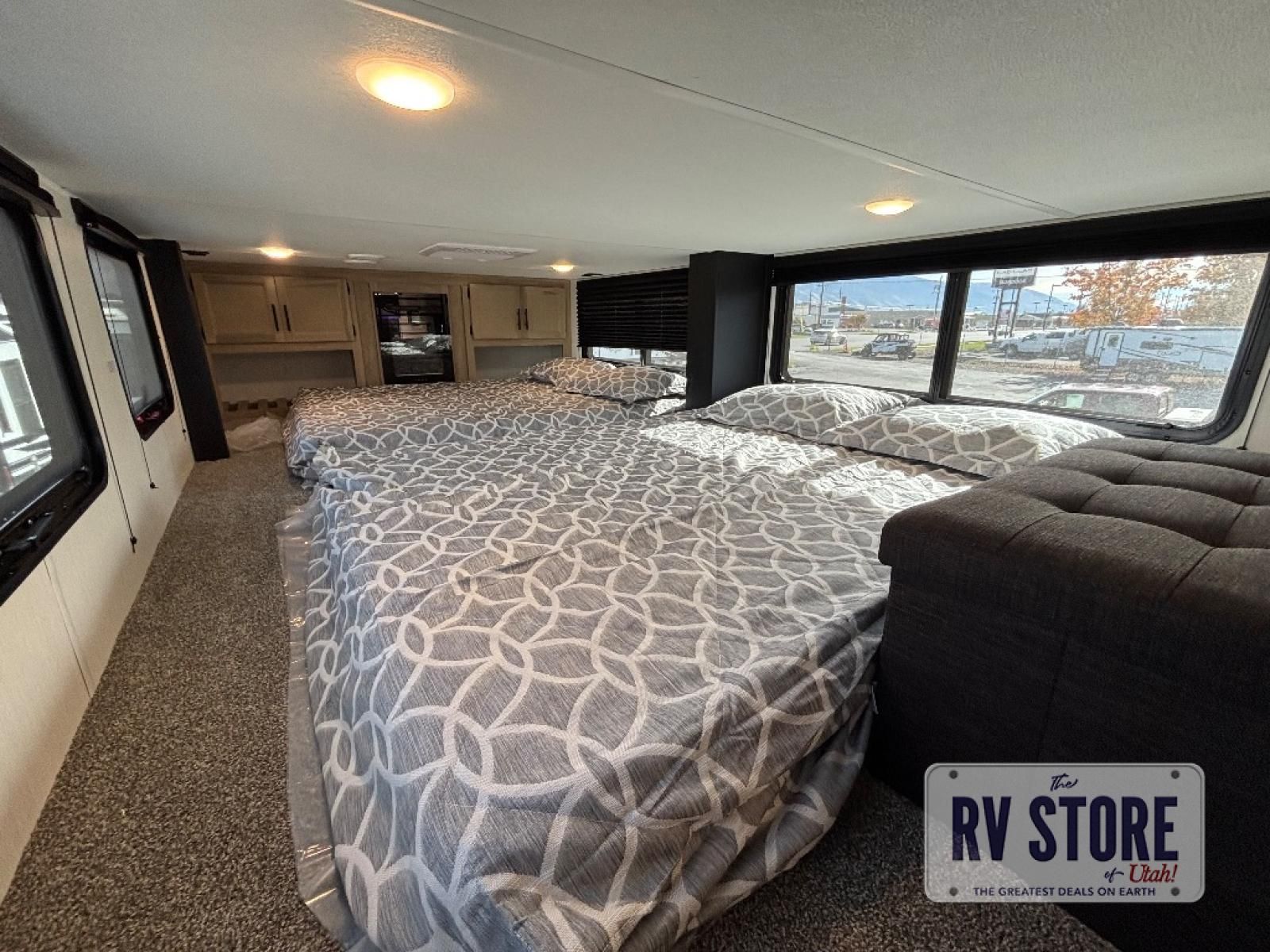 Choosing this destination trailer as your next RV won't be a hard decision! You can enter in through the front bath that includes dual bath sinks, a shower with a seat, and a medicine cabinet for your necessities. The master bedroom is connected to this bath for added convenience, and you're sure to enjoy the bedroom fireplace and king bed slide out. Just outside this room are the stairs that lead to the loft where you'll find two queen-size beds on one side and an open area where the kids can play or to use as storage. A second full bath is found next the stairs on the lower level, and there is a wardrobe with washer/dryer prep if you want to add these appliances. Everyone will love to join together and visit in the combined kitchen and living room. Here, you'll find a free-standing dinette, an L-shaped sofa, a kitchen island with two chairs, plus an entertainment center with a fireplace! The hidden pantry behind the fireplace will let you keep food stocked, and the rear patio doors will let natural light in!