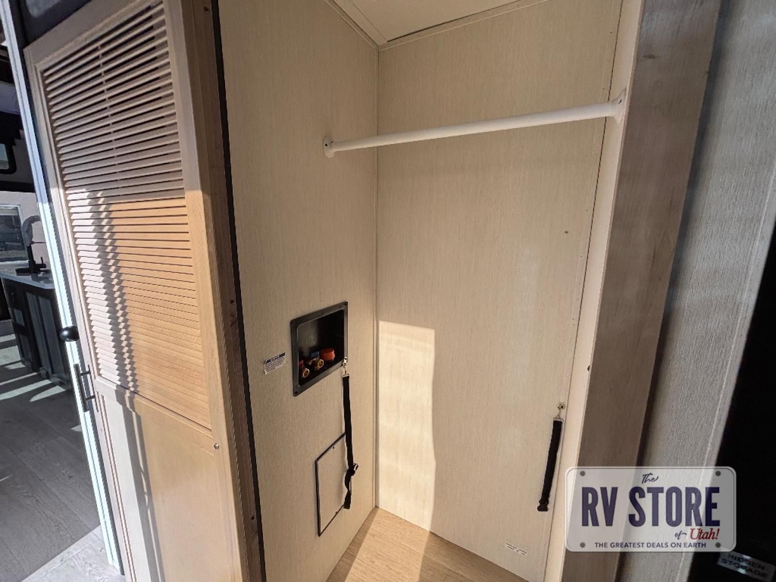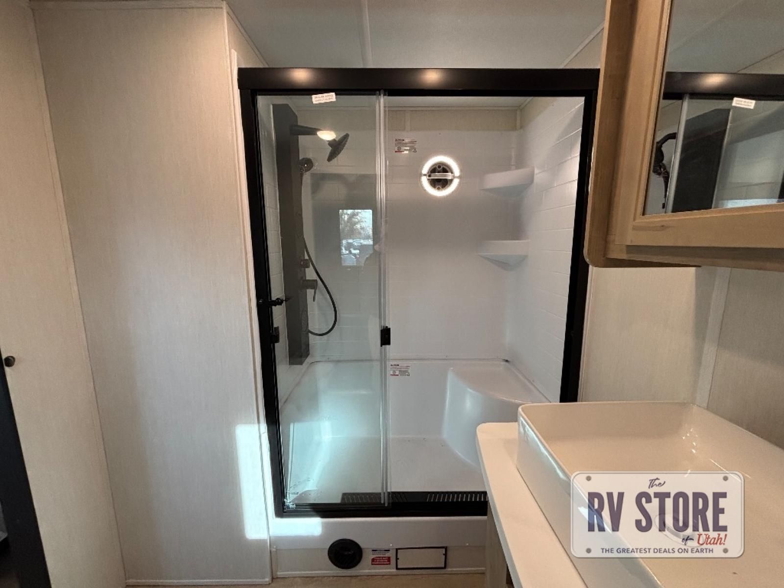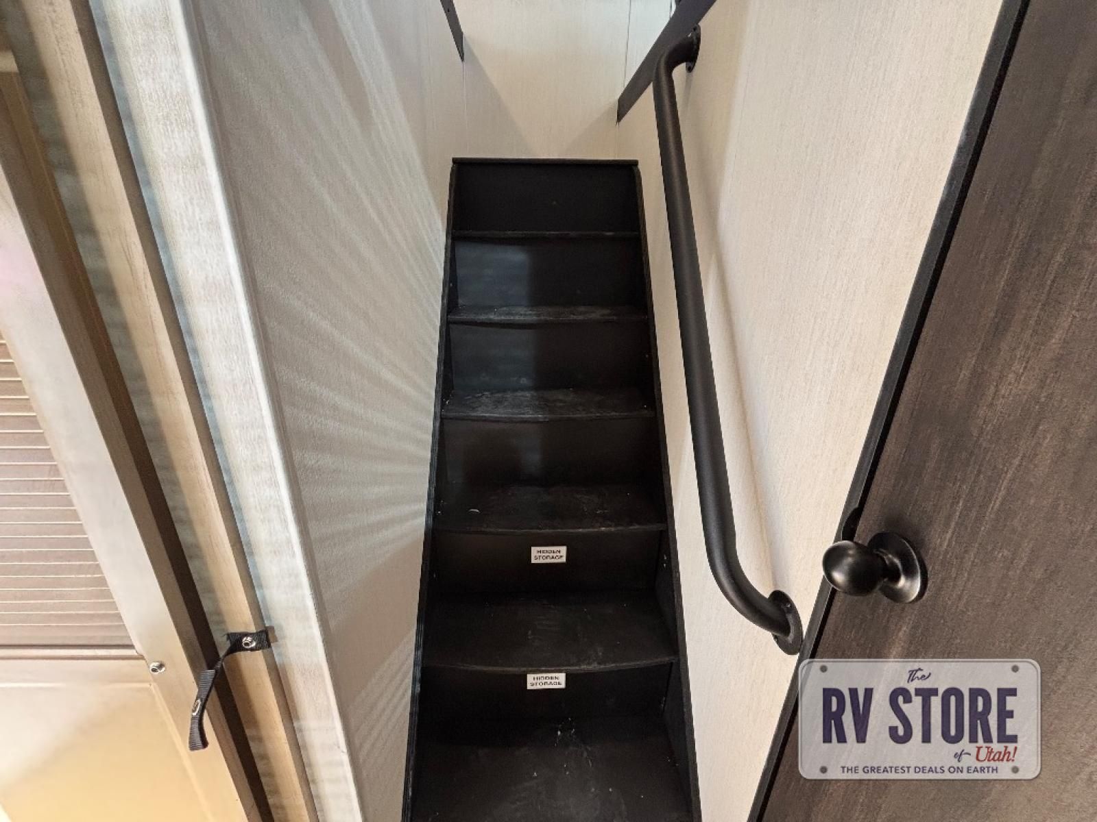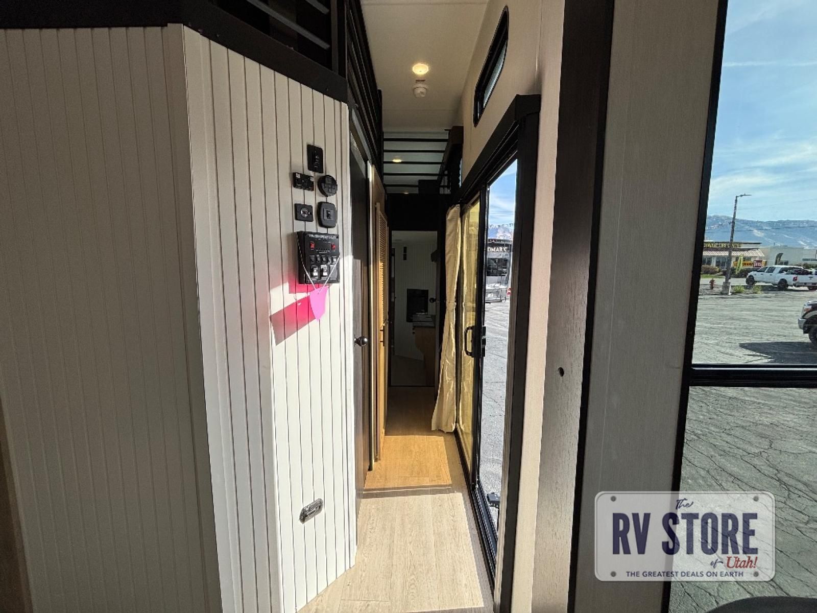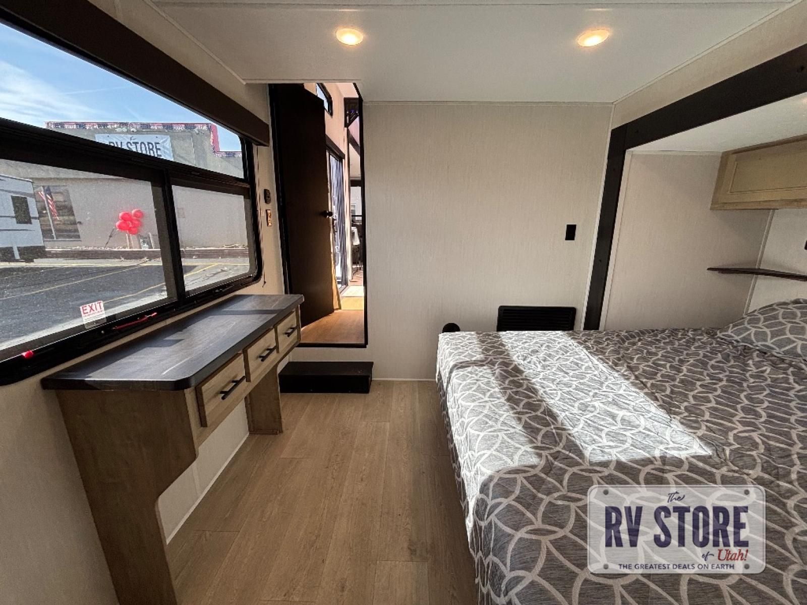 Choosing this destination trailer as your next RV won't be a hard decision! You can enter in through the front bath that includes dual bath sinks, a shower with a seat, and a medicine cabinet for your necessities. The master bedroom is connected to this bath for added convenience, and you're sure to enjoy the bedroom fireplace and king bed slide out. Just outside this room are the stairs that lead to the loft where you'll find two queen-size beds on one side and an open area where the kids can play or to use as storage. A second full bath is found next the stairs on the lower level, and there is a wardrobe with washer/dryer prep if you want to add these appliances. Everyone will love to join together and visit in the combined kitchen and living room. Here, you'll find a free-standing dinette, an L-shaped sofa, a kitchen island with two chairs, plus an entertainment center with a fireplace! The hidden pantry behind the fireplace will let you keep food stocked, and the rear patio doors will let natural light in!