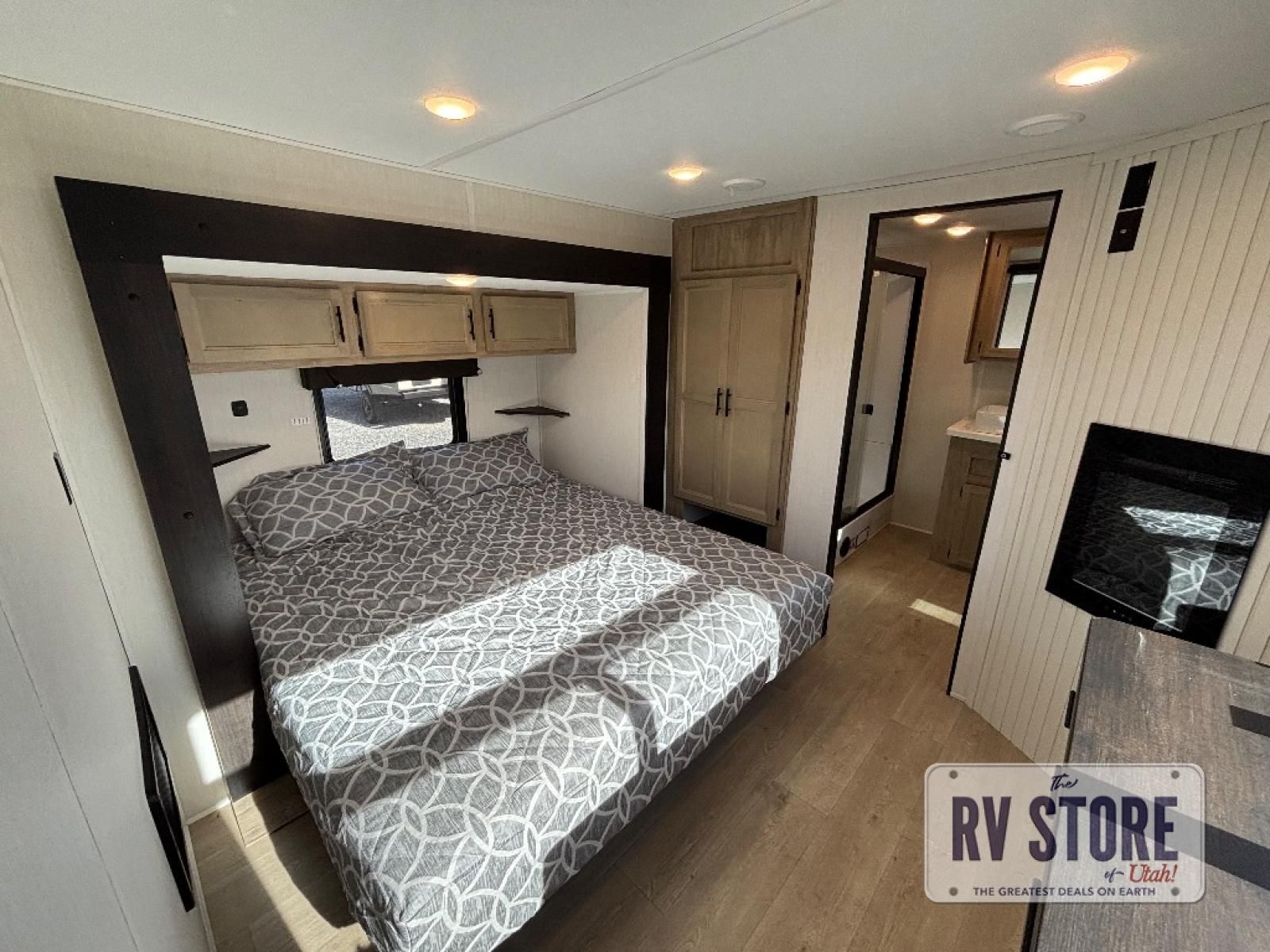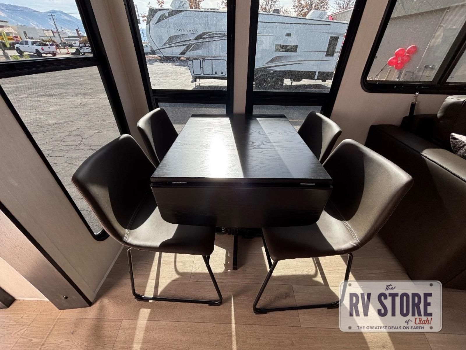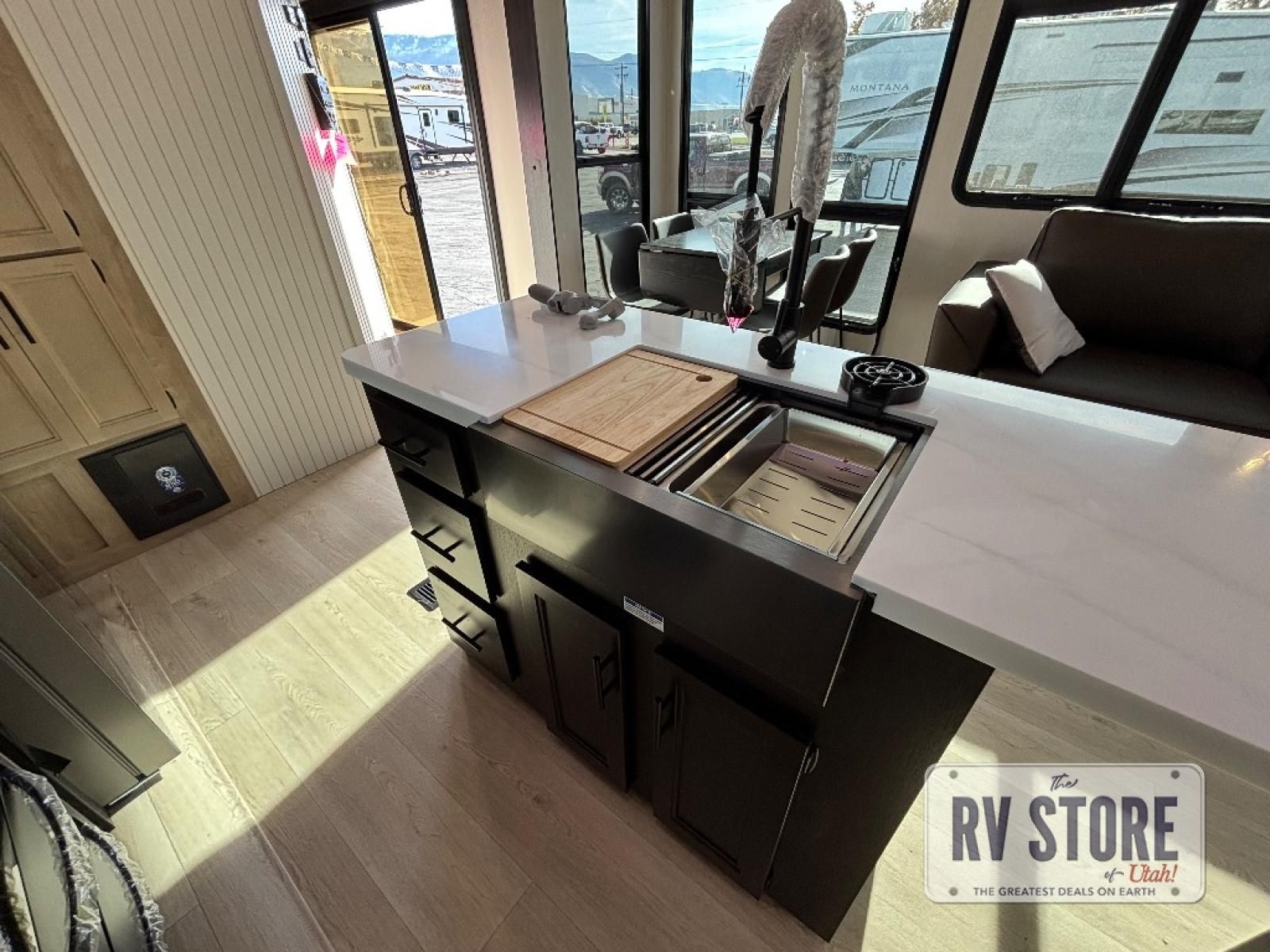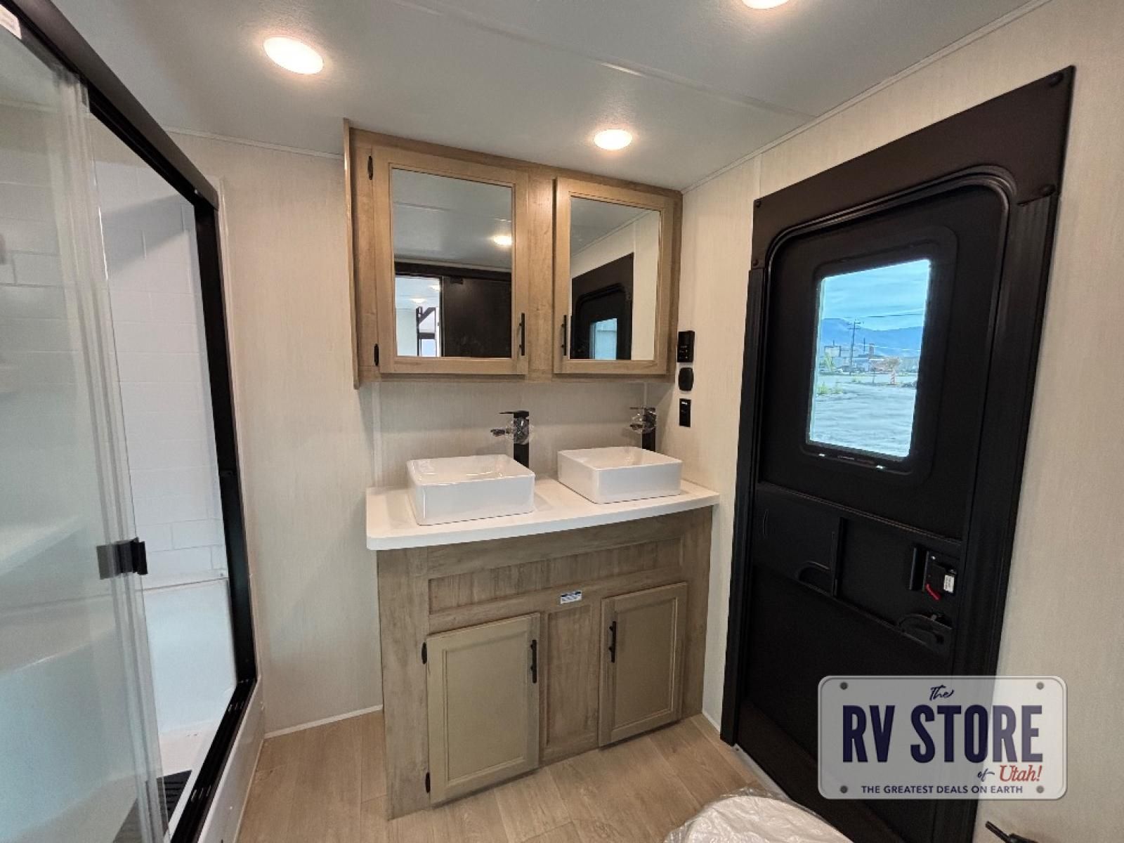 Choosing this destination trailer as your next RV won't be a hard decision! You can enter in through the front bath that includes dual bath sinks, a shower with a seat, and a medicine cabinet for your necessities. The master bedroom is connected to this bath for added convenience, and you're sure to enjoy the bedroom fireplace and king bed slide out. Just outside this room are the stairs that lead to the loft where you'll find two queen-size beds on one side and an open area where the kids can play or to use as storage. A second full bath is found next the stairs on the lower level, and there is a wardrobe with washer/dryer prep if you want to add these appliances. Everyone will love to join together and visit in the combined kitchen and living room. Here, you'll find a free-standing dinette, an L-shaped sofa, a kitchen island with two chairs, plus an entertainment center with a fireplace! The hidden pantry behind the fireplace will let you keep food stocked, and the rear patio doors will let natural light in!