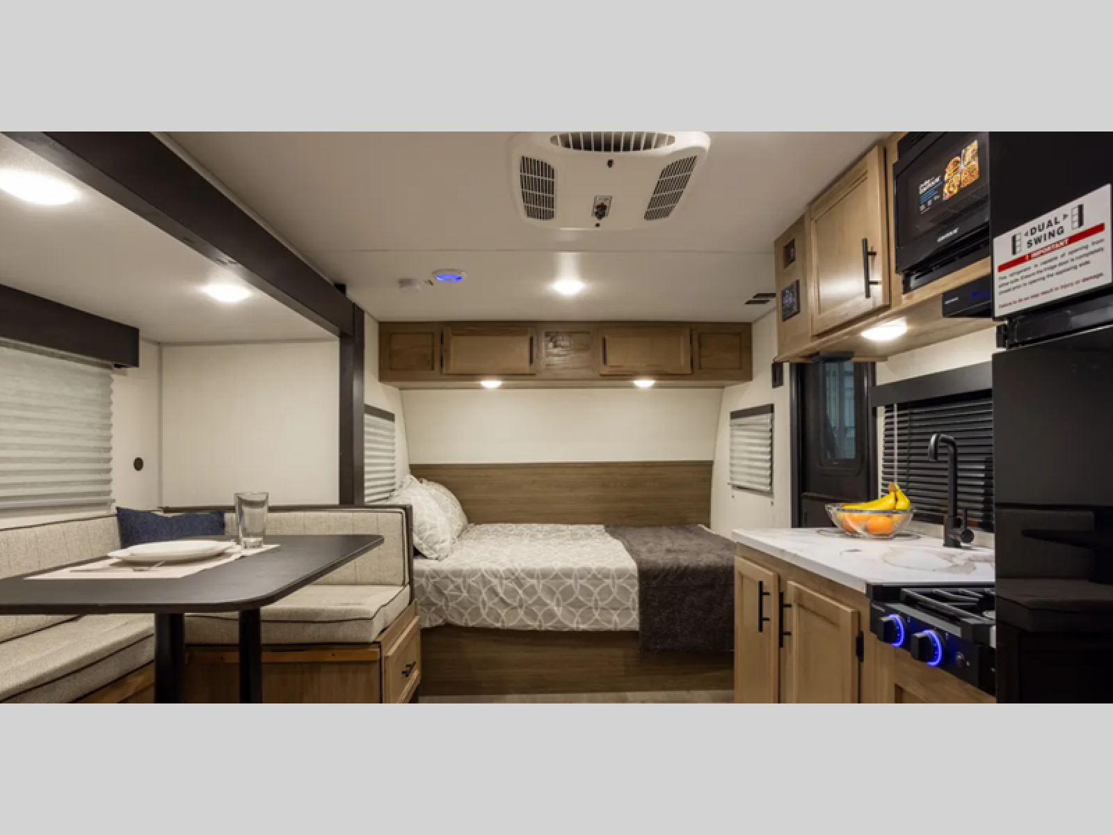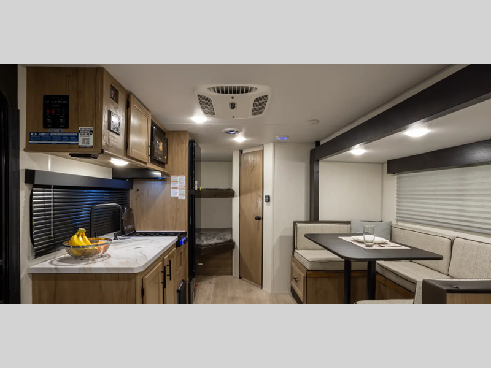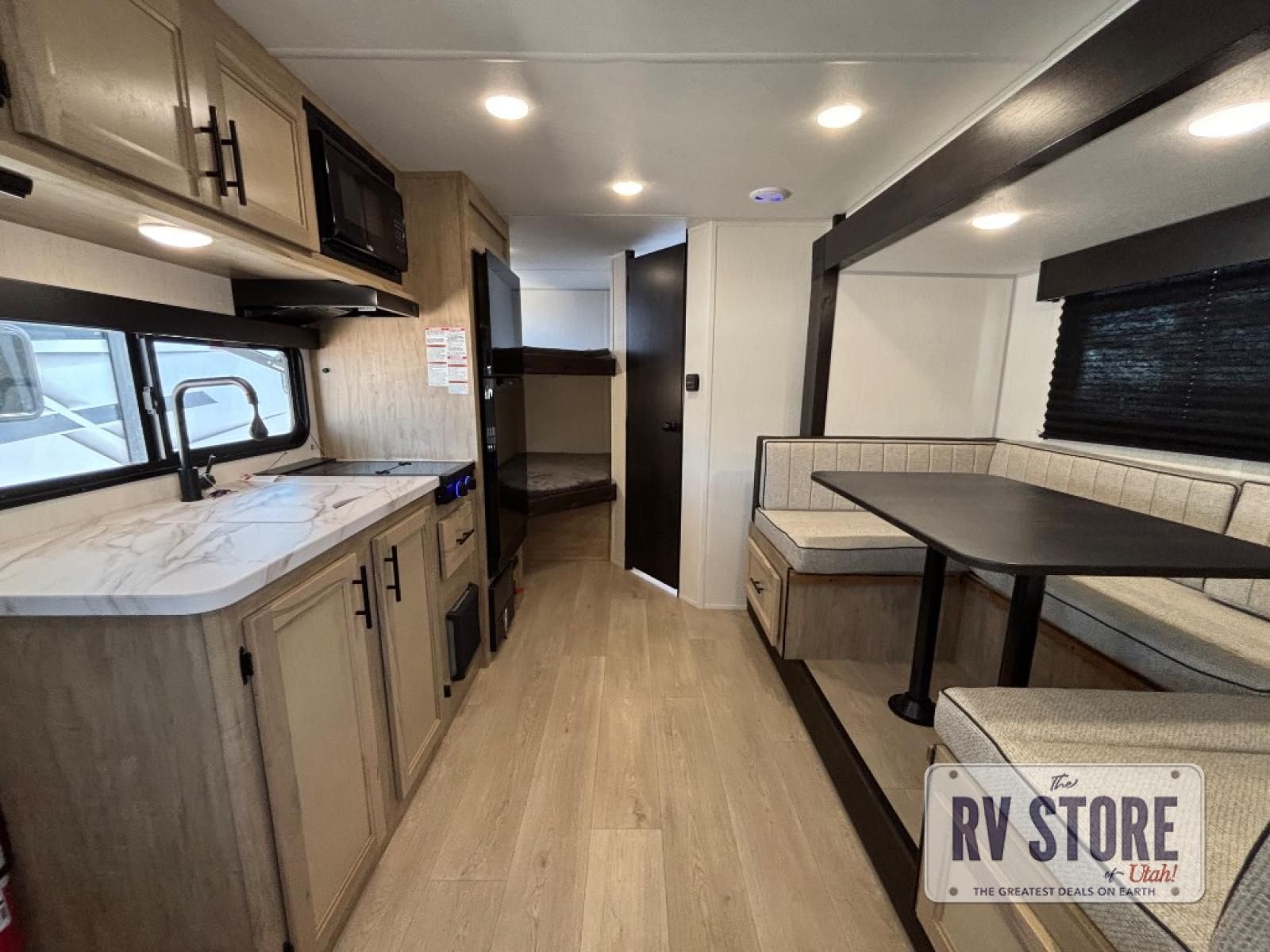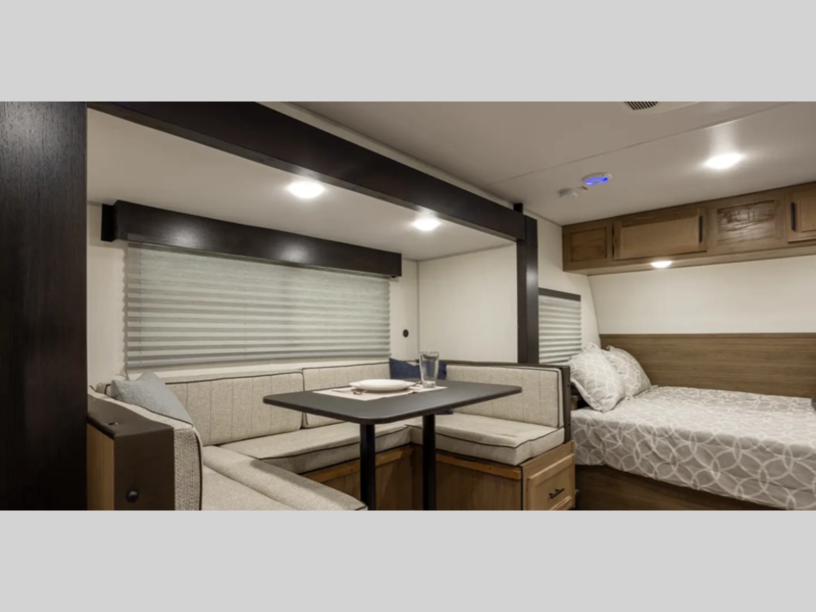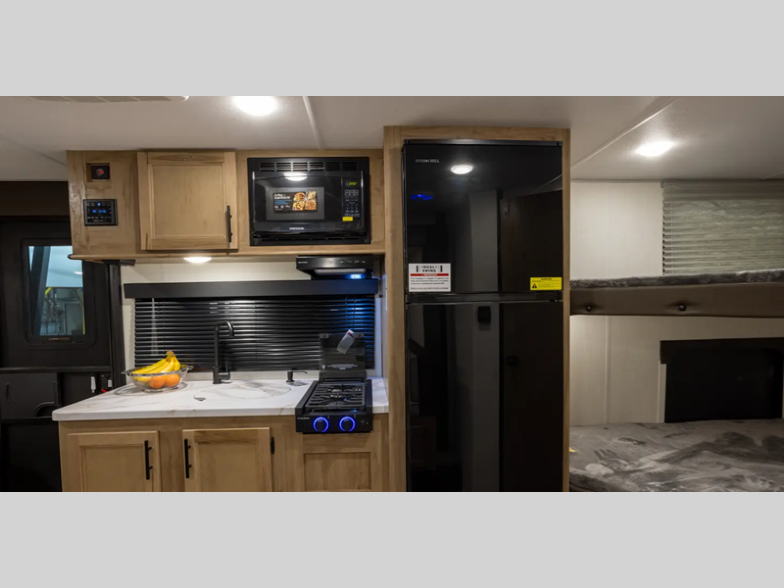 This family travel trailer is ready to head to the campground whenever you are! The kiddos can sleep on the set of double-size bed bunks and you can sleep on the front queen bed, plus the U-shaped dinette slide can also transform into an extra sleeping space when you aren't using it to enjoy a meal prepared with the high output cooktop. You can also prepare your delicious meals at the outside mini kitchen and stay protected by the power awning. The exterior not only has outside storage and an outside TV mount, but also features an outside storage plus door for access to the storage space underneath the bottom bunk bed. The rear corner bath allows everyone to stay clean and refreshed while you camp.
