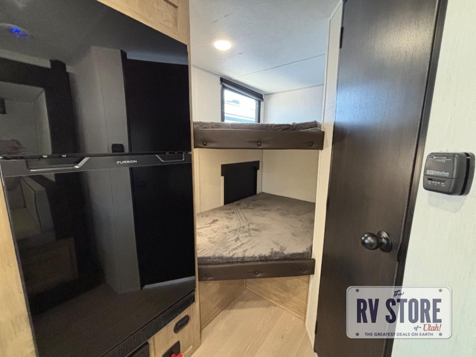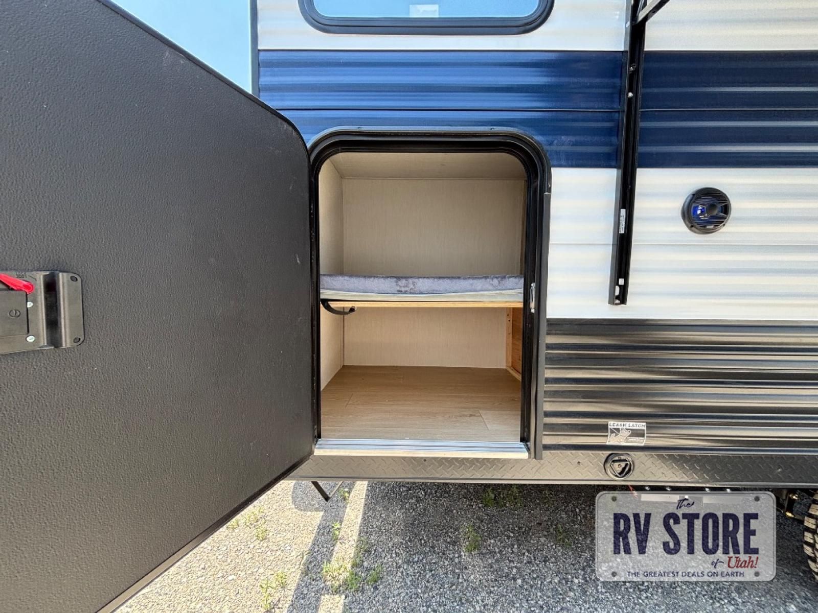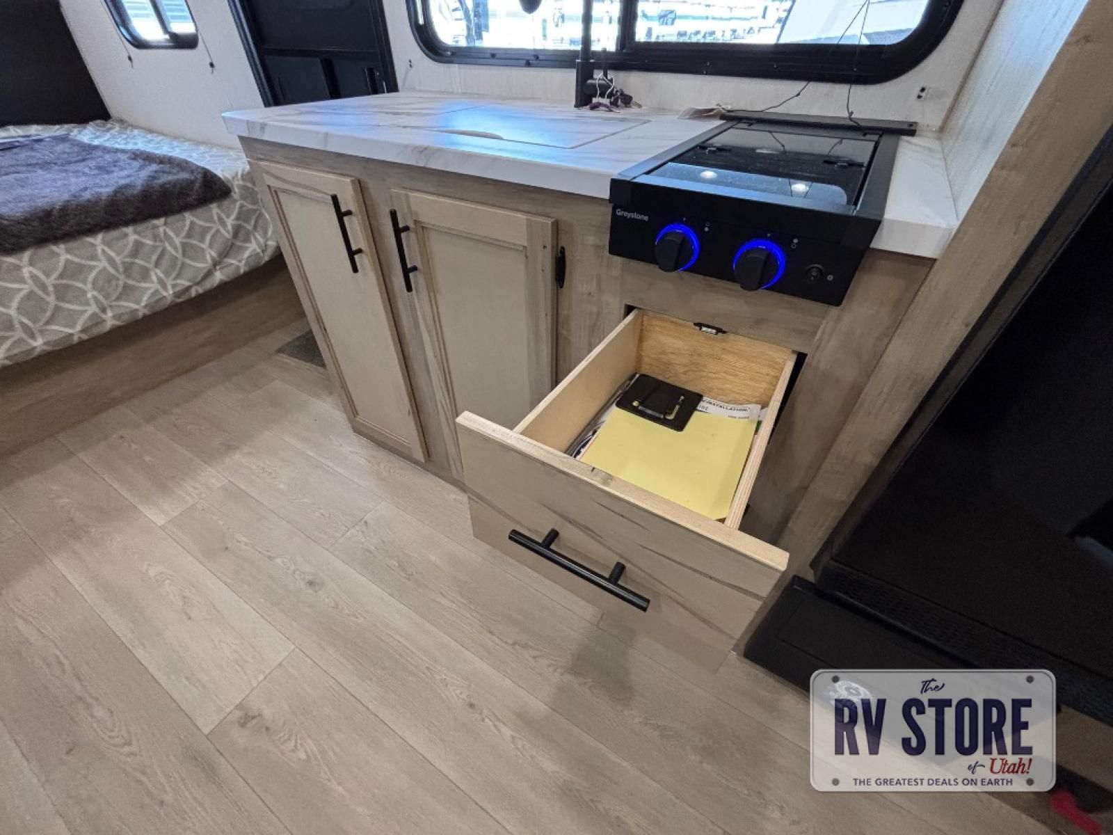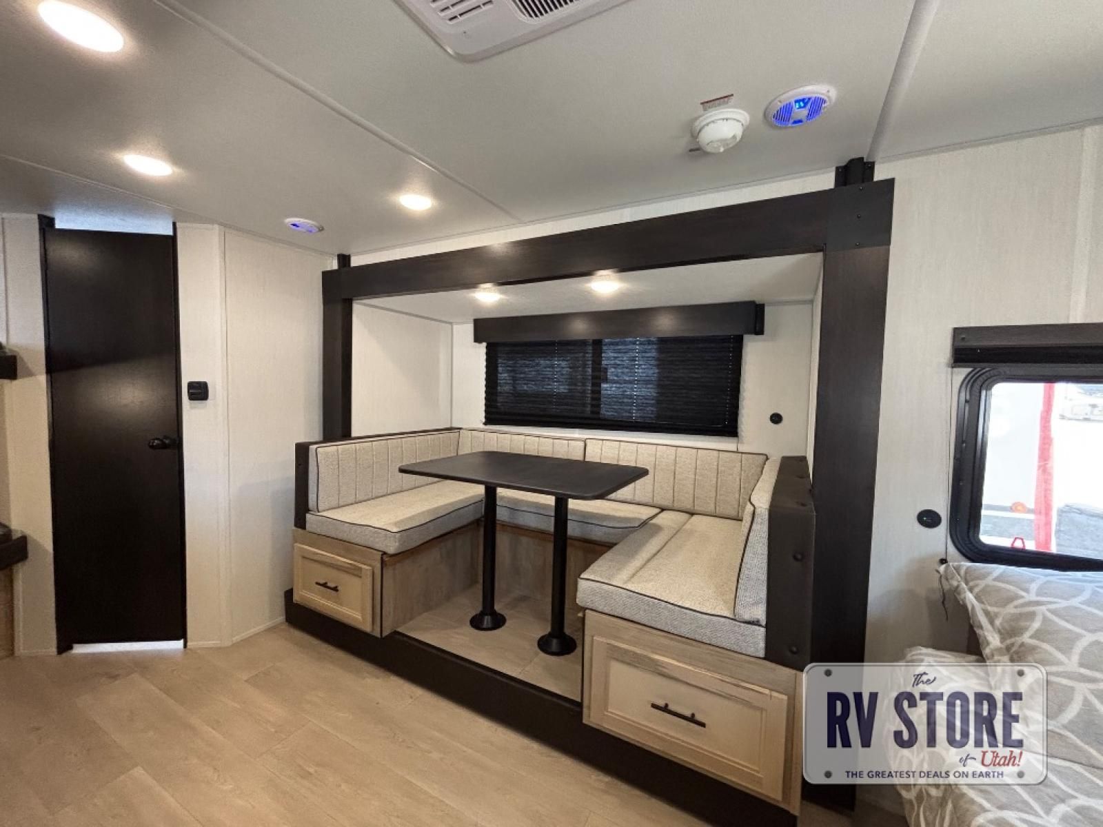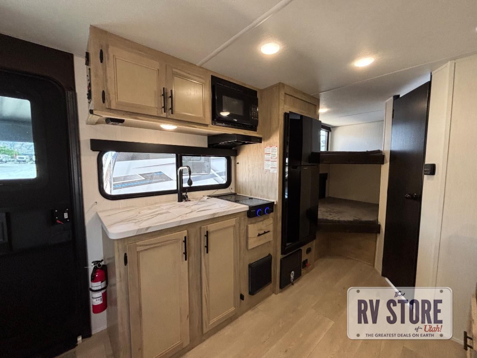 This family travel trailer is ready to head to the campground whenever you are! The kiddos can sleep on the set of double-size bed bunks and you can sleep on the front queen bed, plus the U-shaped dinette slide can also transform into an extra sleeping space when you aren't using it to enjoy a meal prepared with the high output cooktop. You can also prepare your delicious meals at the outside mini kitchen and stay protected by the power awning. The exterior not only has outside storage and an outside TV mount, but also features an outside storage plus door for access to the storage space underneath the bottom bunk bed. The rear corner bath allows everyone to stay clean and refreshed while you camp.