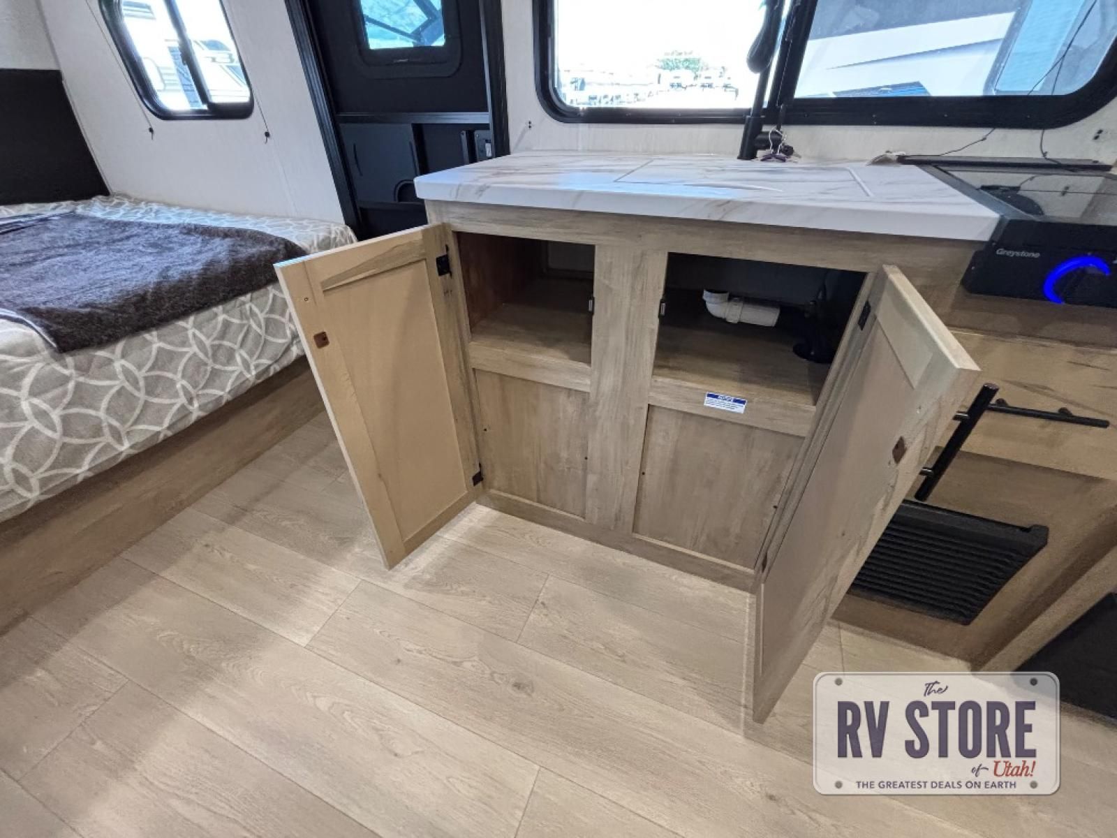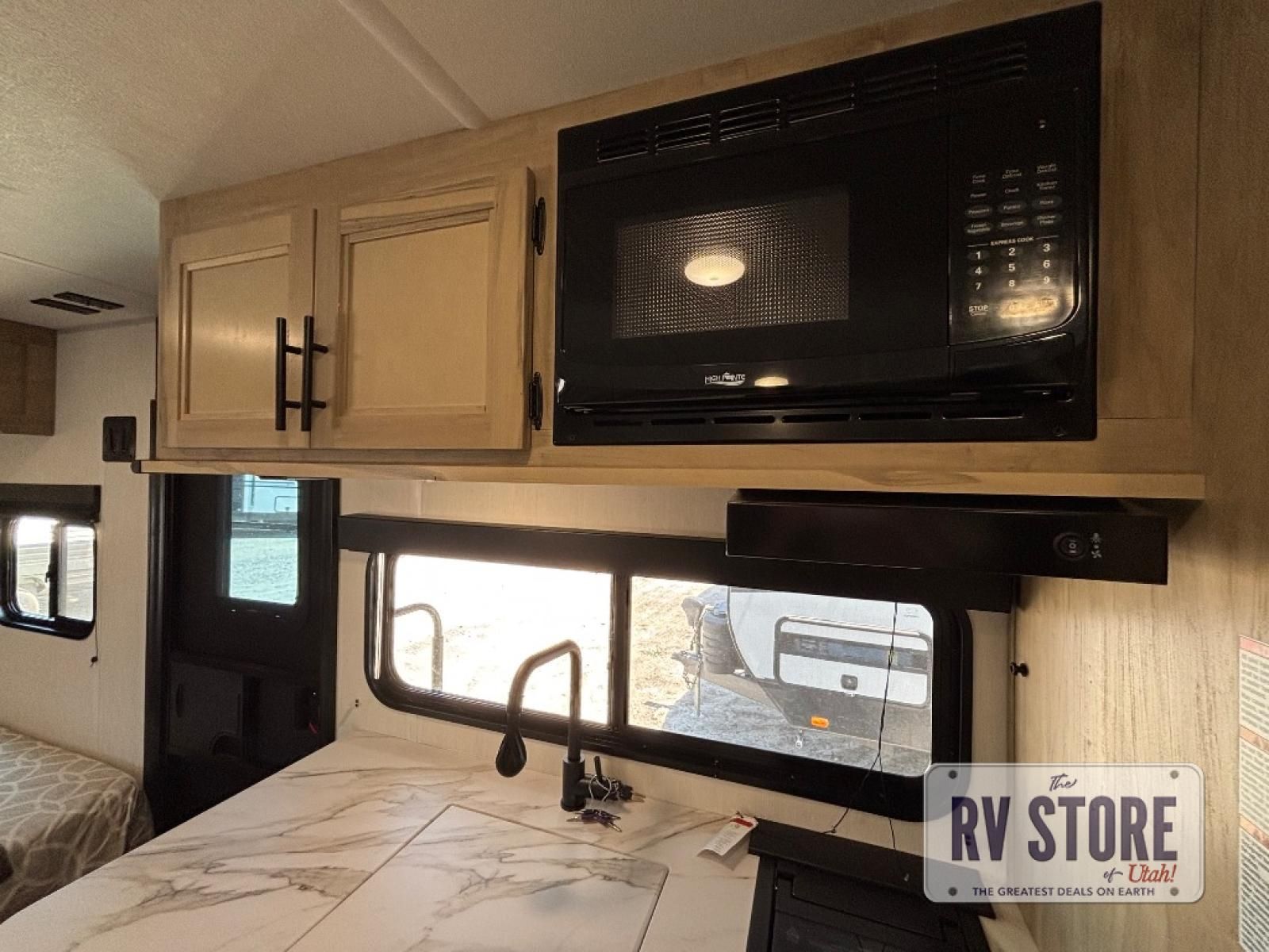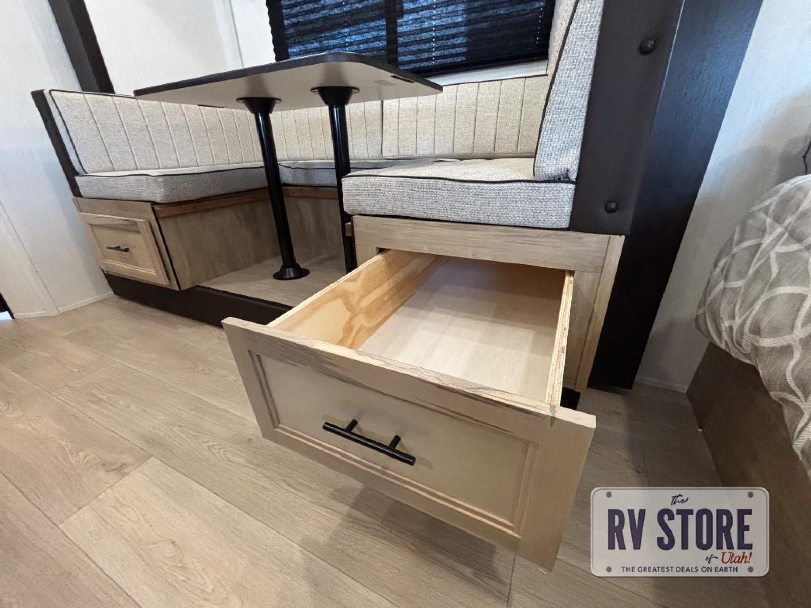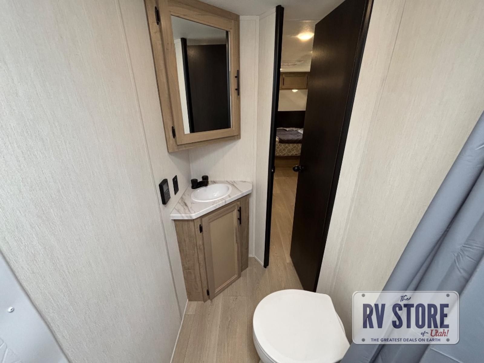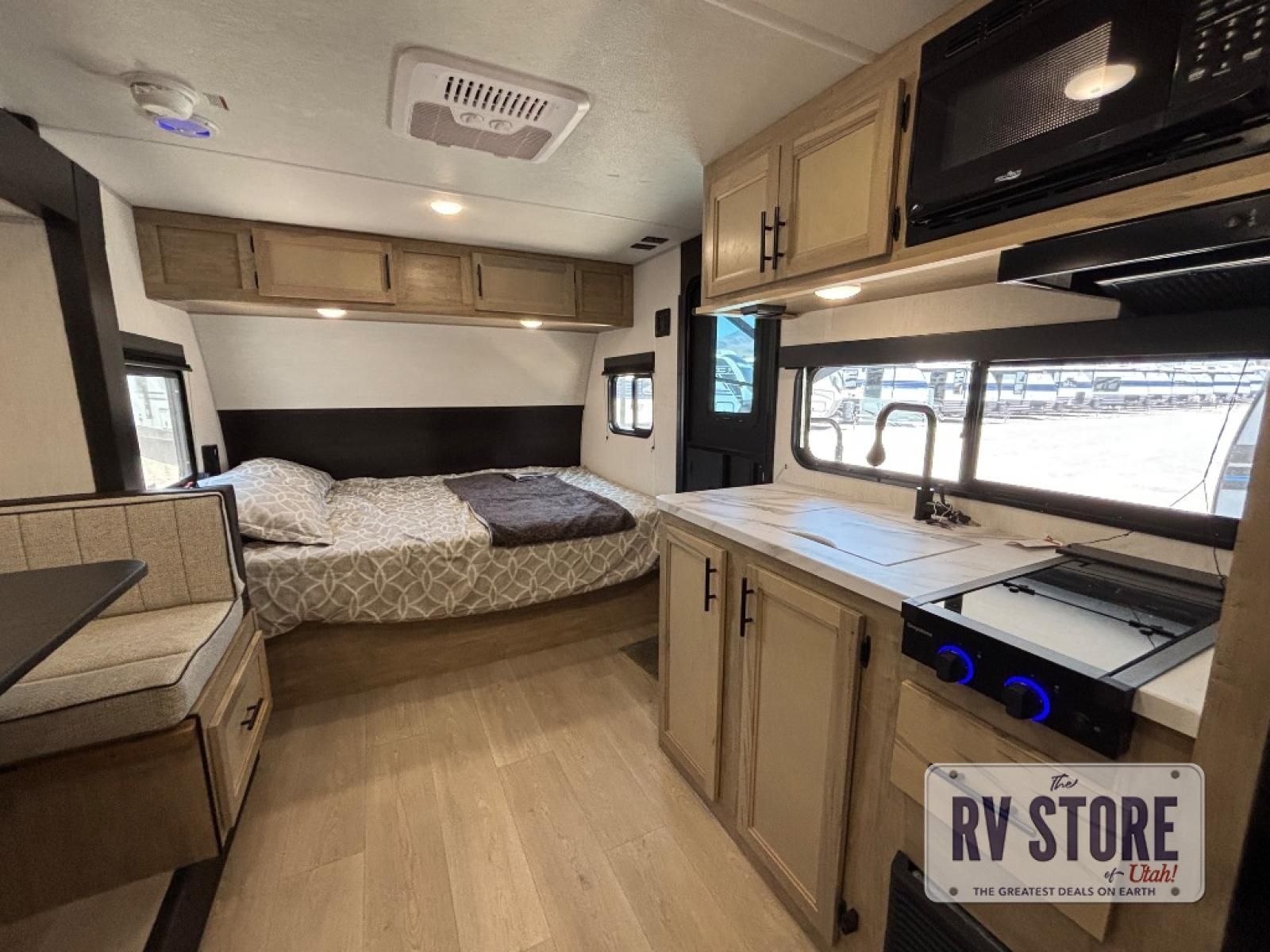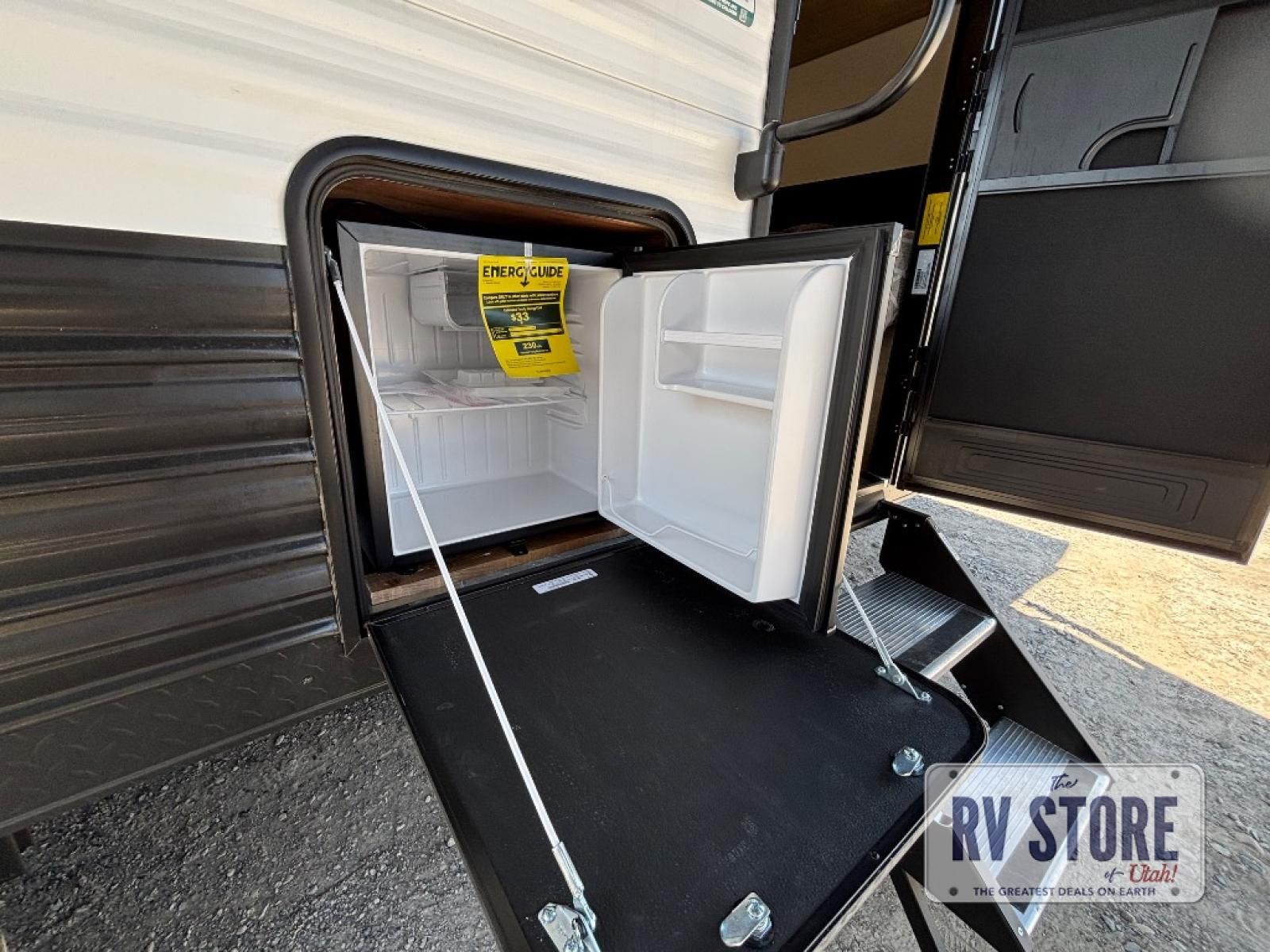 This family travel trailer is ready to head to the campground whenever you are! The kiddos can sleep on the set of double-size bed bunks and you can sleep on the front queen bed, plus the U-shaped dinette slide can also transform into an extra sleeping space when you aren't using it to enjoy a meal prepared with the high output cooktop. You can also prepare your delicious meals at the outside mini kitchen and stay protected by the power awning. The exterior not only has outside storage and an outside TV mount, but also features an outside storage plus door for access to the storage space underneath the bottom bunk bed. The rear corner bath allows everyone to stay clean and refreshed while you camp.