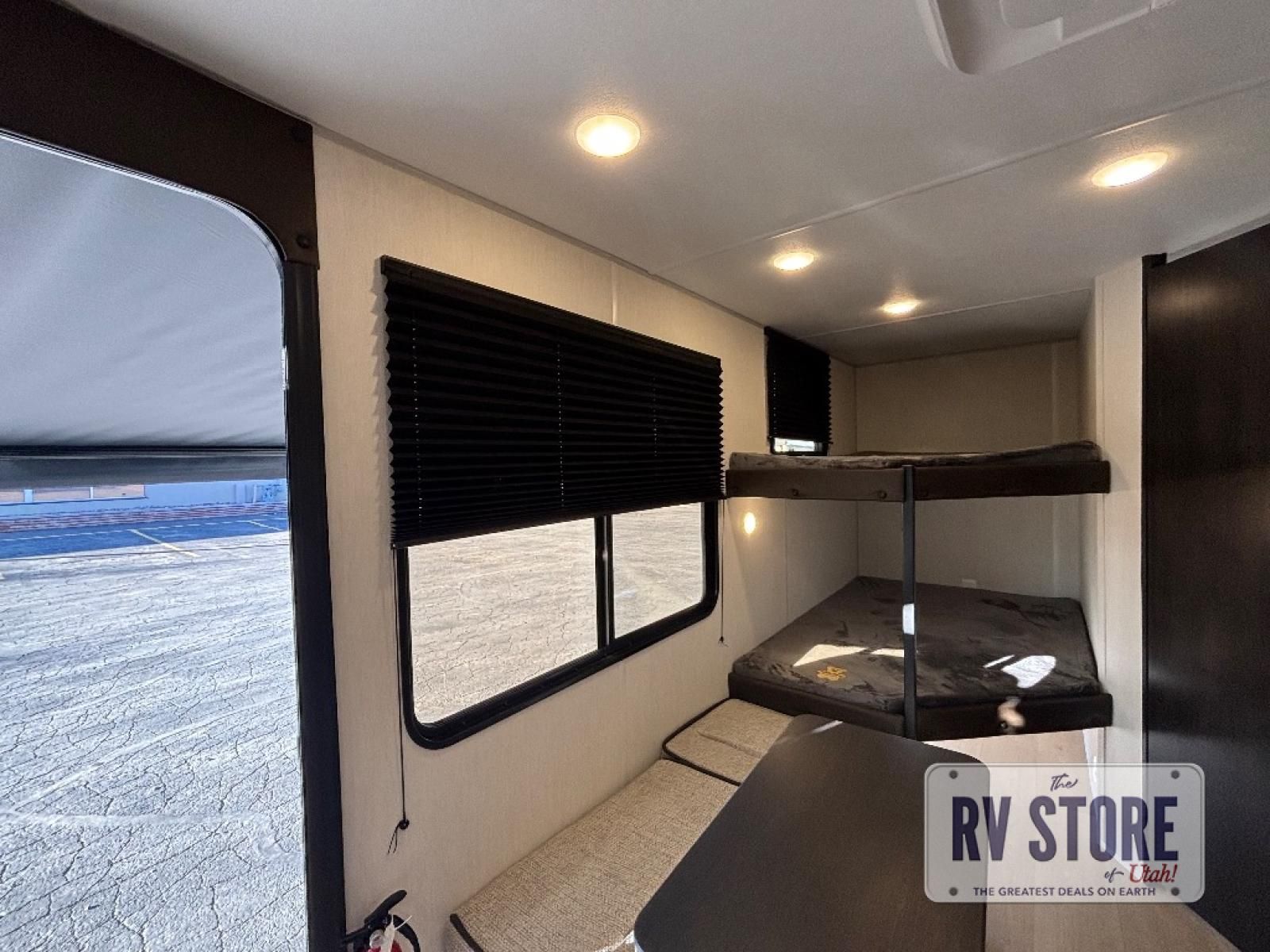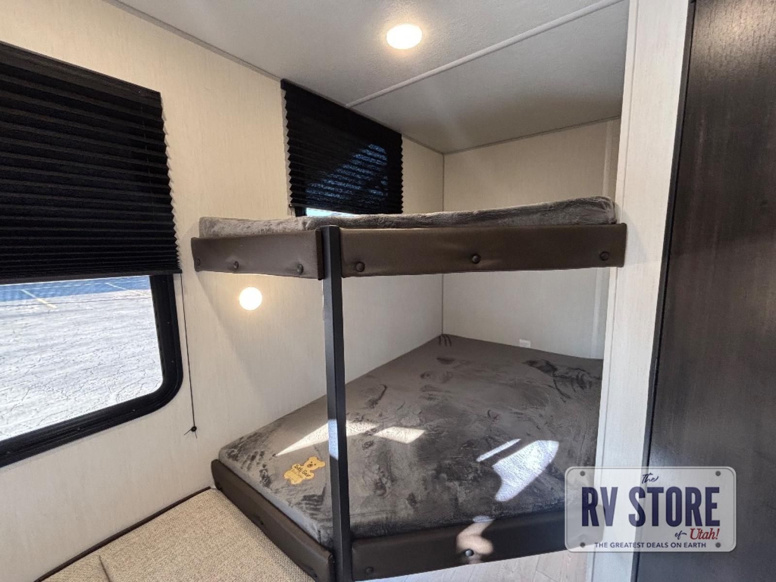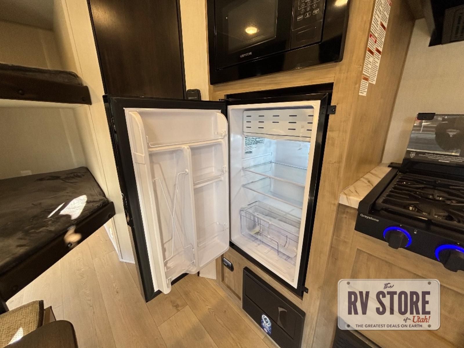Create amazing memories in this stunning travel trailer! It is perfect for at least six people, thanks to its multiple sleeping spaces. The spacious double-sized bunk beds are ideal for kids or guests, while the plush queen-sized bed provides a restful retreat for adults. The full bathroom is equipped with everything you need for a comfortable stay, and the kitchen features a refrigerator and microwave for you to go wild in the kitchen. You can also gather around the dinette for meals and snacks, or relax in the evenings under the protection of the exterior awning. In addition, ample overhead cabinets provide storage for cookware, dishes, and essentials, keeping your trailer tidy and organized.