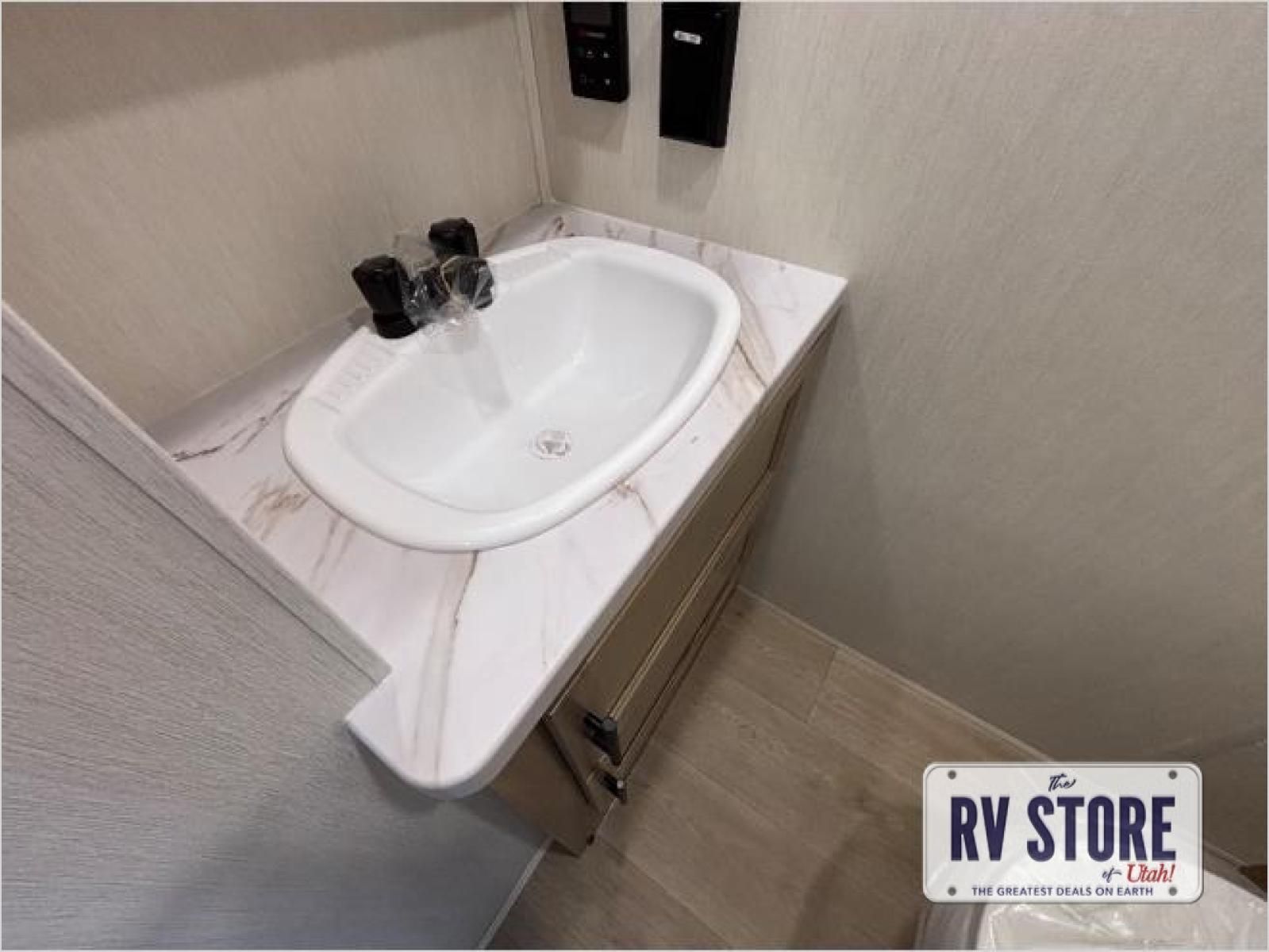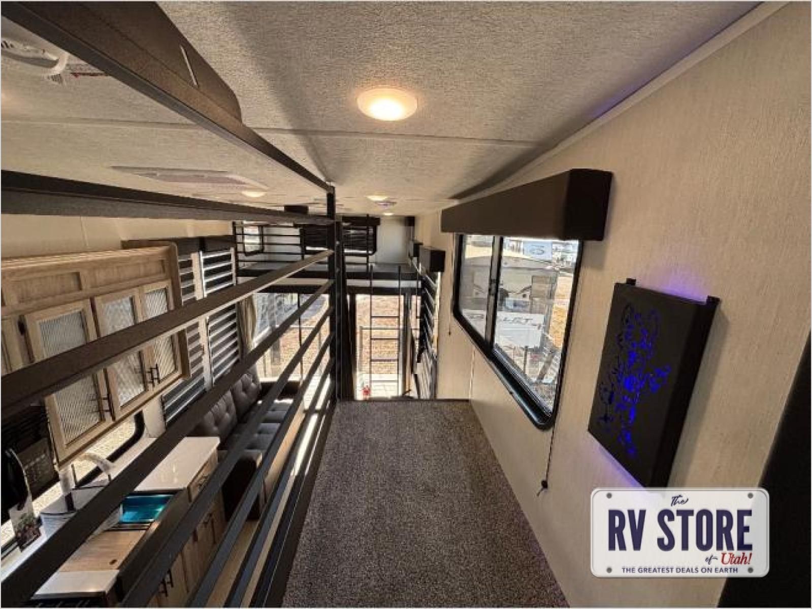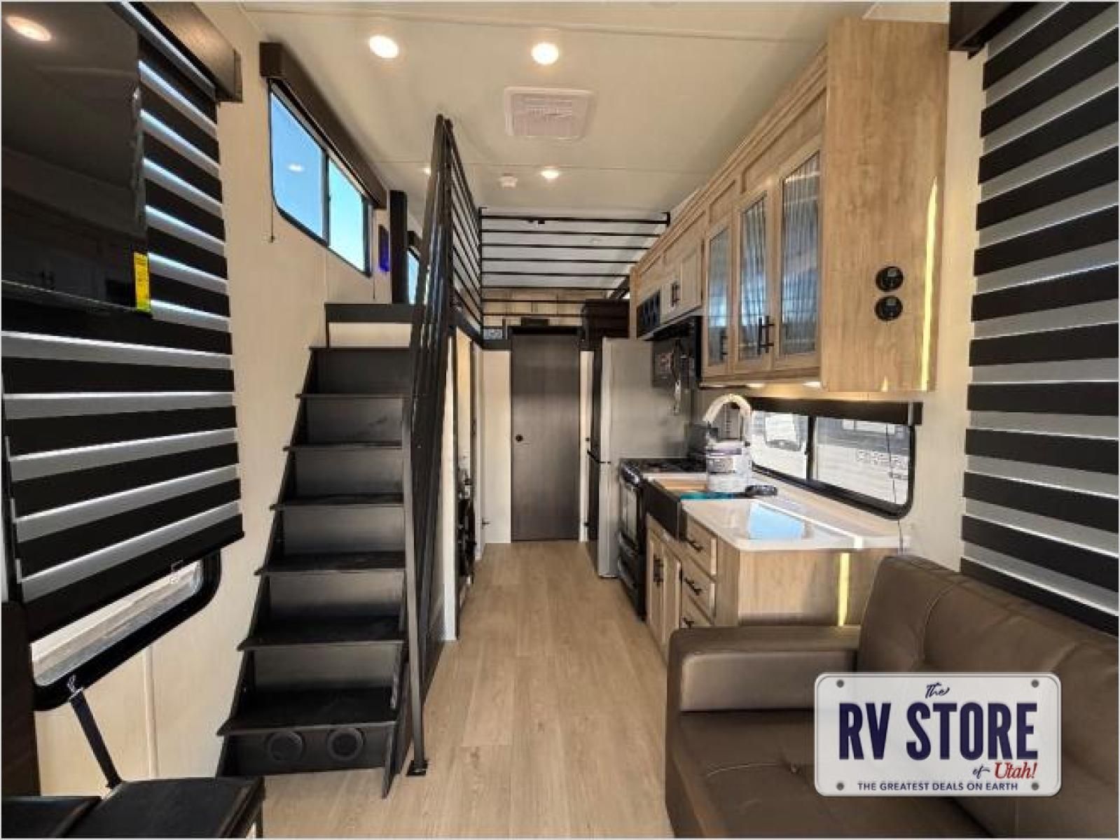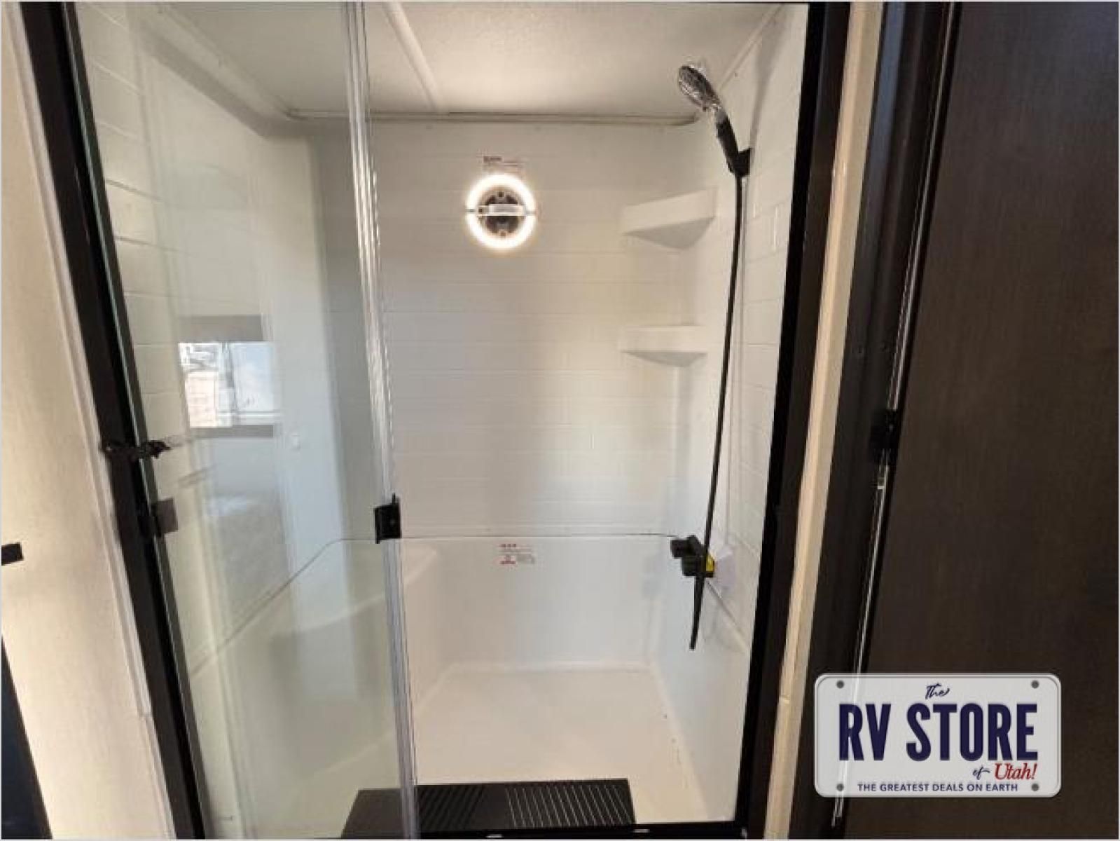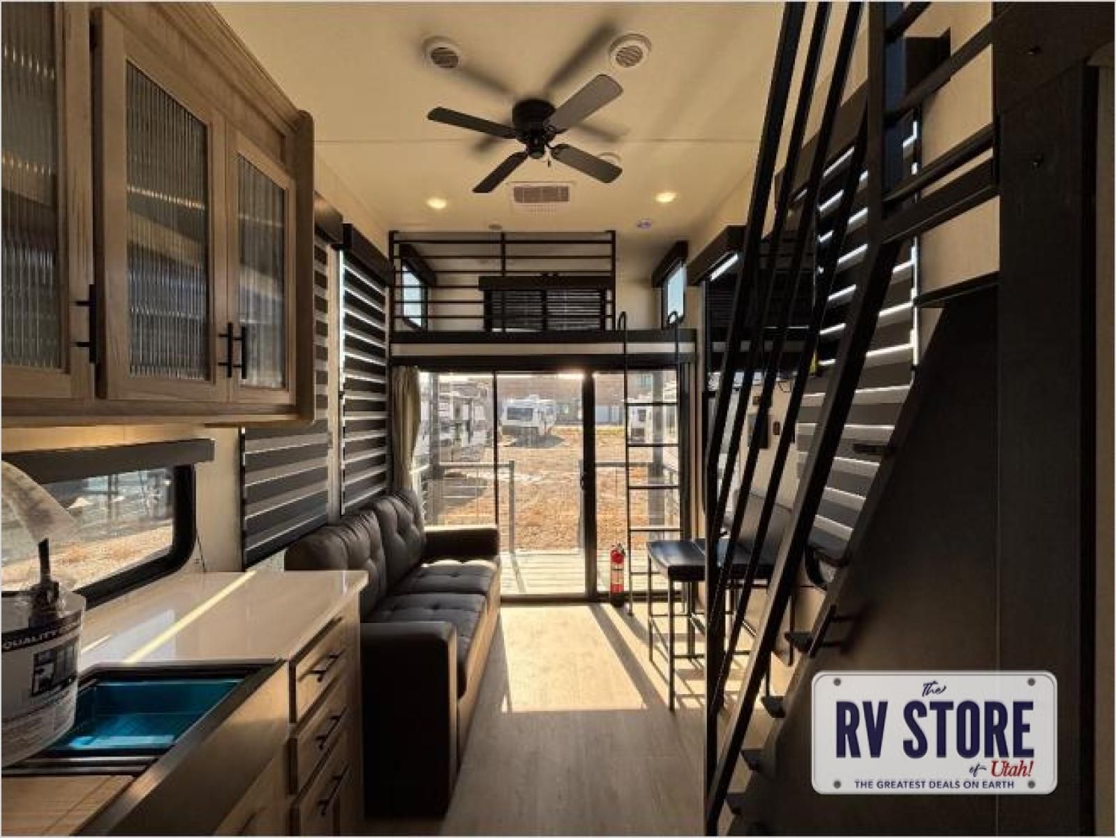 This model is similar to 16ML but larger! A bigger bathroom, RVÂ king bed in the lower master, and a queen bed plus a twin bunk mat in the front loft. And the second loft can be utilized as extra sleeping space or storage space! There is an 18 cu. ft. refrigerator so you can stock up for a week long vacation, a hide-a-bed sofa that can transform into added sleeping for guests, and a high top table with two stools to dine at. The bathroom below is split with a shower on one side, and a private toilet area and sink opposite. And the view is amazing from just about anywhere inside.