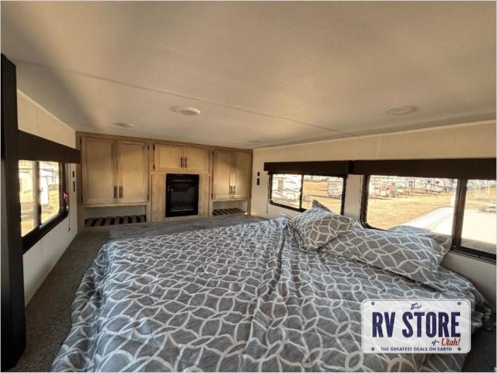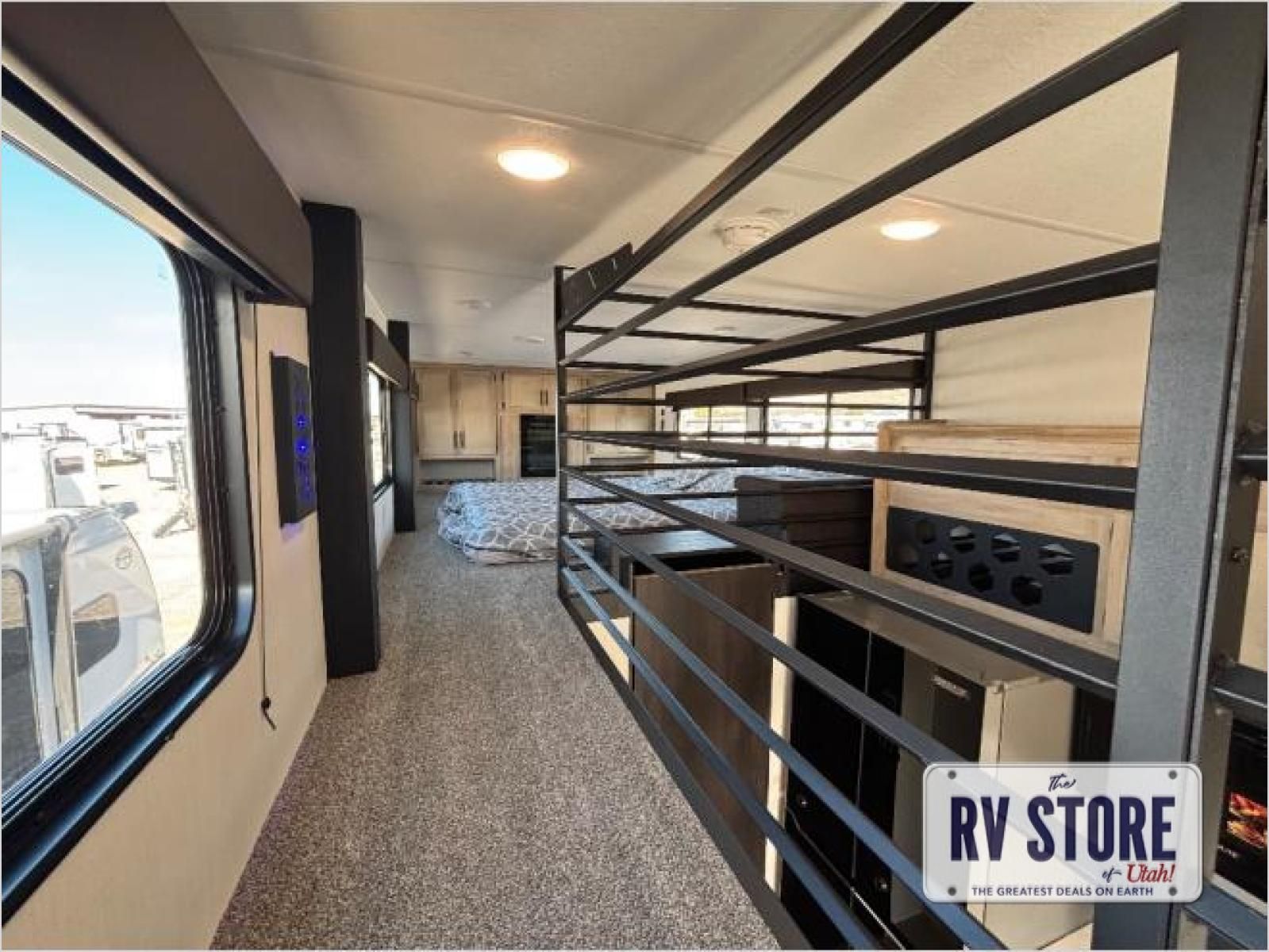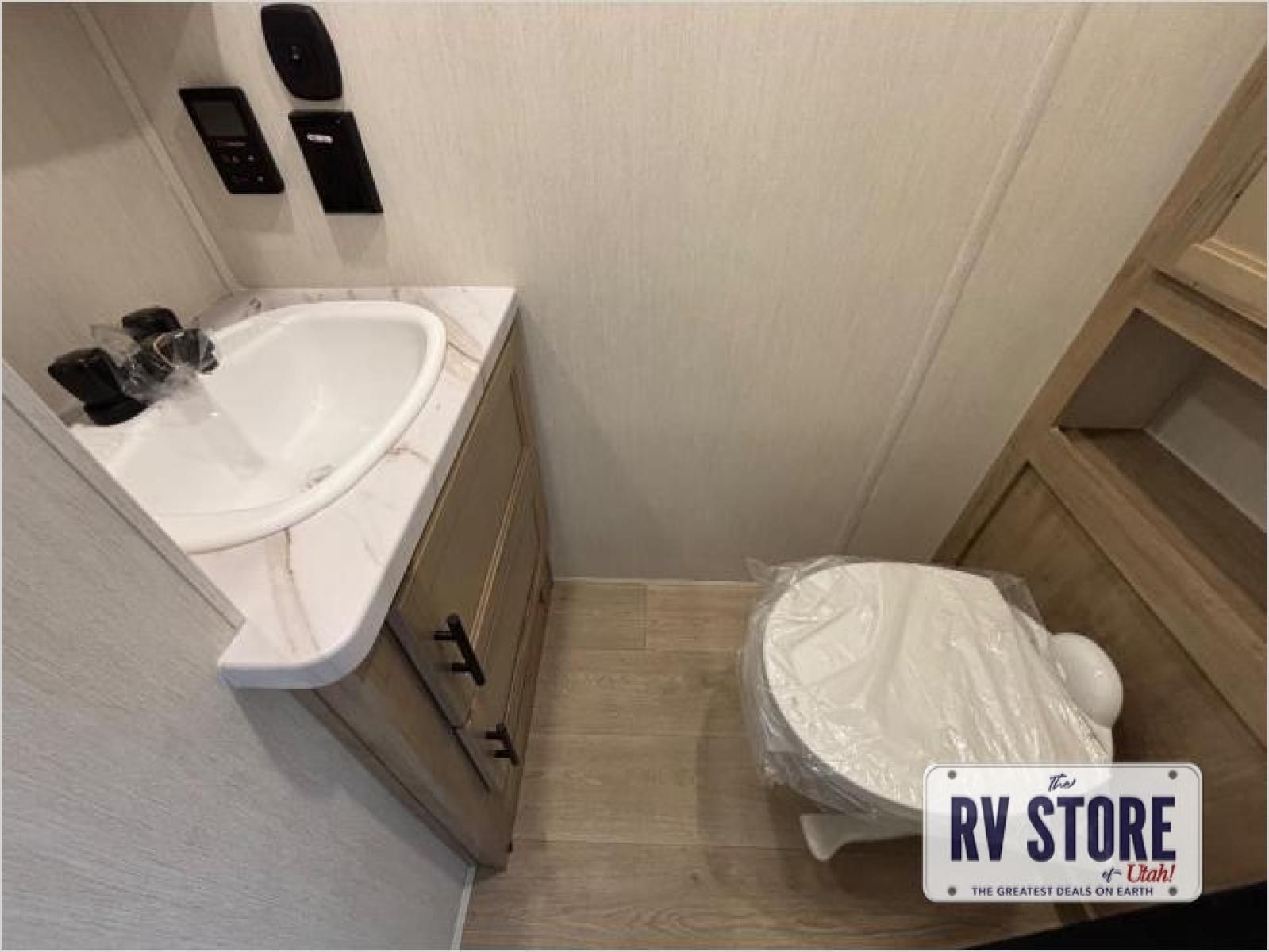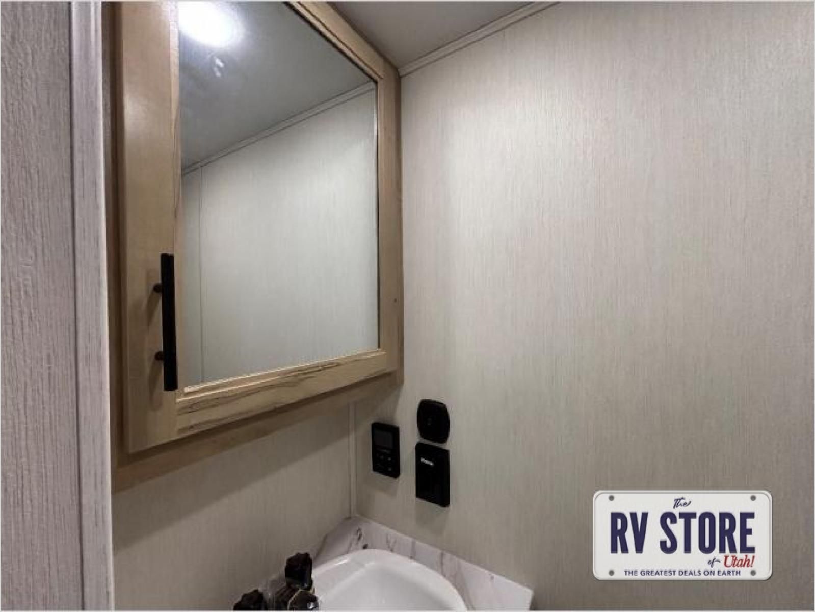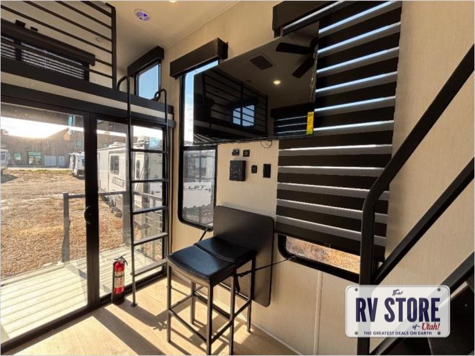 This model is similar to 16ML but larger! A bigger bathroom, RVÂ king bed in the lower master, and a queen bed plus a twin bunk mat in the front loft. And the second loft can be utilized as extra sleeping space or storage space! There is an 18 cu. ft. refrigerator so you can stock up for a week long vacation, a hide-a-bed sofa that can transform into added sleeping for guests, and a high top table with two stools to dine at. The bathroom below is split with a shower on one side, and a private toilet area and sink opposite. And the view is amazing from just about anywhere inside.