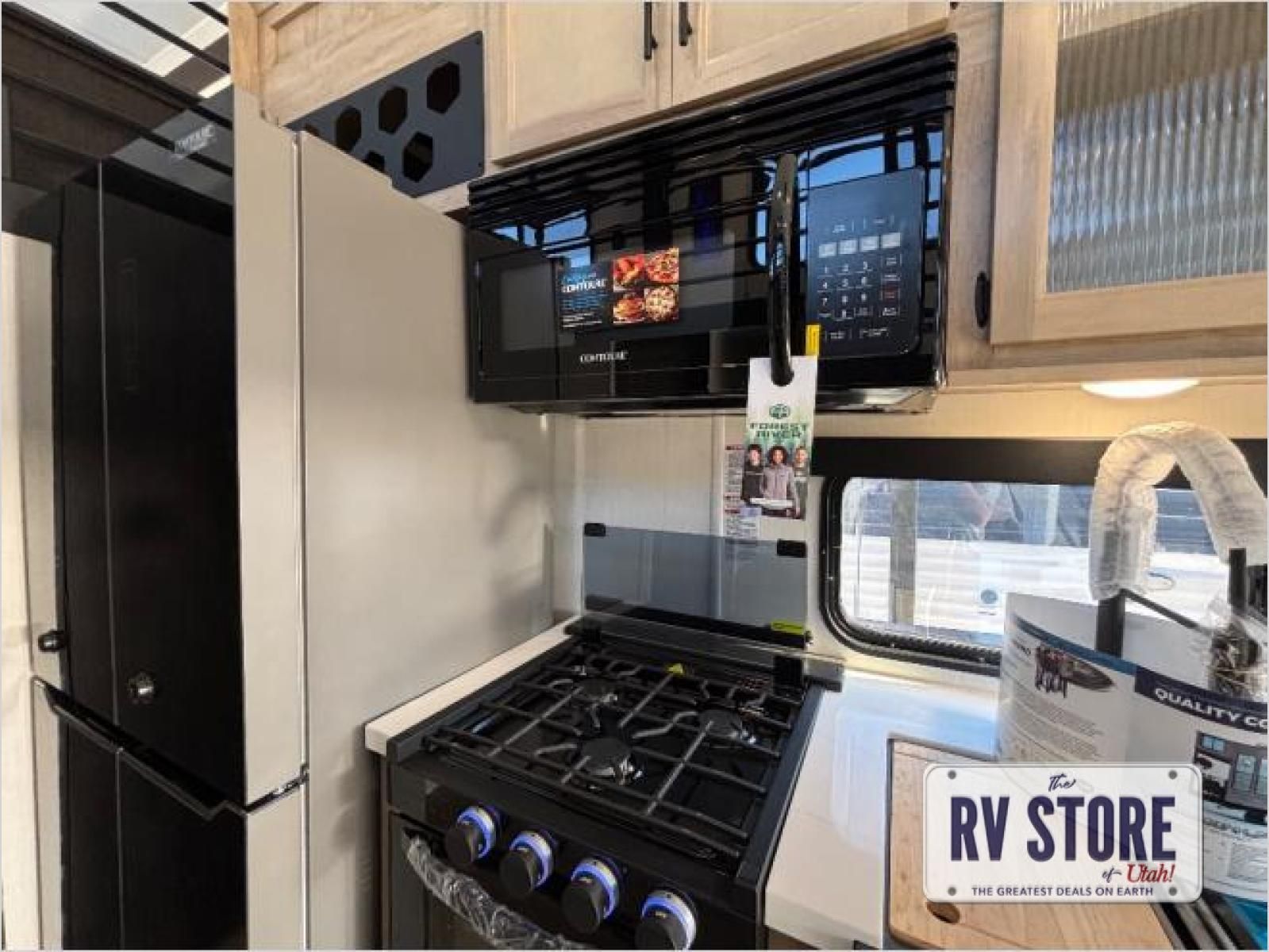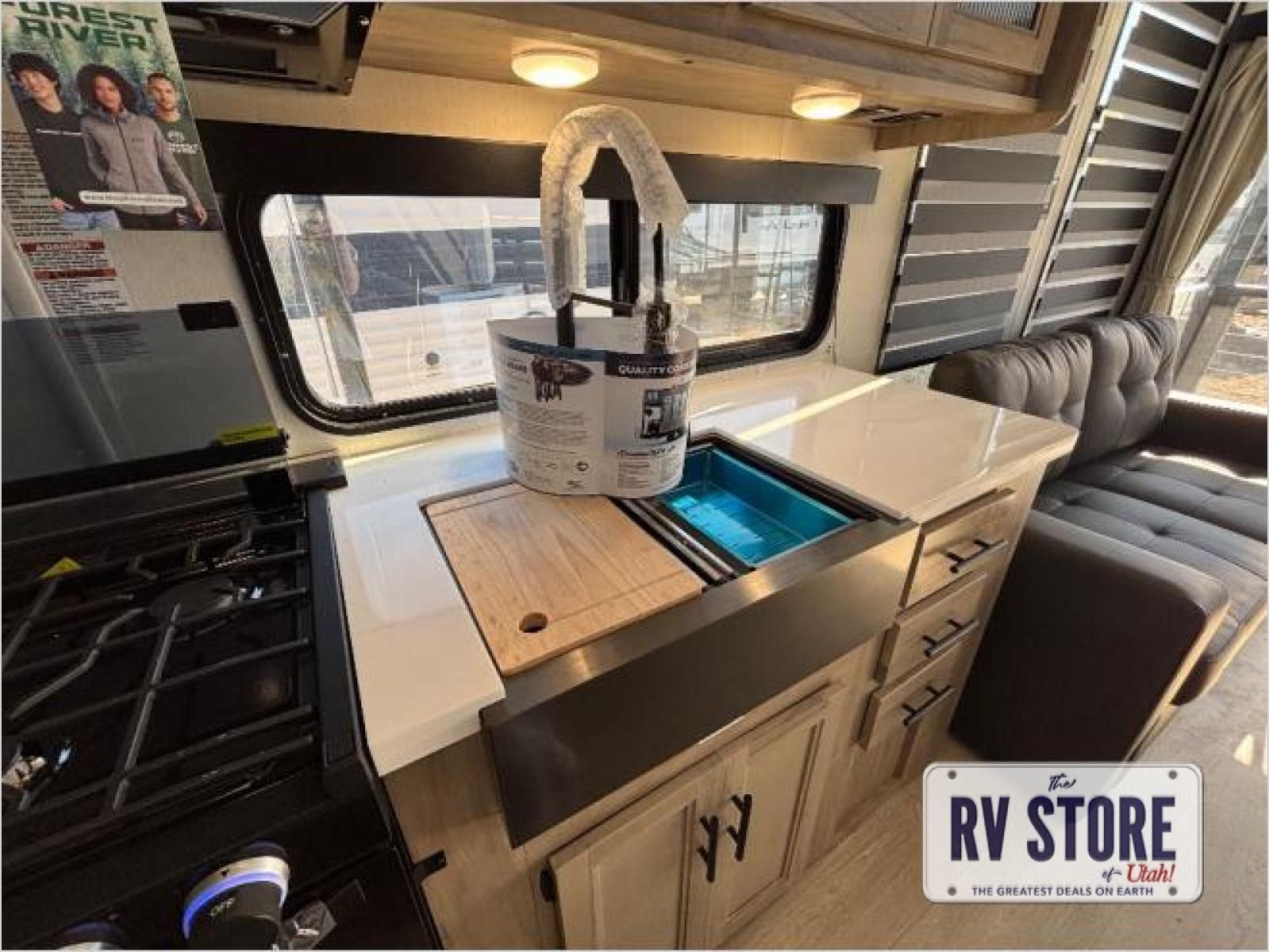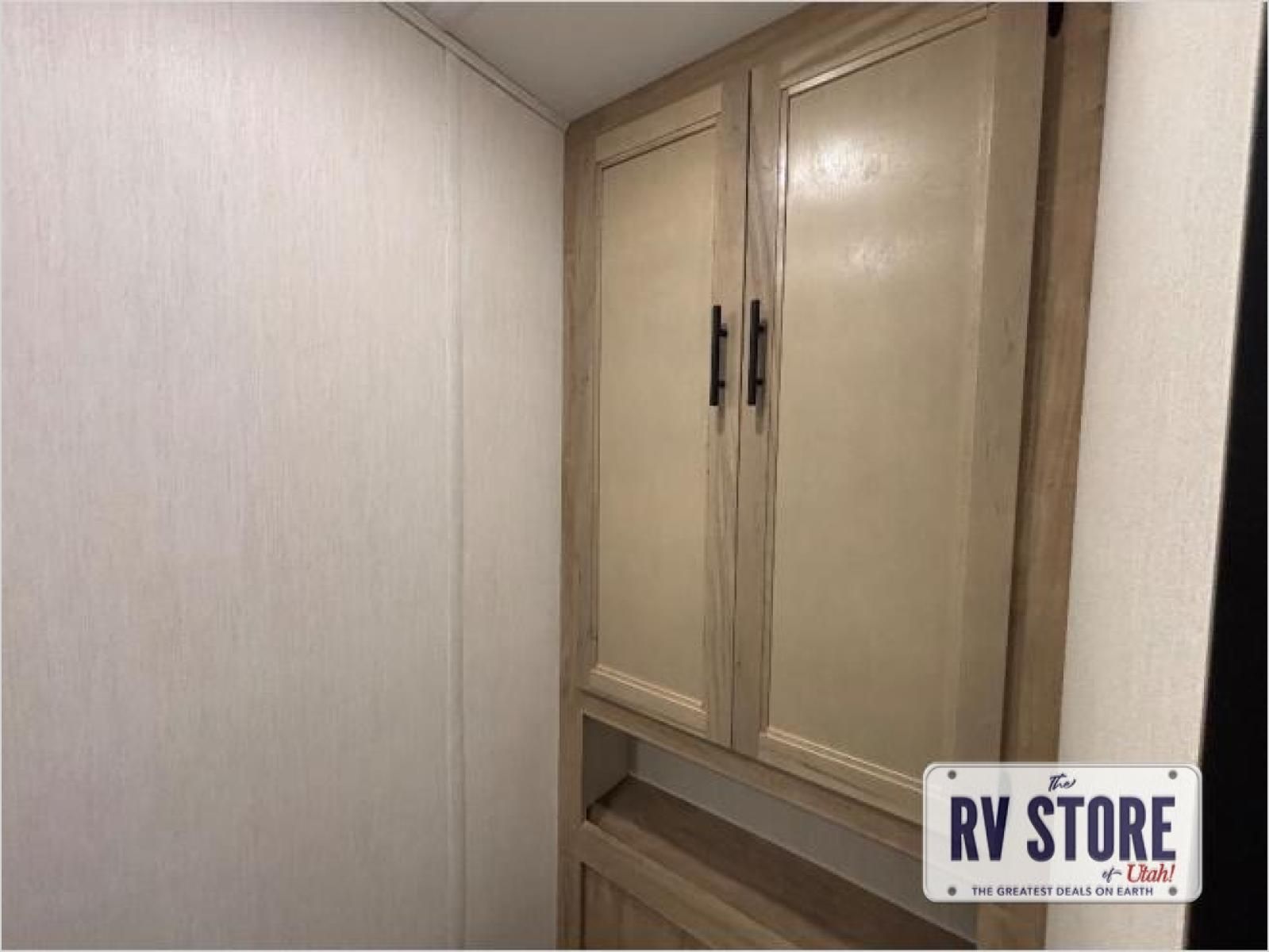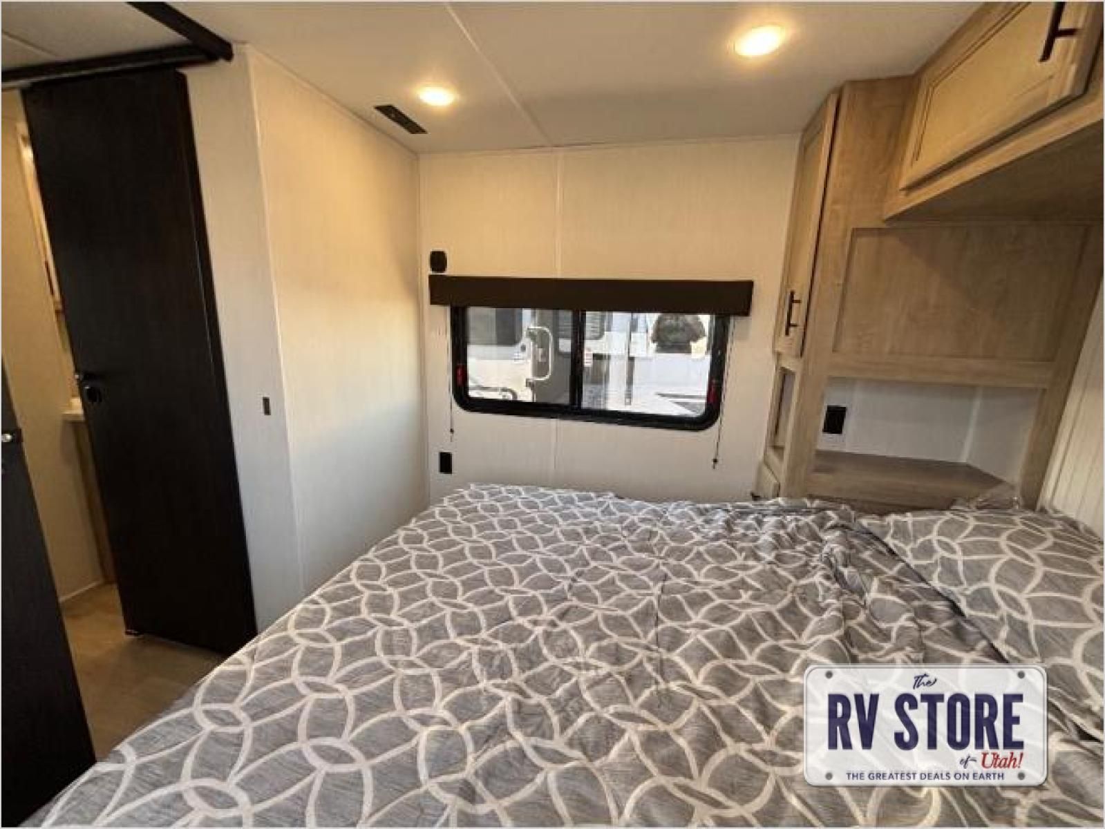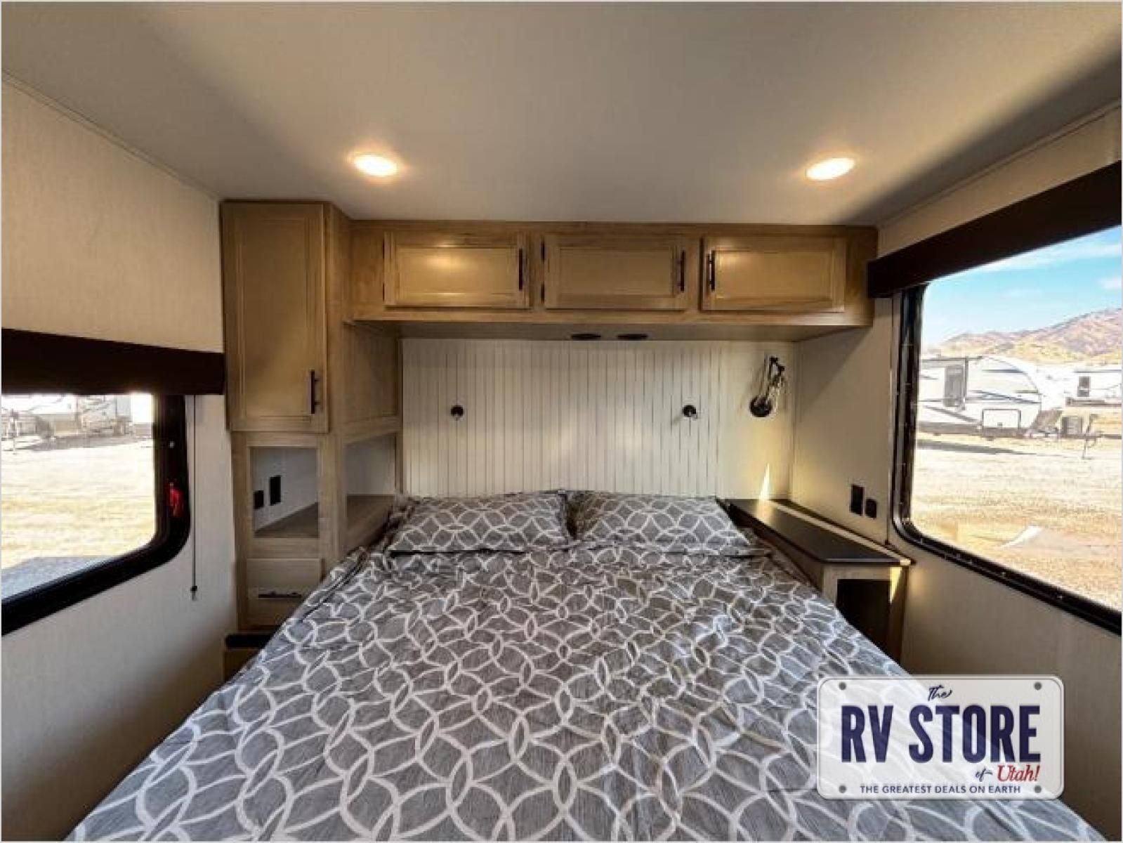 This model is similar to 16ML but larger! A bigger bathroom, RVÂ king bed in the lower master, and a queen bed plus a twin bunk mat in the front loft. And the second loft can be utilized as extra sleeping space or storage space! There is an 18 cu. ft. refrigerator so you can stock up for a week long vacation, a hide-a-bed sofa that can transform into added sleeping for guests, and a high top table with two stools to dine at. The bathroom below is split with a shower on one side, and a private toilet area and sink opposite. And the view is amazing from just about anywhere inside.