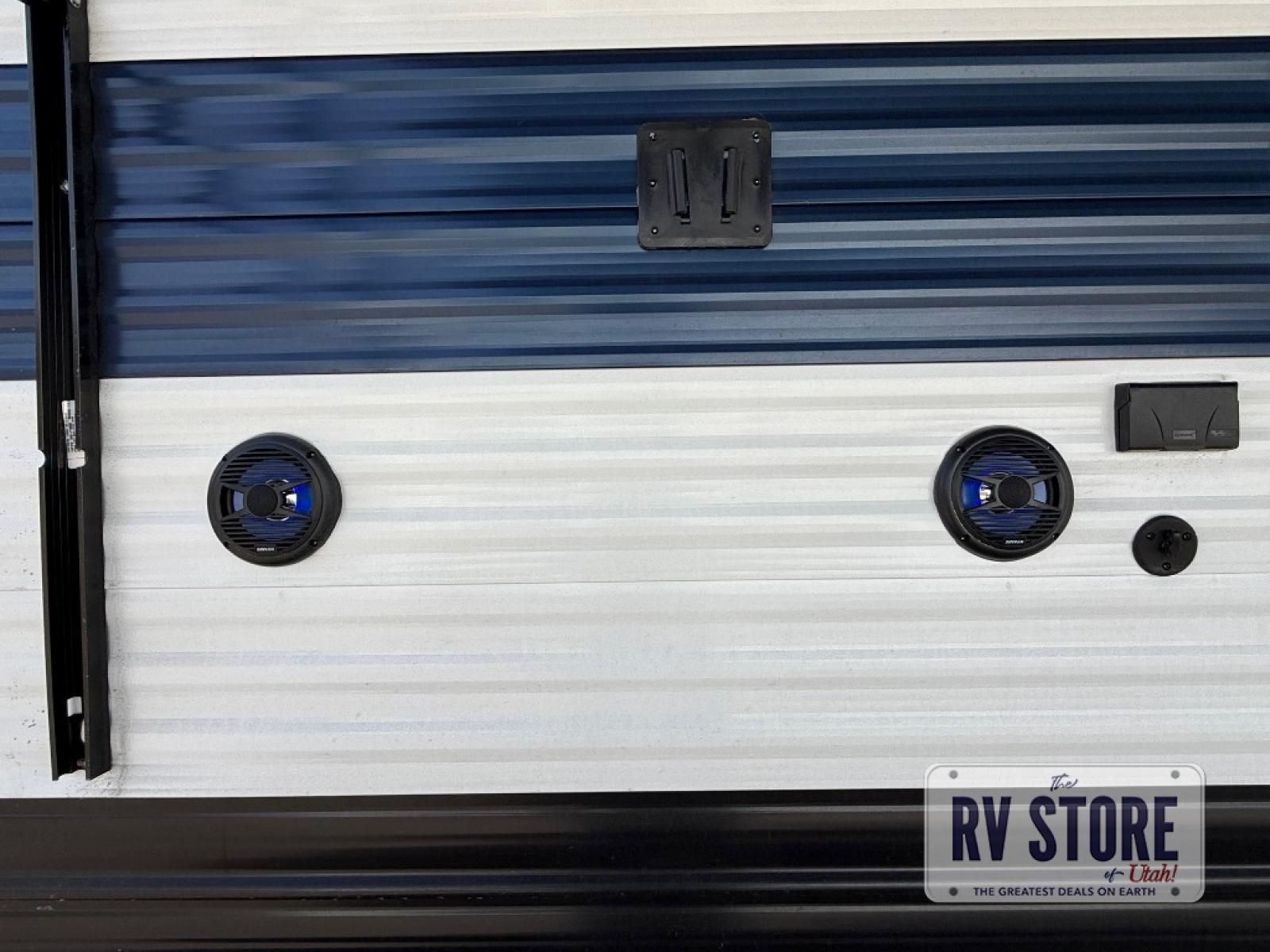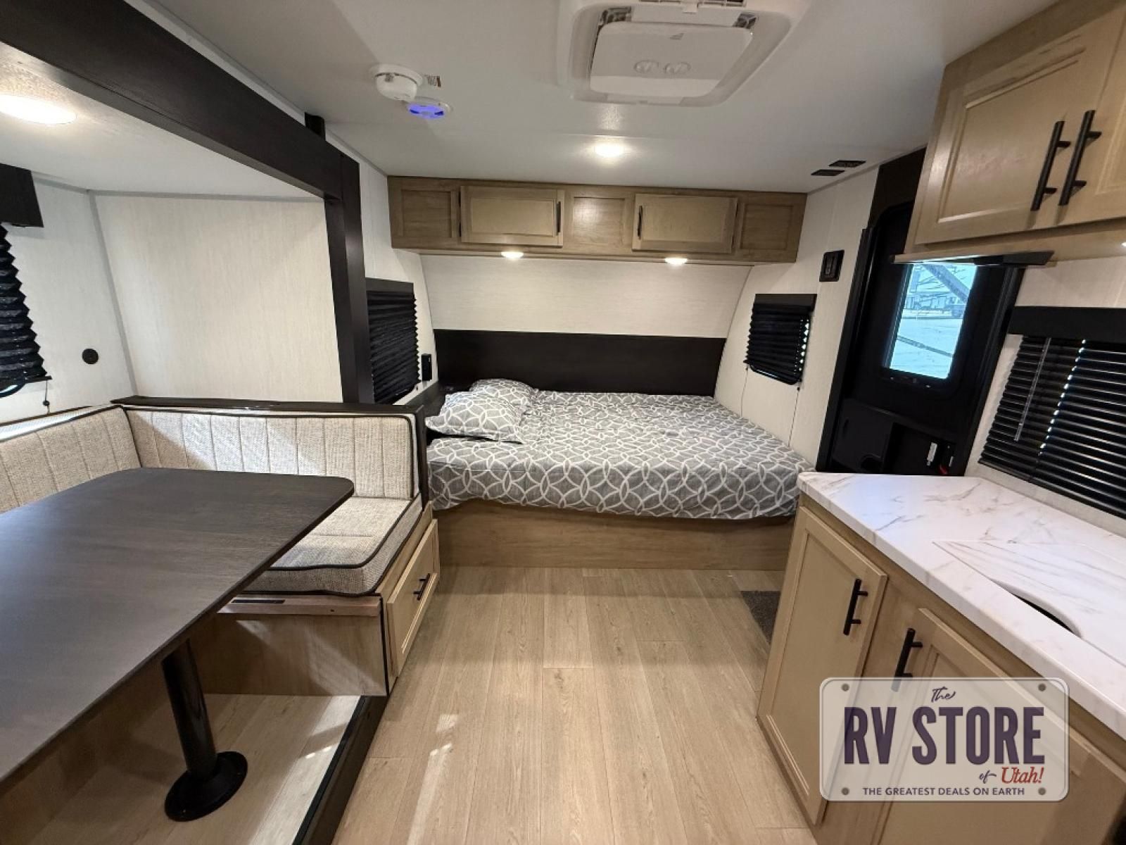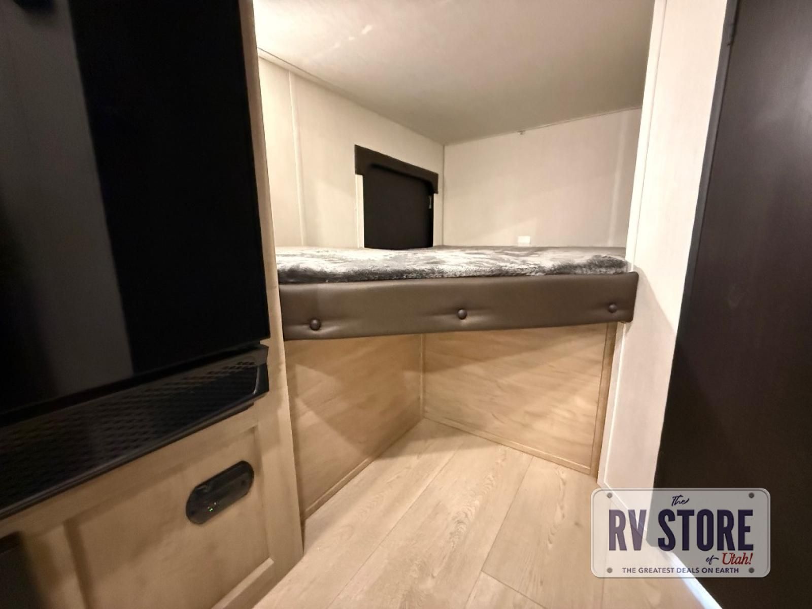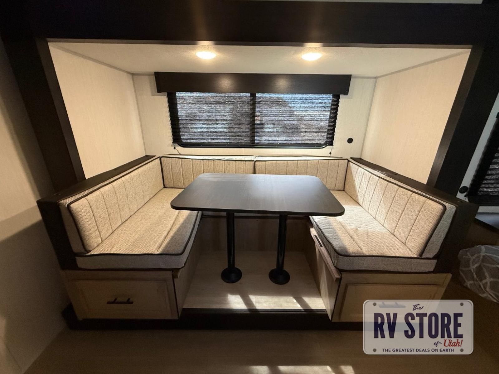 This family travel trailer is ready to head to the campground whenever you are! The kiddos can sleep on the set of double-size bed **bunks,** and you can sleep on the front queen bed, plus the U-shaped dinette slide can also transform into an extra sleeping space when you aren't using it to enjoy a meal prepared with the cooktop. You can also prepare your delicious meals at the outside mini kitchen and stay protected by the power awning. The exterior not only has outside storage and an outside TV mount but also features an outside storage plus door for access to the storage space underneath the bottom bunk bed. The rear corner bath allows everyone to stay clean and refreshed while you camp.