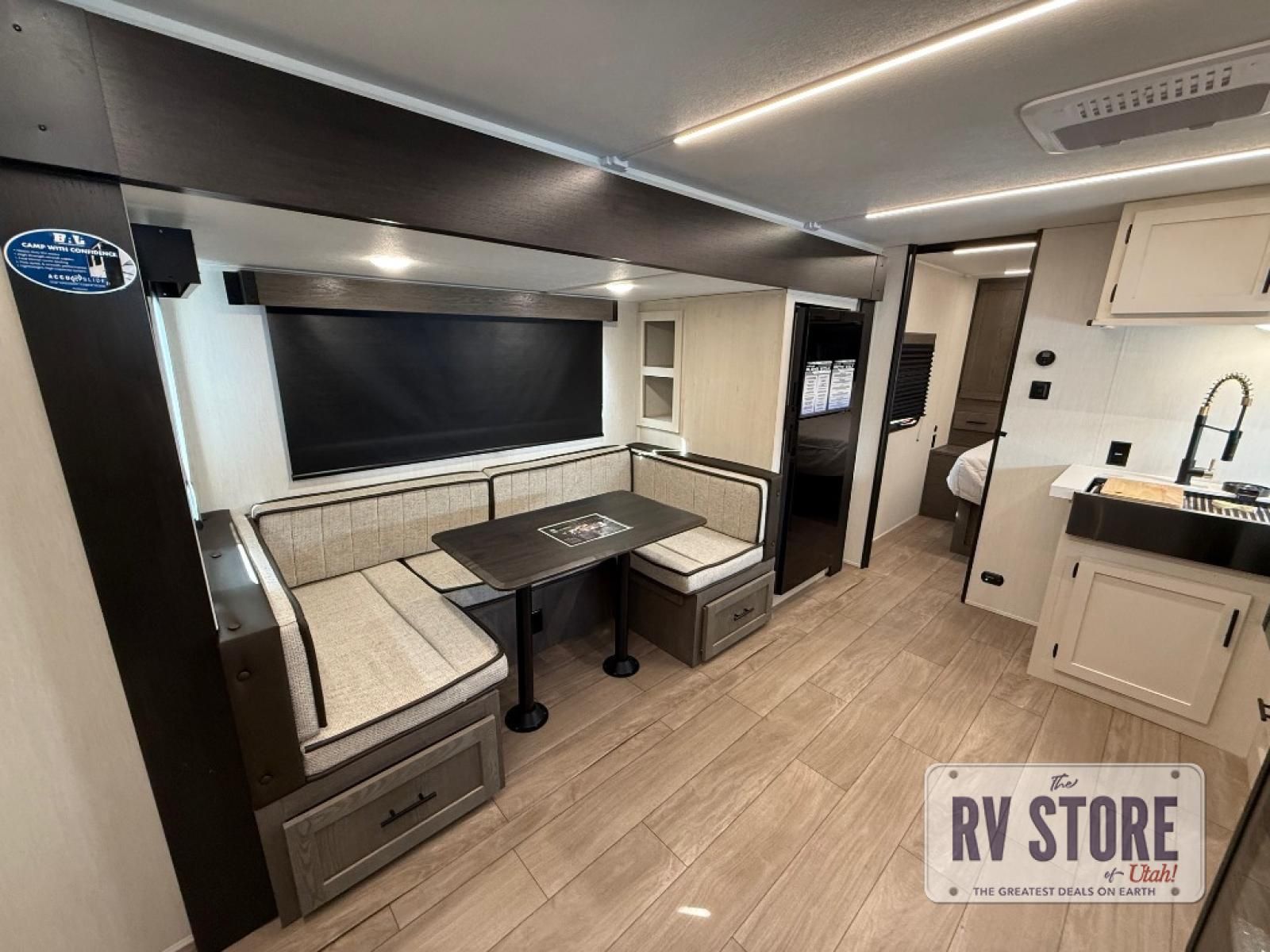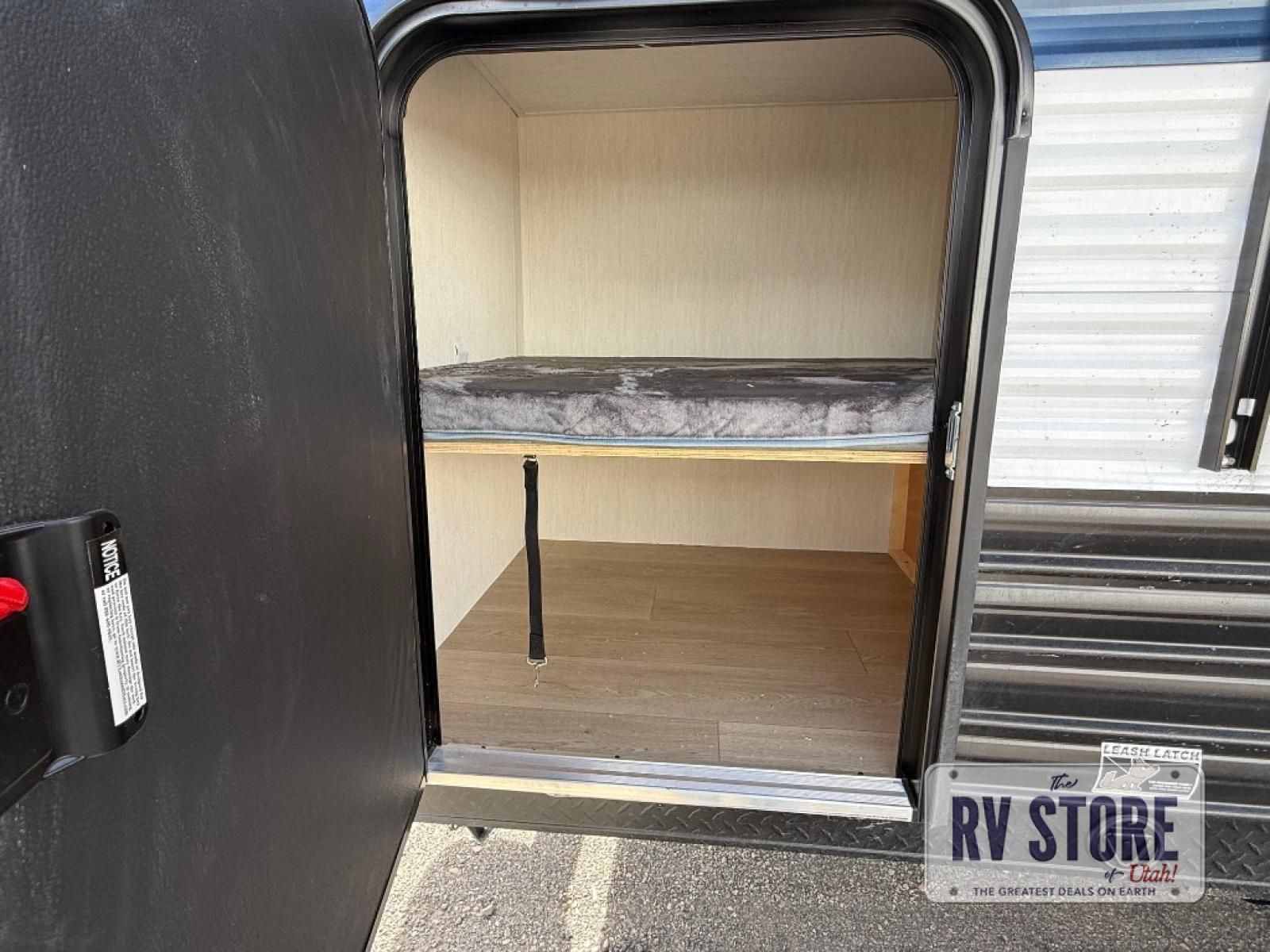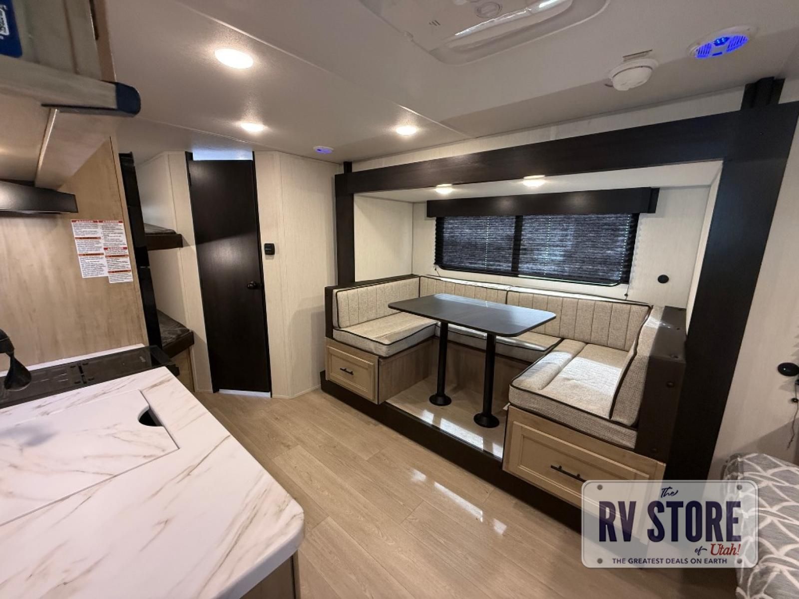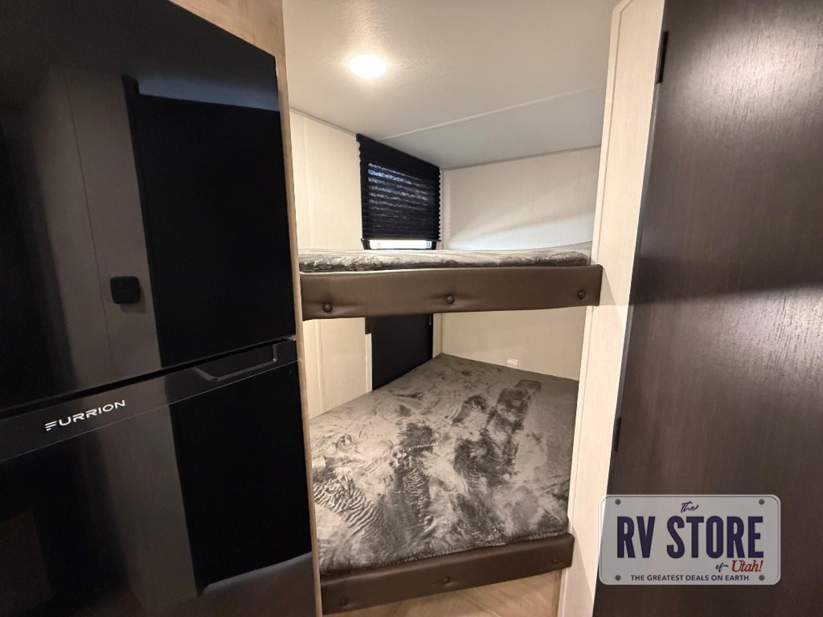 This family travel trailer is ready to head to the campground whenever you are! The kiddos can sleep on the set of double-size bed **bunks,** and you can sleep on the front queen bed, plus the U-shaped dinette slide can also transform into an extra sleeping space when you aren't using it to enjoy a meal prepared with the cooktop. You can also prepare your delicious meals at the outside mini kitchen and stay protected by the power awning. The exterior not only has outside storage and an outside TV mount but also features an outside storage plus door for access to the storage space underneath the bottom bunk bed. The rear corner bath allows everyone to stay clean and refreshed while you camp.