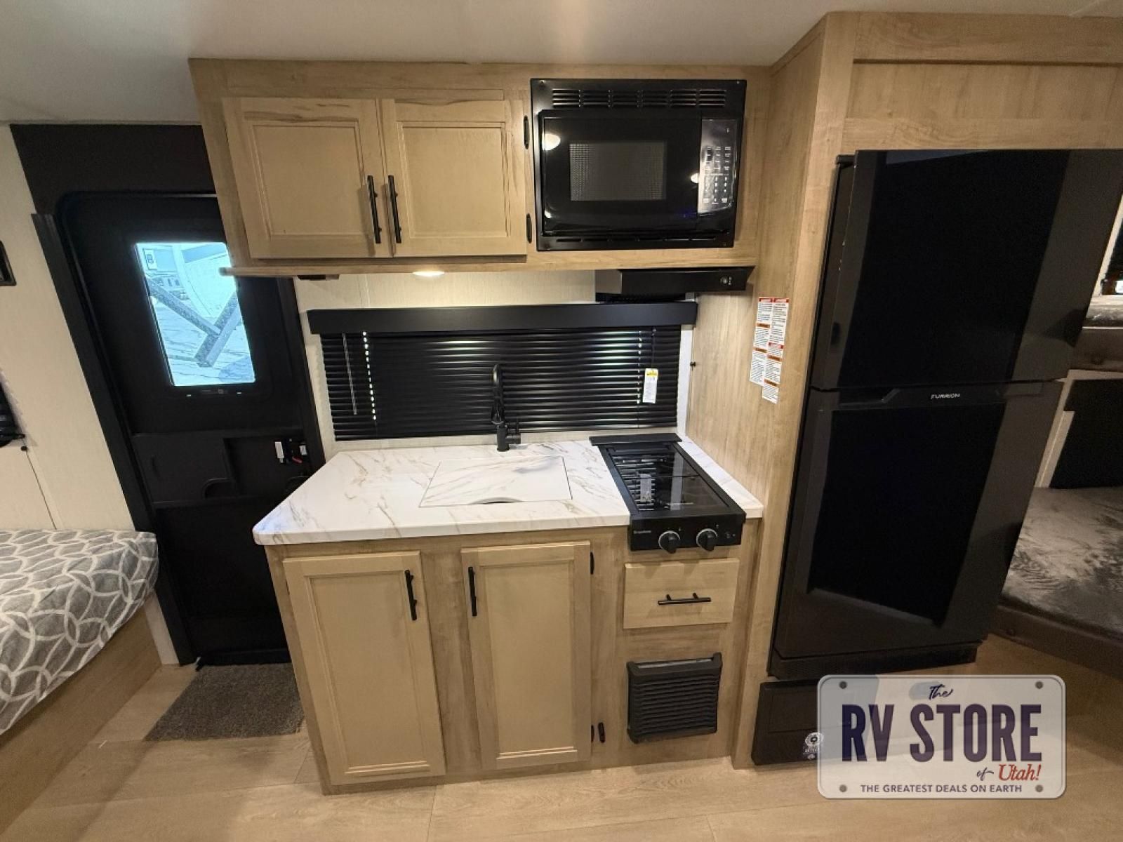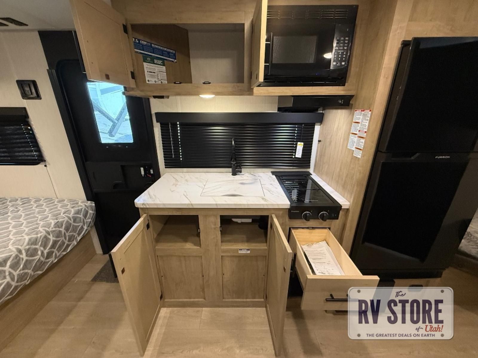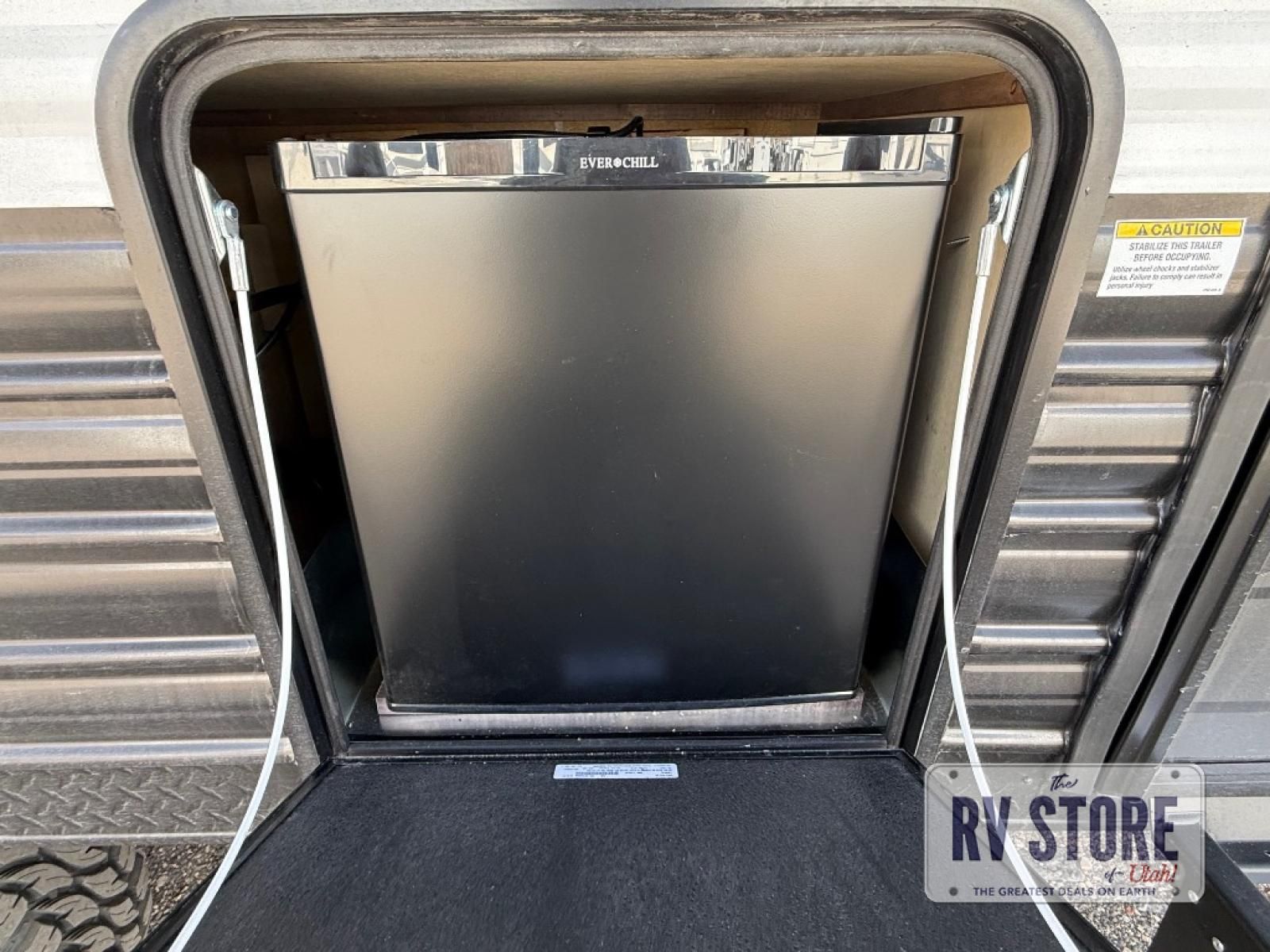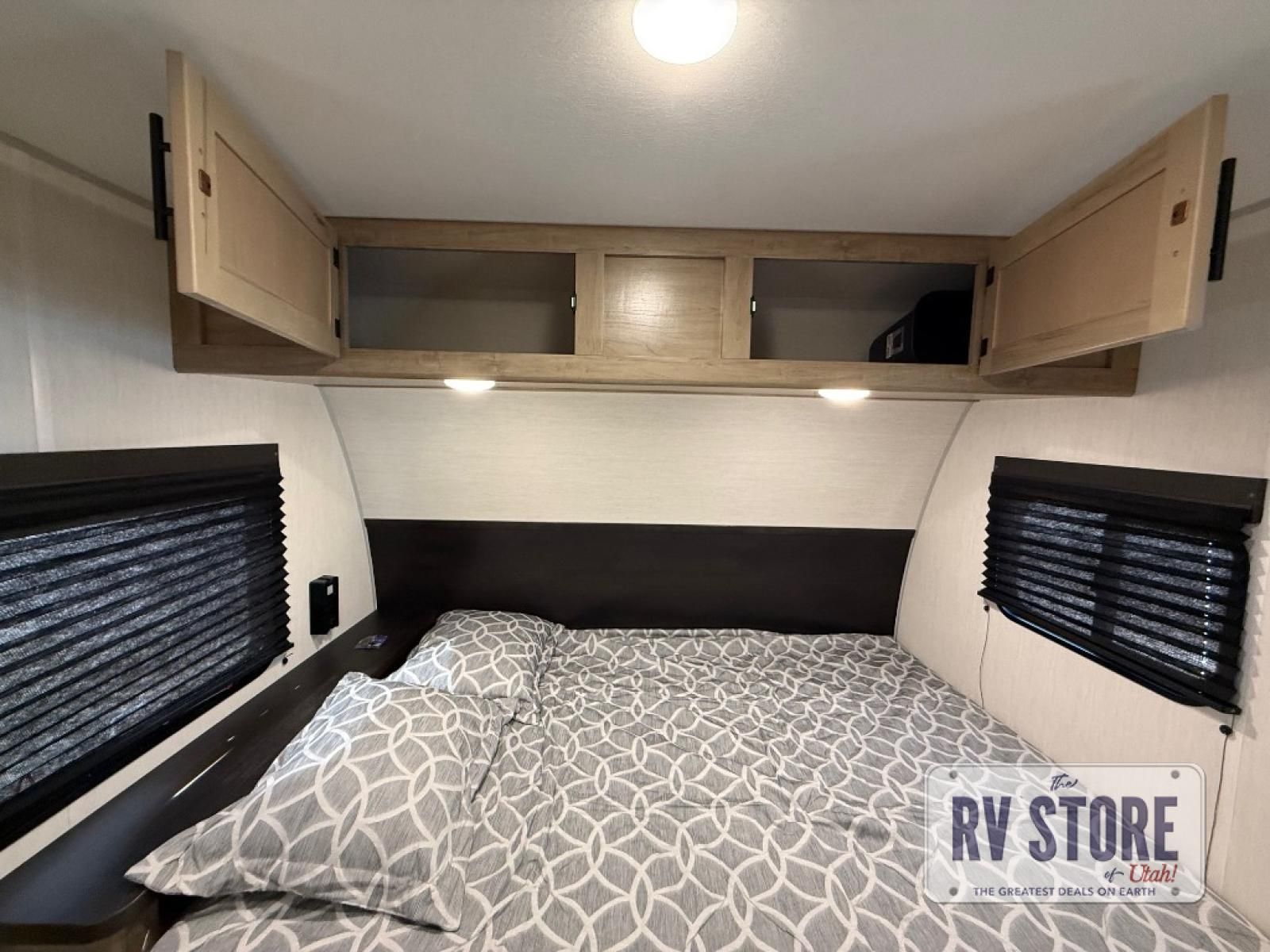 This family travel trailer is ready to head to the campground whenever you are! The kiddos can sleep on the set of double-size bed **bunks,** and you can sleep on the front queen bed, plus the U-shaped dinette slide can also transform into an extra sleeping space when you aren't using it to enjoy a meal prepared with the cooktop. You can also prepare your delicious meals at the outside mini kitchen and stay protected by the power awning. The exterior not only has outside storage and an outside TV mount but also features an outside storage plus door for access to the storage space underneath the bottom bunk bed. The rear corner bath allows everyone to stay clean and refreshed while you camp.