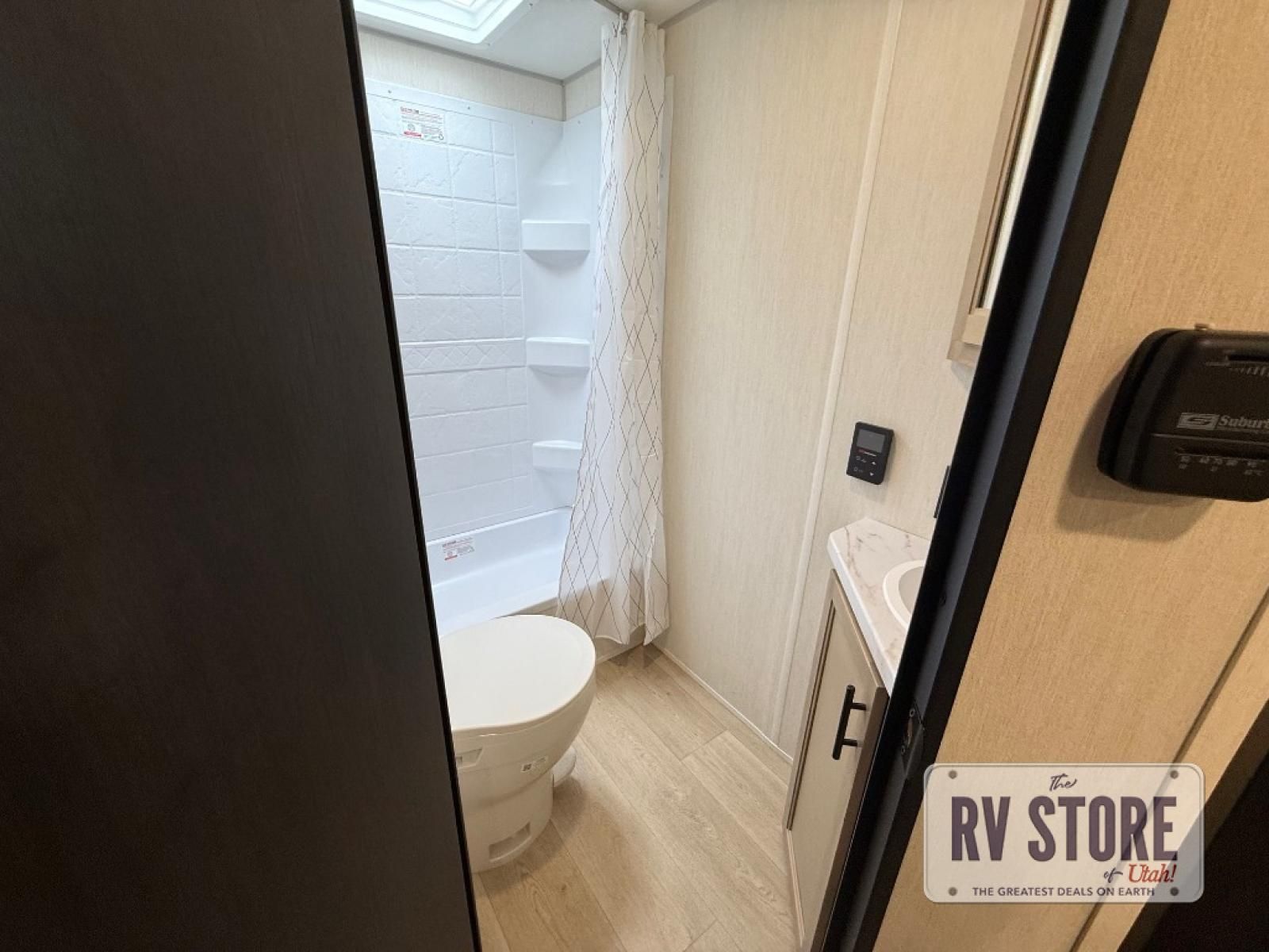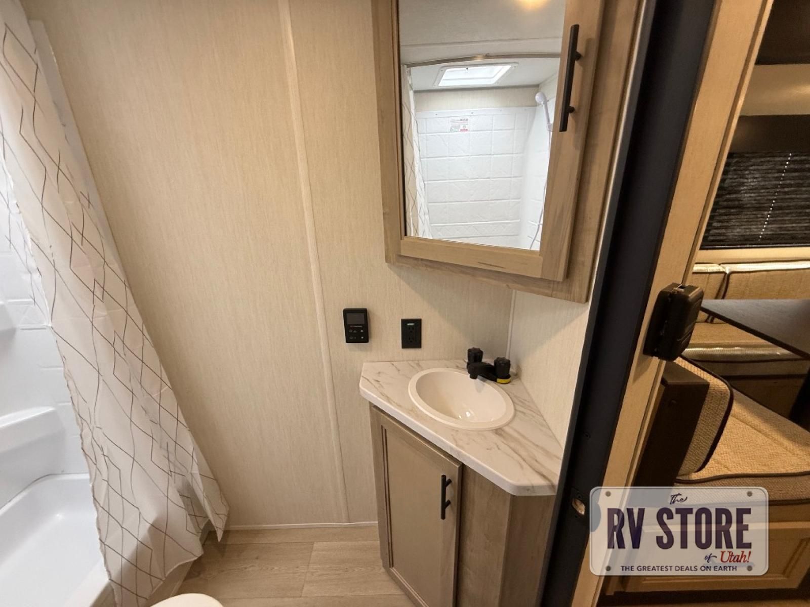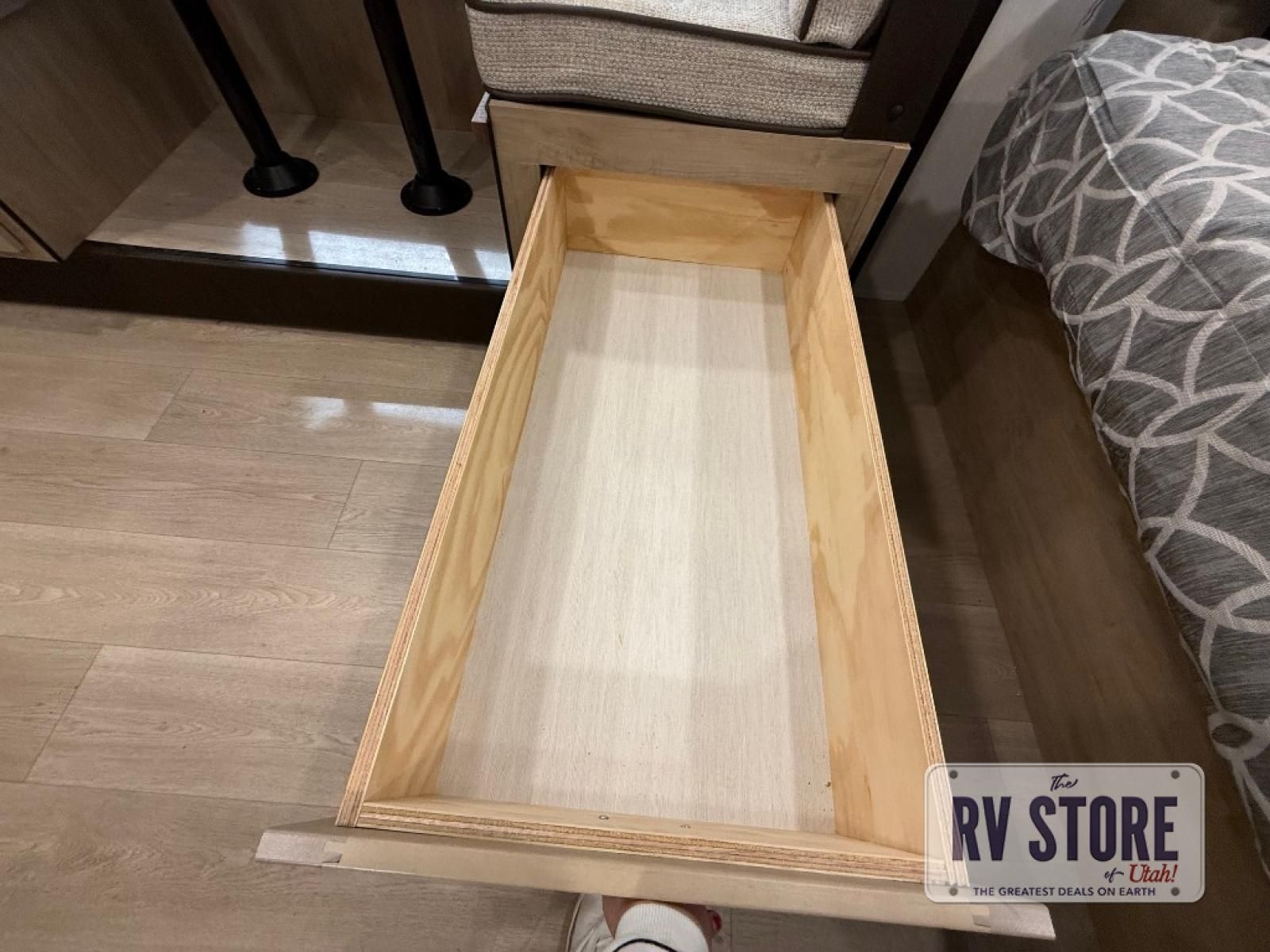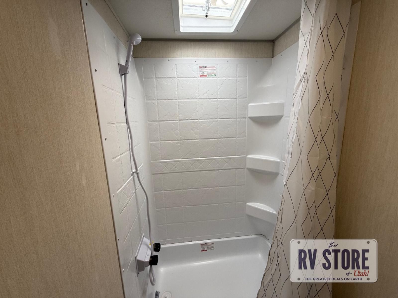 This family travel trailer is ready to head to the campground whenever you are! The kiddos can sleep on the set of double-size bed **bunks,** and you can sleep on the front queen bed, plus the U-shaped dinette slide can also transform into an extra sleeping space when you aren't using it to enjoy a meal prepared with the cooktop. You can also prepare your delicious meals at the outside mini kitchen and stay protected by the power awning. The exterior not only has outside storage and an outside TV mount but also features an outside storage plus door for access to the storage space underneath the bottom bunk bed. The rear corner bath allows everyone to stay clean and refreshed while you camp.