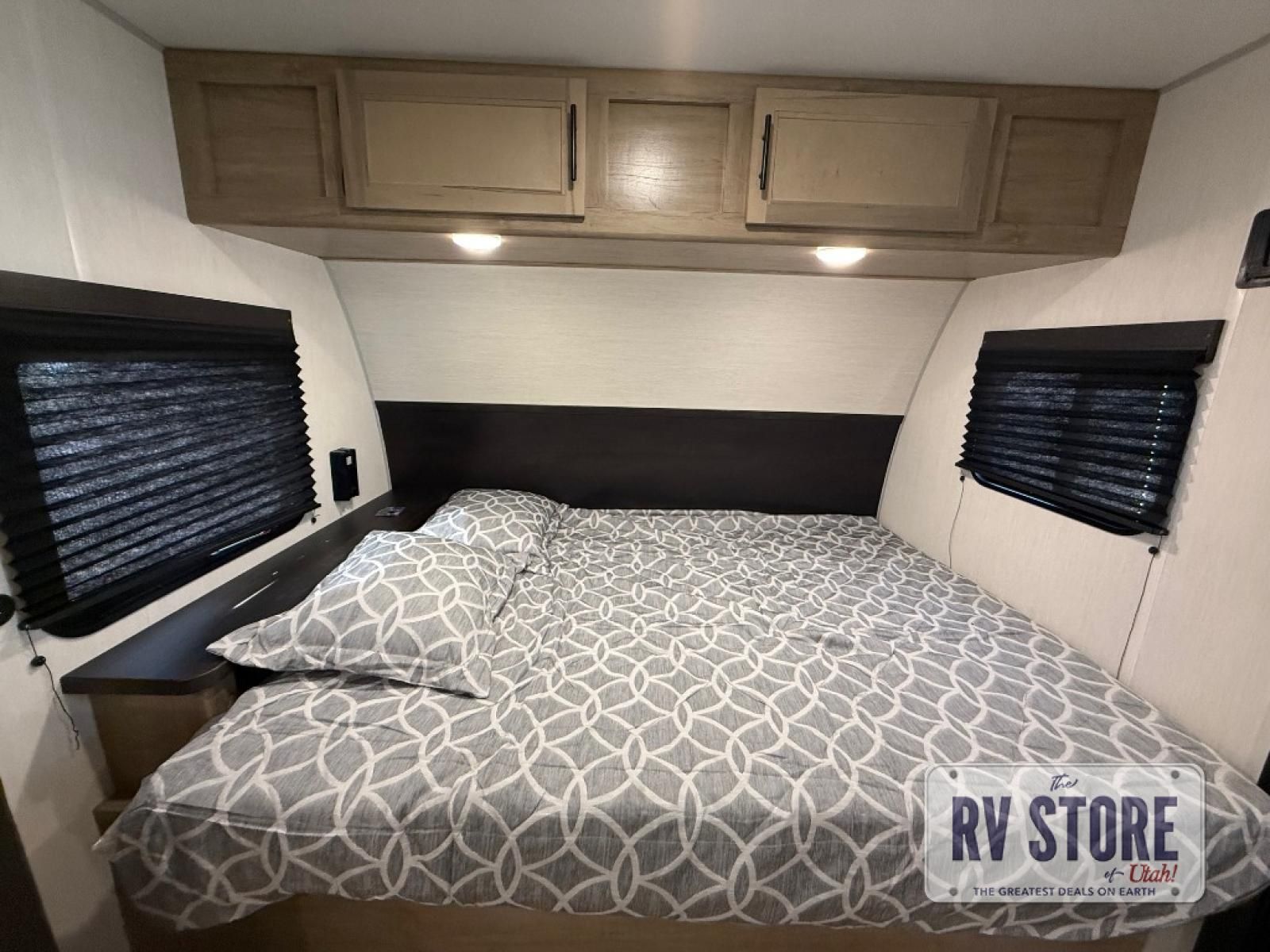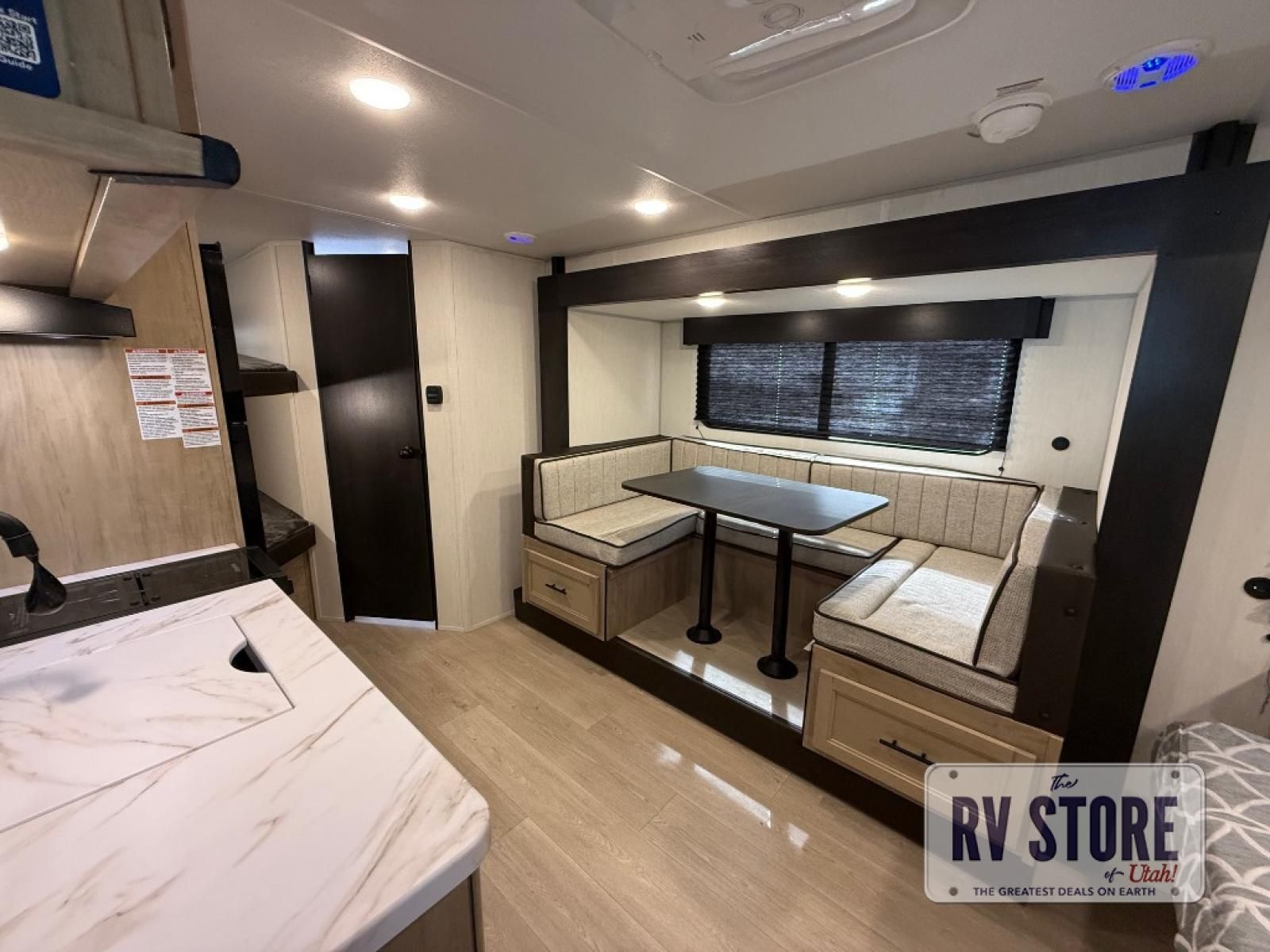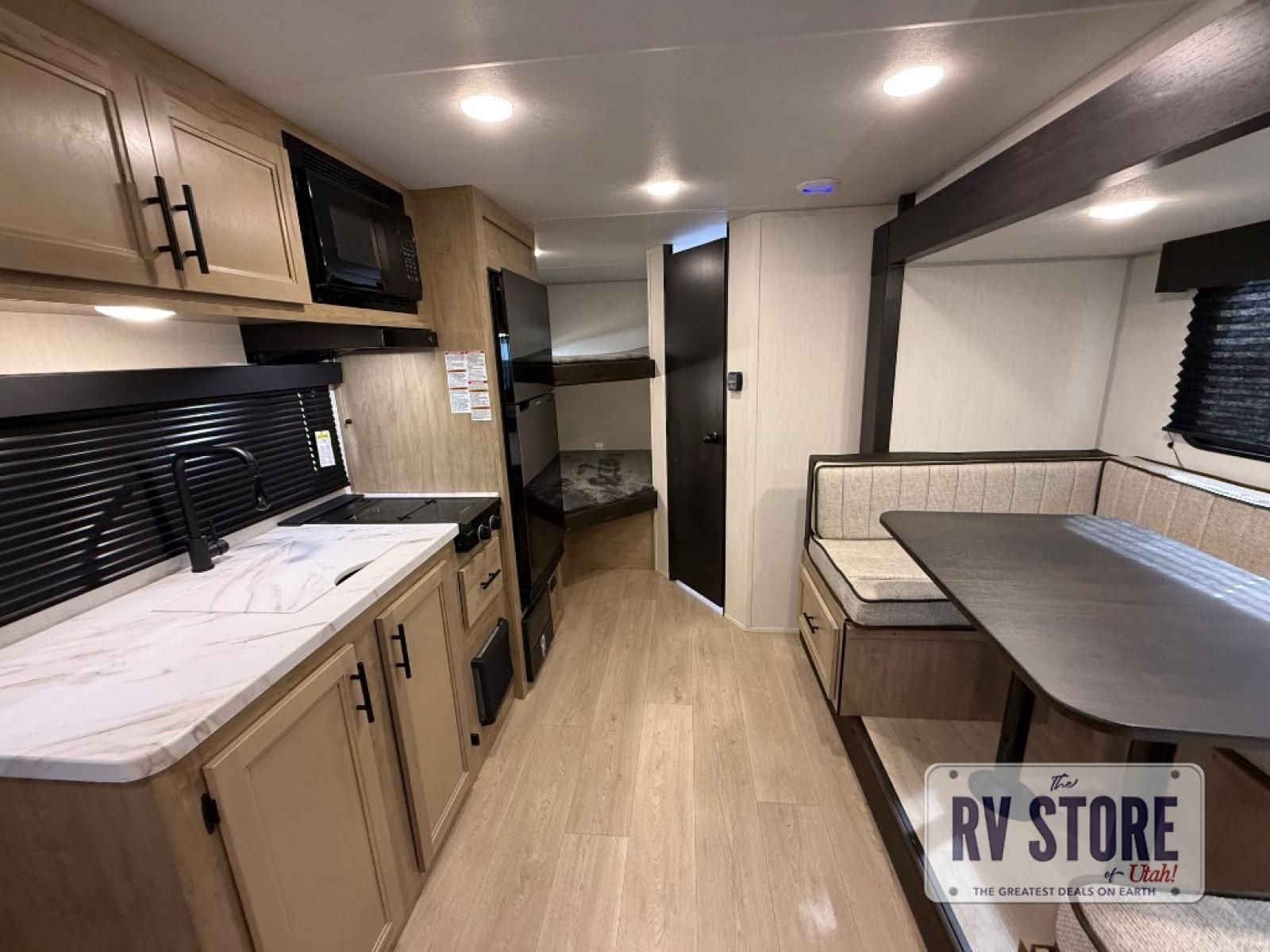 This family travel trailer is ready to head to the campground whenever you are! The kiddos can sleep on the set of double-size bed bunks, and you can sleep on the front queen bed, plus the U-shaped dinette slide can also transform into an extra sleeping space when you aren't using it to enjoy a meal prepared with the cooktop. You can also prepare your delicious meals at the outside mini kitchen and stay protected by the power awning. The exterior not only has outside storage and an outside TV mount but also features an outside storage plus door for access to the storage space underneath the bottom bunk bed. The rear corner bath allows everyone to stay clean and refreshed while you camp.