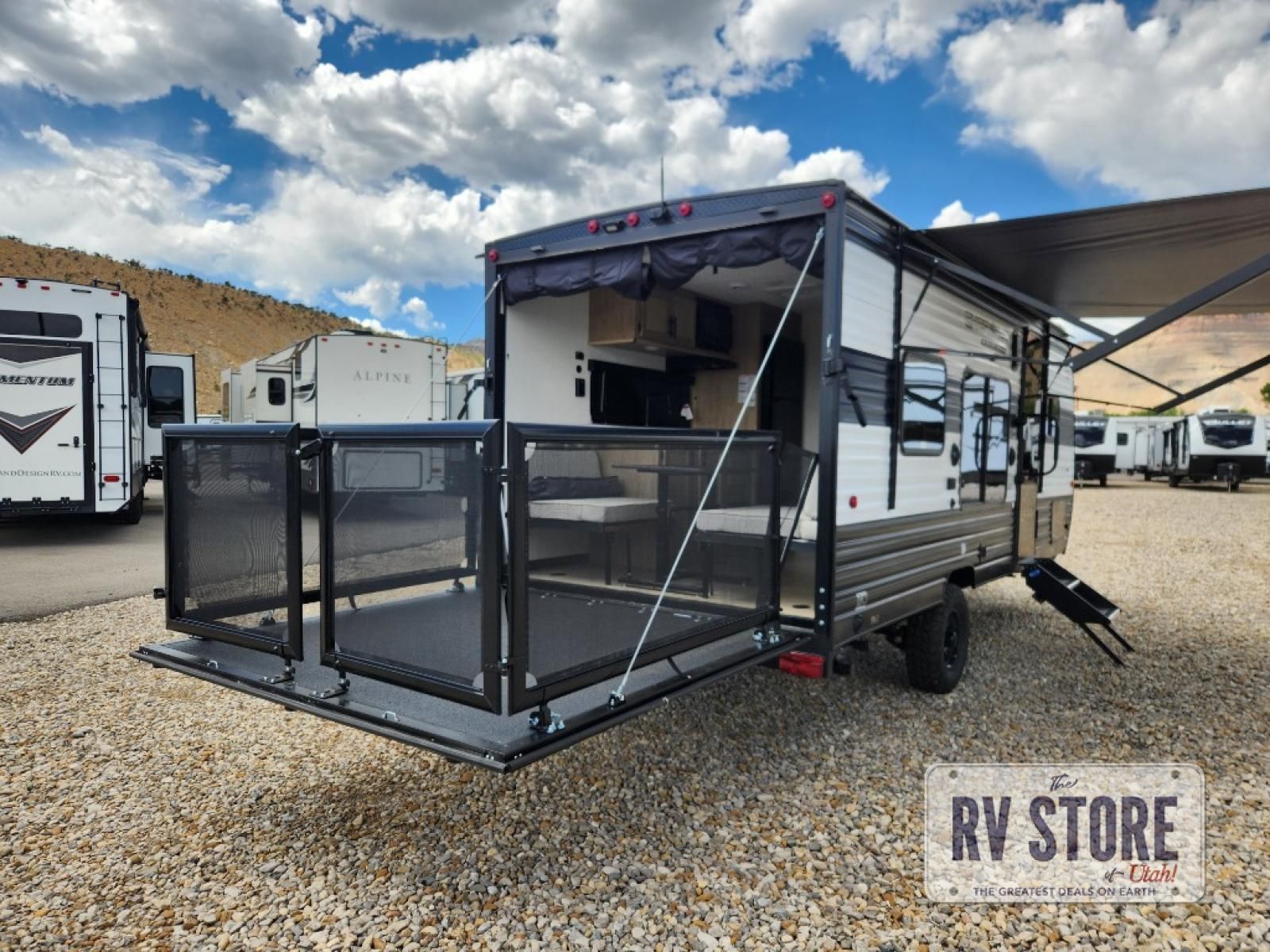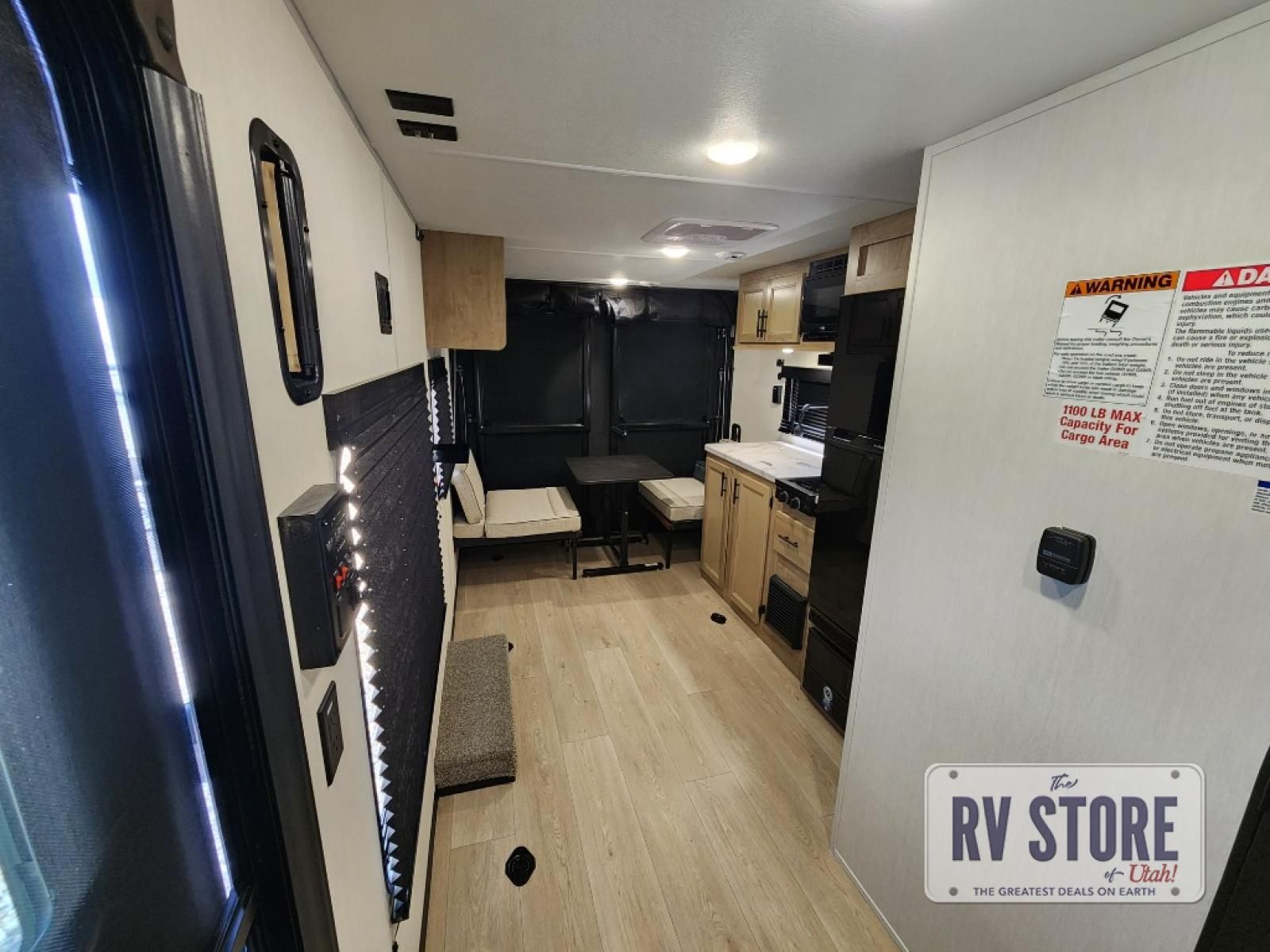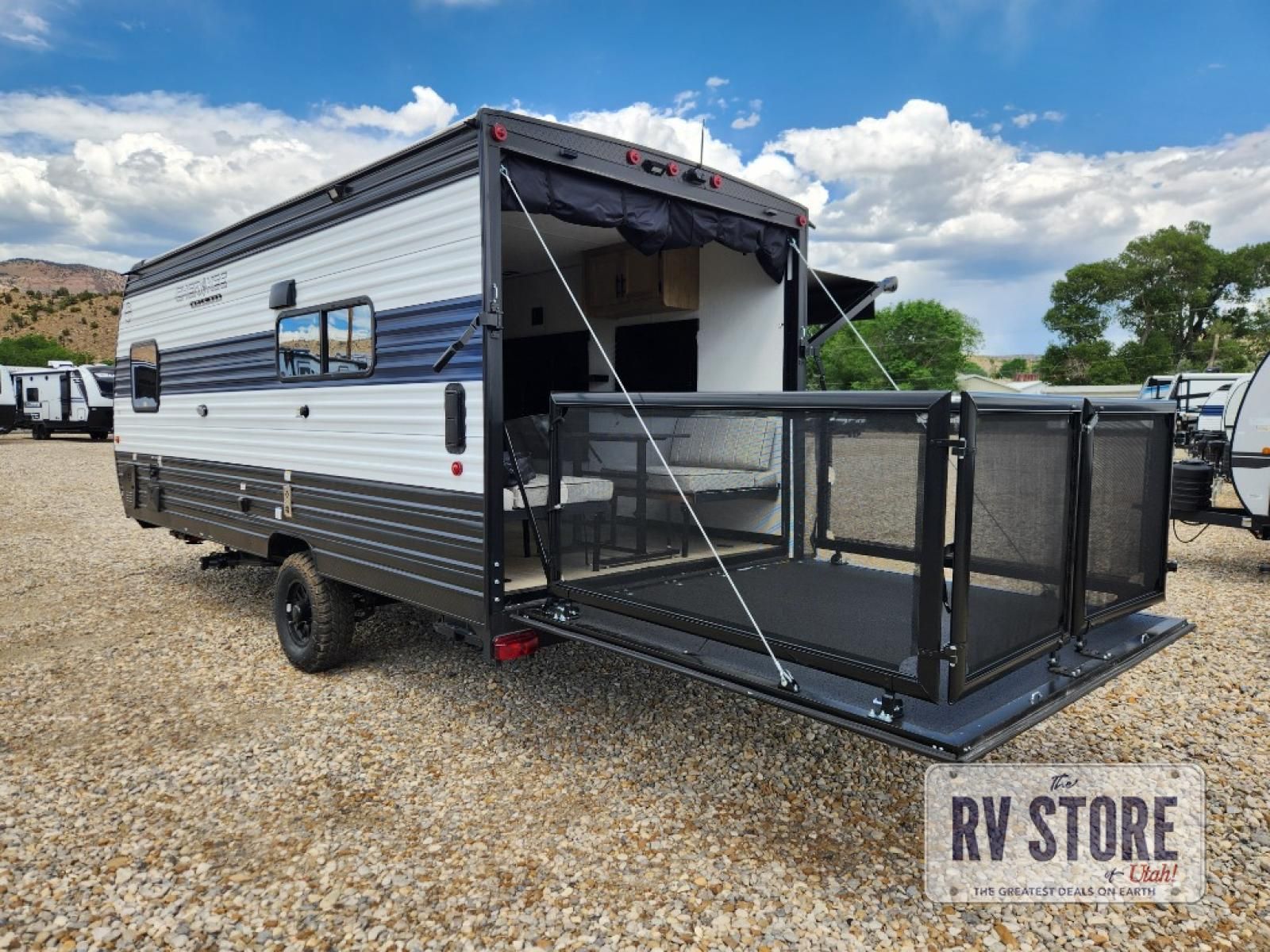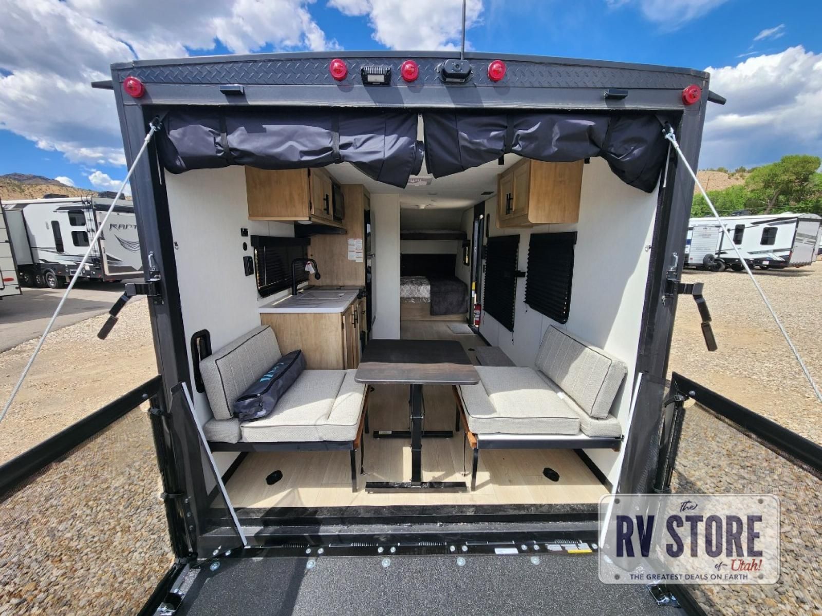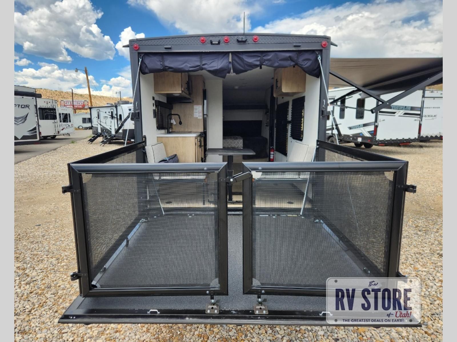 Sleeping for five and up to 13' 11" for your toys makes for an exciting adventure. The rear ramp door makes it easy to load and unload your toys, and once you are camped and the toys are removed, you can set up the dinette in back with removeable table. At night, this can double as sleeping space for two more tired campers. Up front, a queen bed with bunk above, plus storage. A tub/shower will keep everyone feeling their best, and the modern chef's kitchen will allow you to keep everyone fueled and ready for fun! There is a inside and outside TV mount so you can choose where to put a television if you add one. There is also outside storage up front and a 12' awning for added living space outside to enjoy. Â