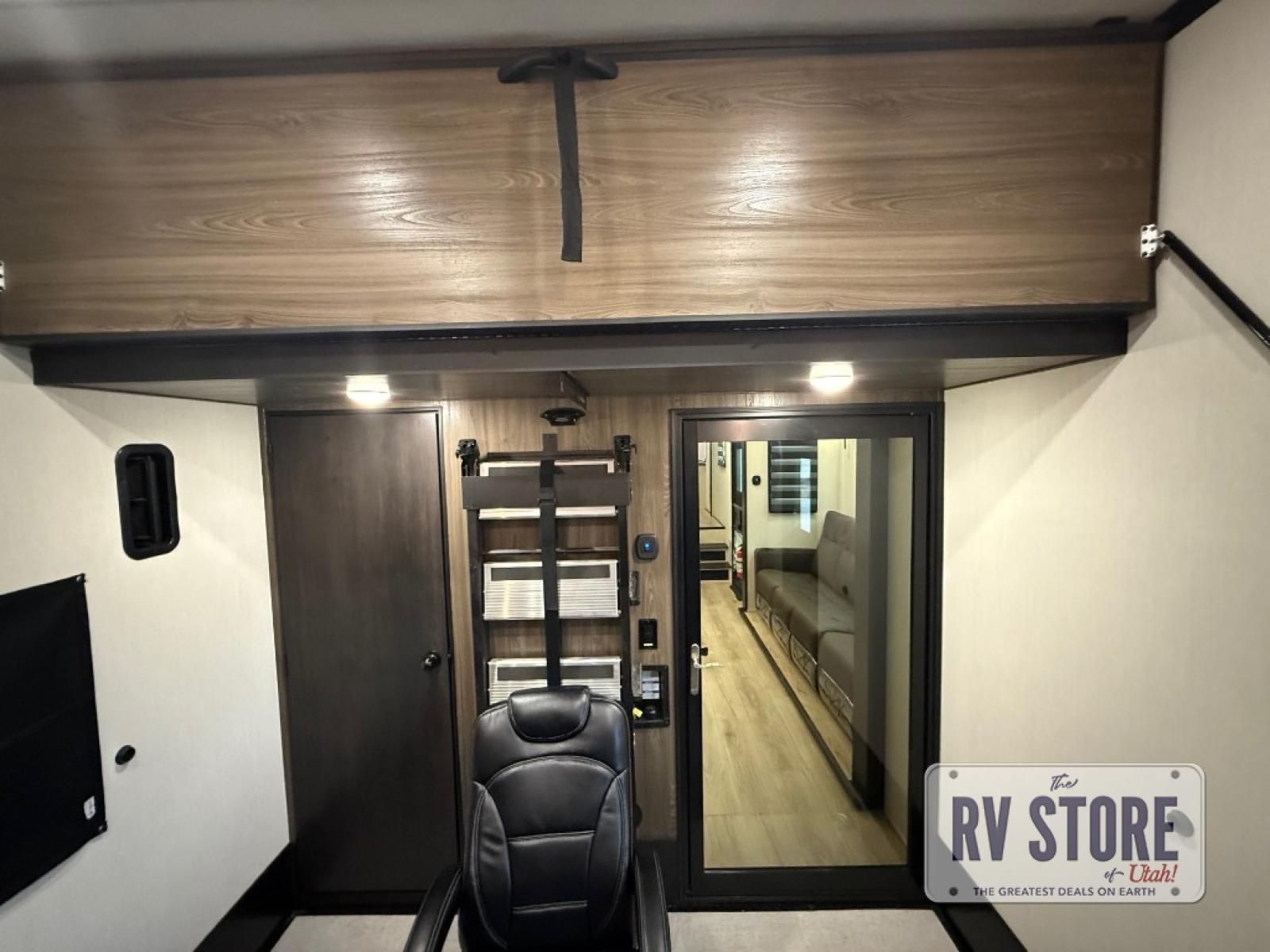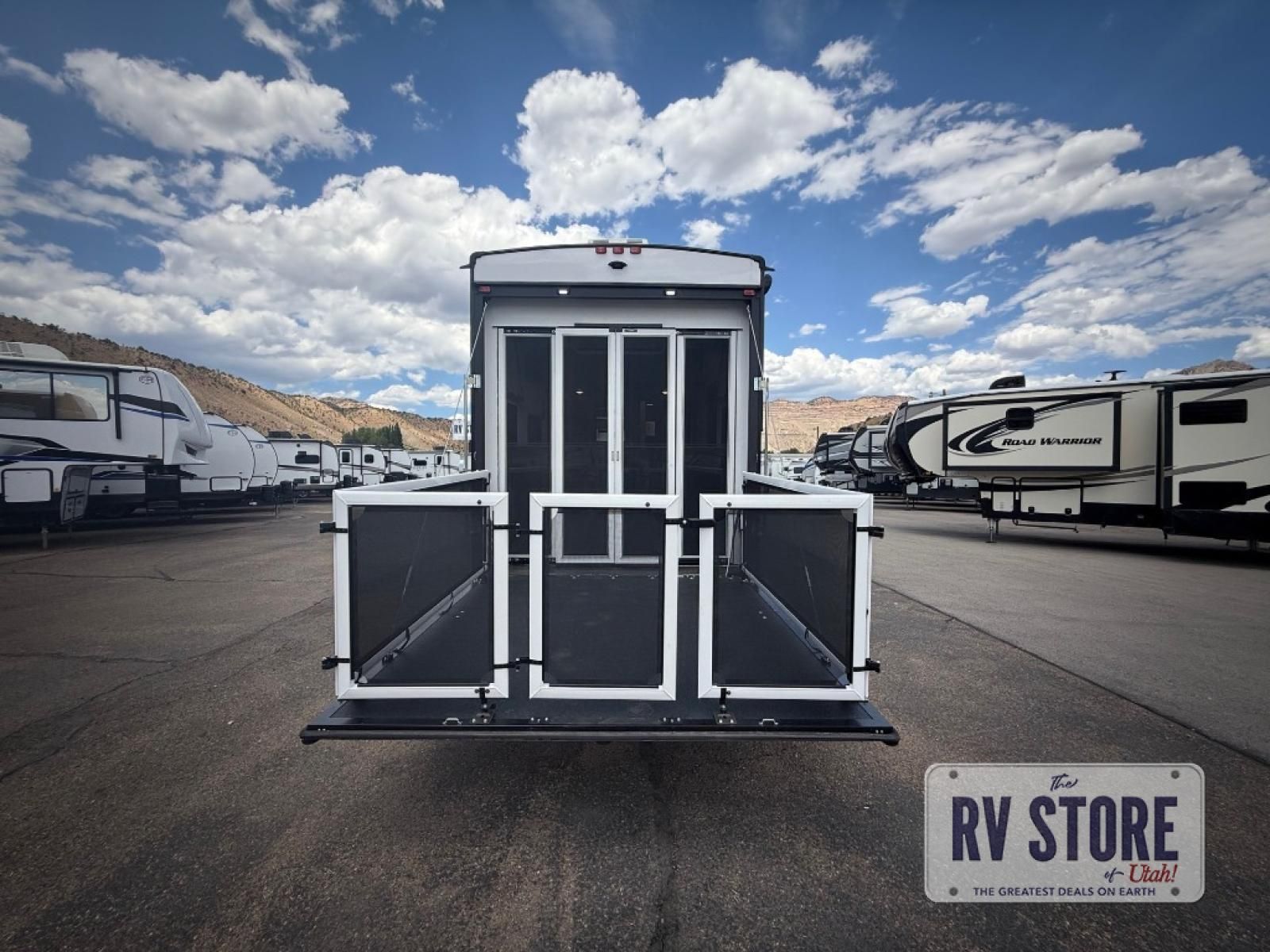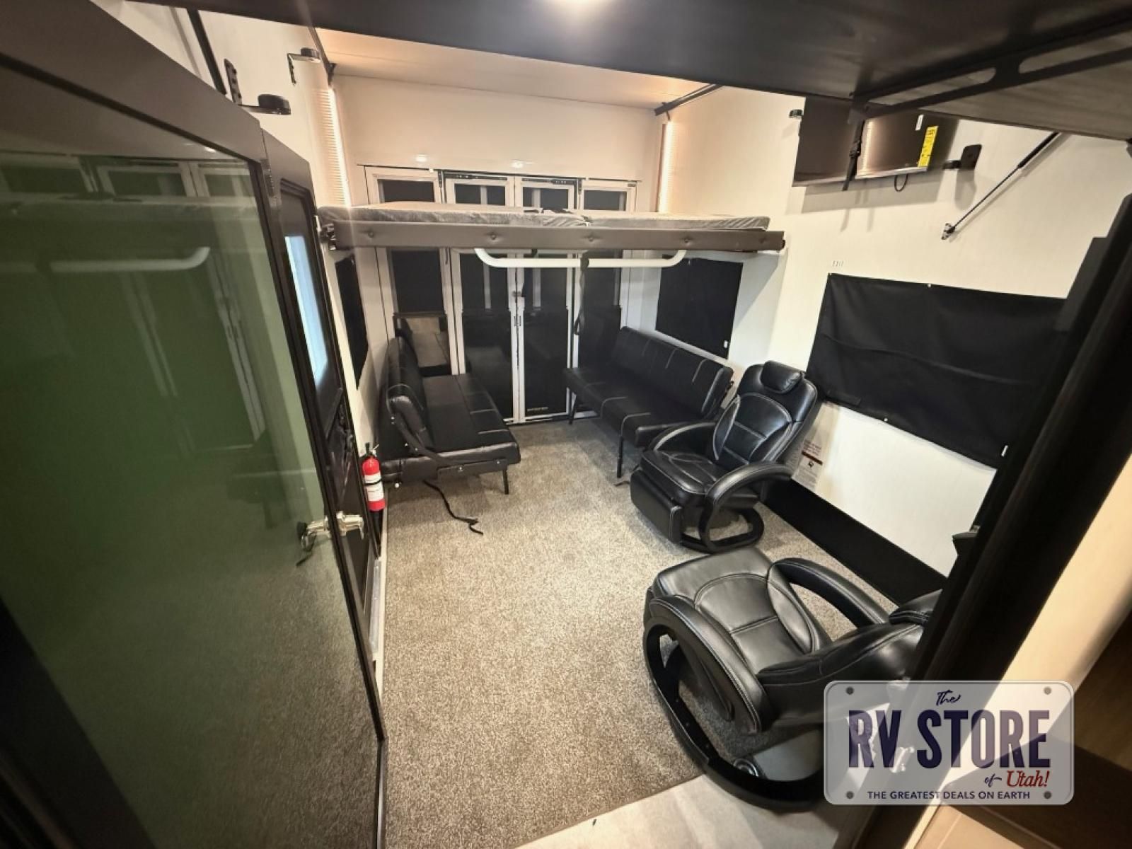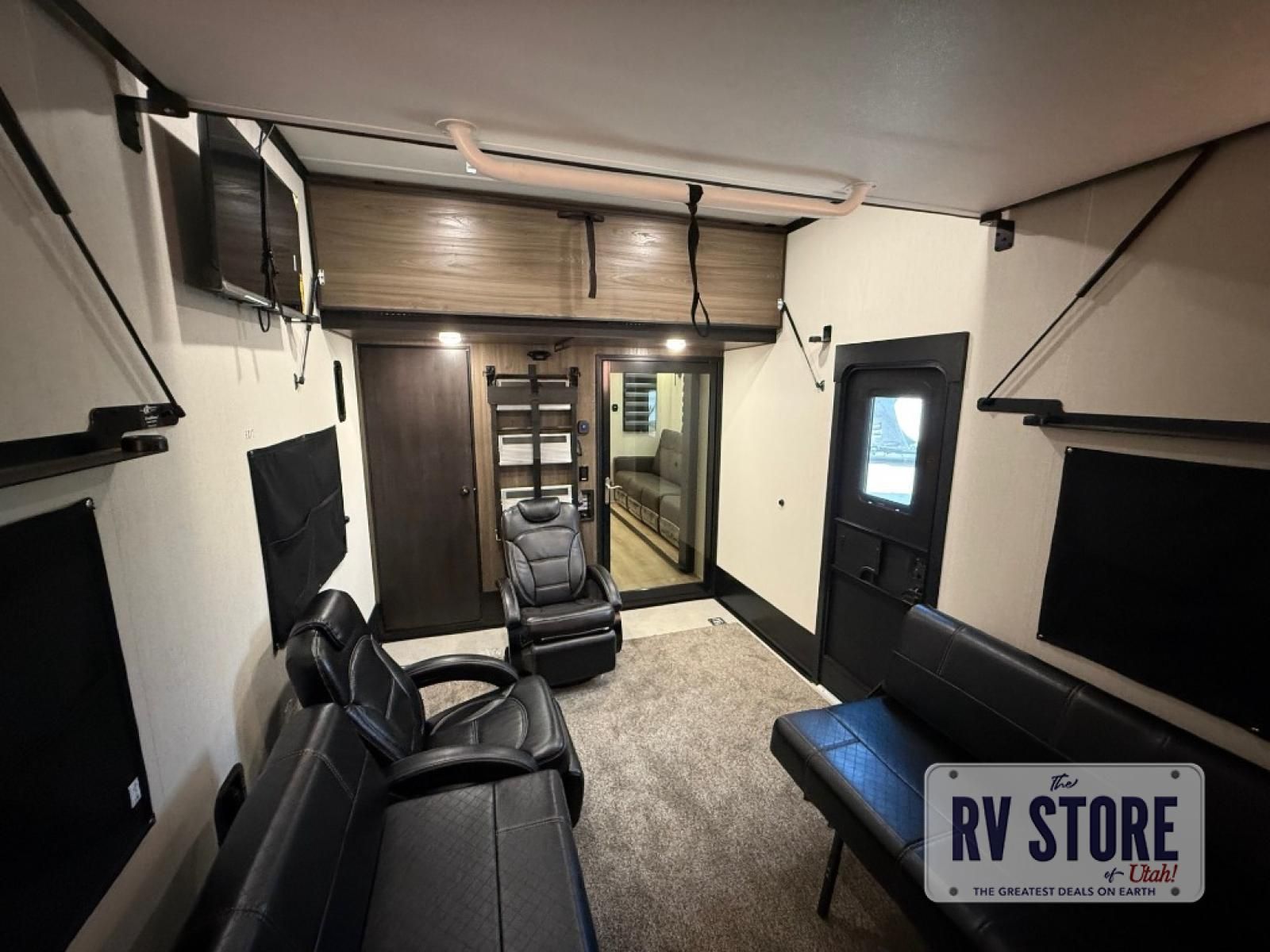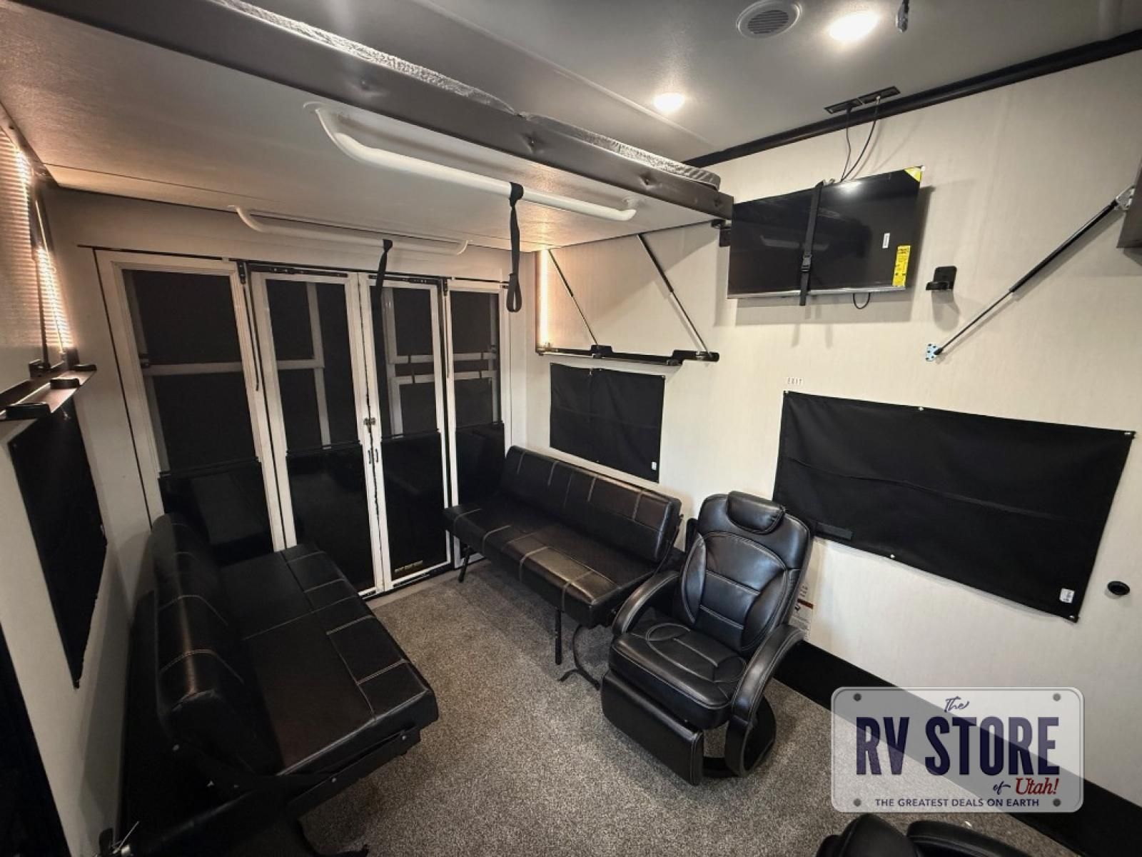 There is ample space in this triple slide out toy hauler for toys, gear, friends and more! The front private bedroom has a king bed slide to lay your head on at night, a front wall wardrobe, a dresser to keep your clothes looking nice, plus an entrance into the bathroom. The kitchen has a counter peninsula to prepare your meals, and a 12V black glass residential-style refrigerator to store any leftovers. The garage area has a loft, opposing flip-up sofas with a table in between and a raised queen bed above them, as well as a second entry door. And the half bath/utility bath is an extra bonus when camping with friends!