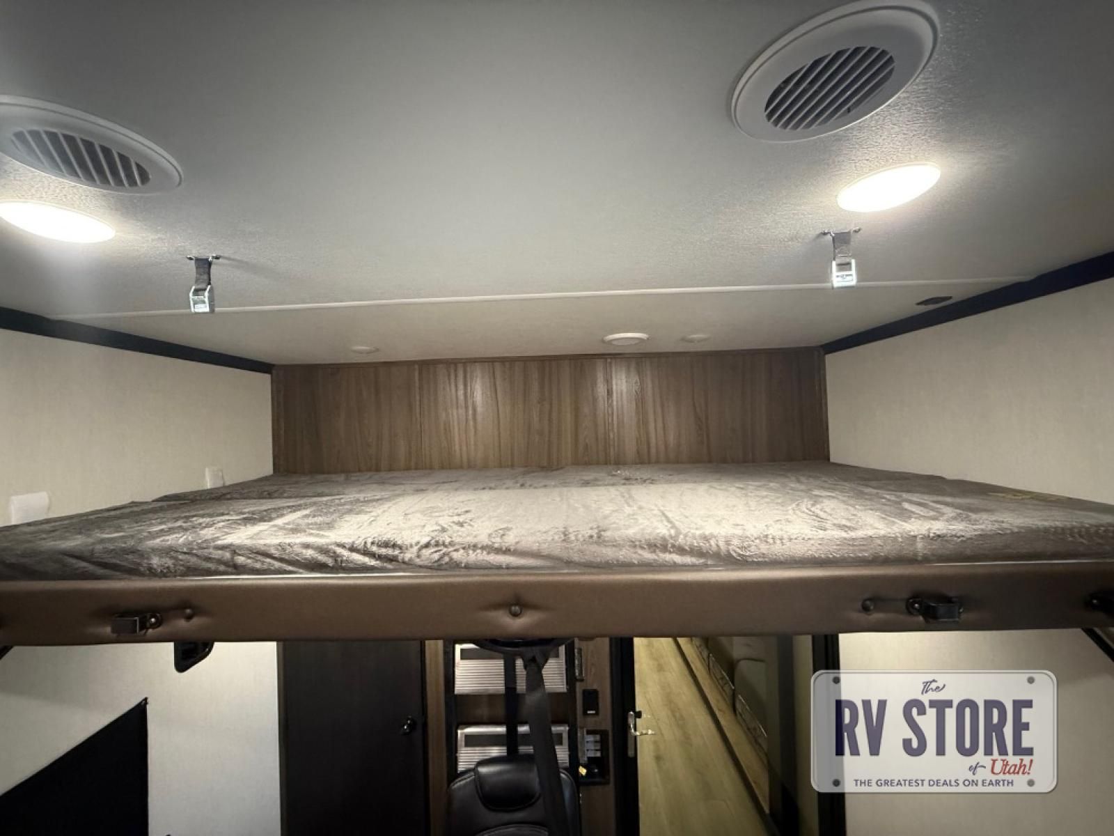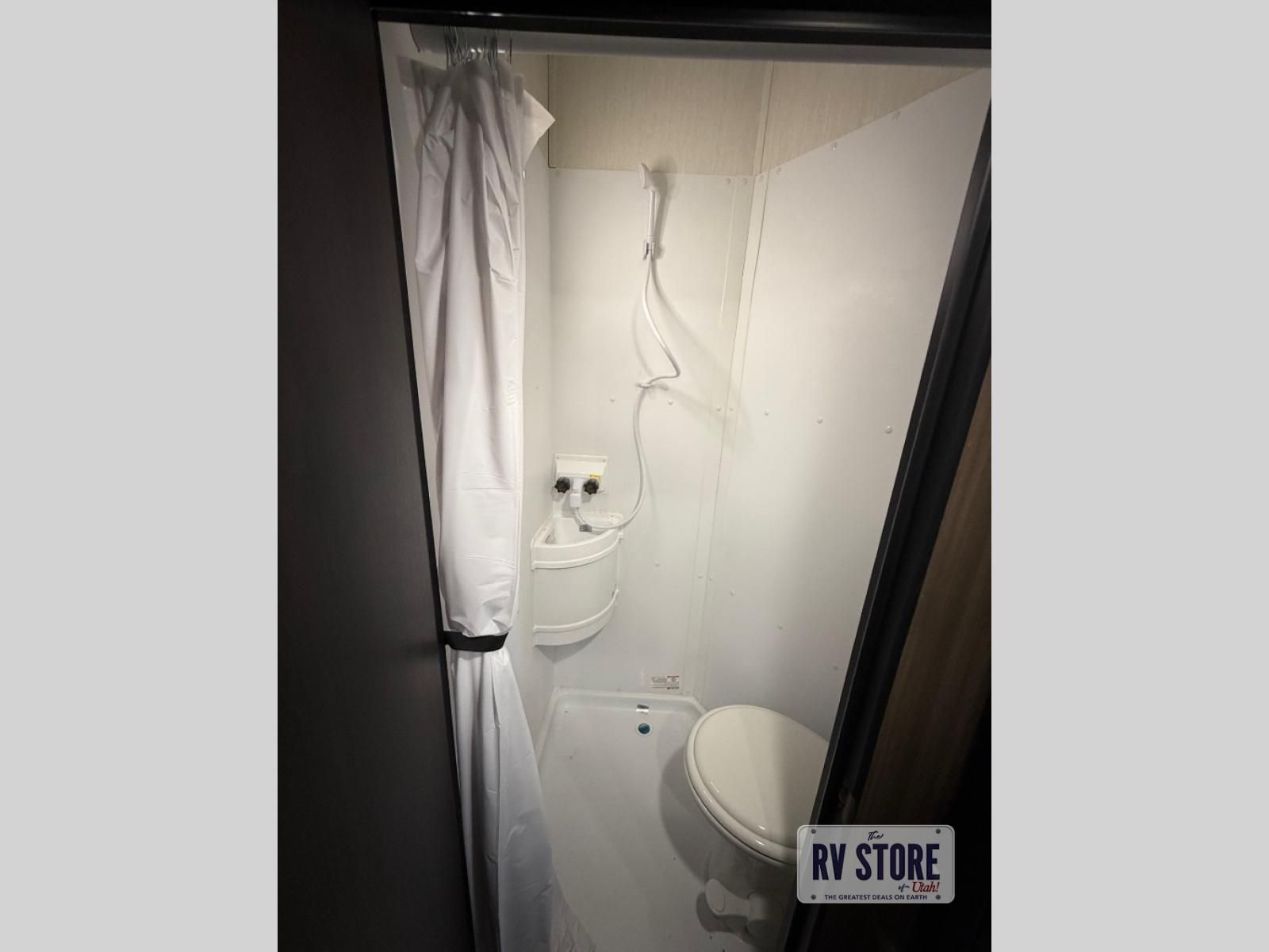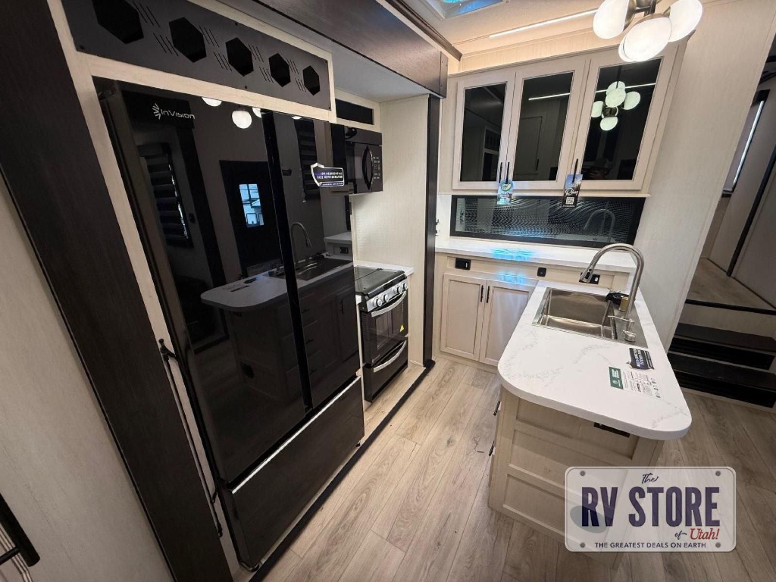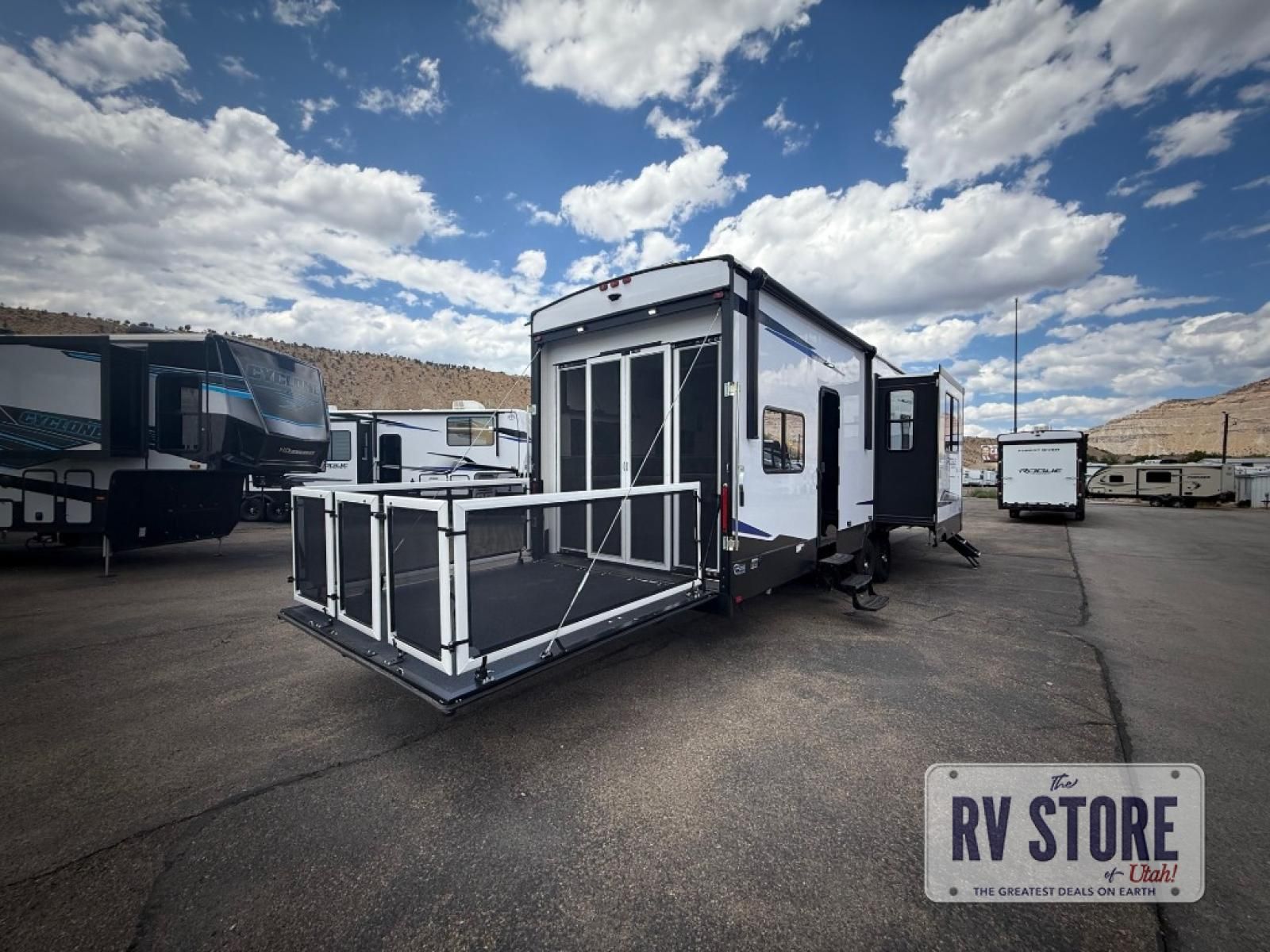 There is ample space in this triple slide out toy hauler for toys, gear, friends and more! The front private bedroom has a king bed slide to lay your head on at night, a front wall wardrobe, a dresser to keep your clothes looking nice, plus an entrance into the bathroom. The kitchen has a counter peninsula to prepare your meals, and a 12V black glass residential-style refrigerator to store any leftovers. The garage area has a loft, opposing flip-up sofas with a table in between and a raised queen bed above them, as well as a second entry door. And the half bath/utility bath is an extra bonus when camping with friends!