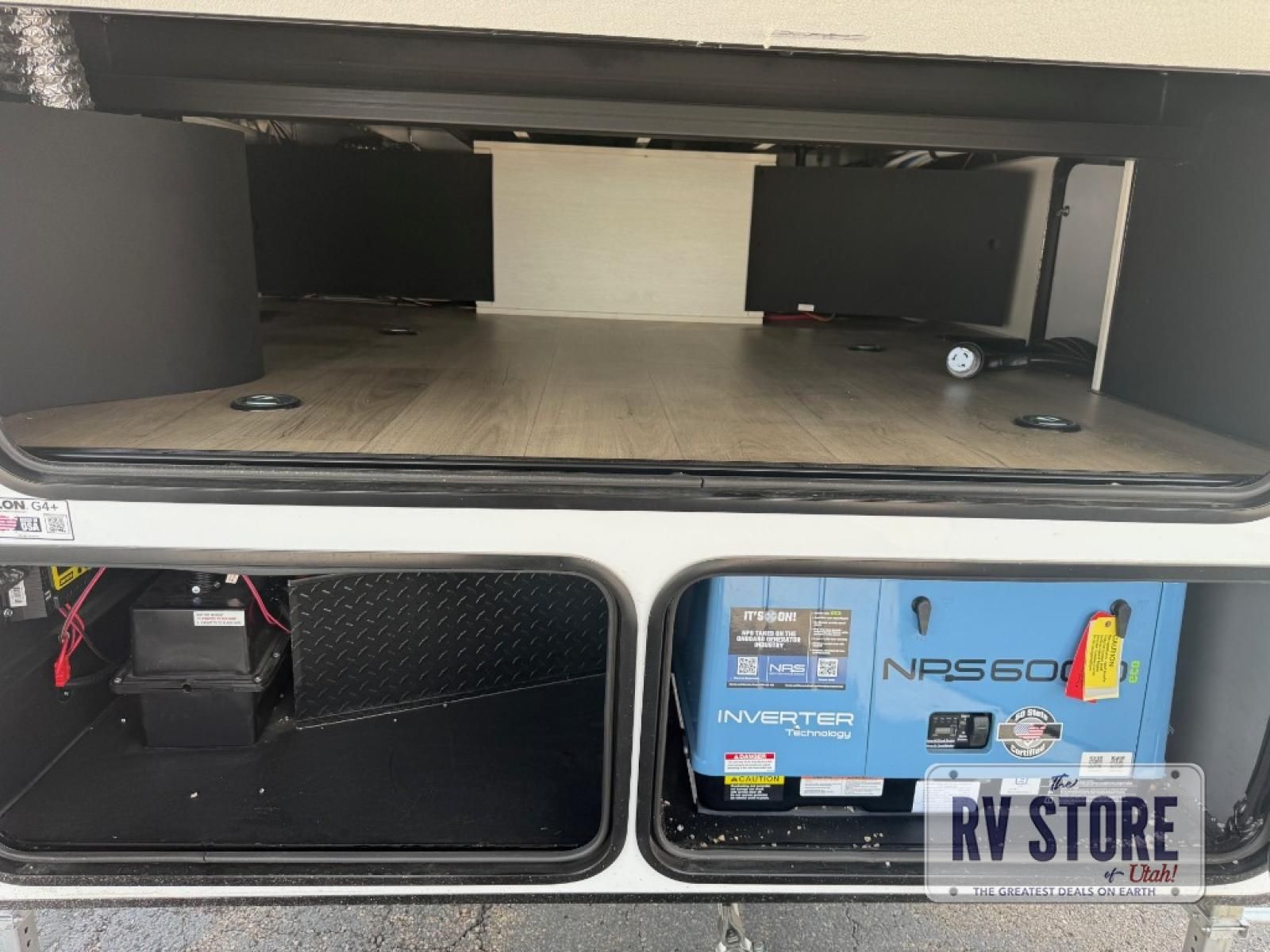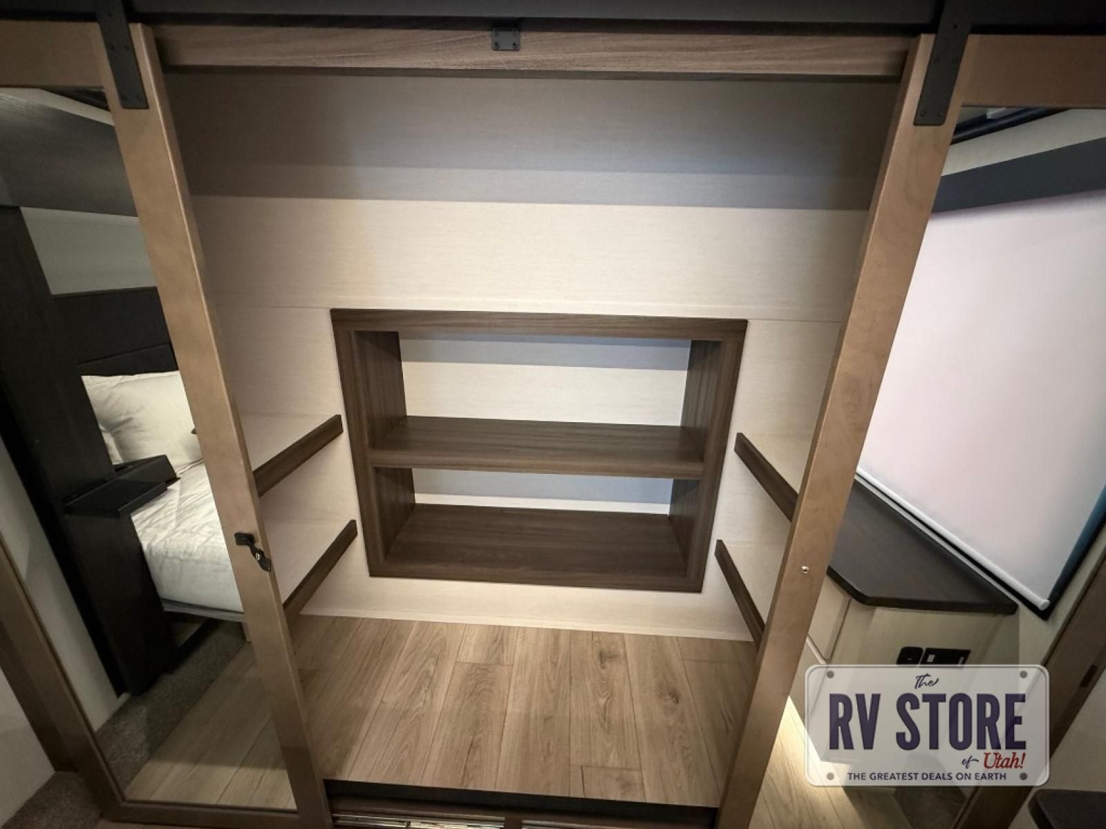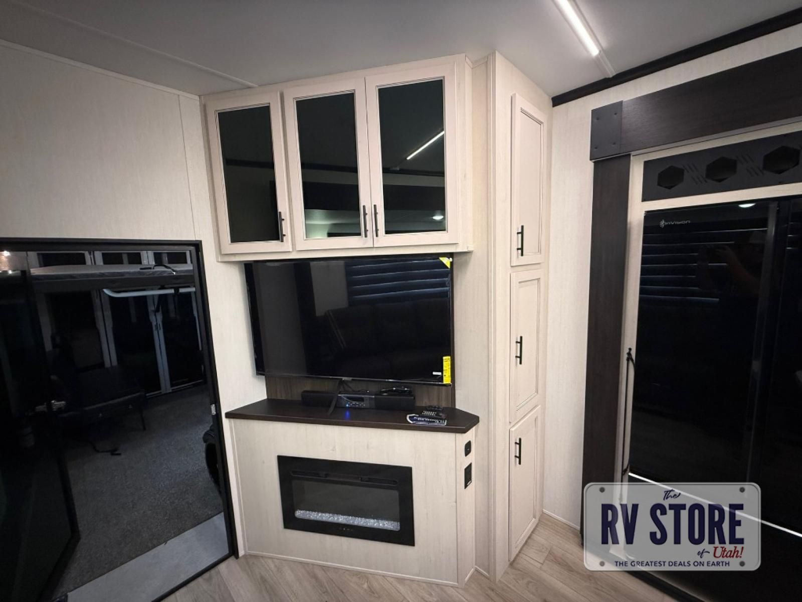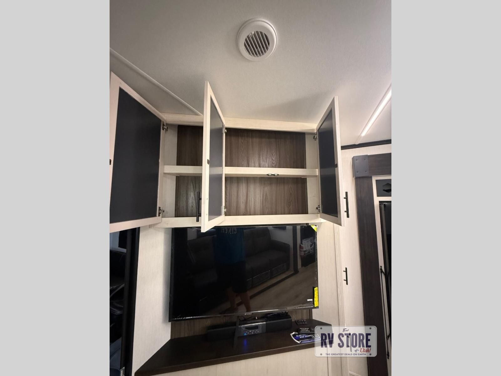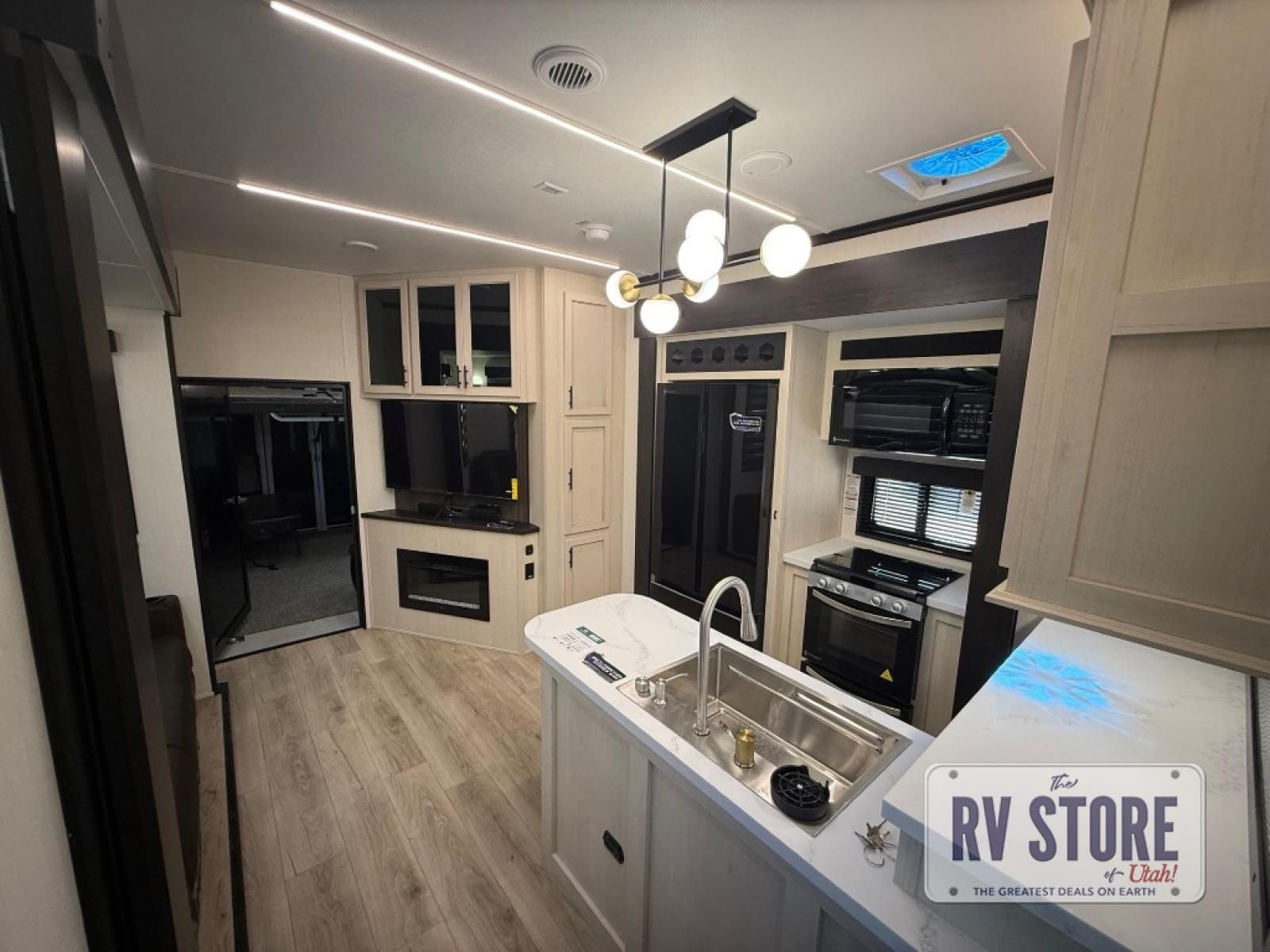 There is ample space in this triple slide out toy hauler for toys, gear, friends and more! The front private bedroom has a king bed slide to lay your head on at night, a front wall wardrobe, a dresser to keep your clothes looking nice, plus an entrance into the bathroom. The kitchen has a counter peninsula to prepare your meals, and a 12V black glass residential-style refrigerator to store any leftovers. The garage area has a loft, opposing flip-up sofas with a table in between and a raised queen bed above them, as well as a second entry door. And the half bath/utility bath is an extra bonus when camping with friends!