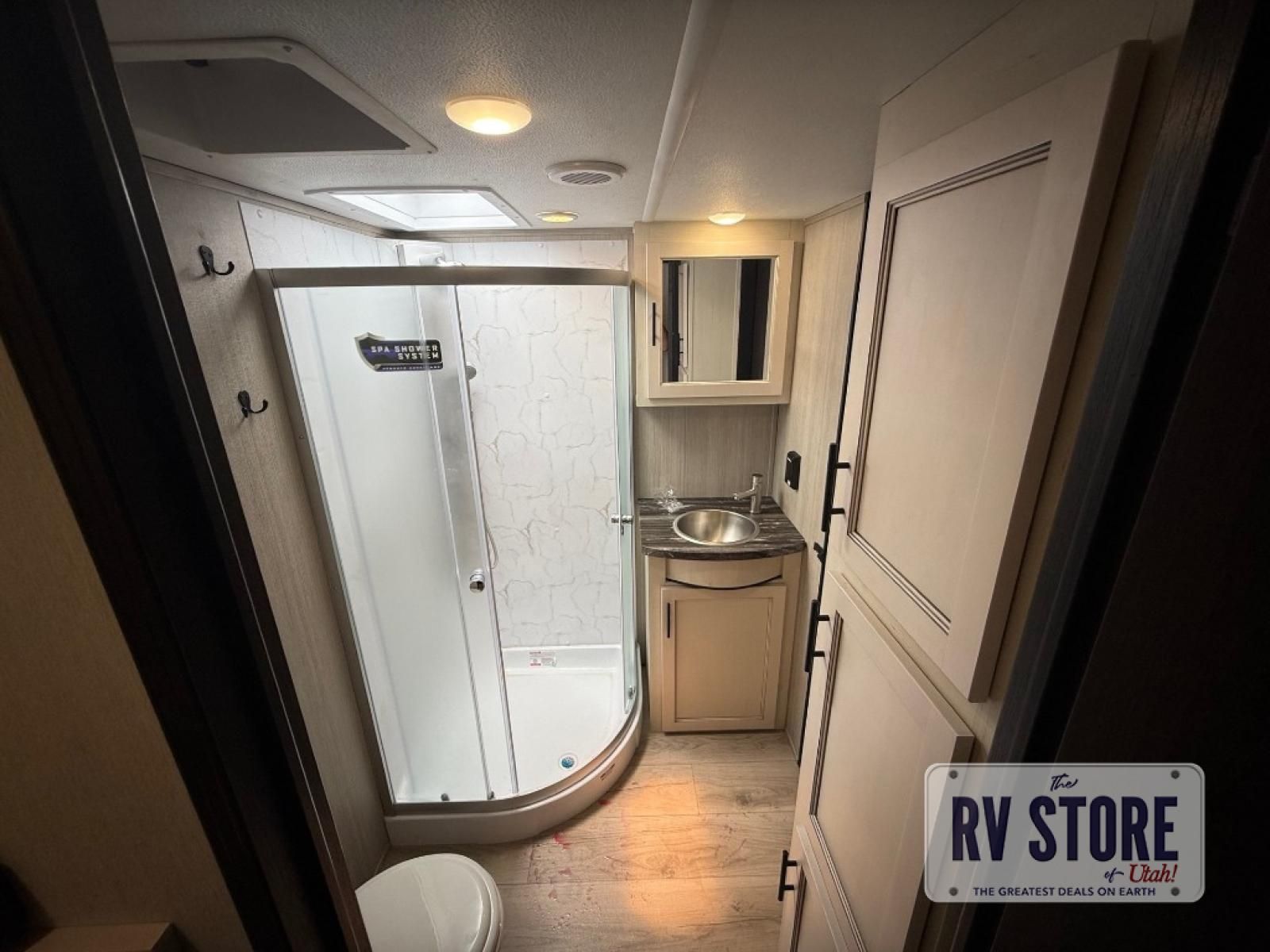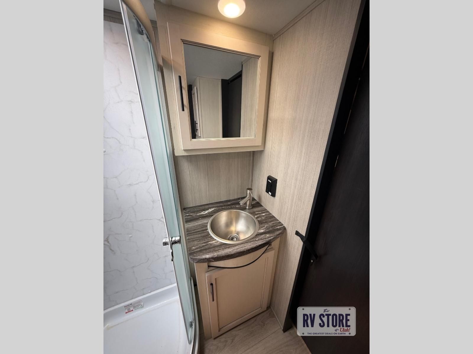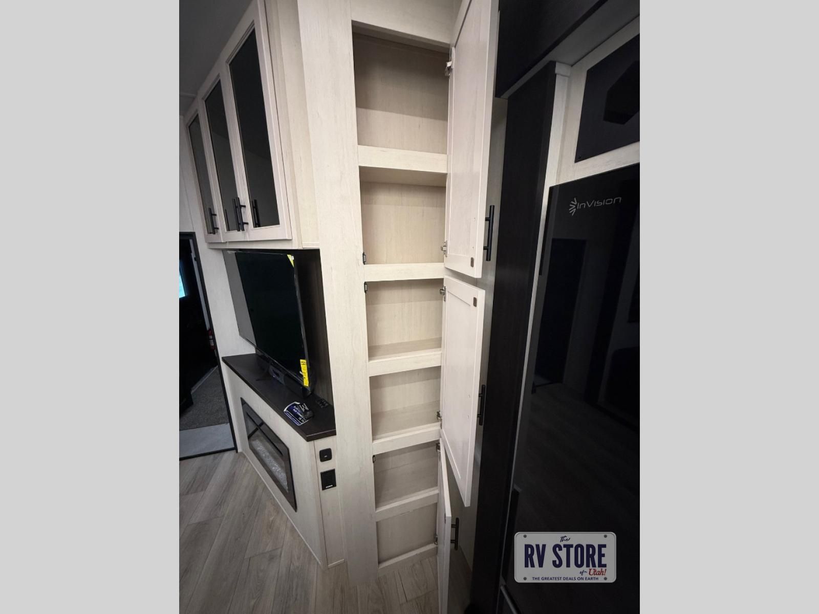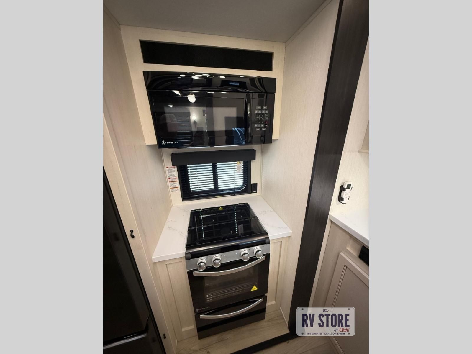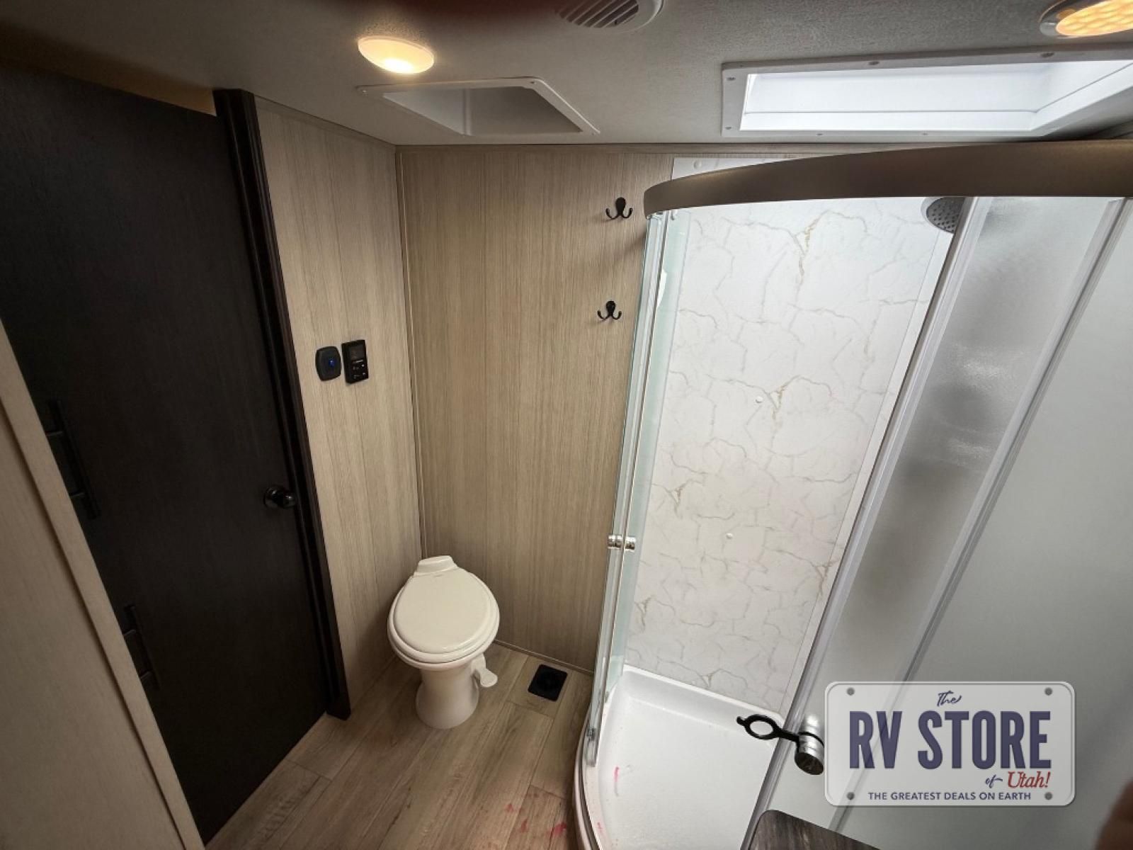 There is ample space in this triple slide out toy hauler for toys, gear, friends and more! The front private bedroom has a king bed slide to lay your head on at night, a front wall wardrobe, a dresser to keep your clothes looking nice, plus an entrance into the bathroom. The kitchen has a counter peninsula to prepare your meals, and a 12V black glass residential-style refrigerator to store any leftovers. The garage area has a loft, opposing flip-up sofas with a table in between and a raised queen bed above them, as well as a second entry door. And the half bath/utility bath is an extra bonus when camping with friends!