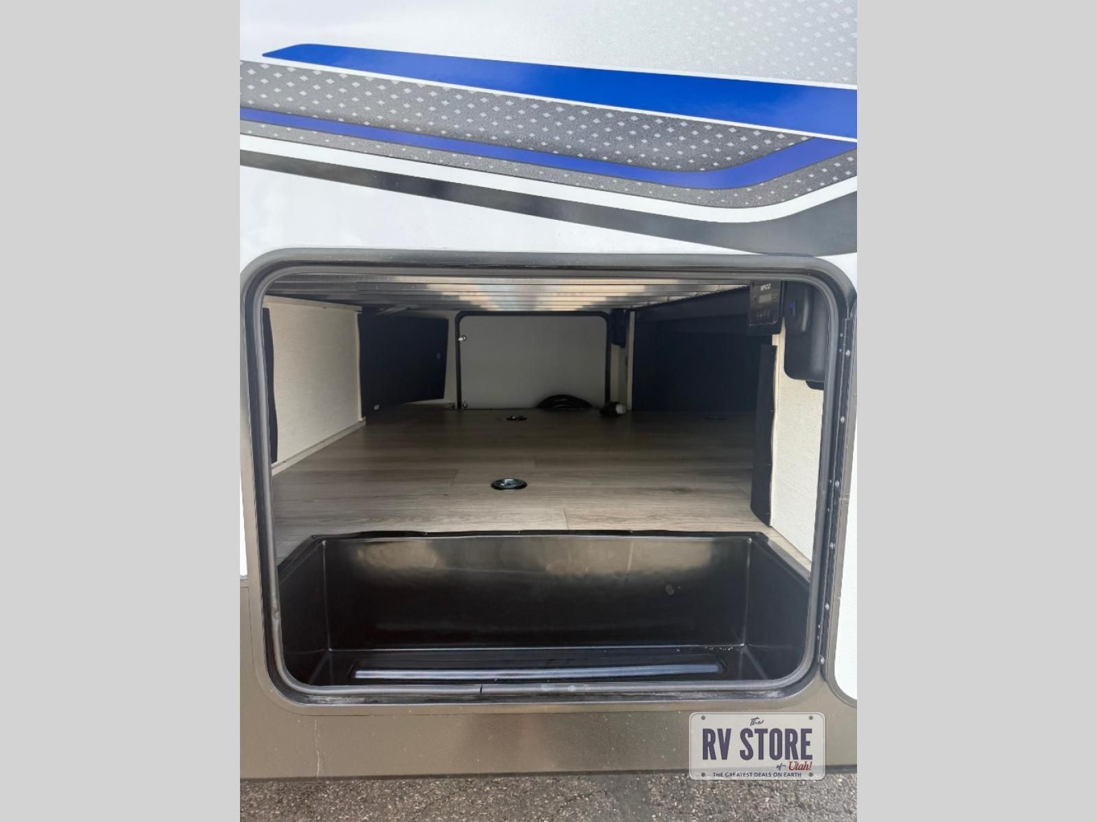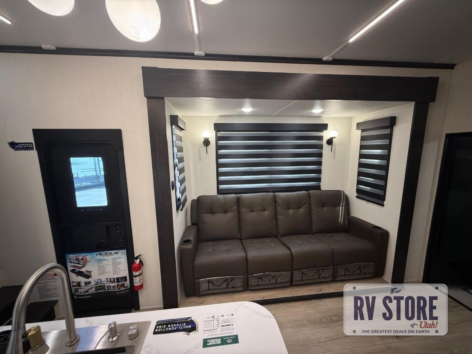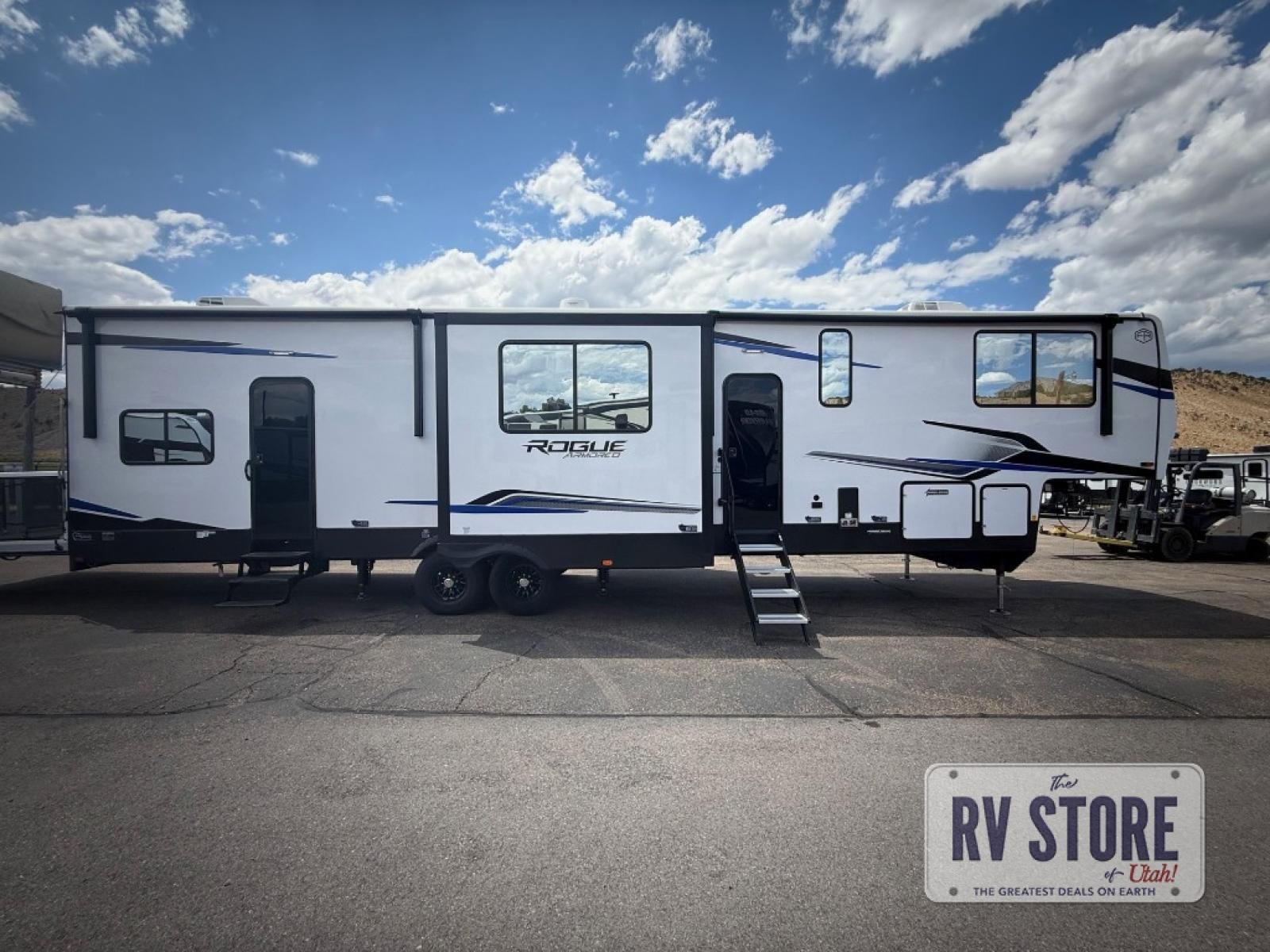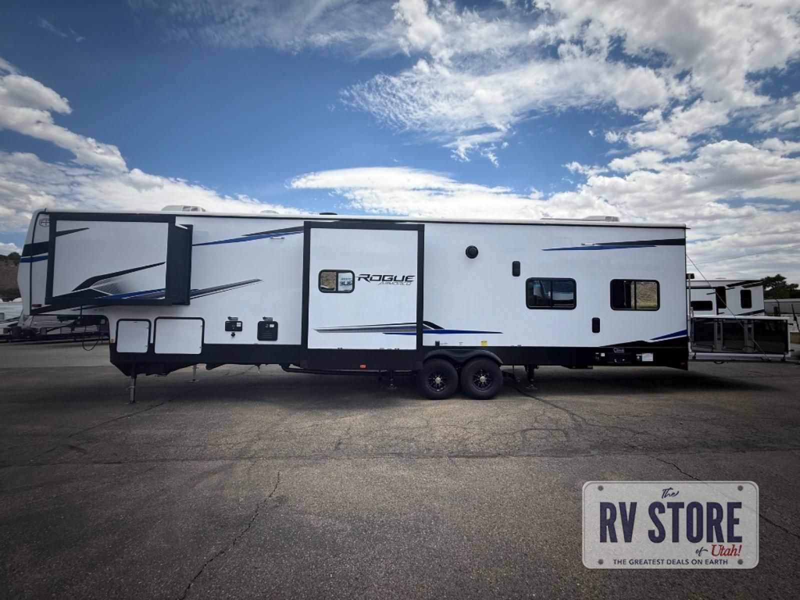 Every one of these Forest River Vengeance Rogue Armored fifth wheel toy haulers come with the features you want most at an affordable price tag! The DuraPoxy gas/oil resistant floor has 5,000 lb. tie downs to ensure your toys will arrive safely without damaging the flooring, plus the 3,000 lb. rated ramp door makes it easy to load them. Two 15,000 BTU A/Cs are "Super H Ducted" to keep you cool even on the hottest summer days, and an Armored underbelly helps keep your unit's vitals protected. The Rogue Ready package comes with a six point leveling system, a power MAXX storage system, a TST tire pressure monitoring system, and many more stand-out features. And don't overlook the Rogue Premium Package with an 8' weatherproof ramp door, an exterior TV hookup for the option to add a television, blue accent wheels, and solar reflective safety glass windows to name a few conveniences.Â
