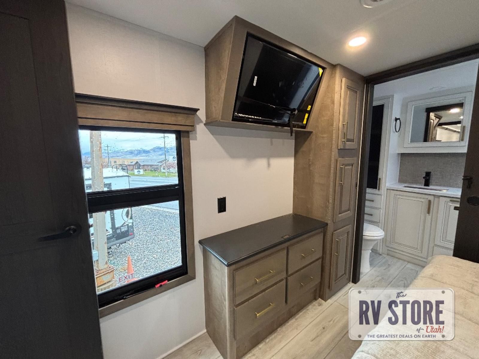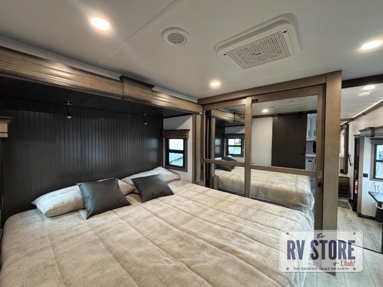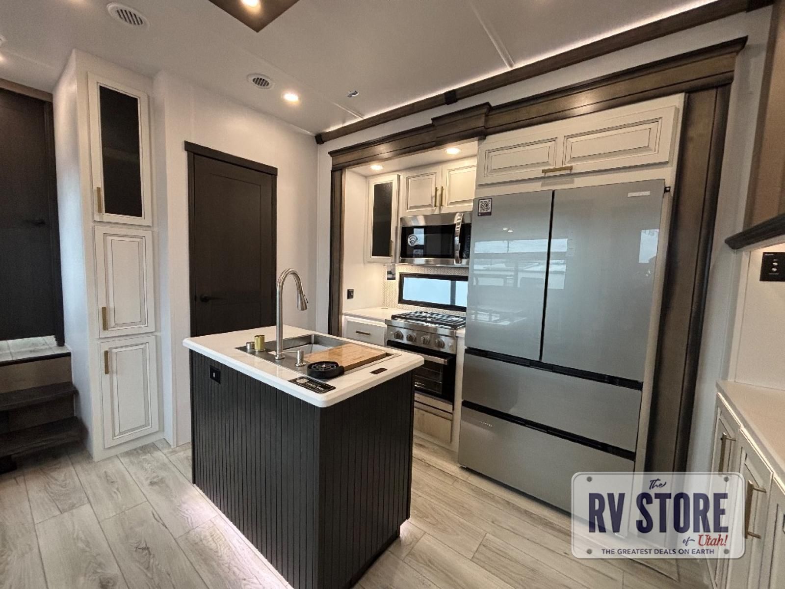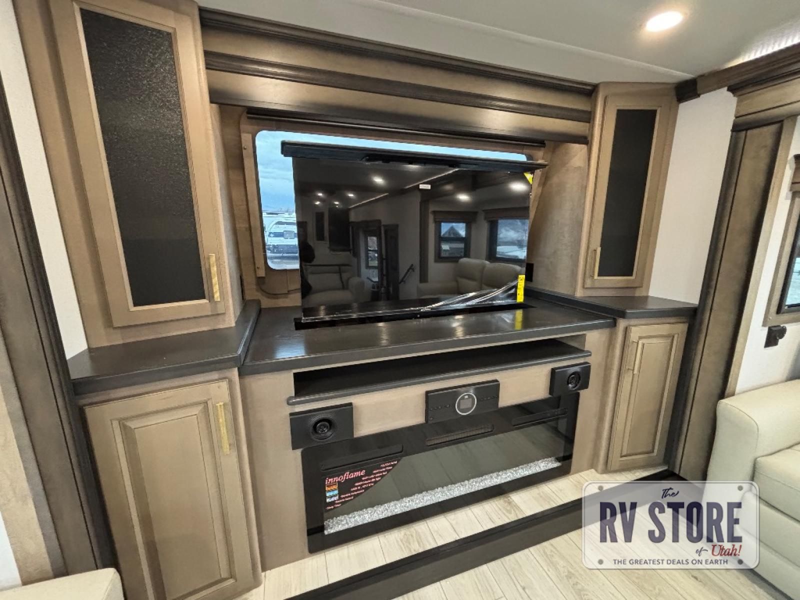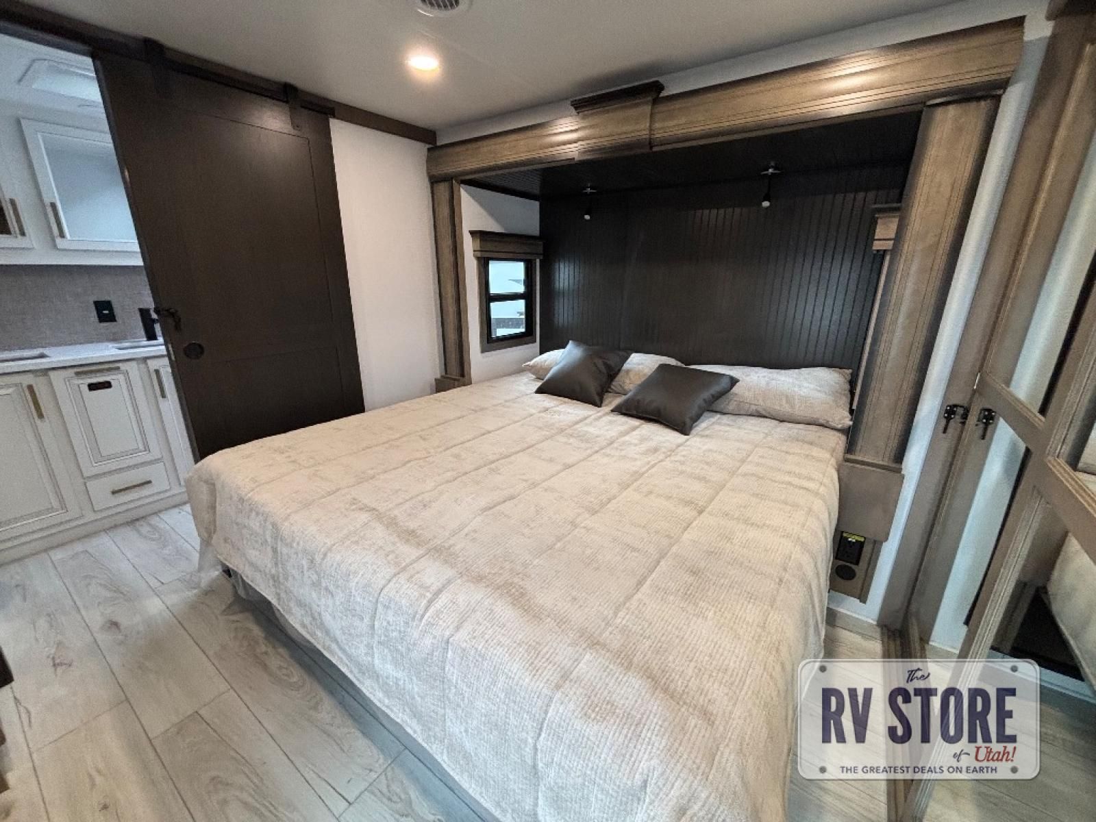 Life will be easier at the campground in this fifth wheel with a bath and a half! The full rear bathroom has a 48" x 30" fiberglass shower with a seat and skylight above, a linen closet to keep your towels close, a dual sink vanity for two to get ready at once, and a barn door to close off the master suite. The bedroom also has a king bed slide with storage underneath across from a dresser with a 32" Smart TV and wardrobe, as well as a large closet with stackable washer and dryer prep. The chef can prepare their best meals with the kitchen island, convection microwave and 24" range, plus there is a pantry/buffet and a pivot dinette to enjoy your meals at. The front living area will have you feeling right at home with the front entertainment center that has a telescoping 50" Smart TV, a 5,000 BTU decorative fireplace heater, and storage on either side. There is also opposing hide-a-bed sofa slides for extra sleeping spaces and power theater seating for even more comfort!