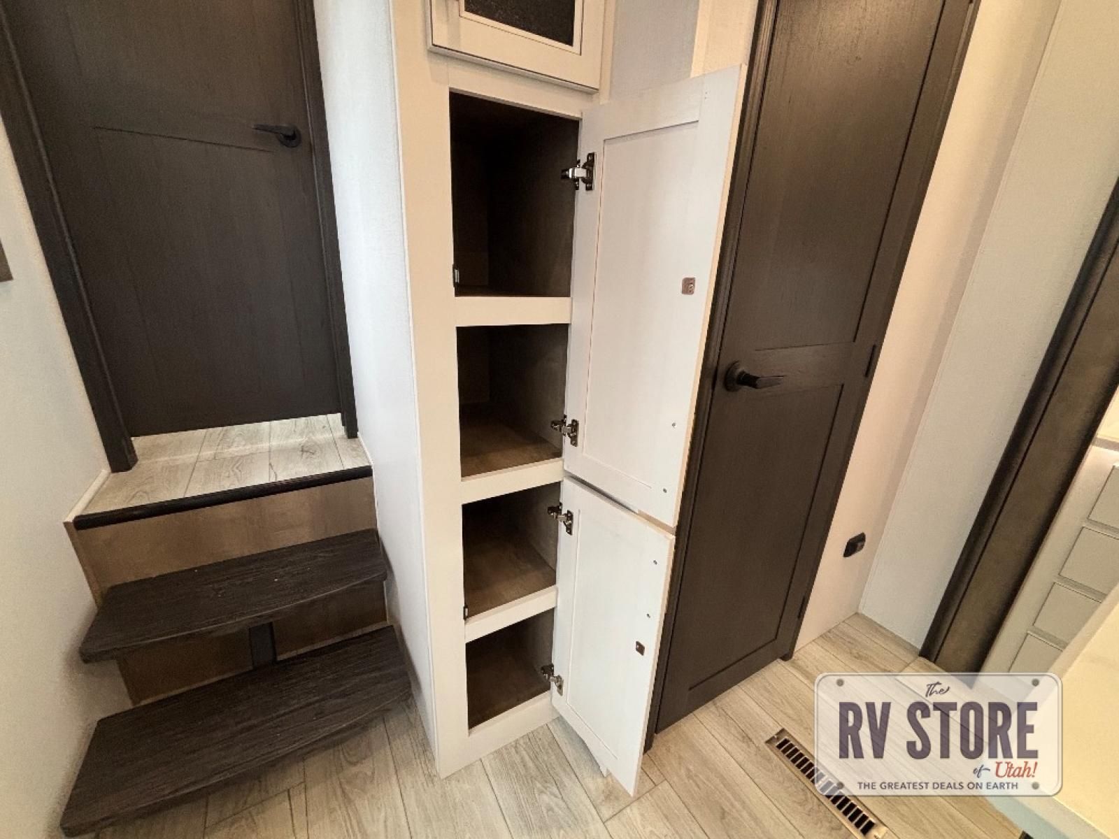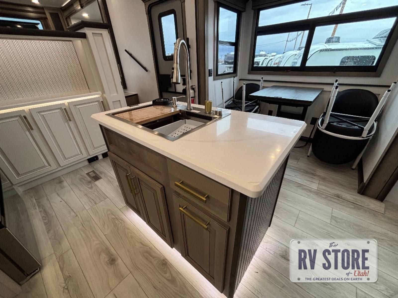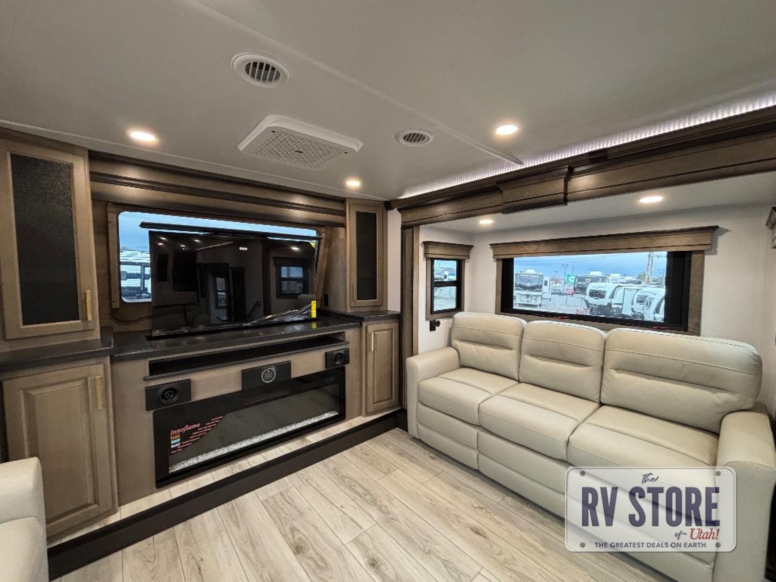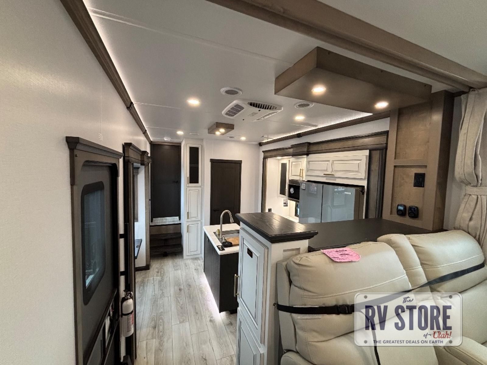 Life will be easier at the campground in this fifth wheel with a bath and a half! The full rear bathroom has a 48" x 30" fiberglass shower with a seat and skylight above, a linen closet to keep your towels close, a dual sink vanity for two to get ready at once, and a barn door to close off the master suite. The bedroom also has a king bed slide with storage underneath across from a dresser with a 32" Smart TV and wardrobe, as well as a large closet with stackable washer and dryer prep. The chef can prepare their best meals with the kitchen island, convection microwave and 24" range, plus there is a pantry/buffet and a pivot dinette to enjoy your meals at. The front living area will have you feeling right at home with the front entertainment center that has a telescoping 50" Smart TV, a 5,000 BTU decorative fireplace heater, and storage on either side. There is also opposing hide-a-bed sofa slides for extra sleeping spaces and power theater seating for even more comfort!