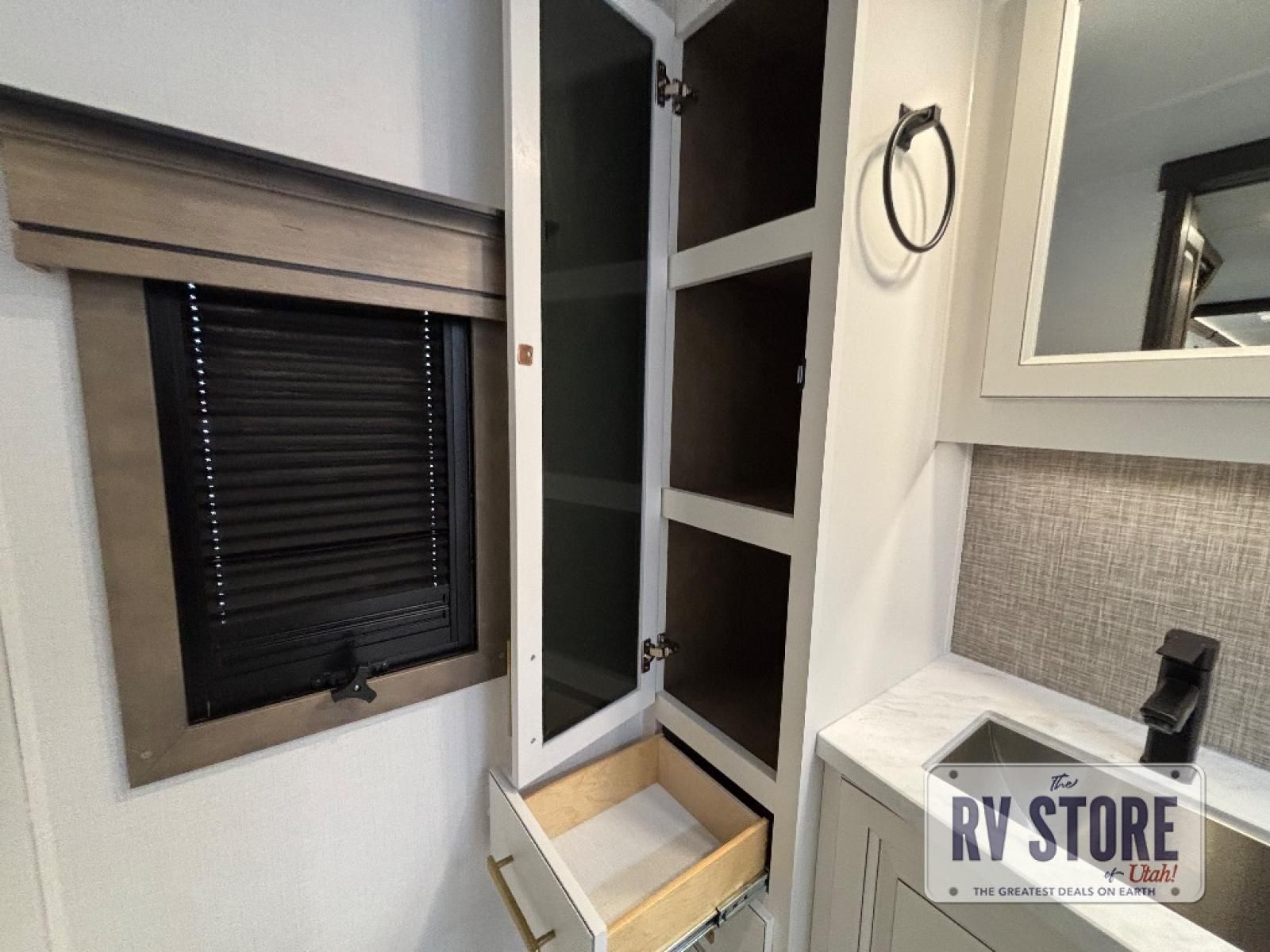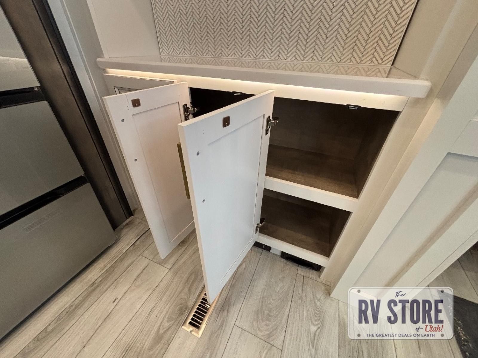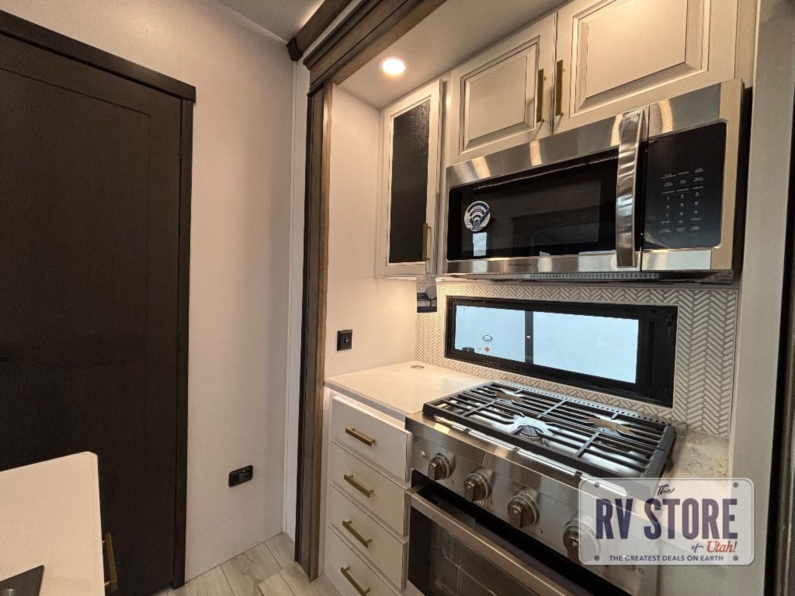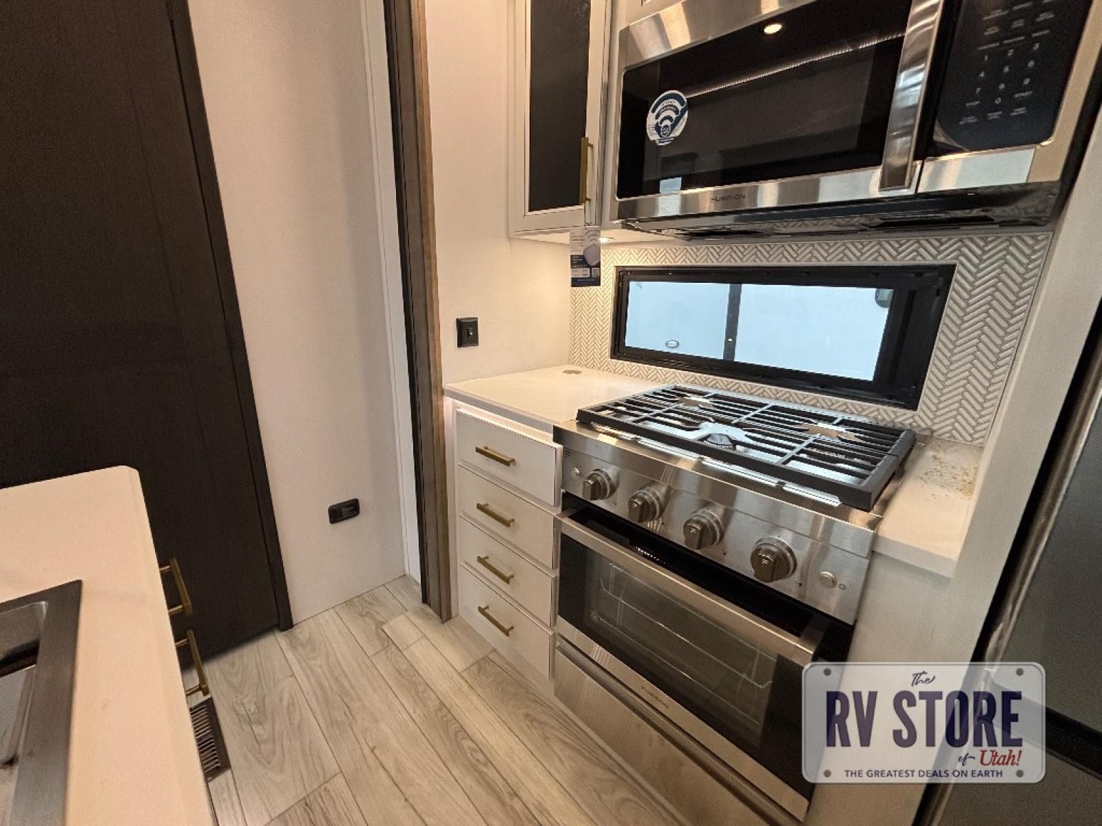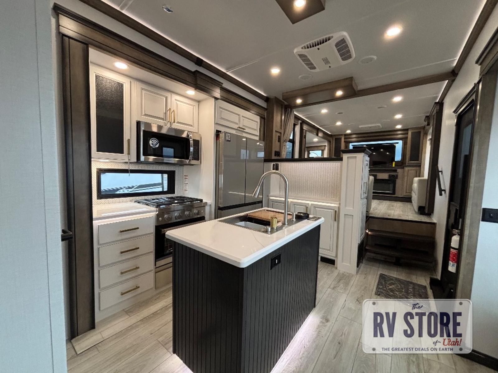 Life will be easier at the campground in this fifth wheel with a bath and a half! The full rear bathroom has a 48" x 30" fiberglass shower with a seat and skylight above, a linen closet to keep your towels close, a dual sink vanity for two to get ready at once, and a barn door to close off the master suite. The bedroom also has a king bed slide with storage underneath across from a dresser with a 32" Smart TV and wardrobe, as well as a large closet with stackable washer and dryer prep. The chef can prepare their best meals with the kitchen island, convection microwave and 24" range, plus there is a pantry/buffet and a pivot dinette to enjoy your meals at. The front living area will have you feeling right at home with the front entertainment center that has a telescoping 50" Smart TV, a 5,000 BTU decorative fireplace heater, and storage on either side. There is also opposing hide-a-bed sofa slides for extra sleeping spaces and power theater seating for even more comfort!