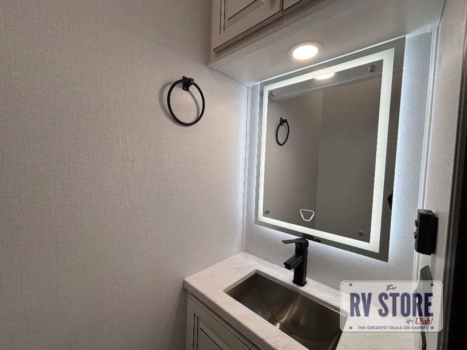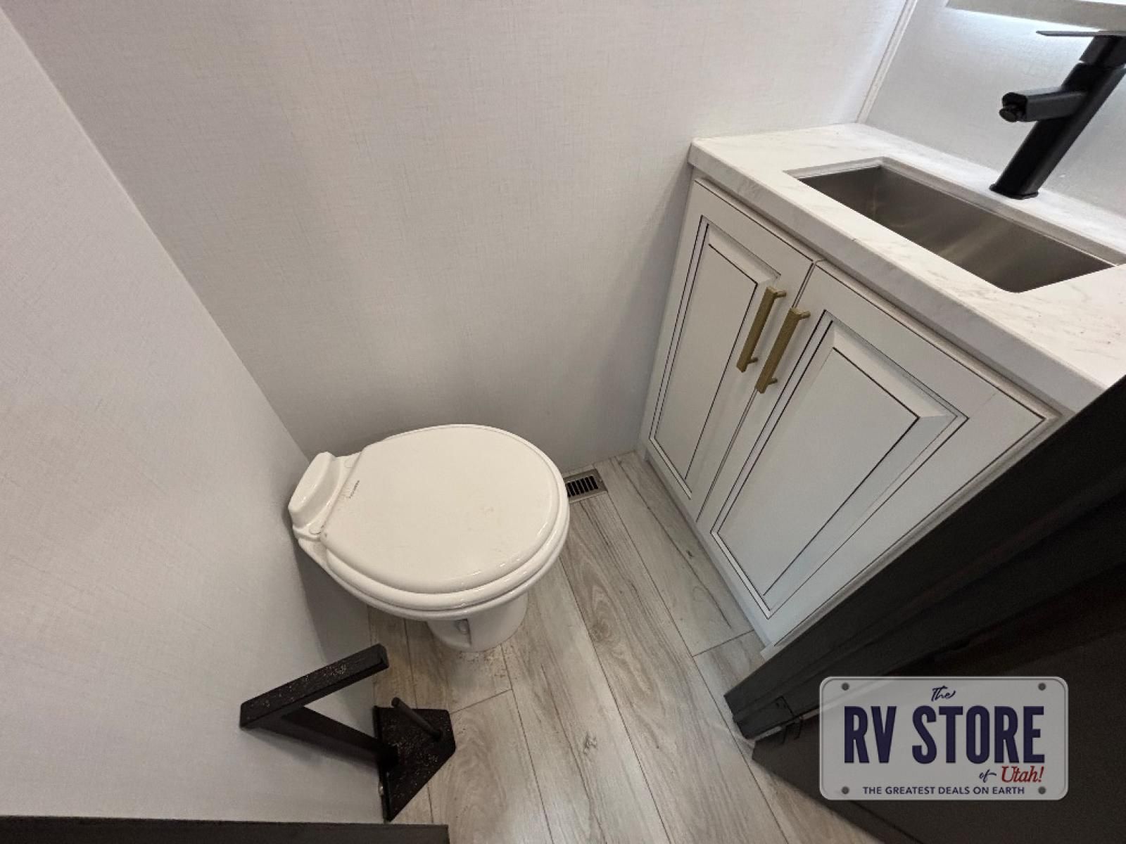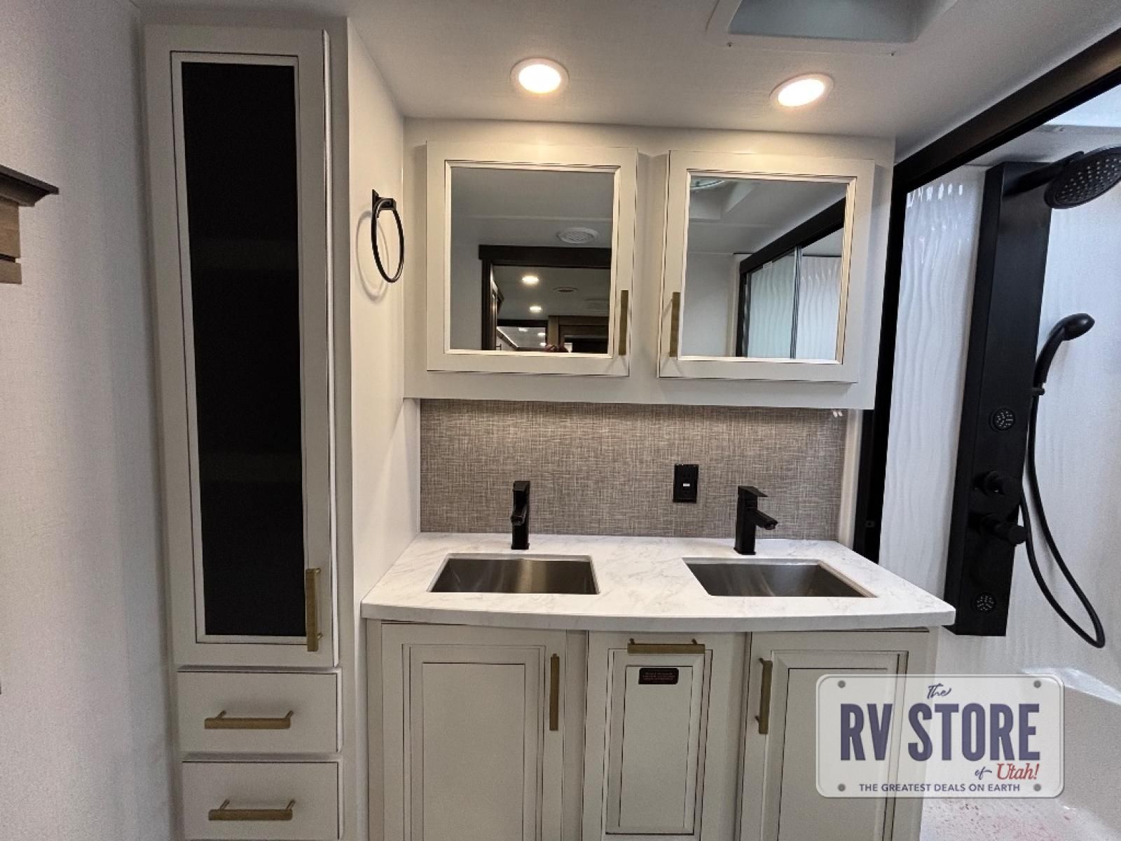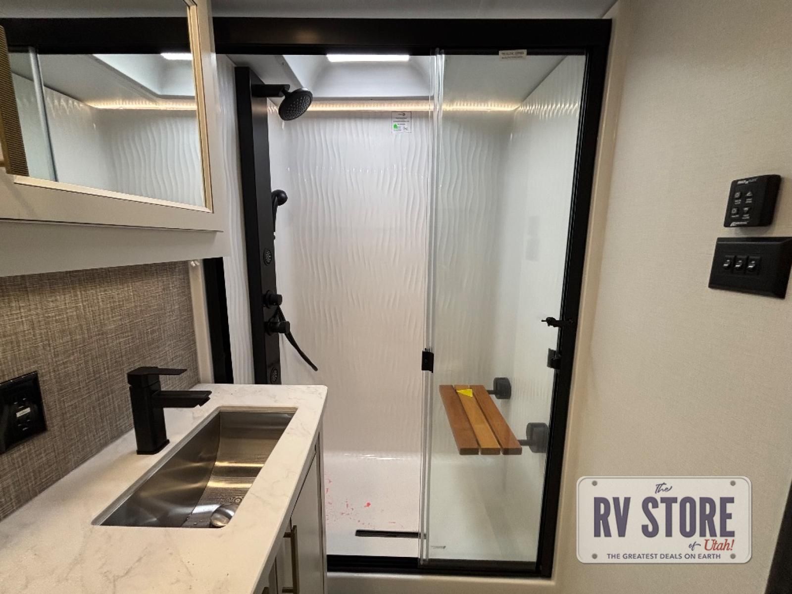 Life will be easier at the campground in this fifth wheel with a bath and a half! The full rear bathroom has a 48" x 30" fiberglass shower with a seat and skylight above, a linen closet to keep your towels close, a dual sink vanity for two to get ready at once, and a barn door to close off the master suite. The bedroom also has a king bed slide with storage underneath across from a dresser with a 32" Smart TV and wardrobe, as well as a large closet with stackable washer and dryer prep. The chef can prepare their best meals with the kitchen island, convection microwave and 24" range, plus there is a pantry/buffet and a pivot dinette to enjoy your meals at. The front living area will have you feeling right at home with the front entertainment center that has a telescoping 50" Smart TV, a 5,000 BTU decorative fireplace heater, and storage on either side. There is also opposing hide-a-bed sofa slides for extra sleeping spaces and power theater seating for even more comfort!