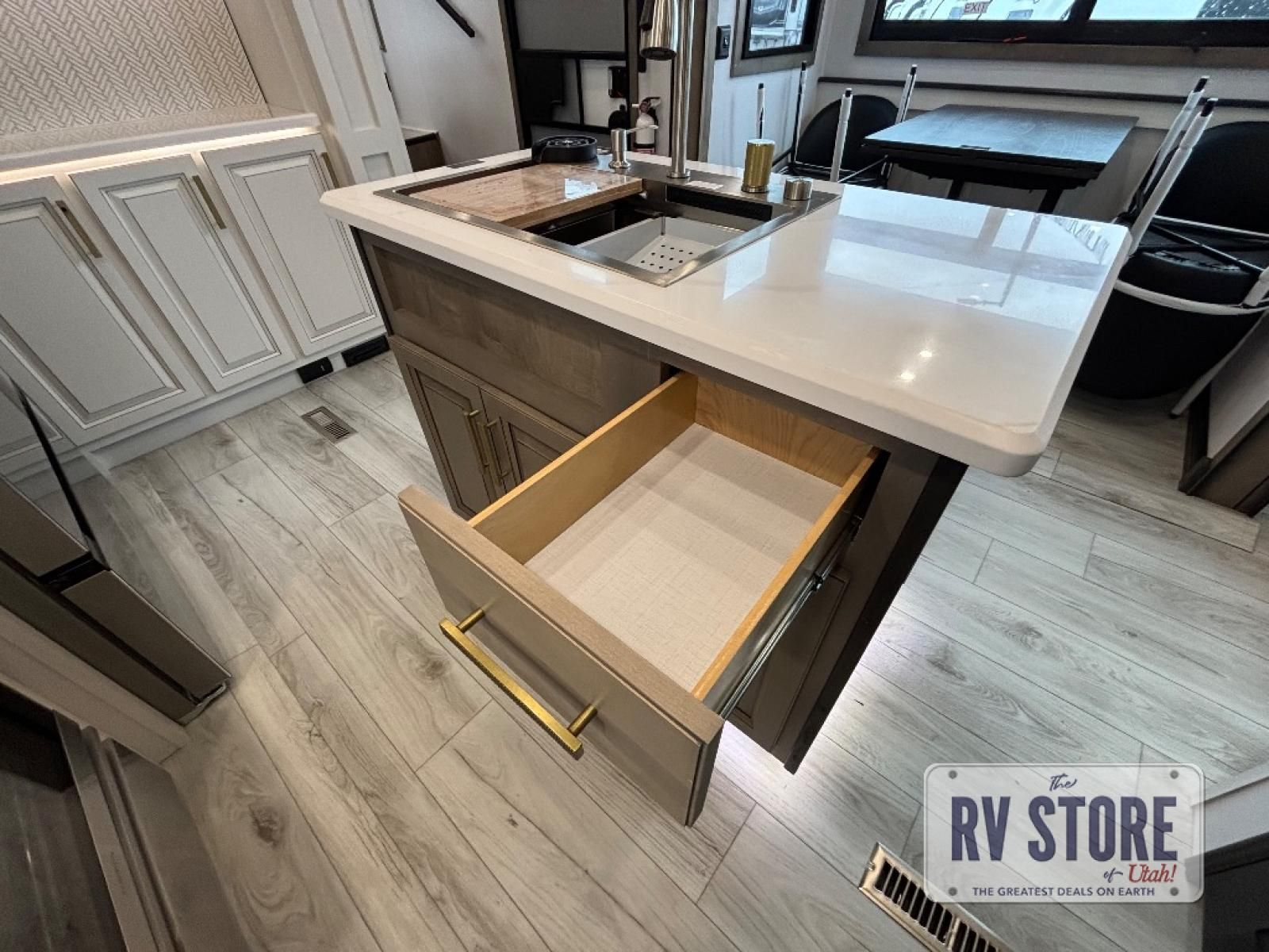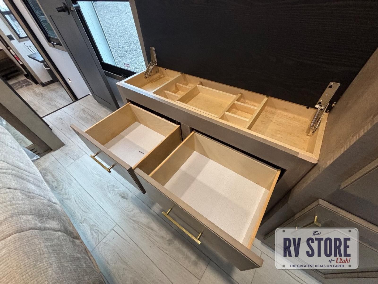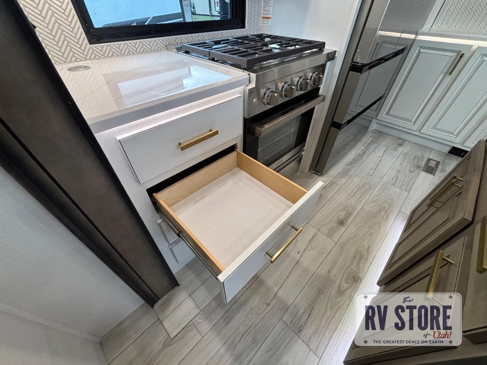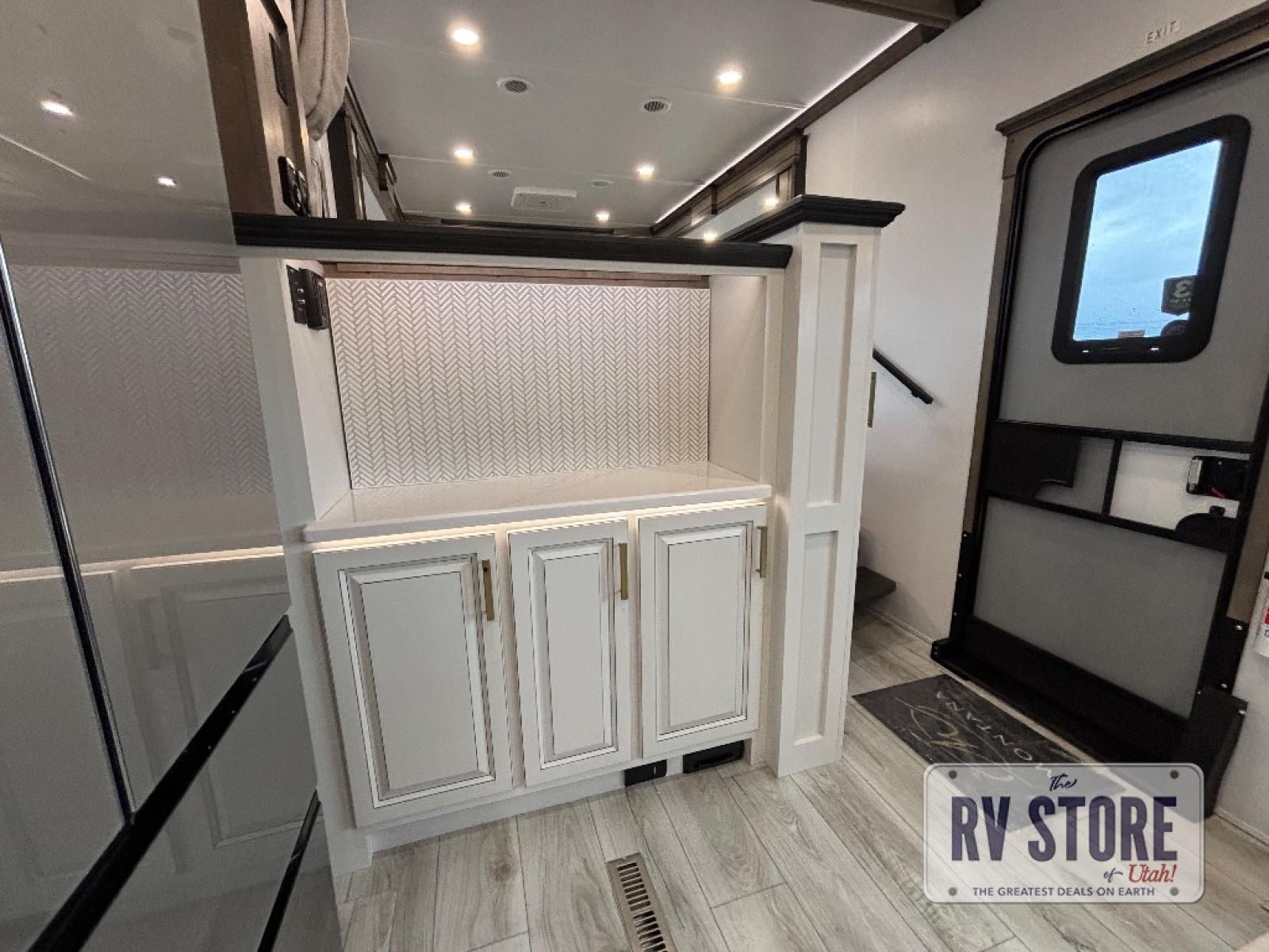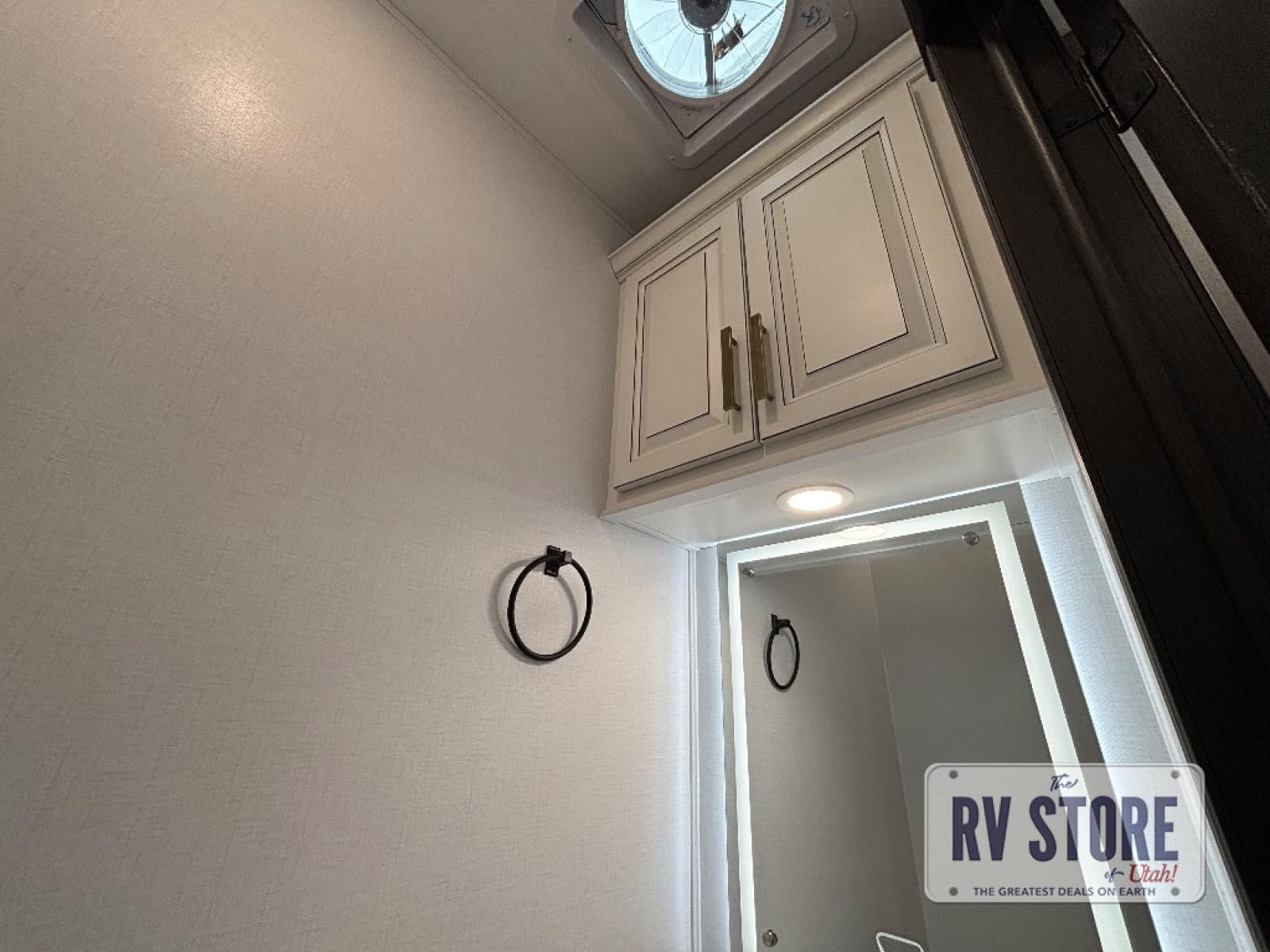 Life will be easier at the campground in this fifth wheel with a bath and a half! The full rear bathroom has a 48" x 30" fiberglass shower with a seat and skylight above, a linen closet to keep your towels close, a dual sink vanity for two to get ready at once, and a barn door to close off the master suite. The bedroom also has a king bed slide with storage underneath across from a dresser with a 32" Smart TV and wardrobe, as well as a large closet with stackable washer and dryer prep. The chef can prepare their best meals with the kitchen island, convection microwave and 24" range, plus there is a pantry/buffet and a pivot dinette to enjoy your meals at. The front living area will have you feeling right at home with the front entertainment center that has a telescoping 50" Smart TV, a 5,000 BTU decorative fireplace heater, and storage on either side. There is also opposing hide-a-bed sofa slides for extra sleeping spaces and power theater seating for even more comfort!