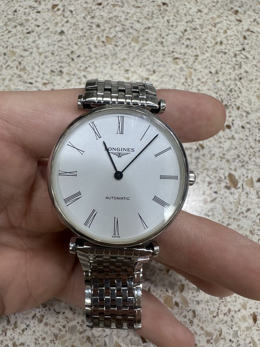Brand: LONGINES Series: La Grande Gender: Unisex Movement: Quartz Case Size: 36 mm Case Material: Stainless Steel Dial Color: Silver Dial Type: Analog Crystal: Scratch Resistant Sapphire Band Material: Stainless Steel Band Type / Color: Bracelet / Silver Bezel: Fixed Clasp: Fold Over with Safety Release Functions: Hour, Minute Origin: Swiss Made Water Resistance: 30 meters / 99 feet