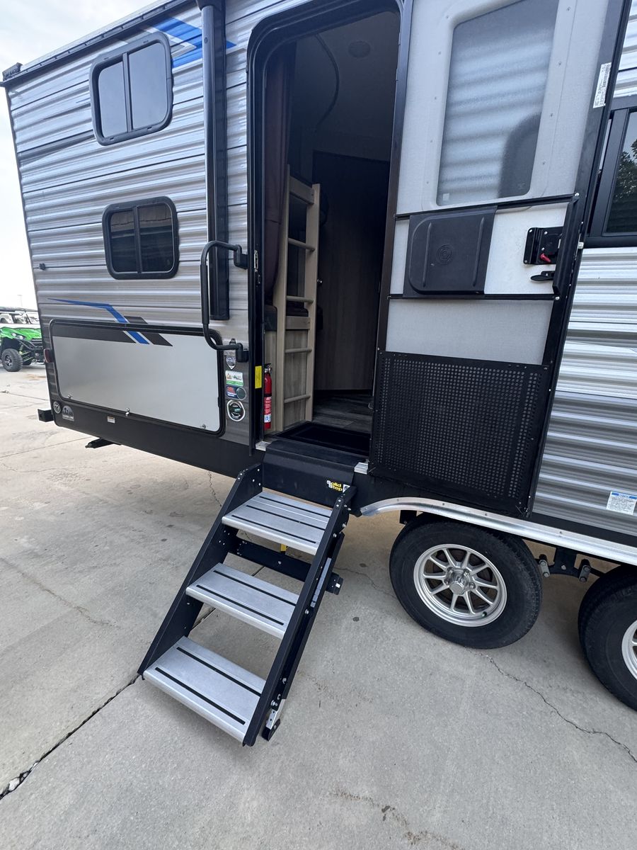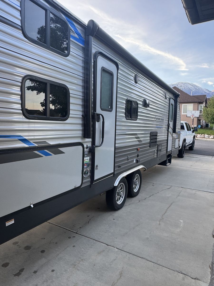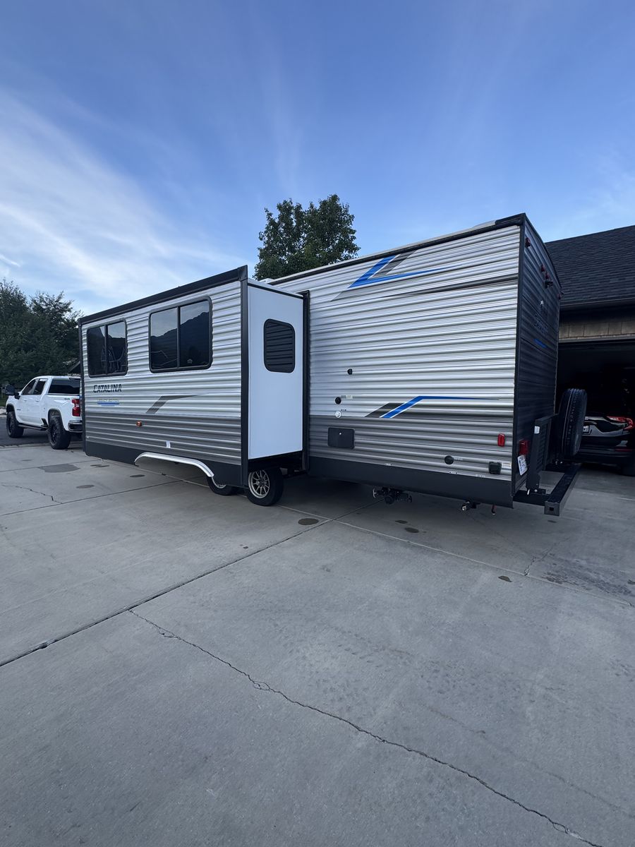 2021 Coachman Catalina 26bhsck for sale. Near perfect condition. Queen bed in master, double over double bunks, lots of cabinet space, outdoor kitchen, entertainment center with electric fireplace, floor to ceiling closet in master, sleeps 9, very usable floor plan.