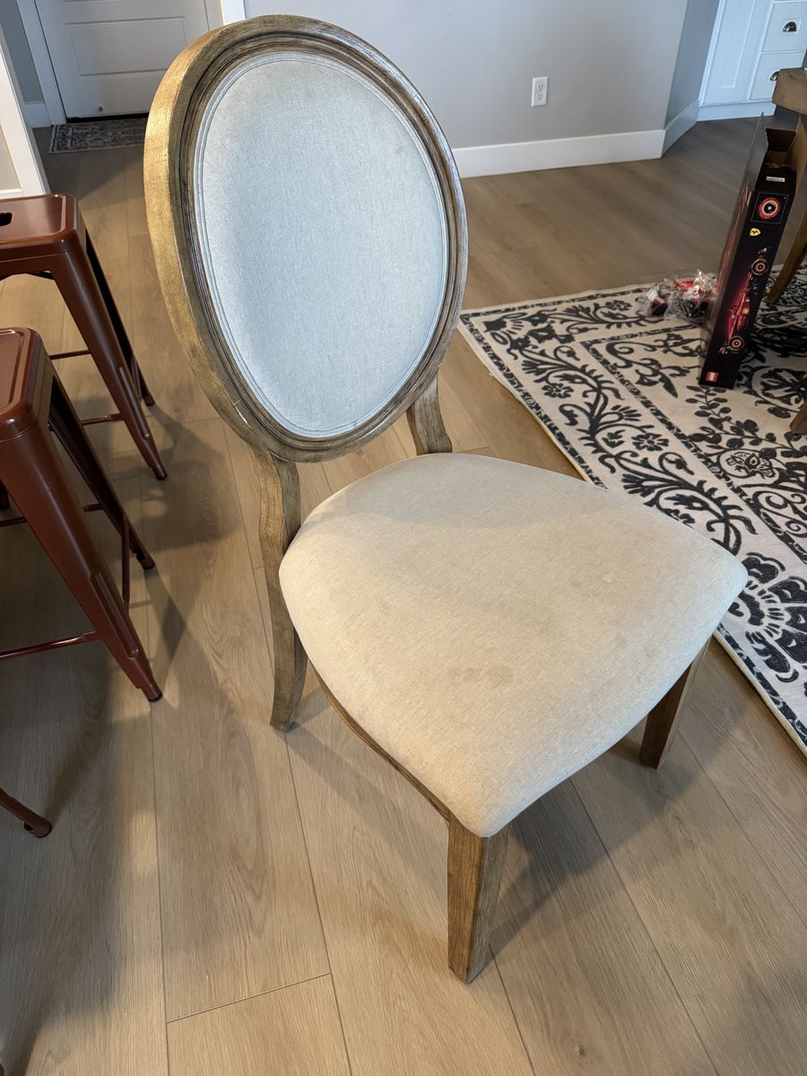 6 Dining Chairs. Classic upholstered French rou back dining chairs.