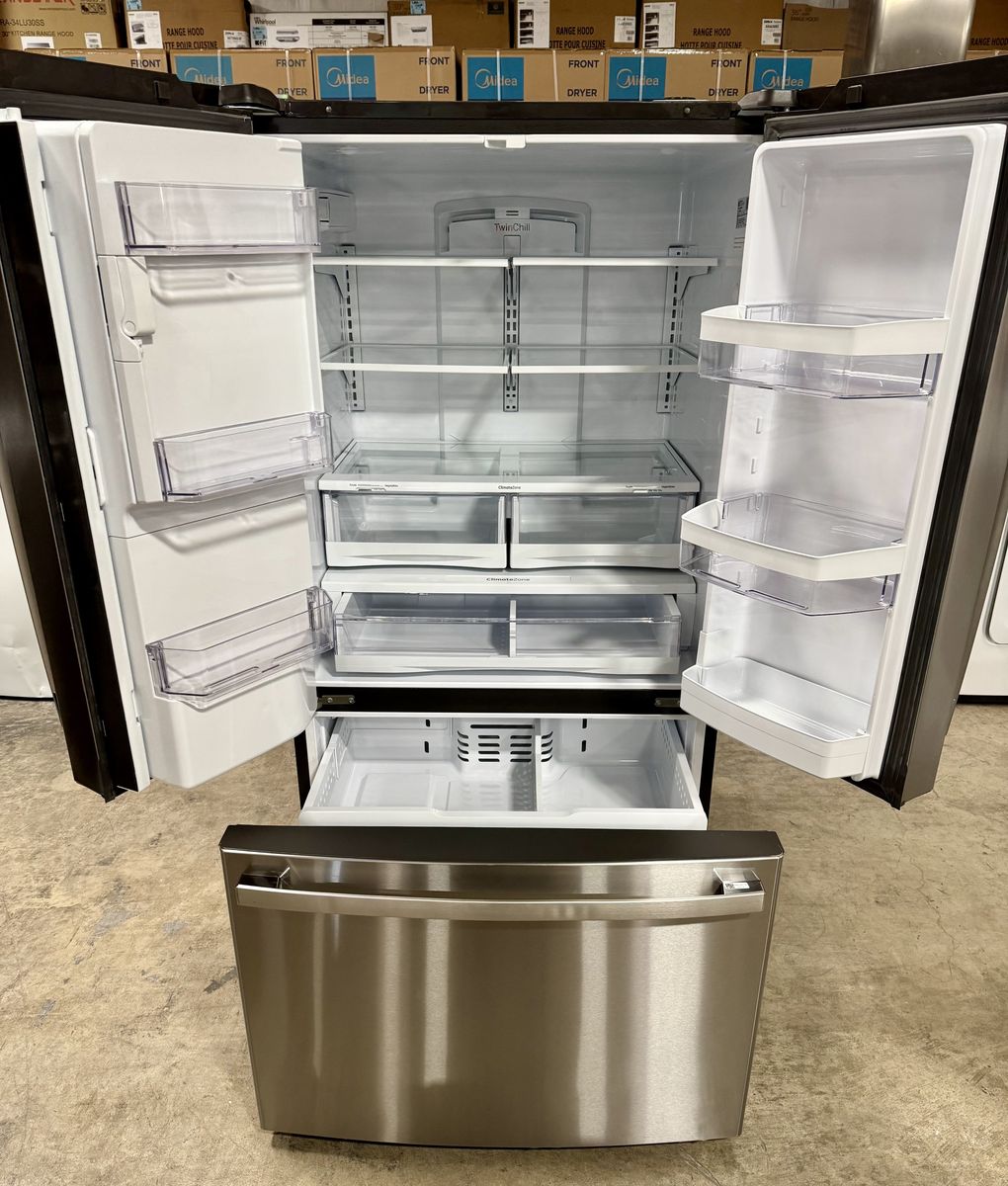 GE 36 Inch French Door Refrigerator with 27.7 Cu. Ft. Capacity, TwinChill™, Turbo Cool/Freeze, Showcase LED, Enhanced Shabbos Mode, Ice Maker, Ice & Water Dispenser, Advanced Filtration, ADA Compliant, and ENERGY STAR® Certified: Fingerprint Resistant Stainless Steel