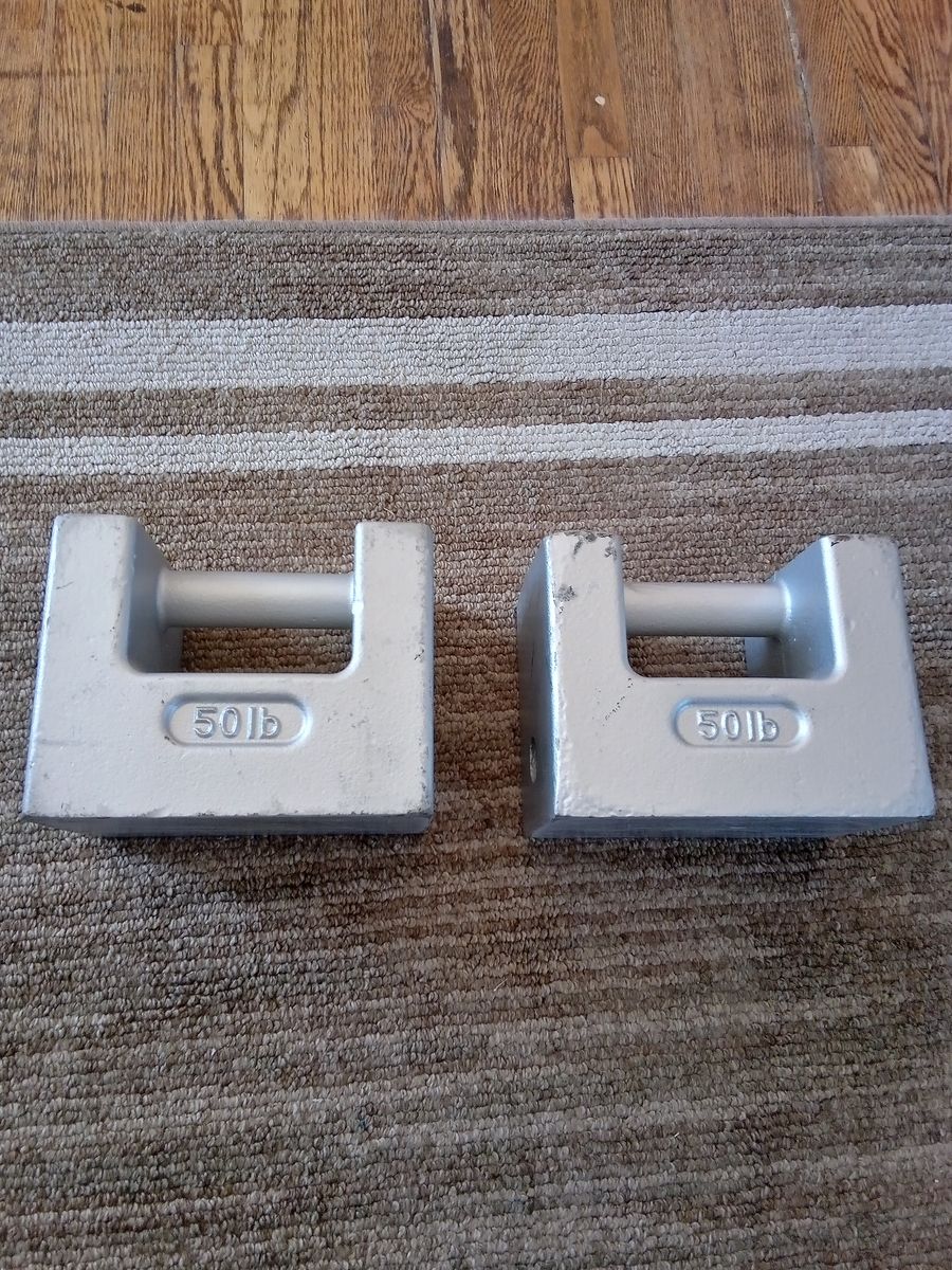 Scale Calibration Weights. Pair of weights with handles, 50lbs each, 100lbs total. Cash only.