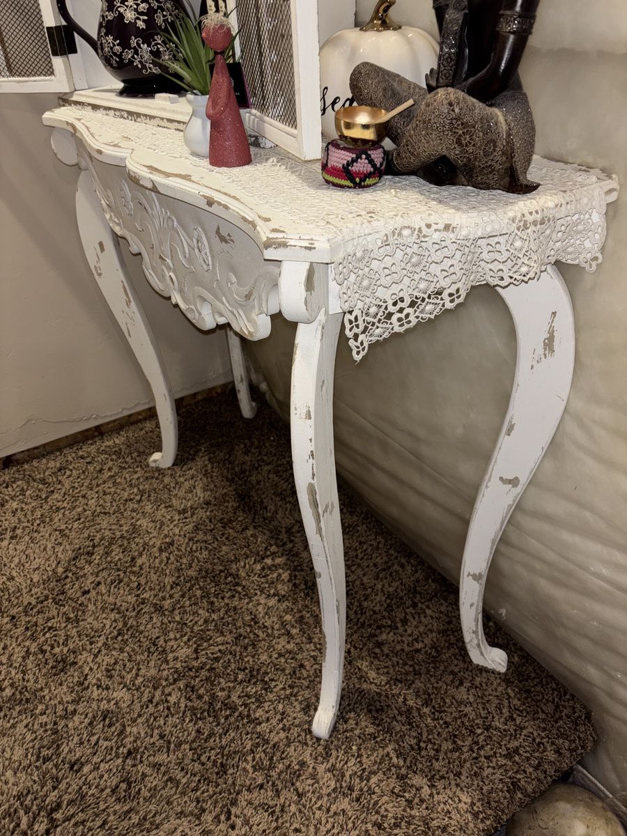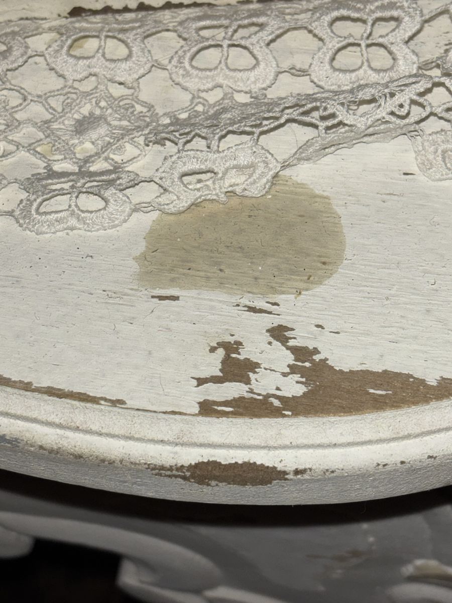 ZelleThis is a perfect accent table for your "shabby chic" decor! It's meant to look "aged" and there is a stain shown in picture on the top of the table. I had it covered in a piece of lace so it never bothered me.